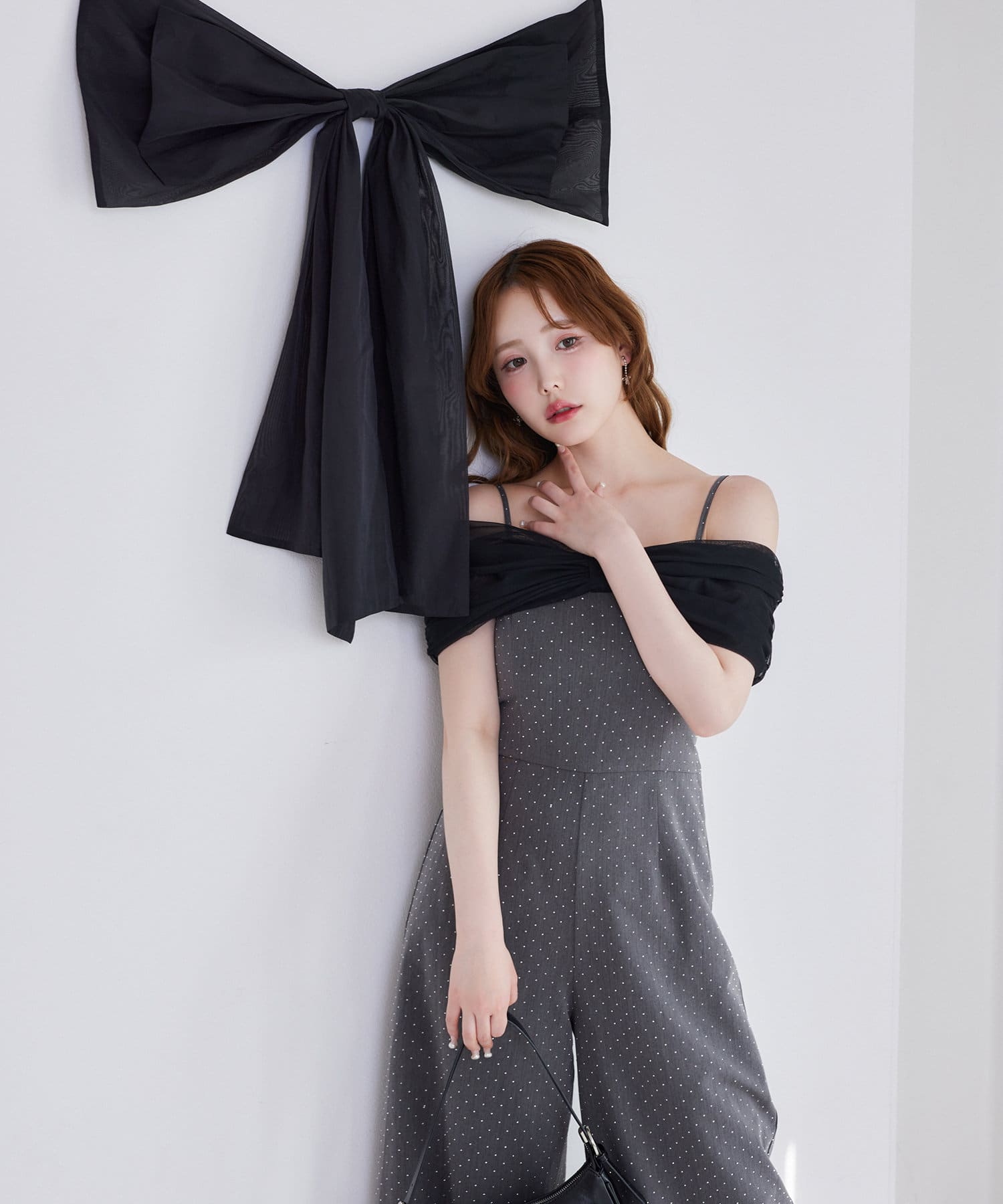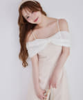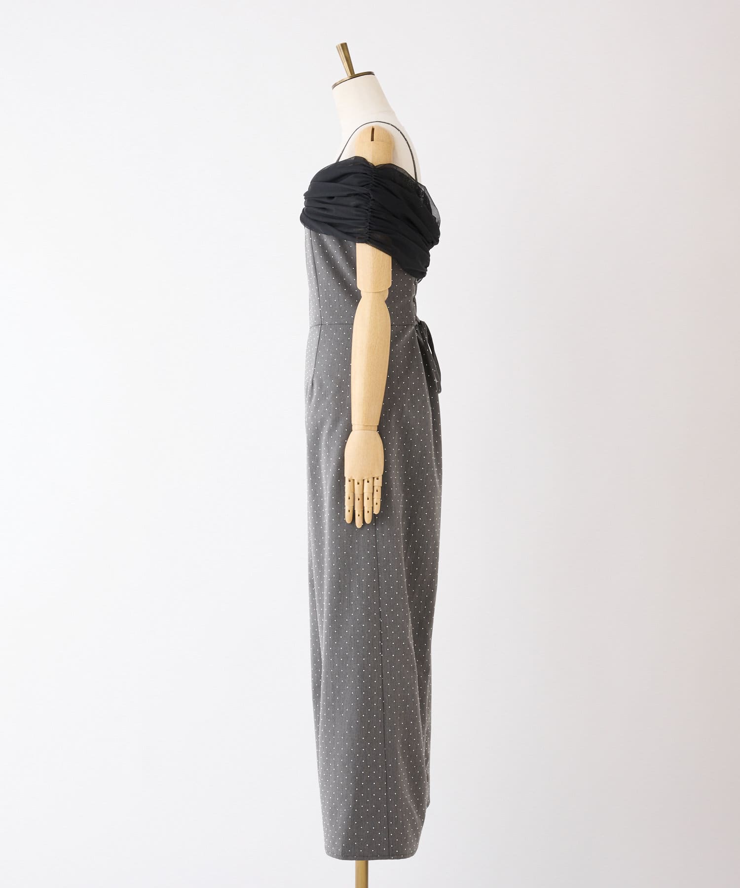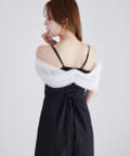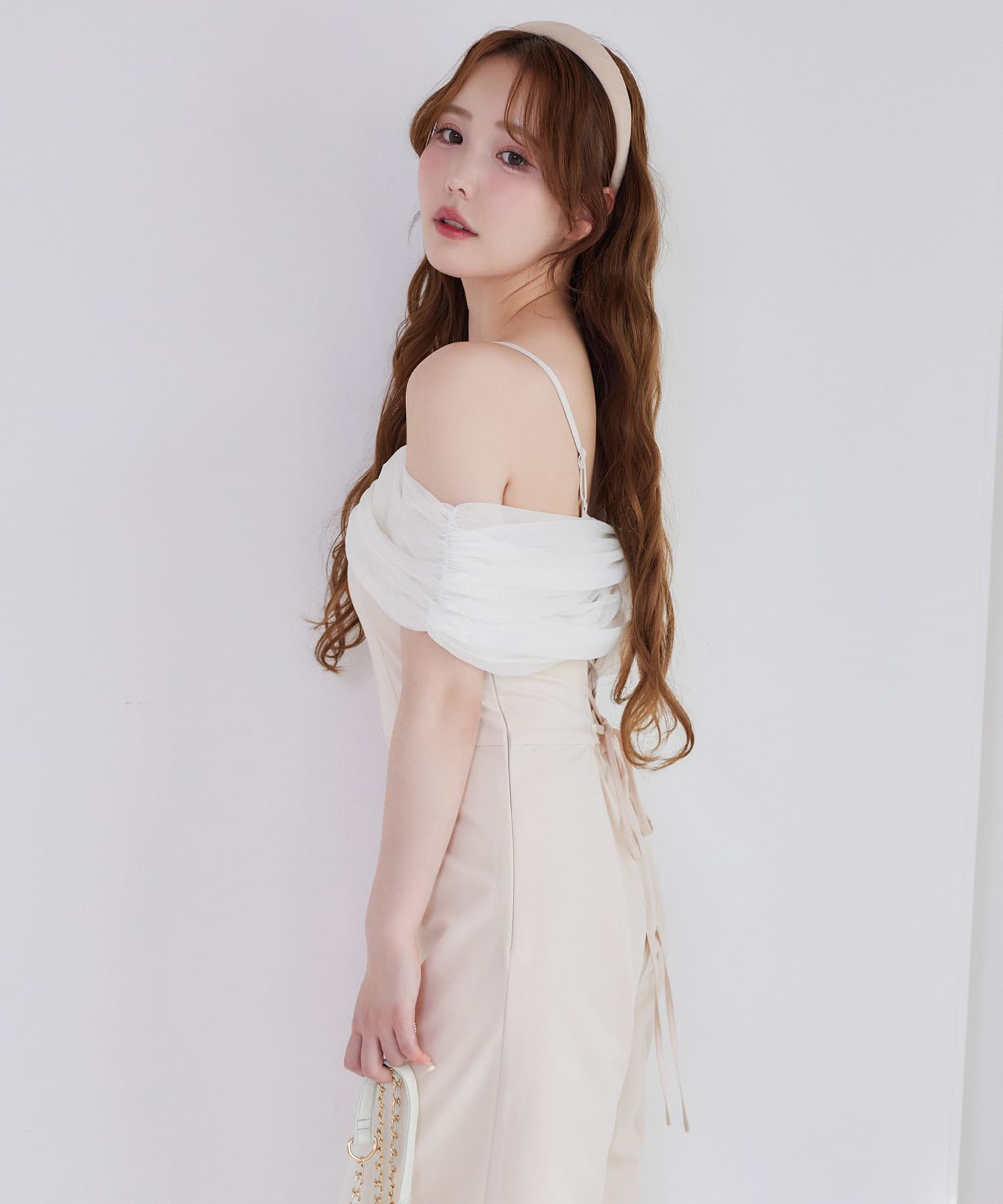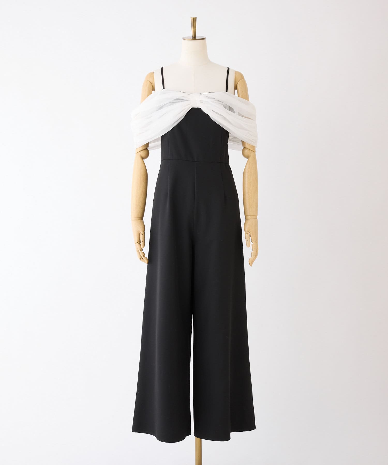 襟元のチュールが顔まわりを華やかに演出し、オフショルダー仕様でデコルテを美しく魅せながら、