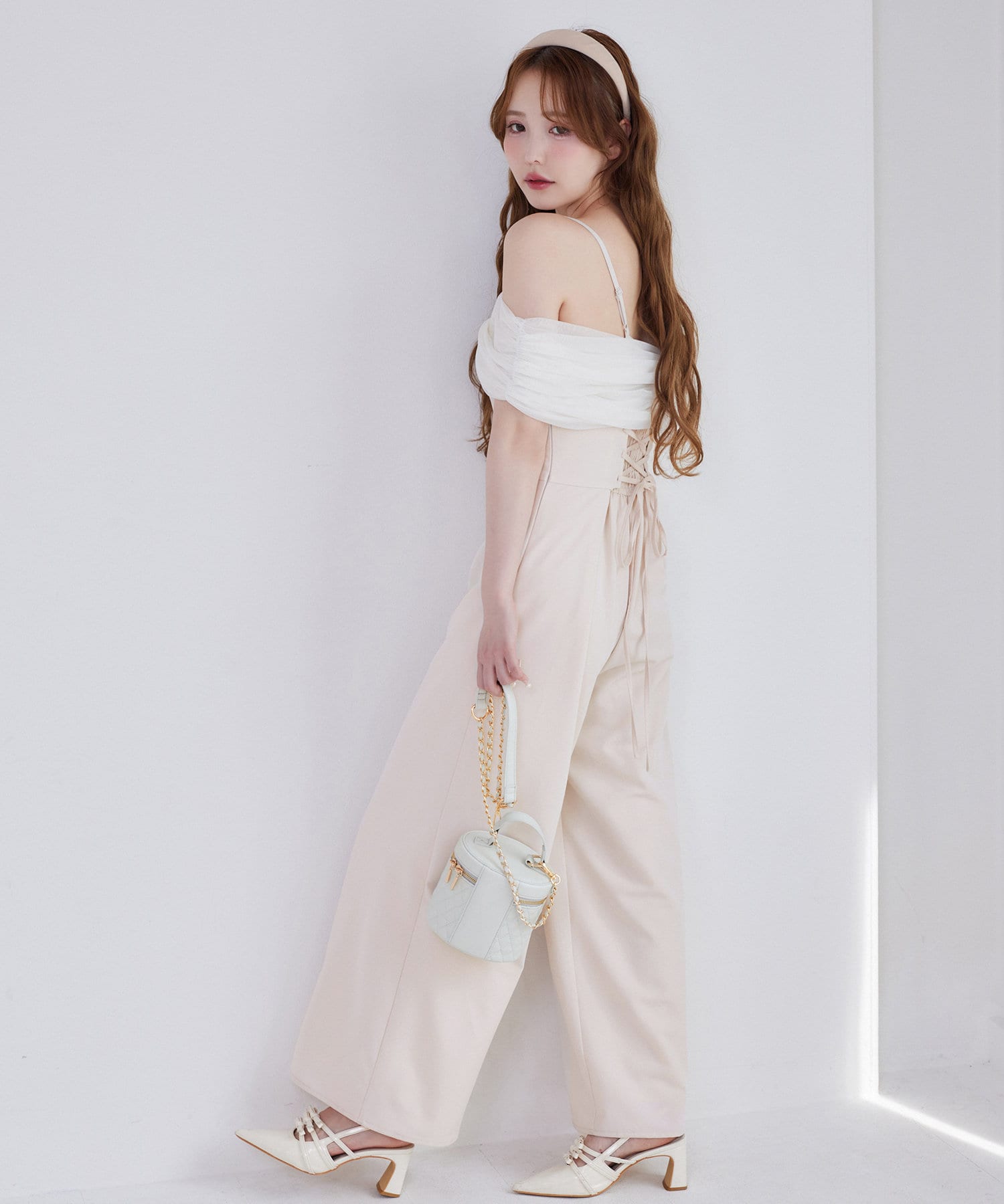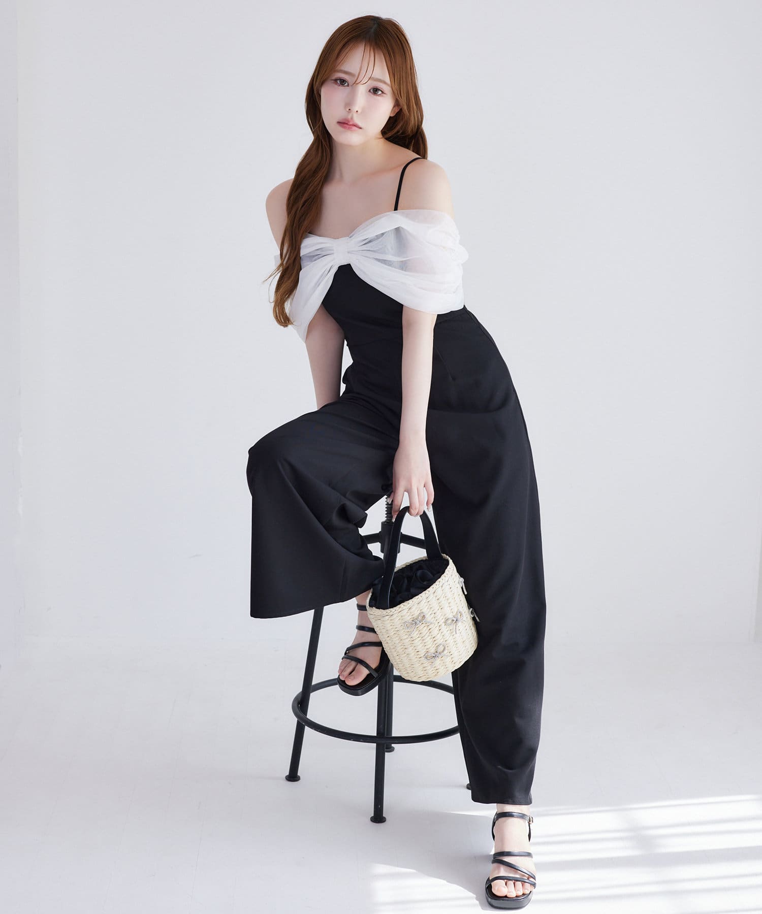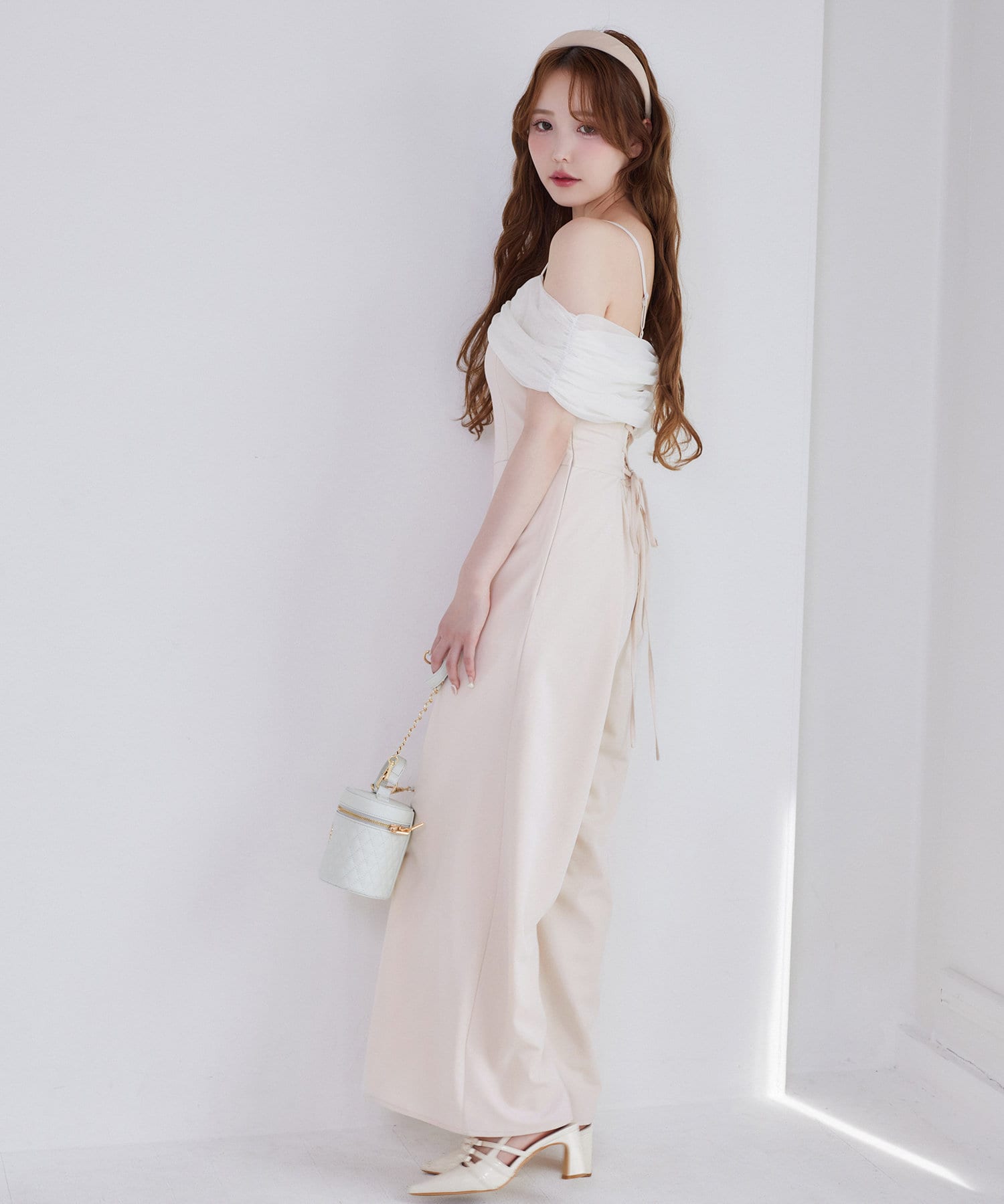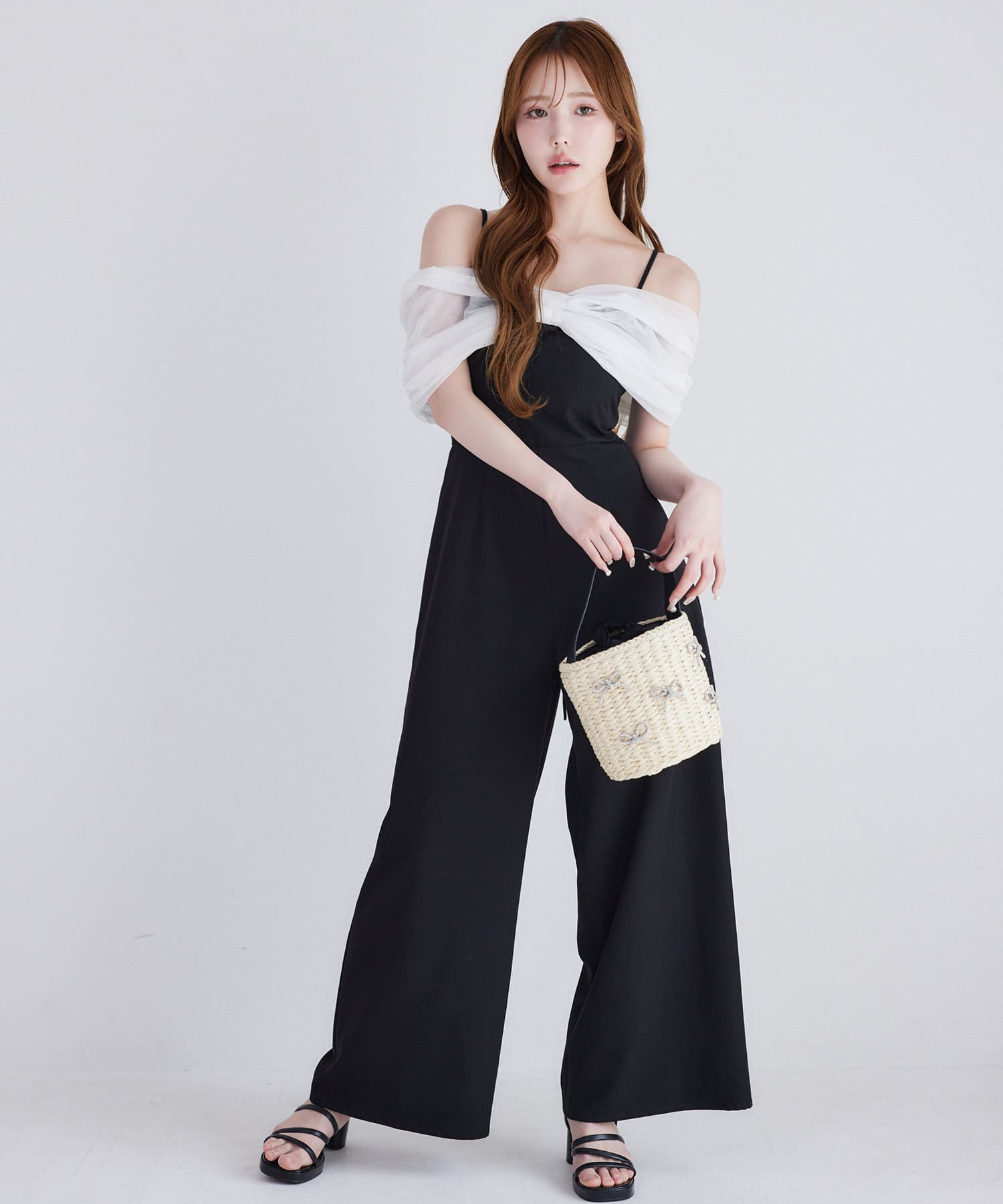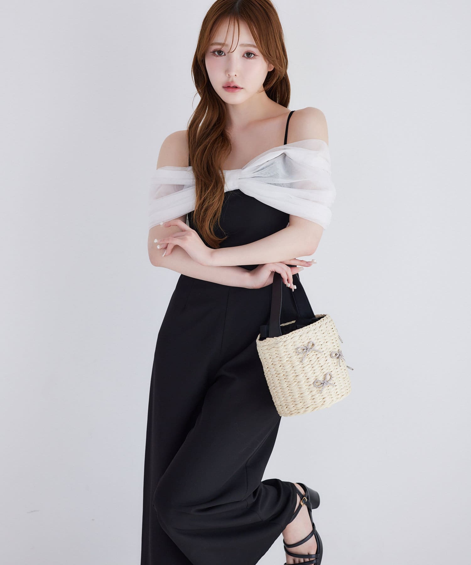 襟元のチュールが顔まわりを華やかに演出し、オフショルダー仕様でデコルテを美しく魅せながら、