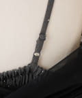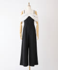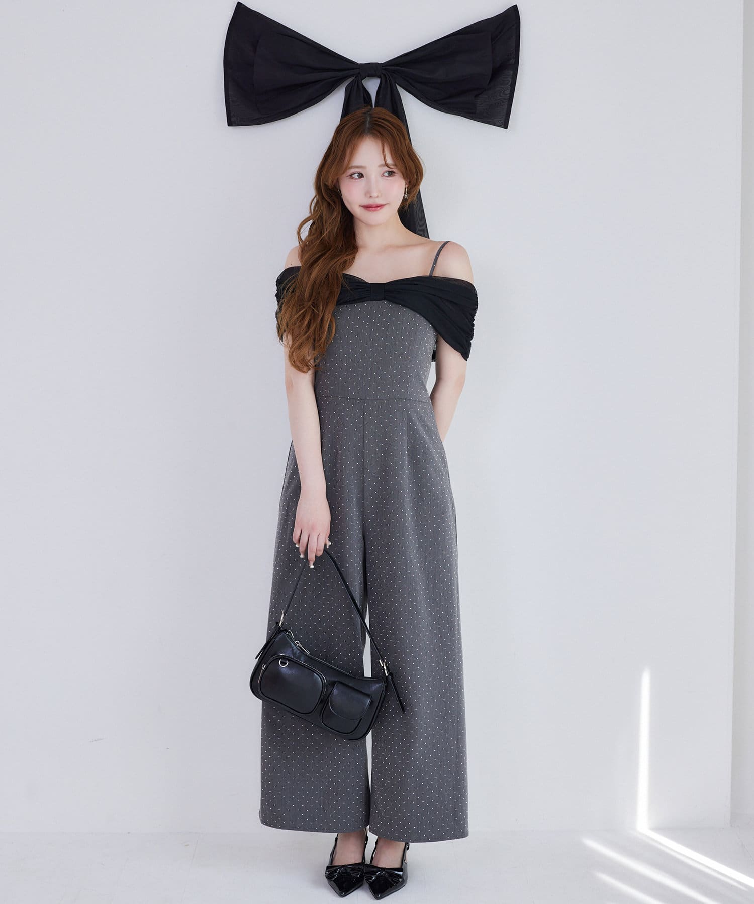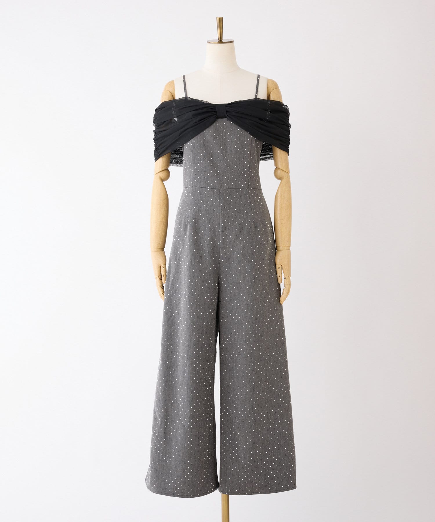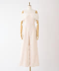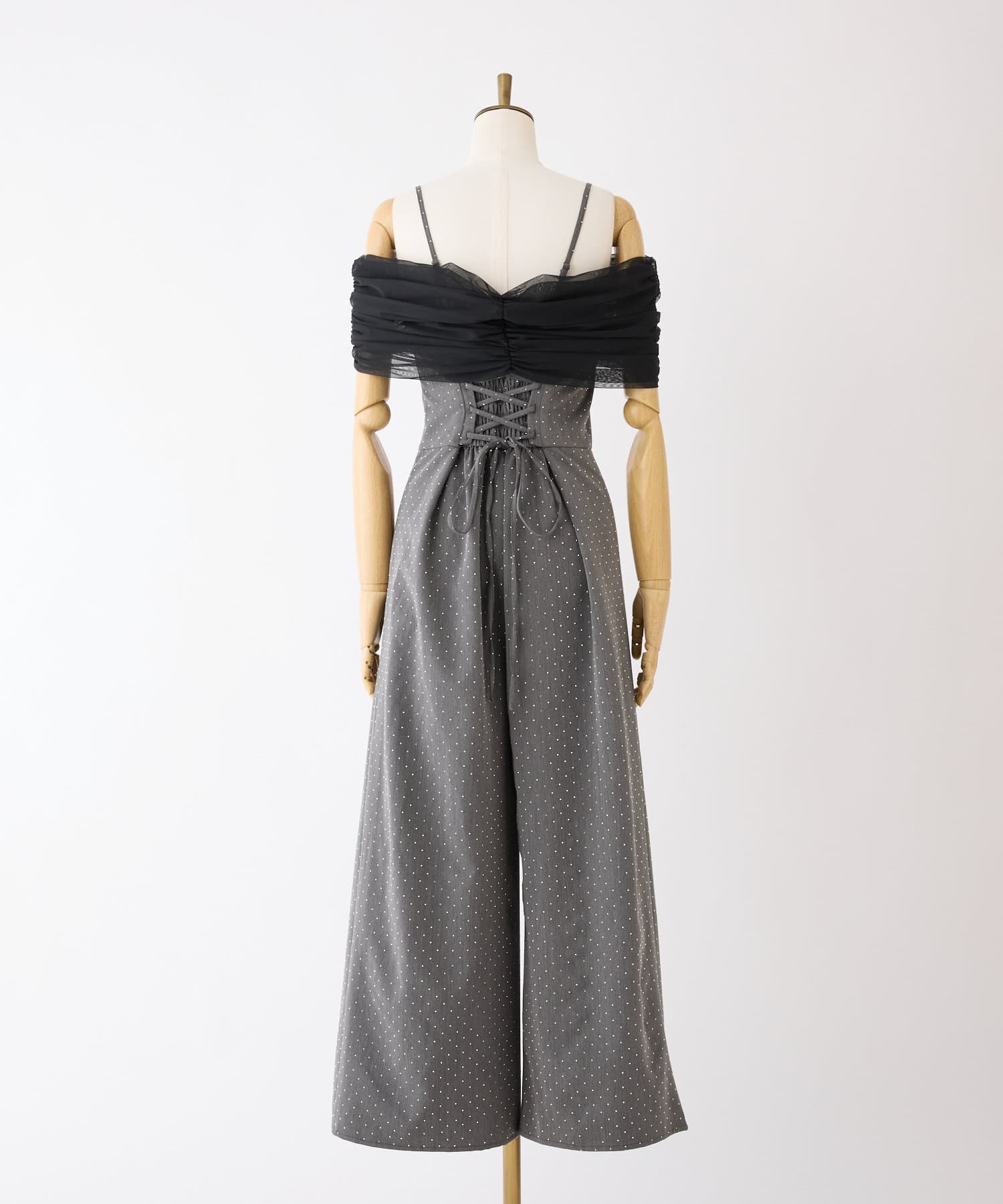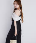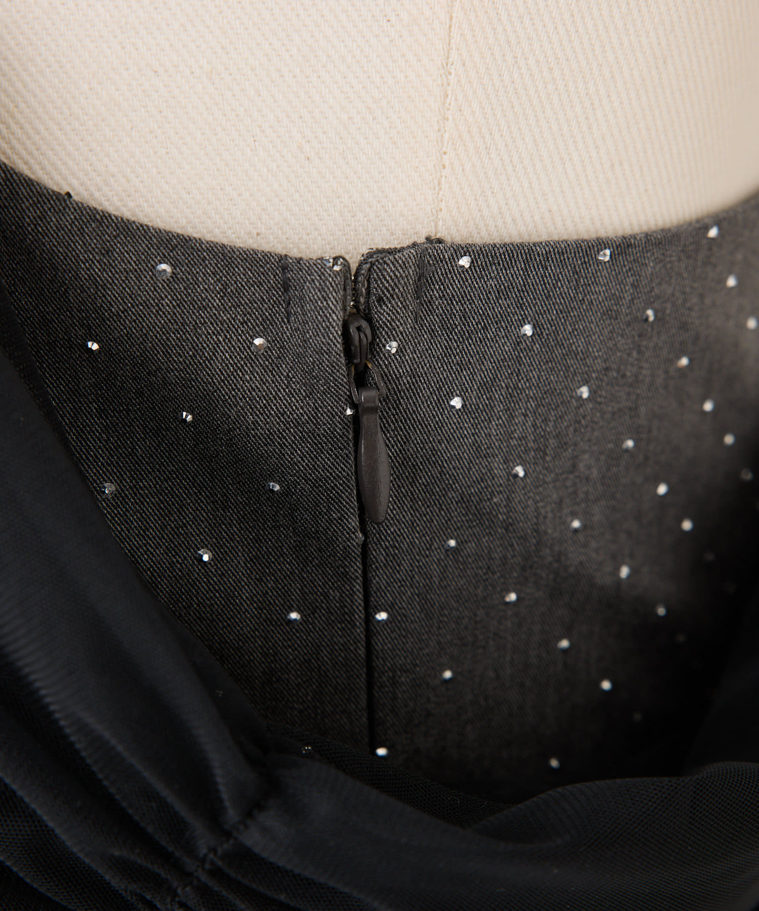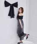 襟元のチュールが顔まわりを華やかに演出し、オフショルダー仕様でデコルテを美しく魅せながら、