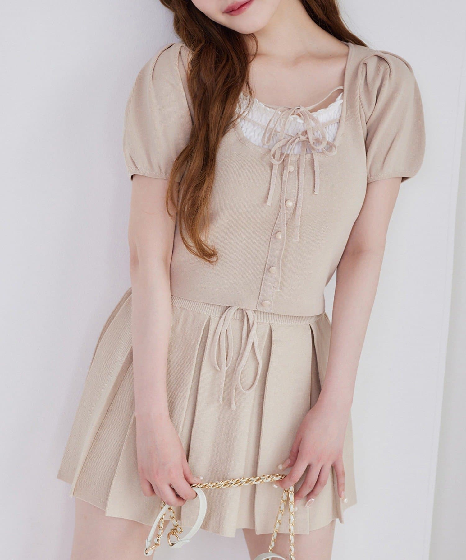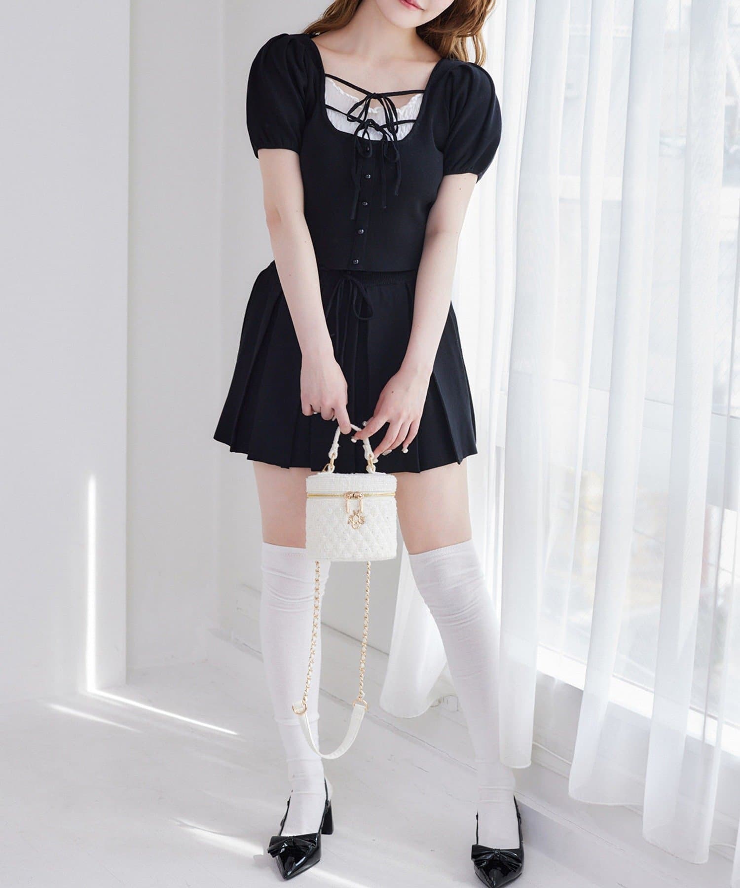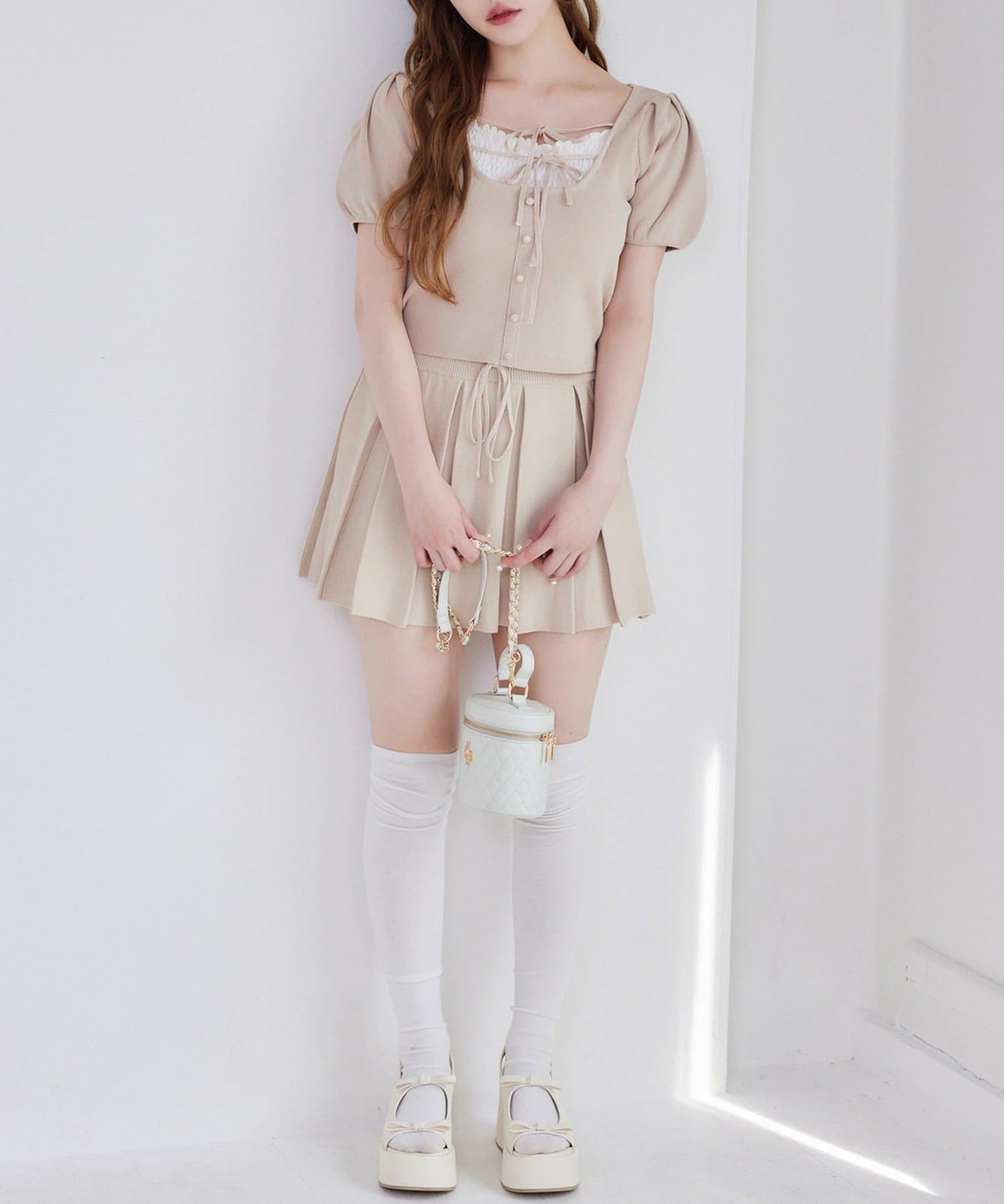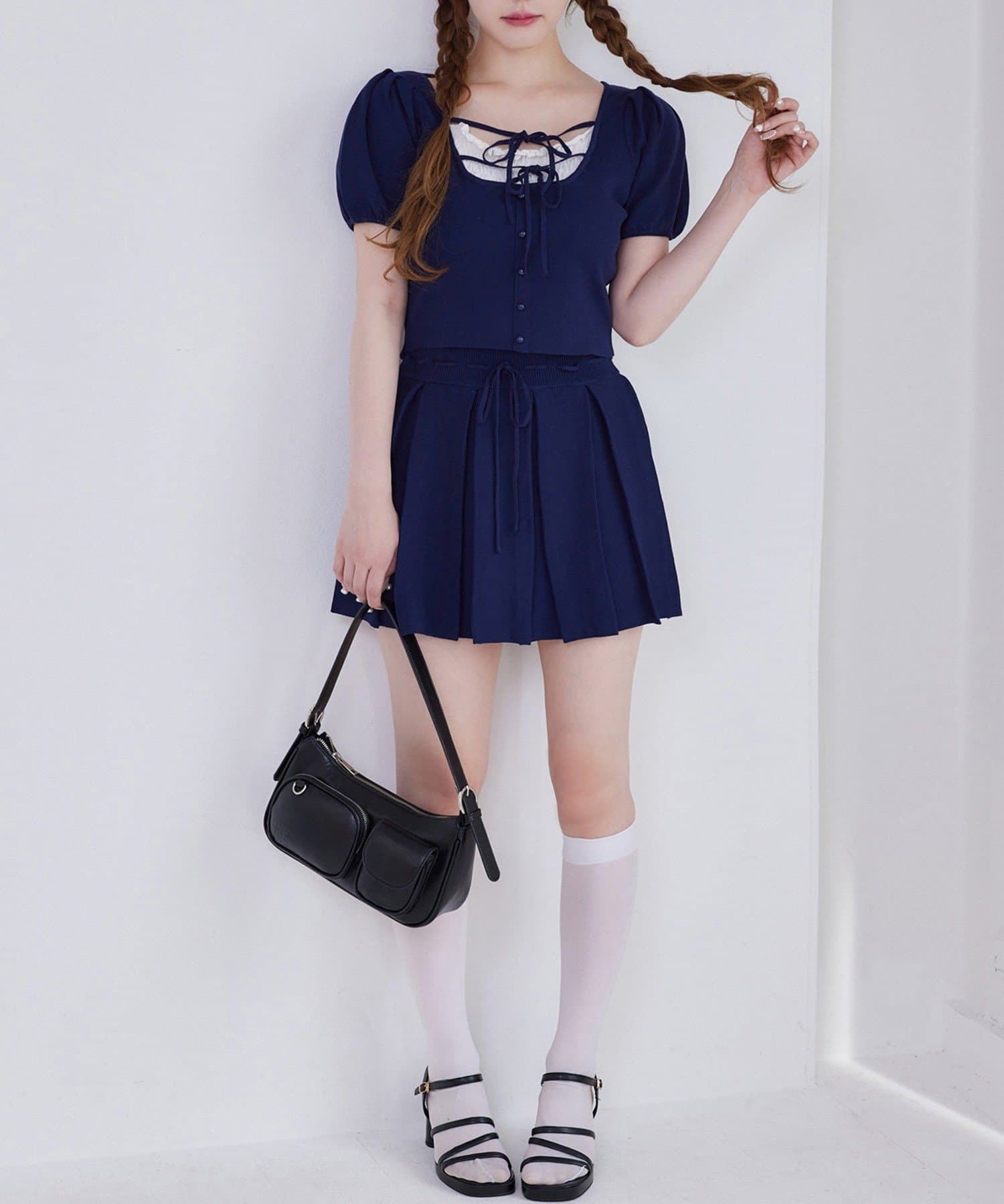 1枚でレイヤードしているようにも見える主役級ニットトップスと美脚効果の高いプリーツミニスカート