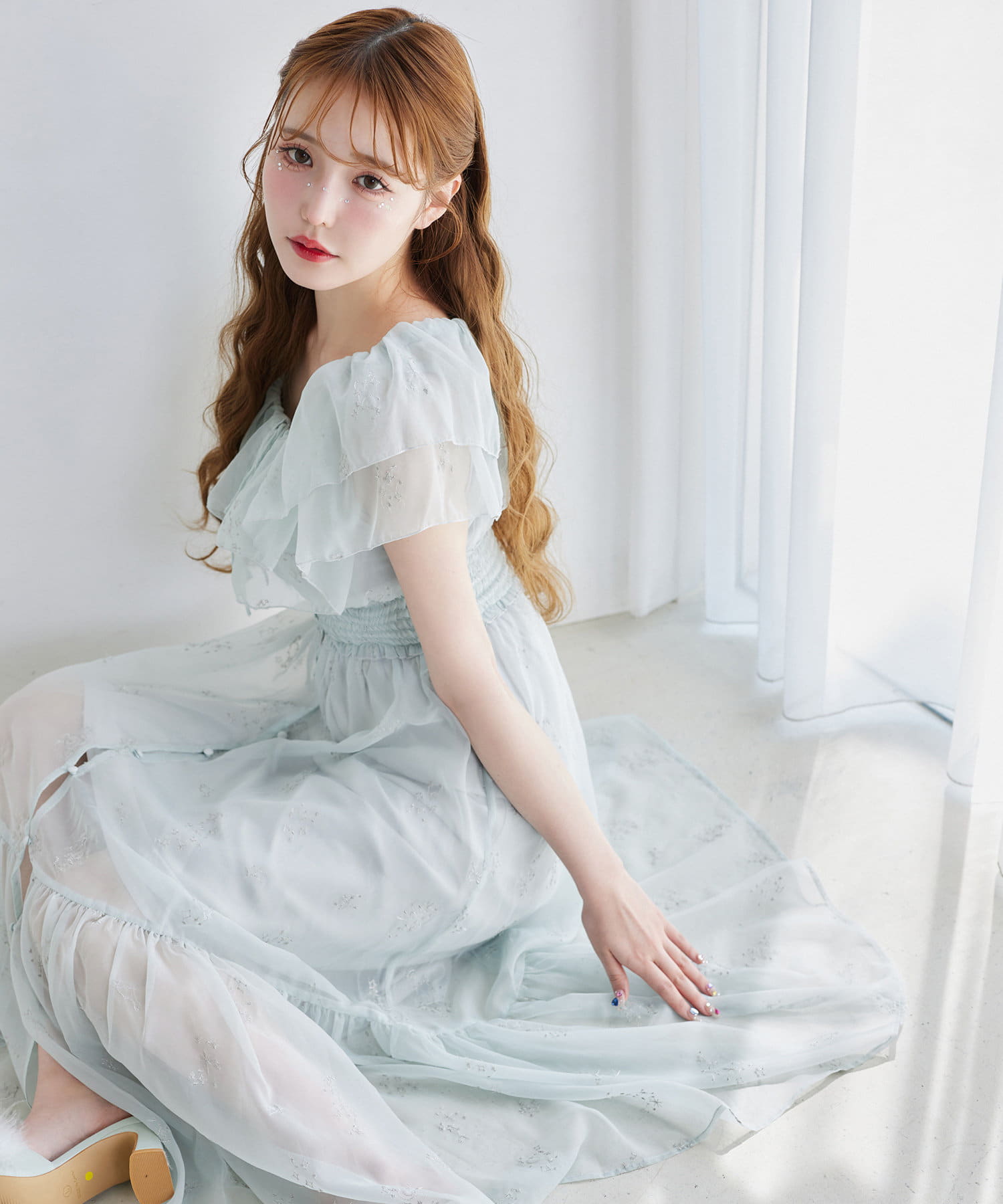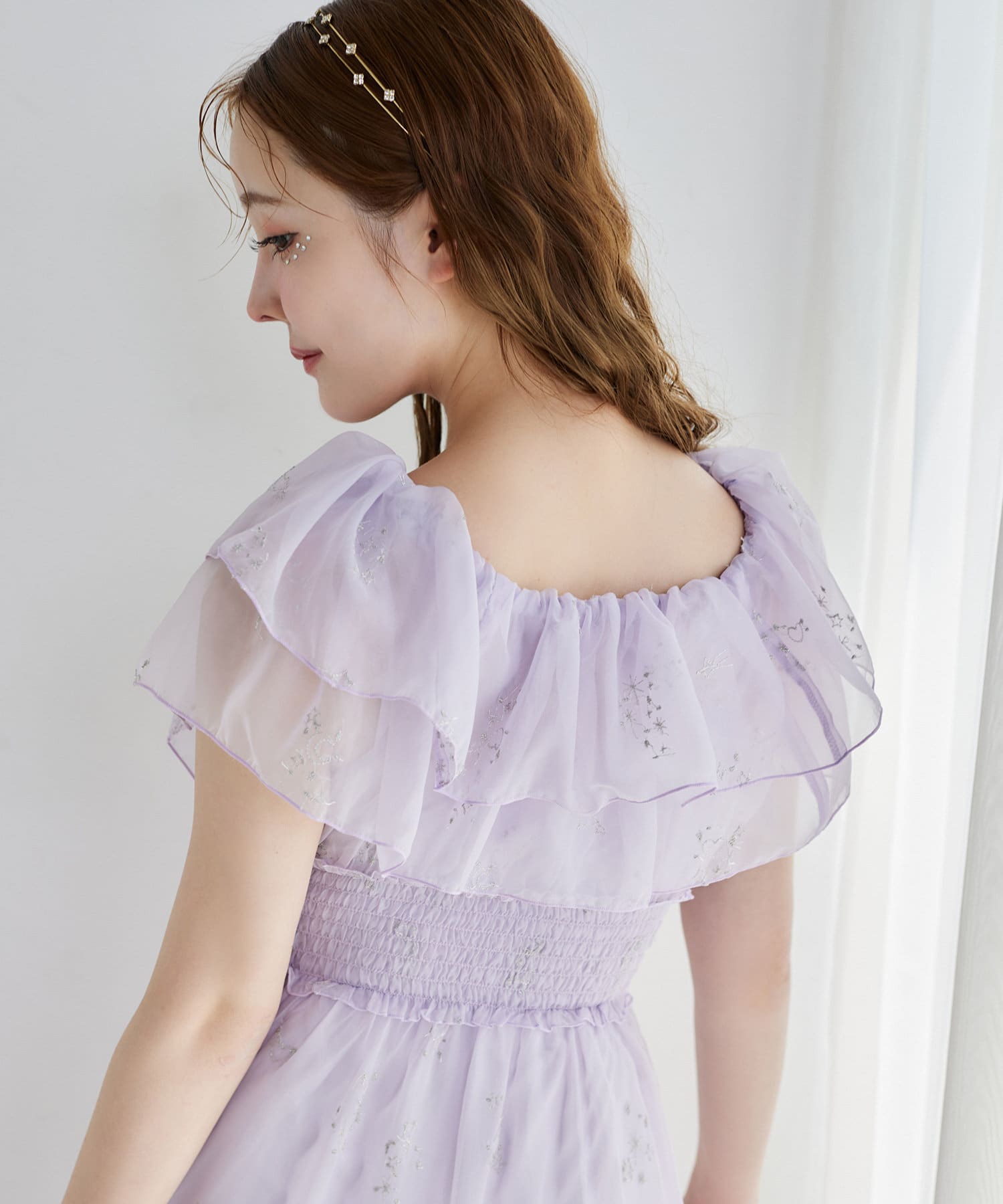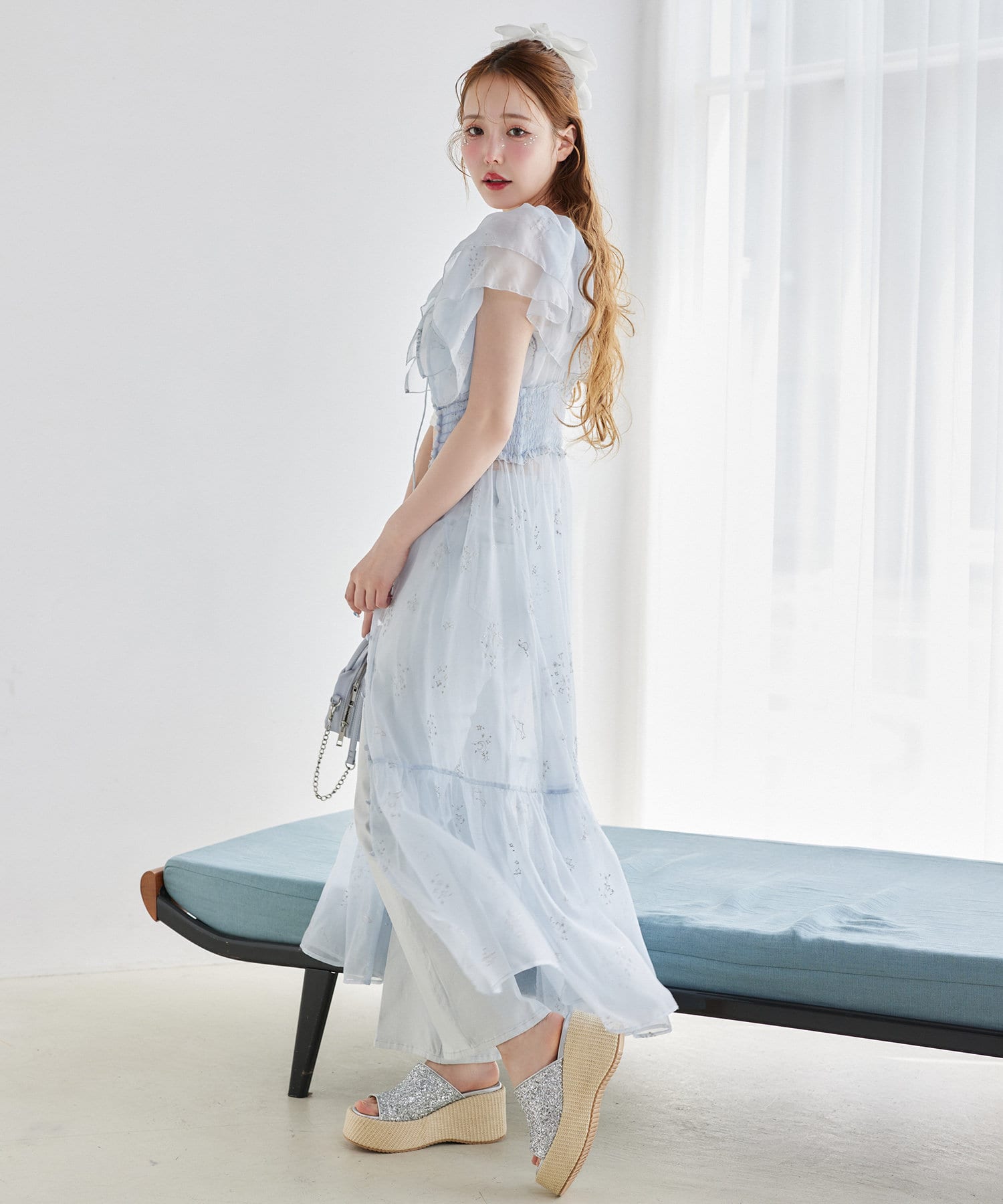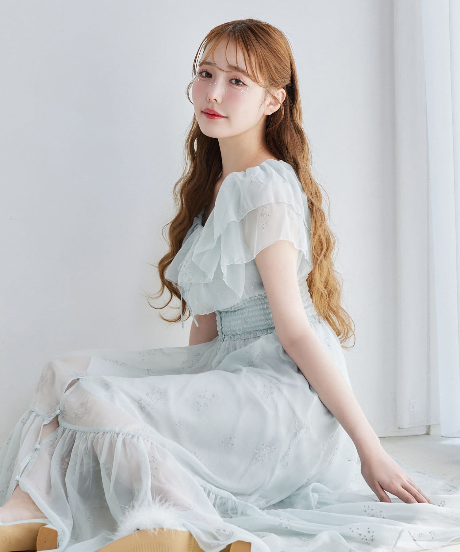 オリジナルの星座刺繍が全体にちりばめられた、幻想的なデザインが目を惹くシアー素材のロングワンピース。
