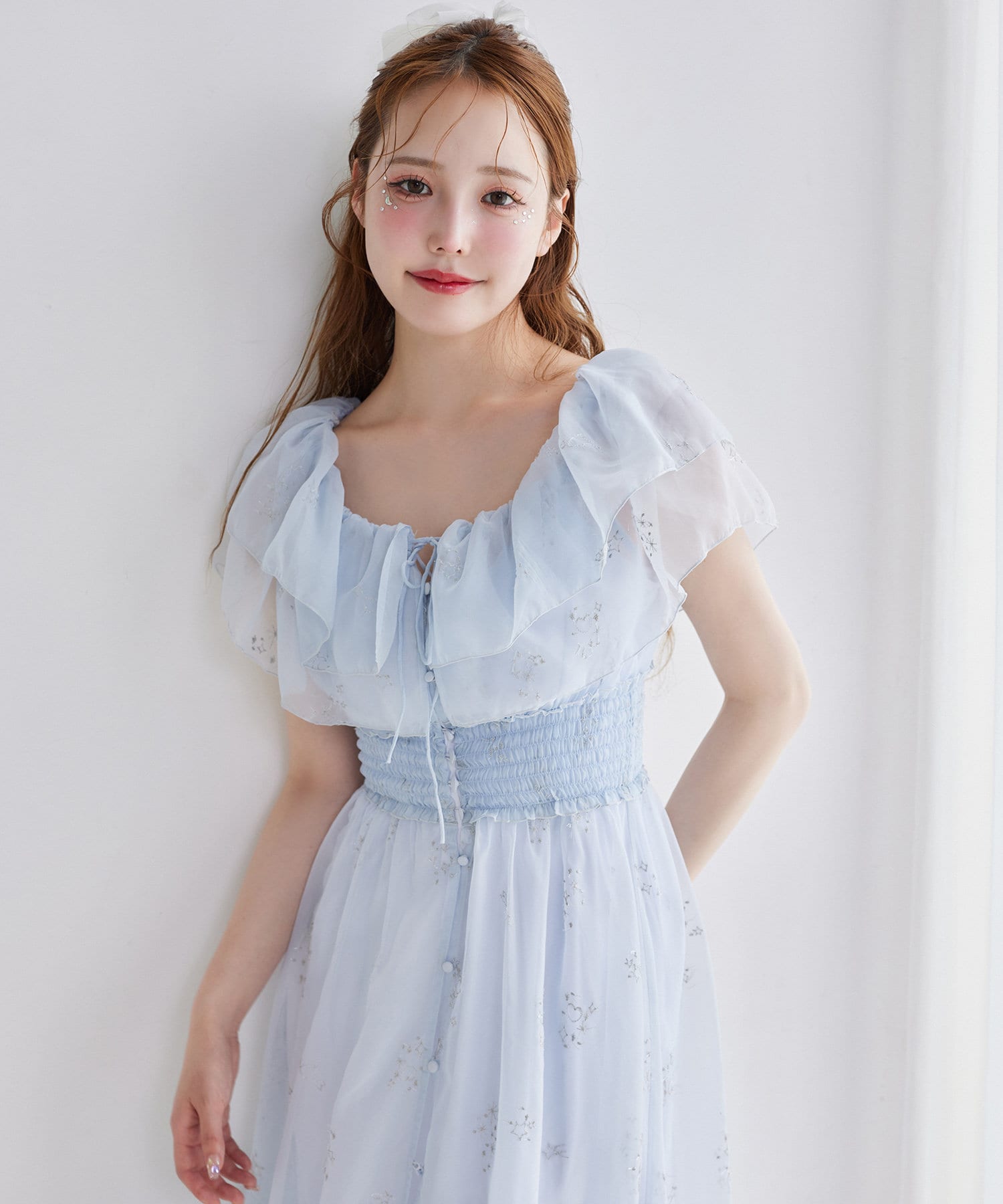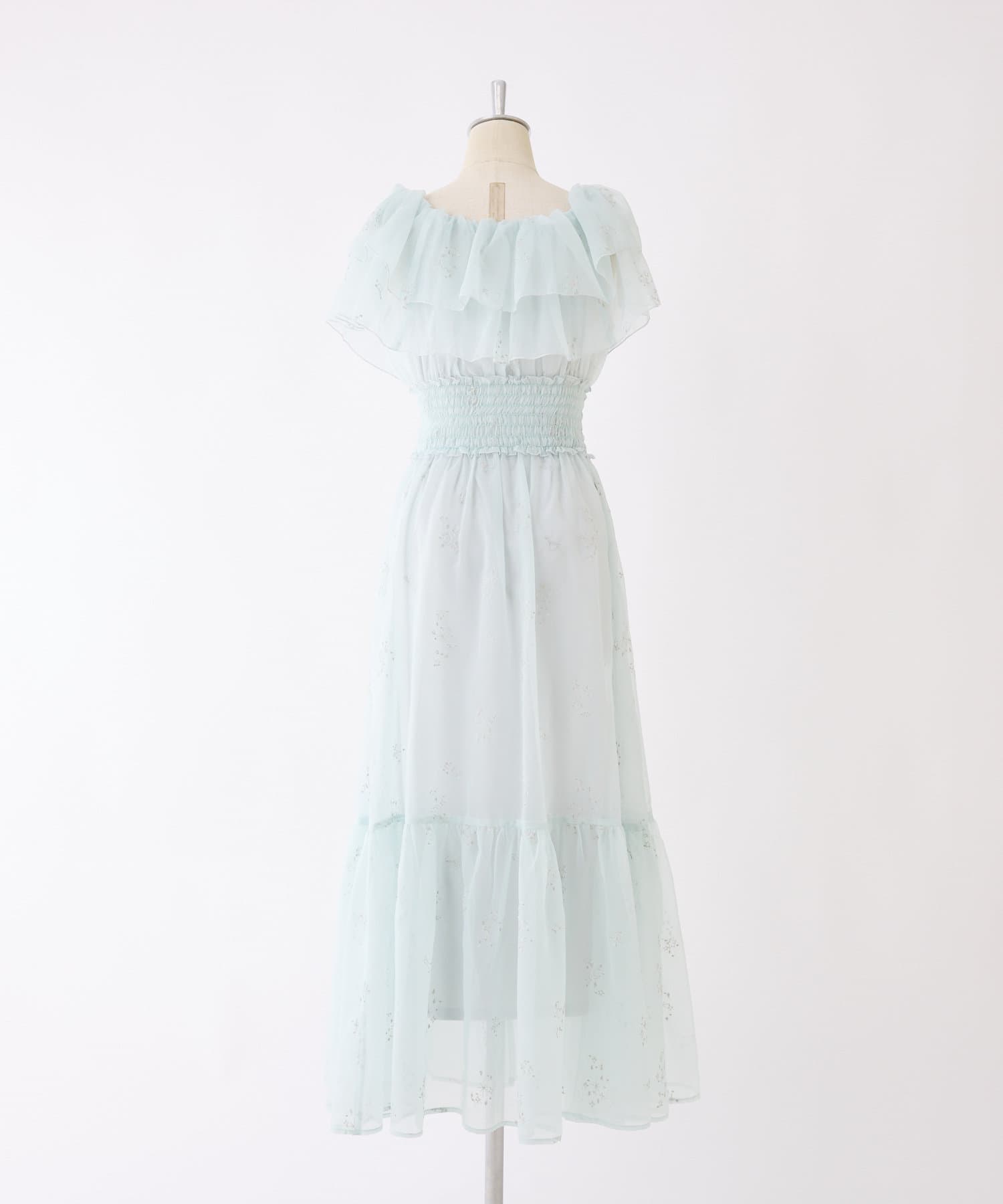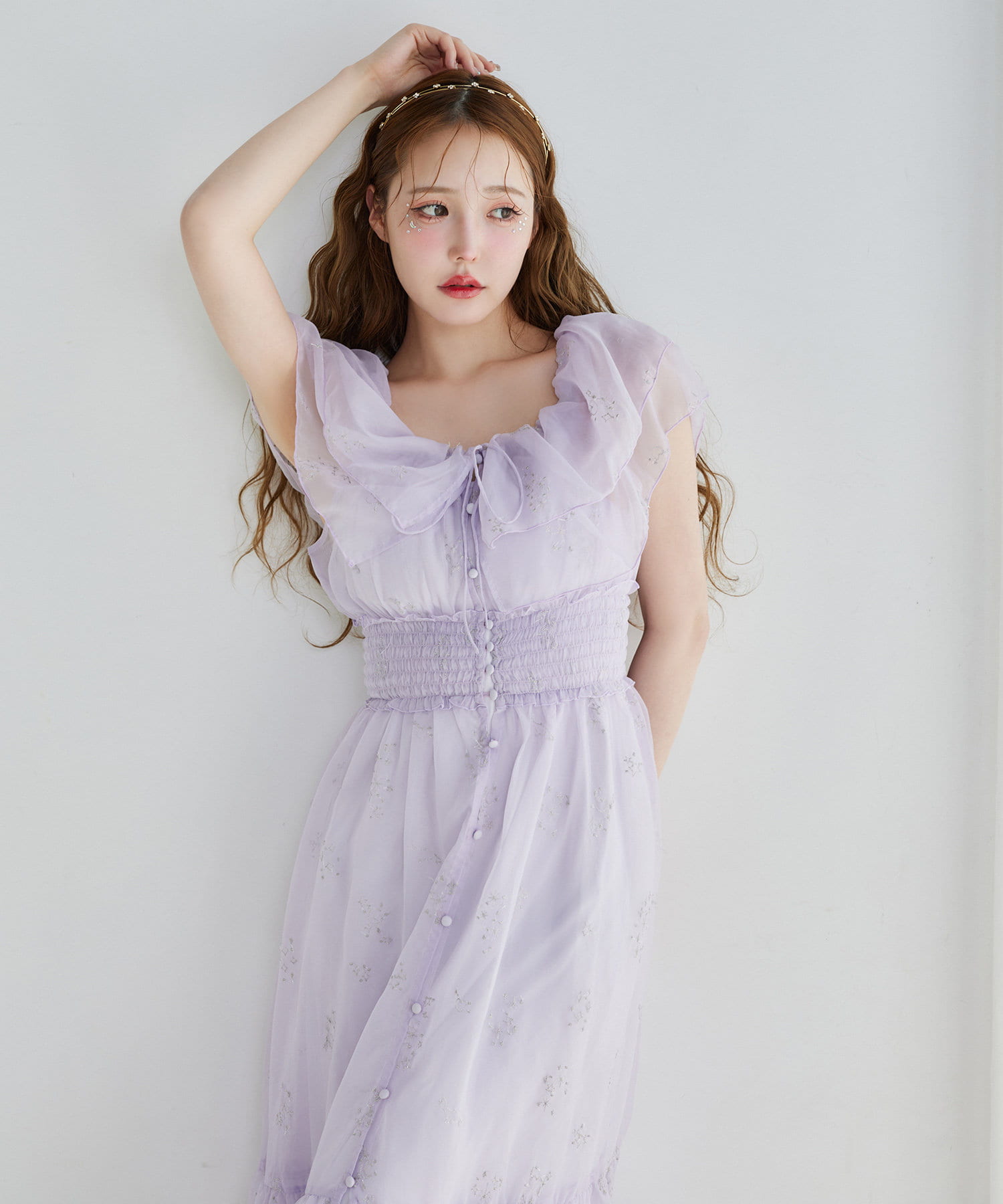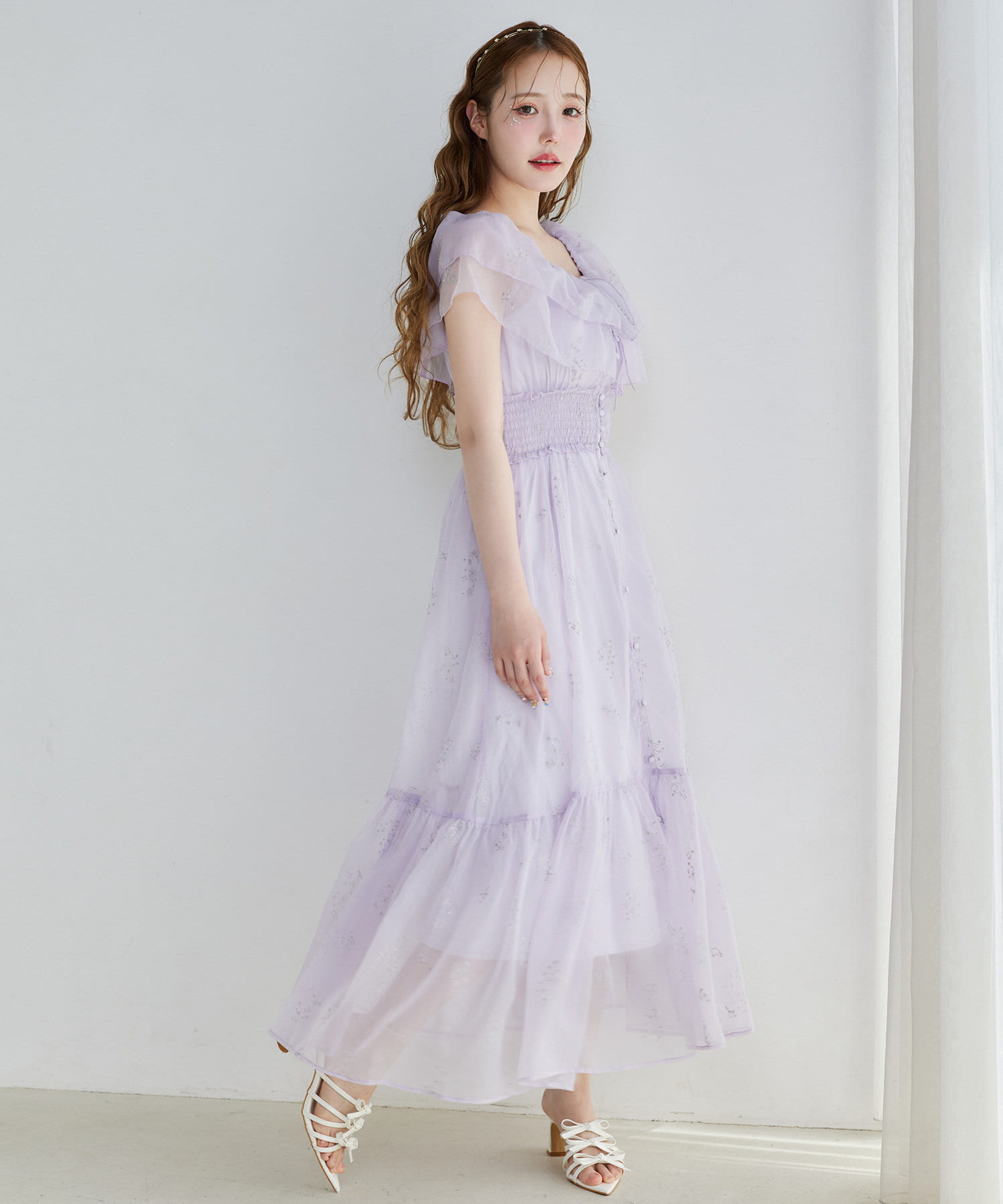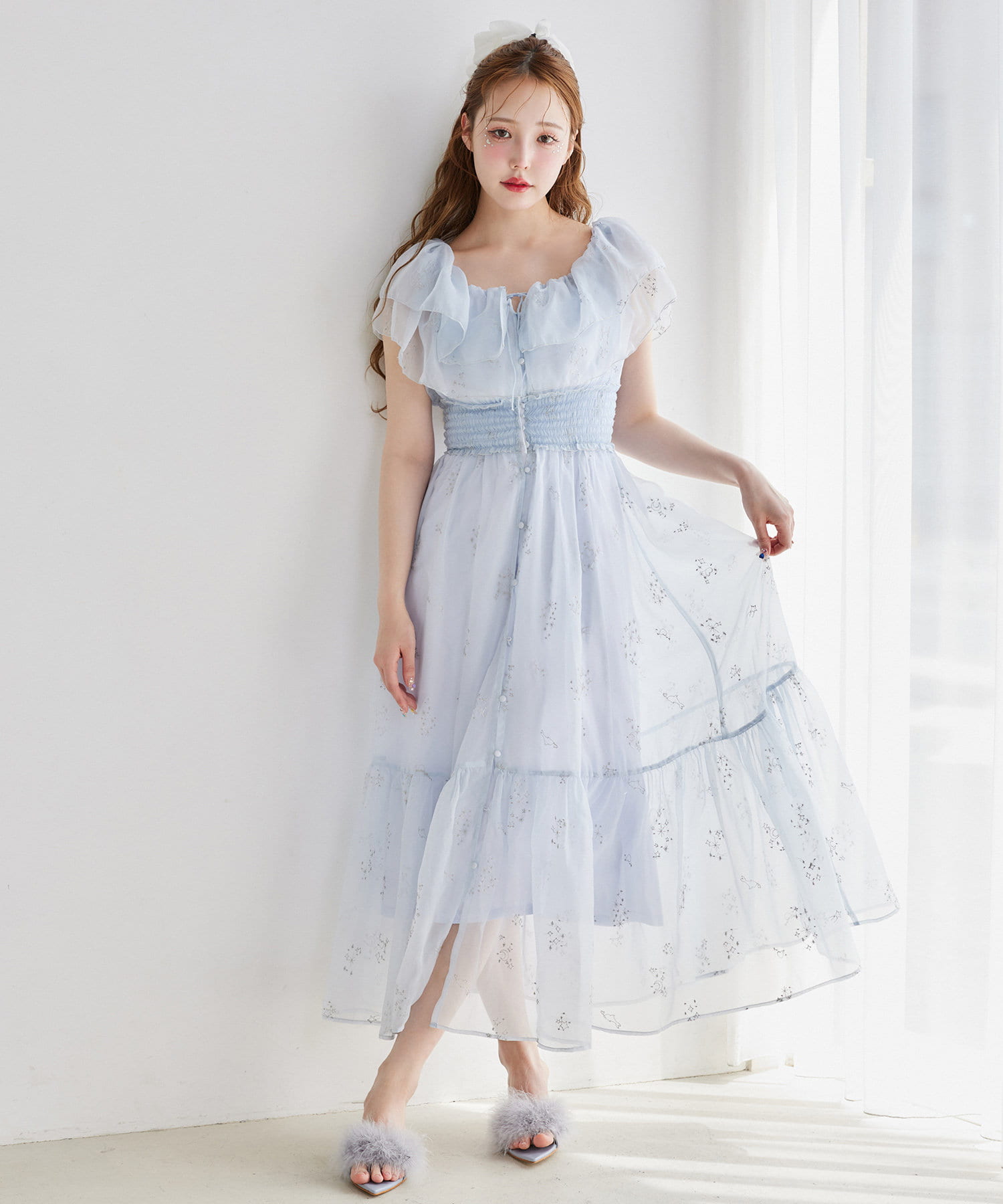 オリジナルの星座刺繍が全体にちりばめられた、幻想的なデザインが目を惹くシアー素材のロングワンピース。