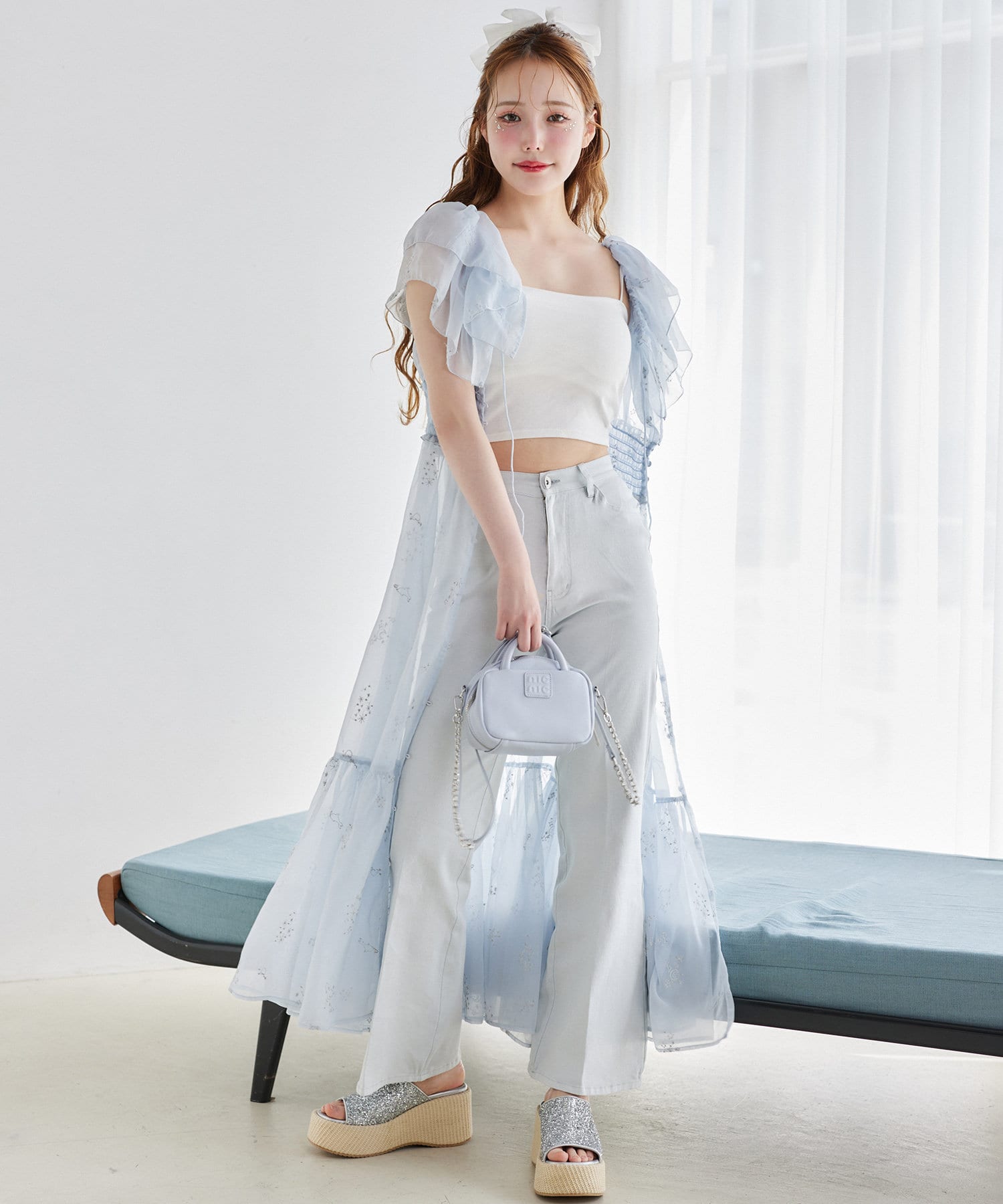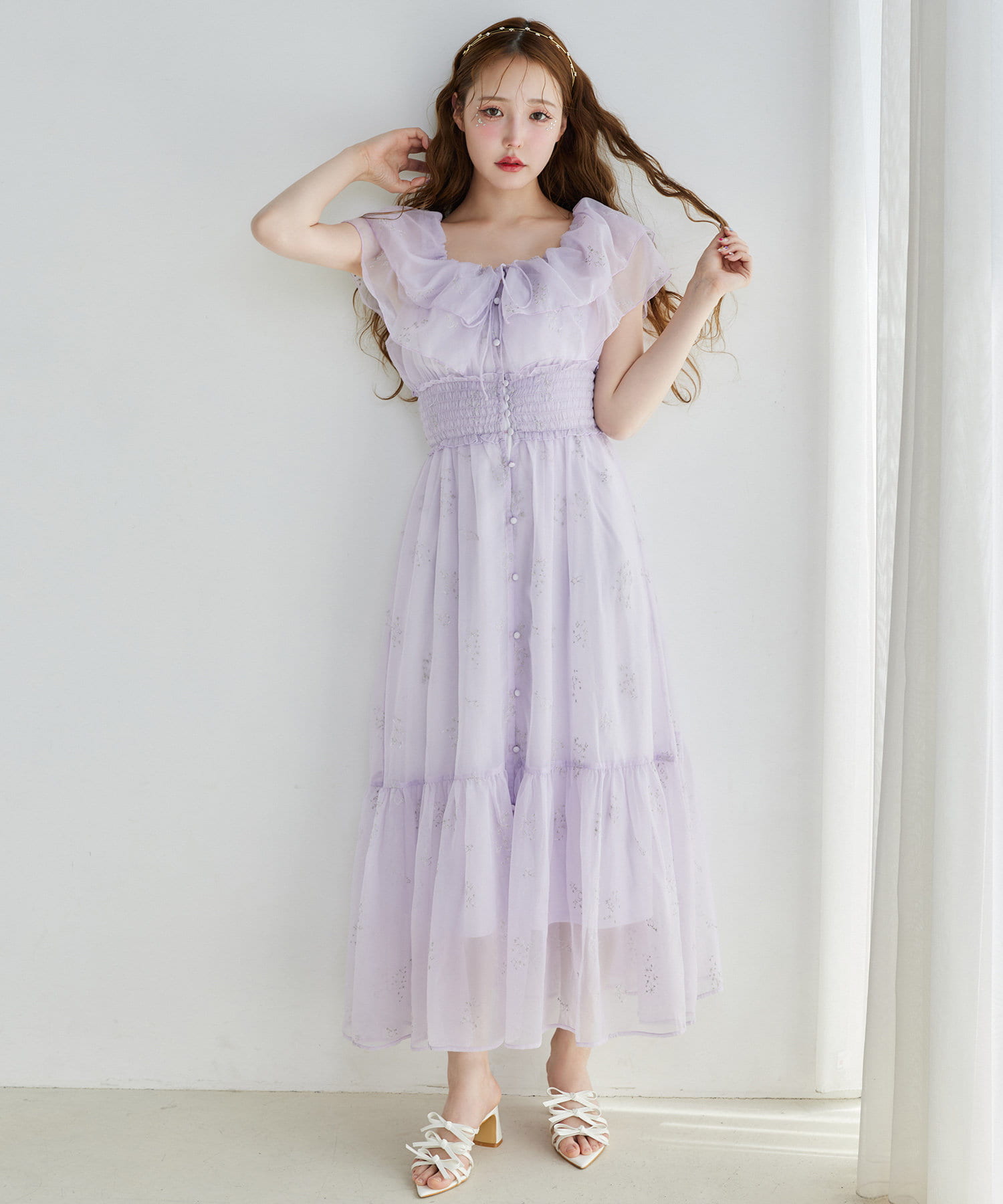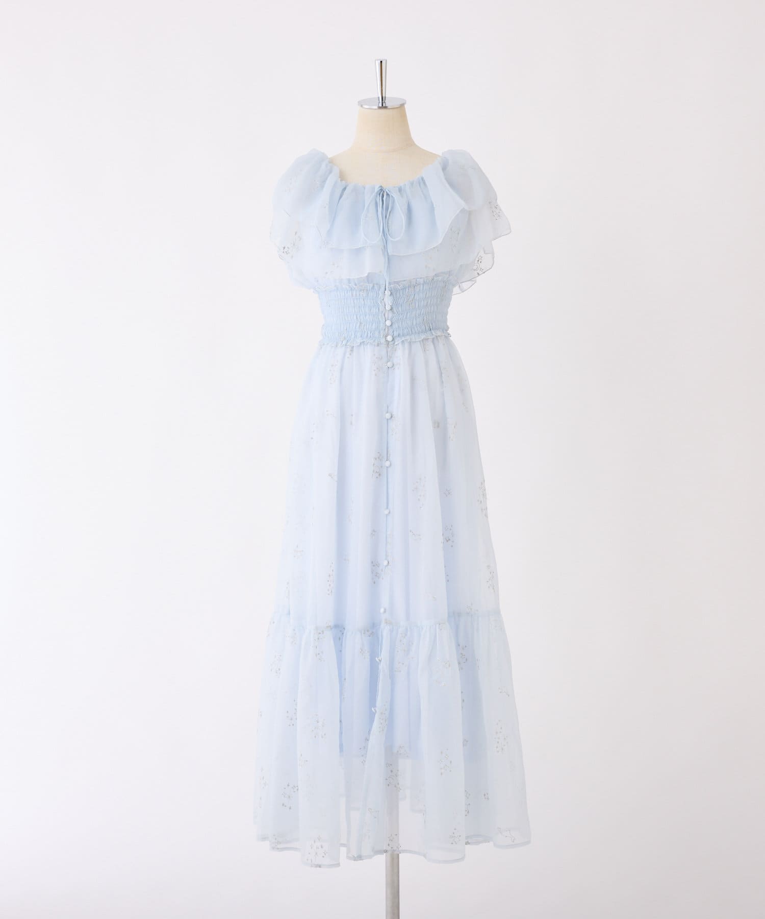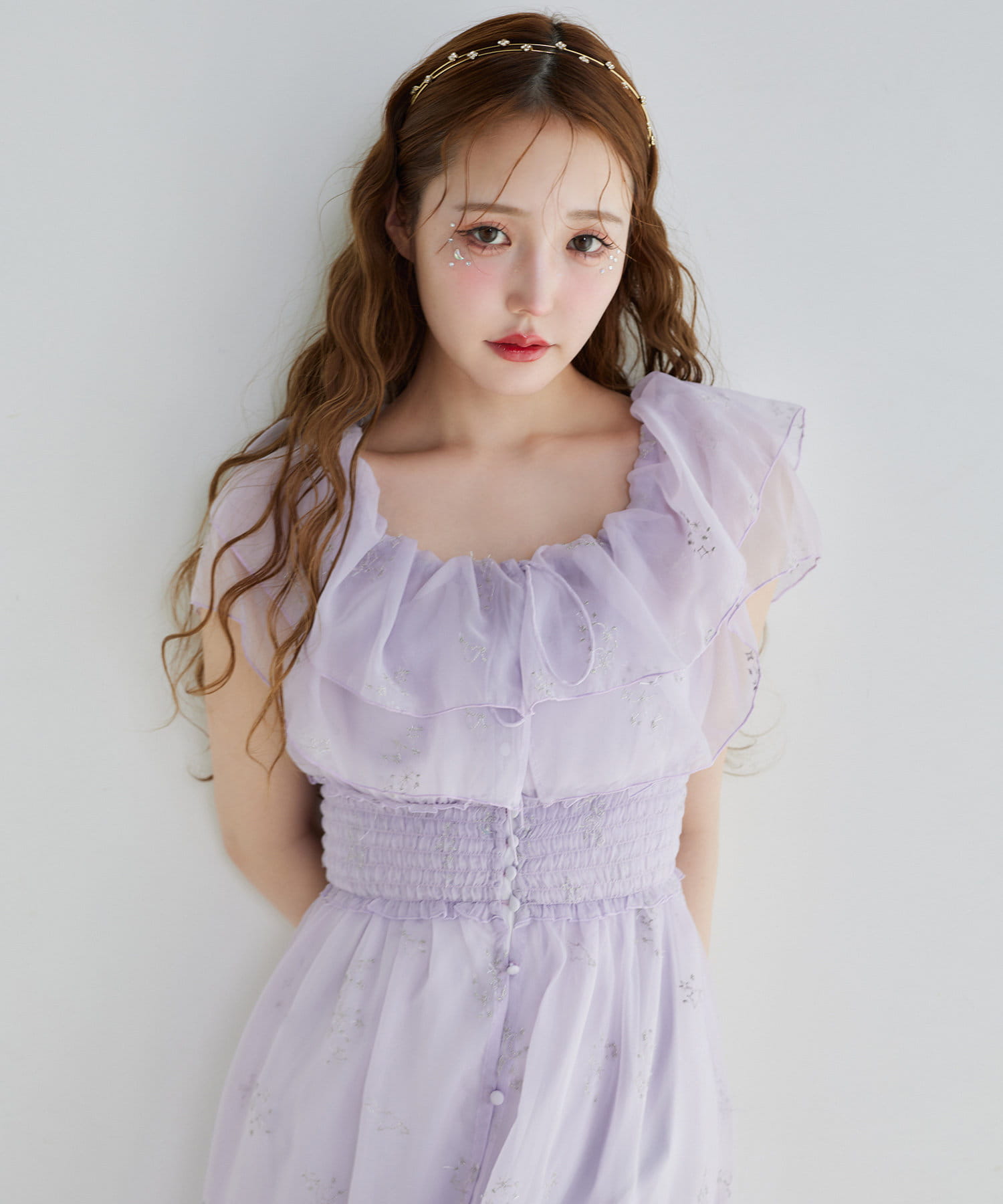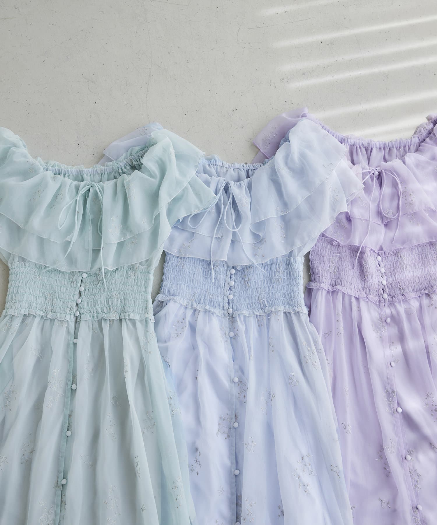 オリジナルの星座刺繍が全体にちりばめられた、幻想的なデザインが目を惹くシアー素材のロングワンピース。