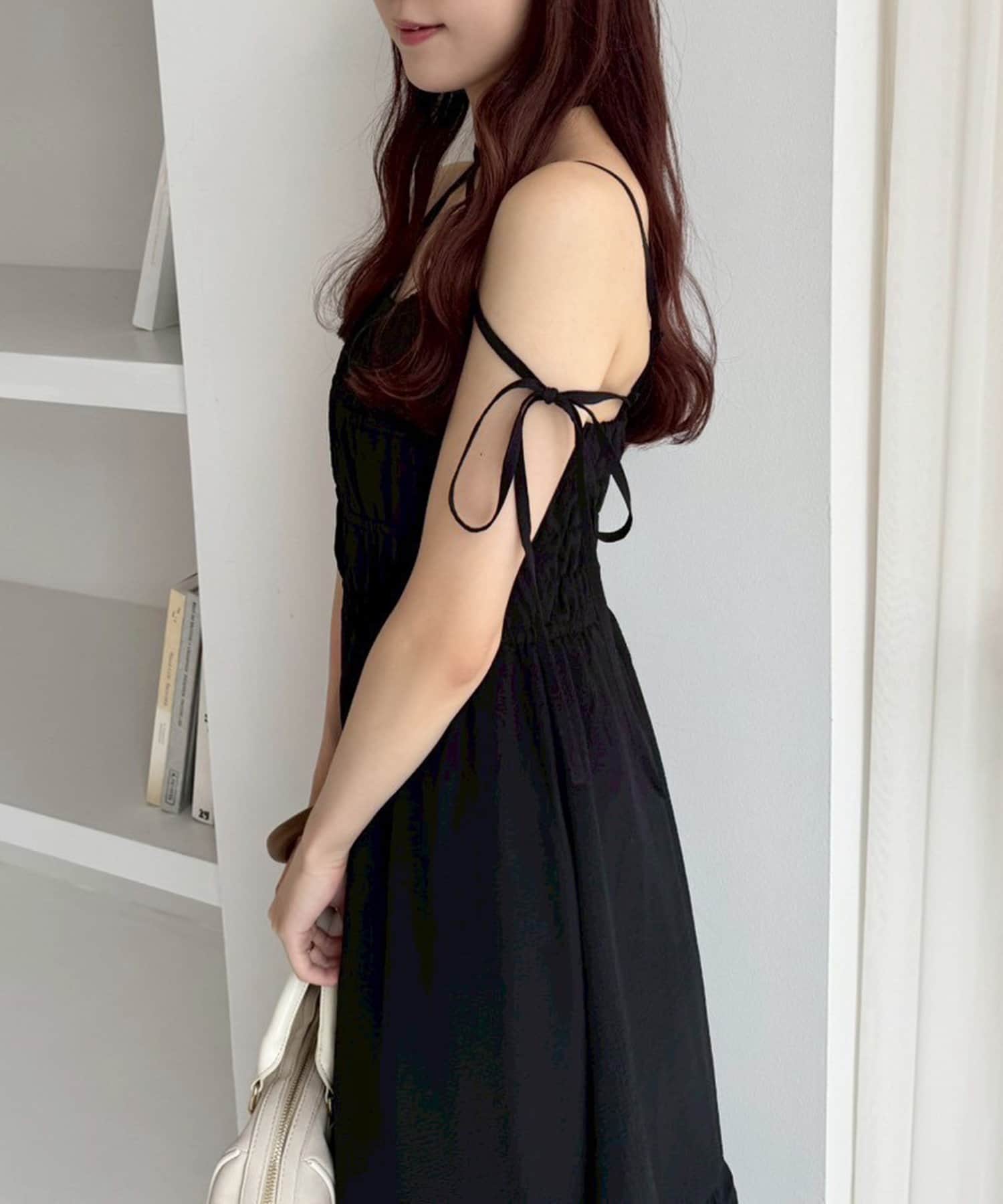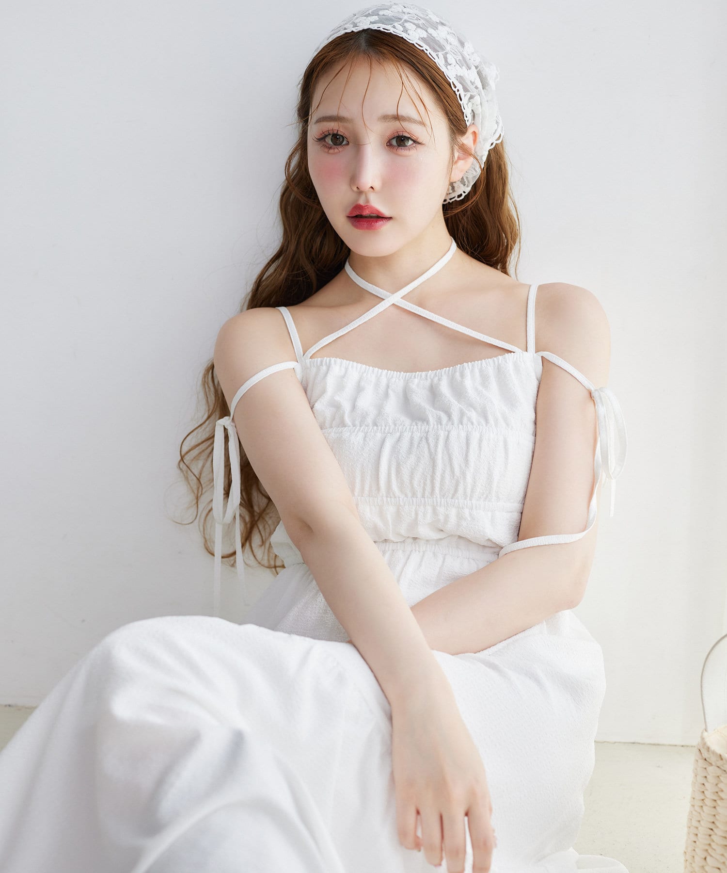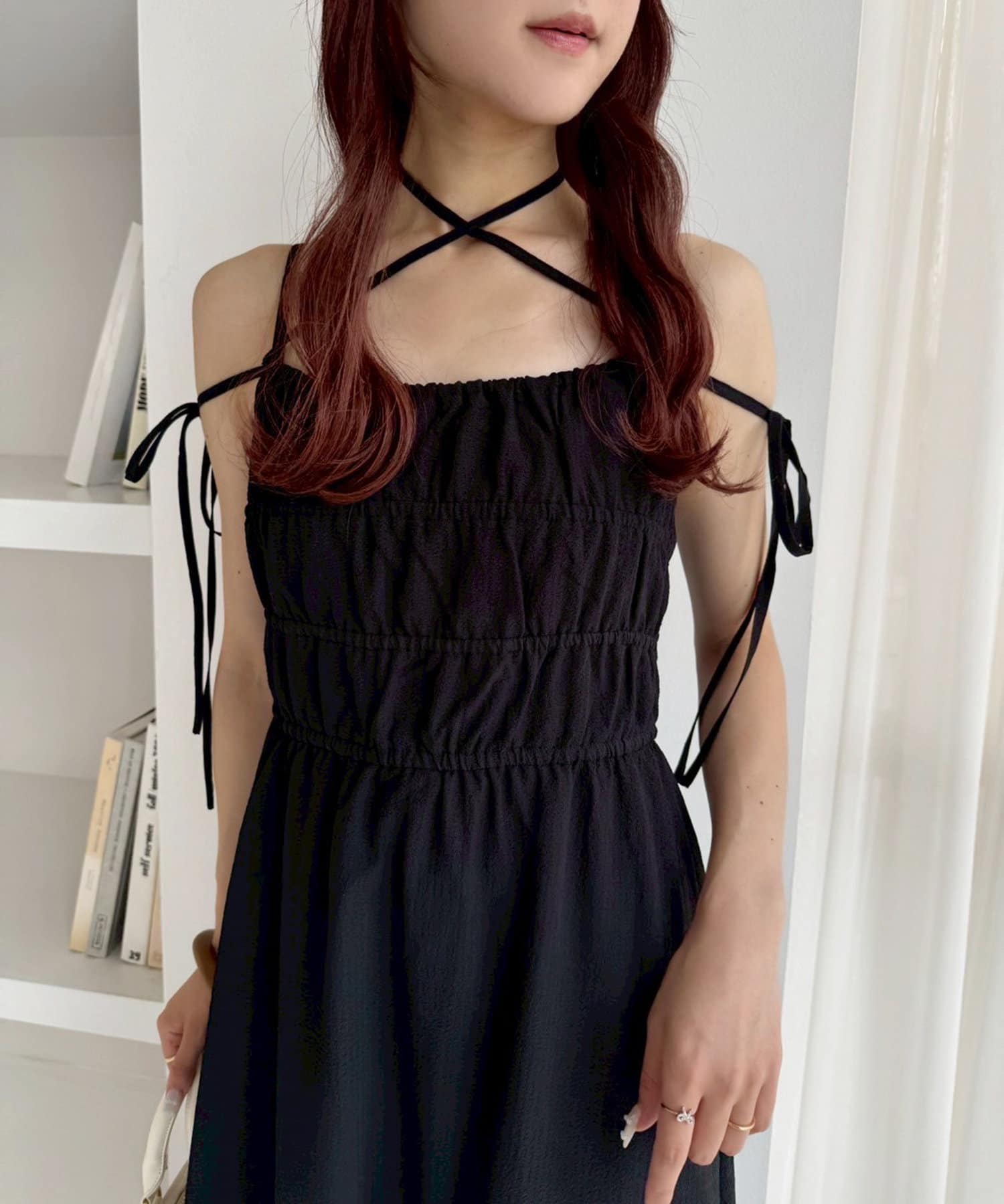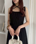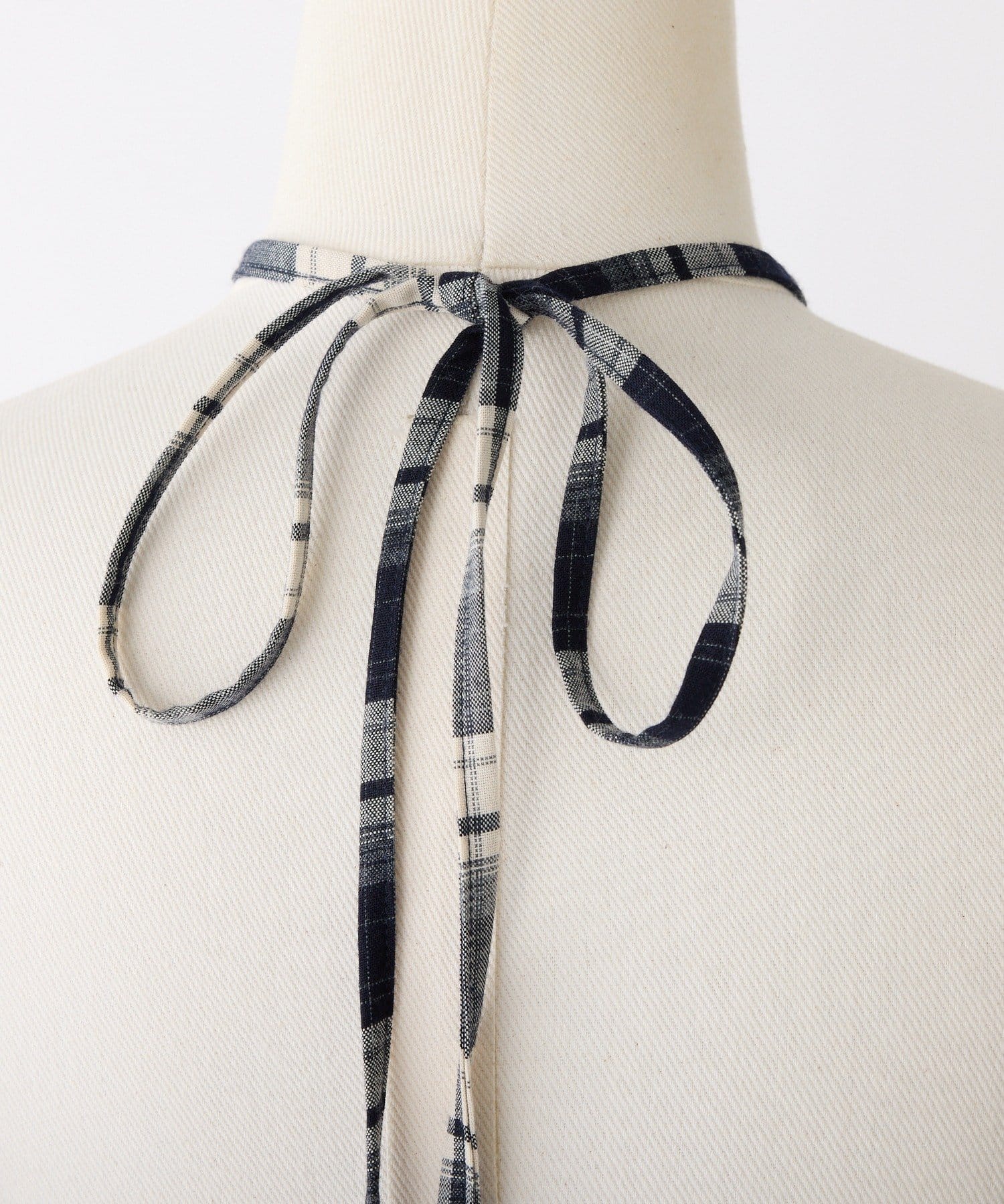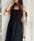 ホルターネックの紐はボタンで取り外しが出来て印象を変えられます。
