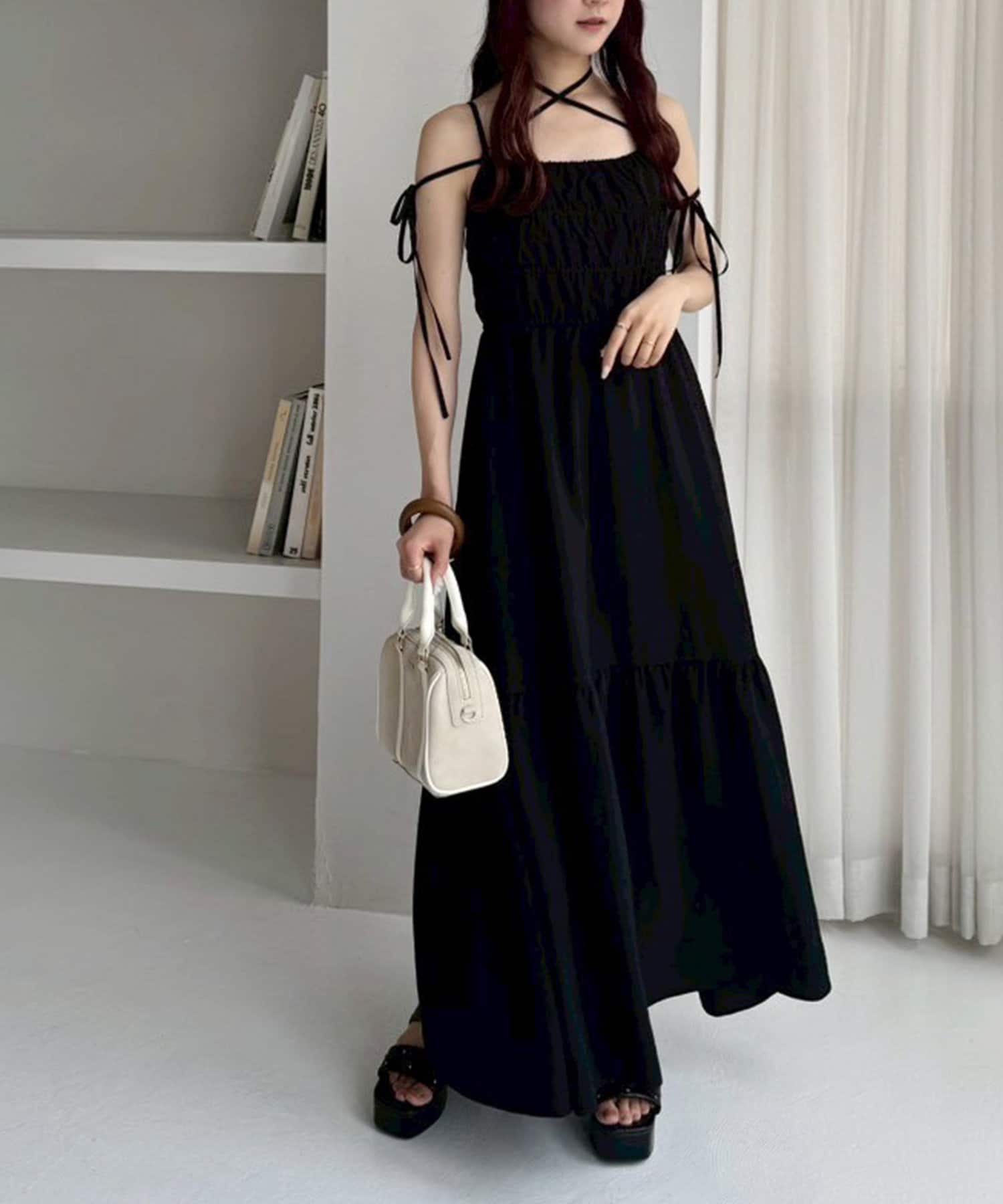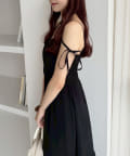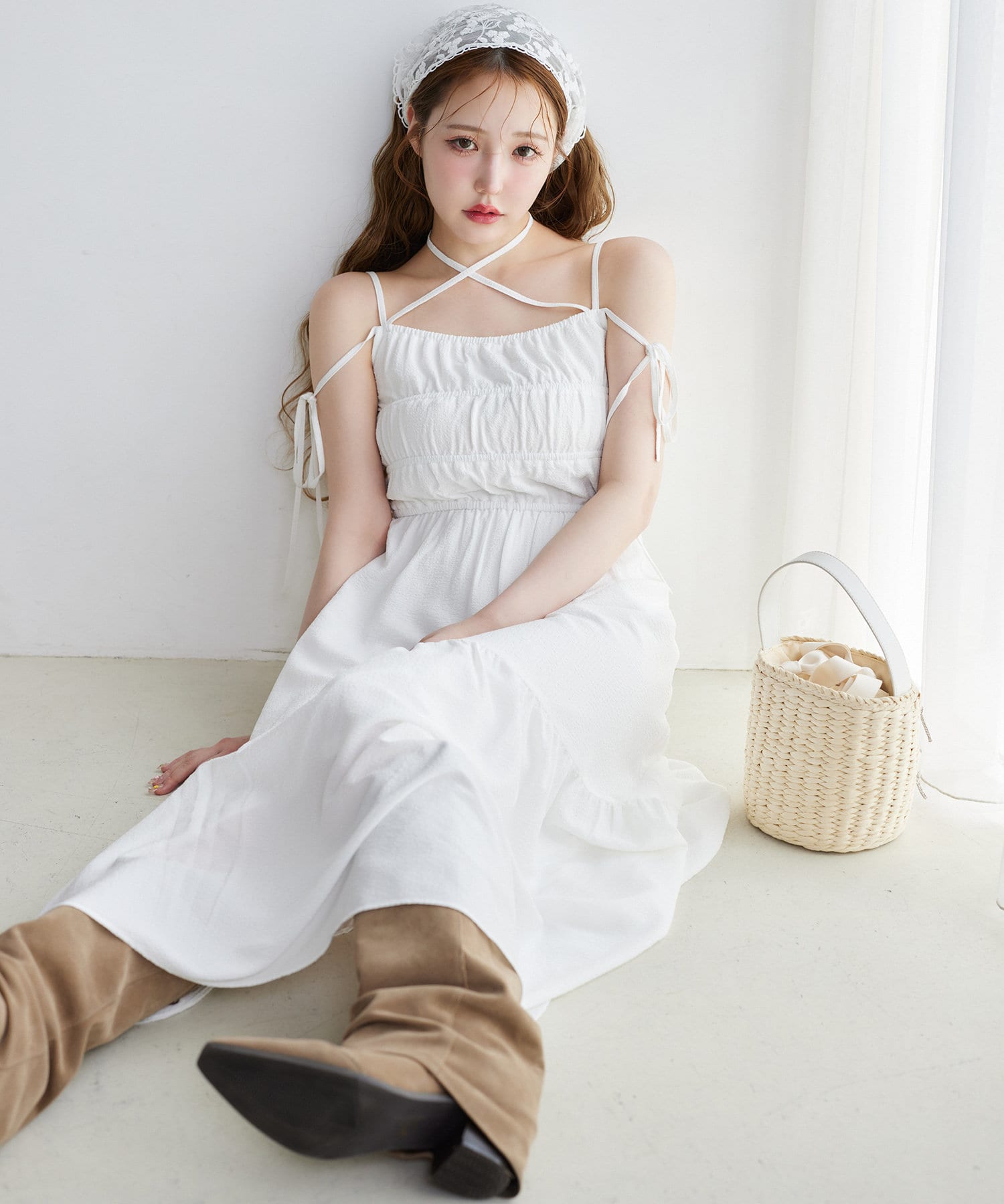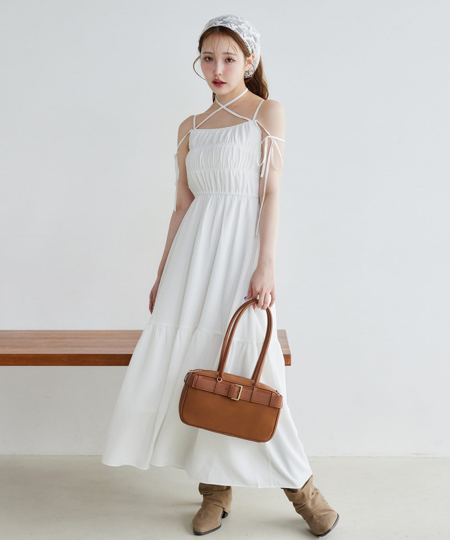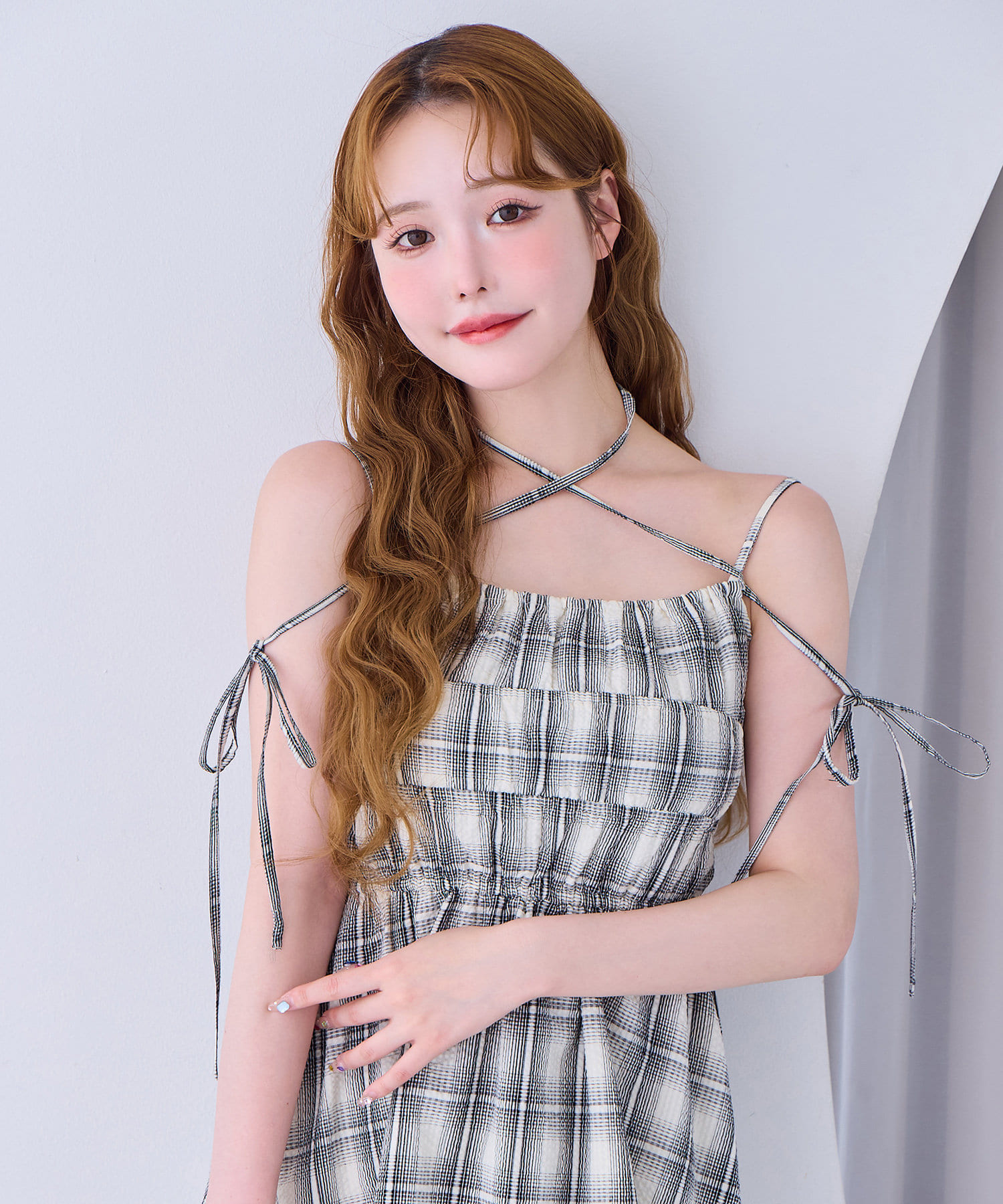 ホルターネックの紐はボタンで取り外しが出来て印象を変えられます。