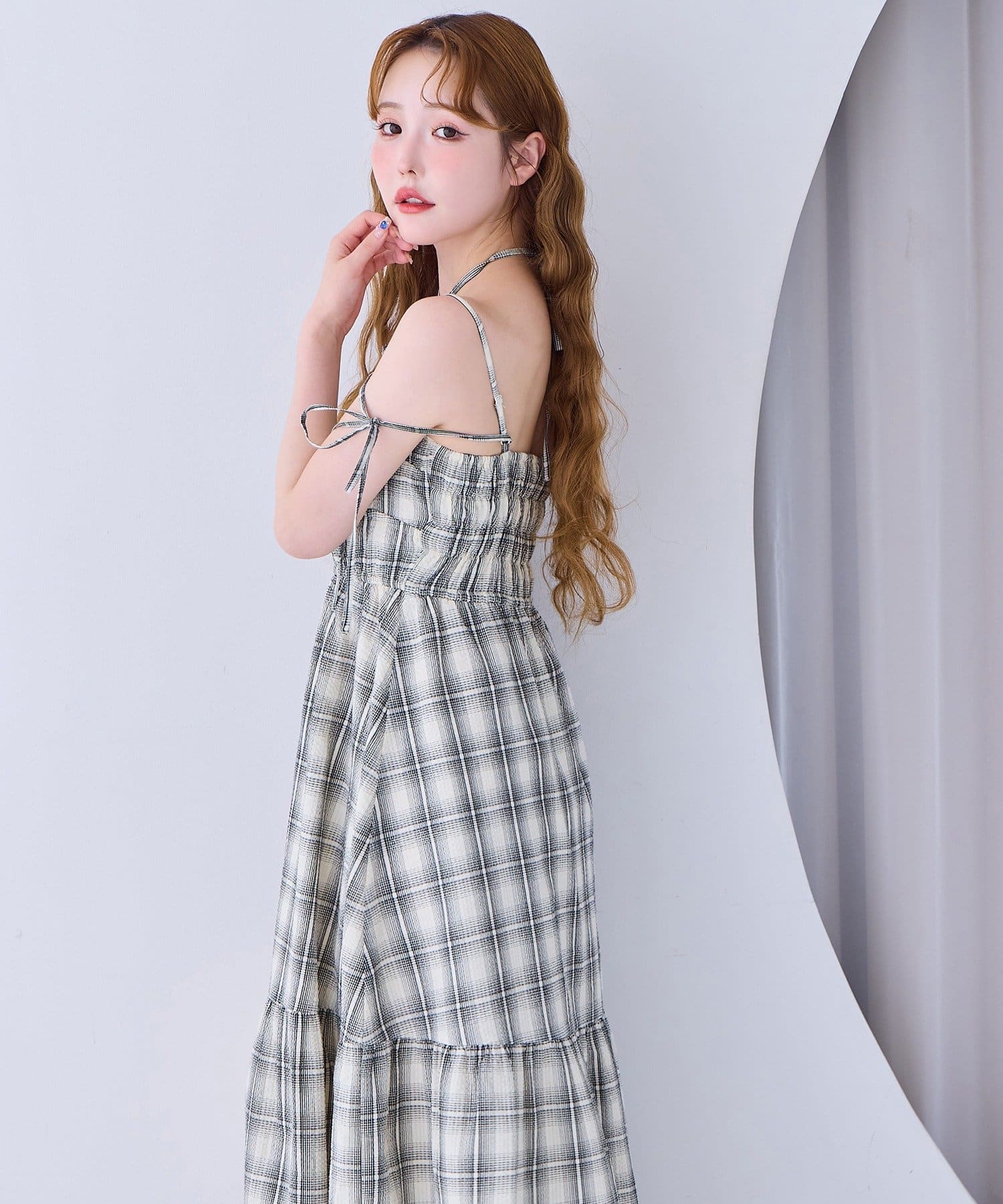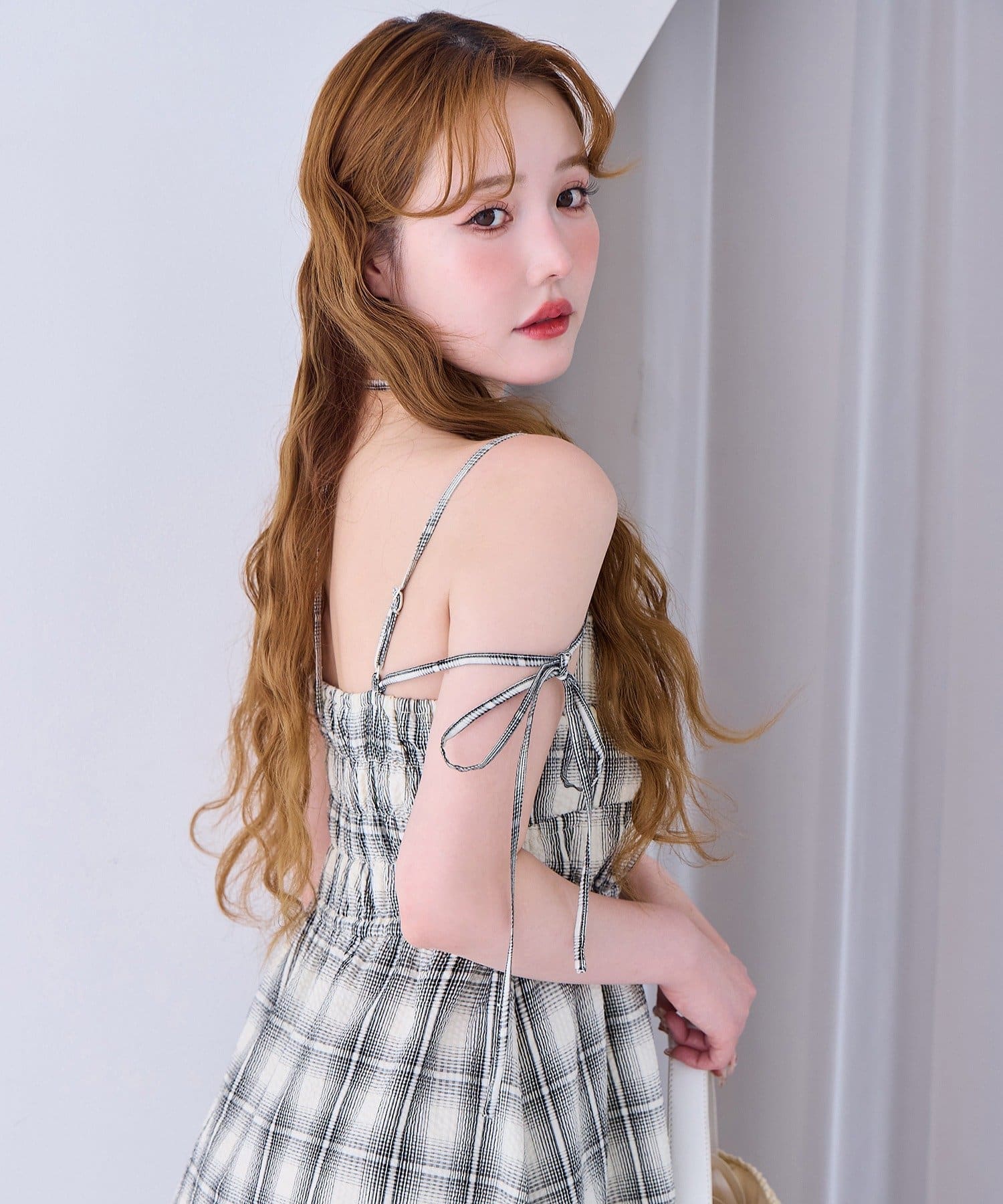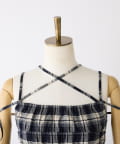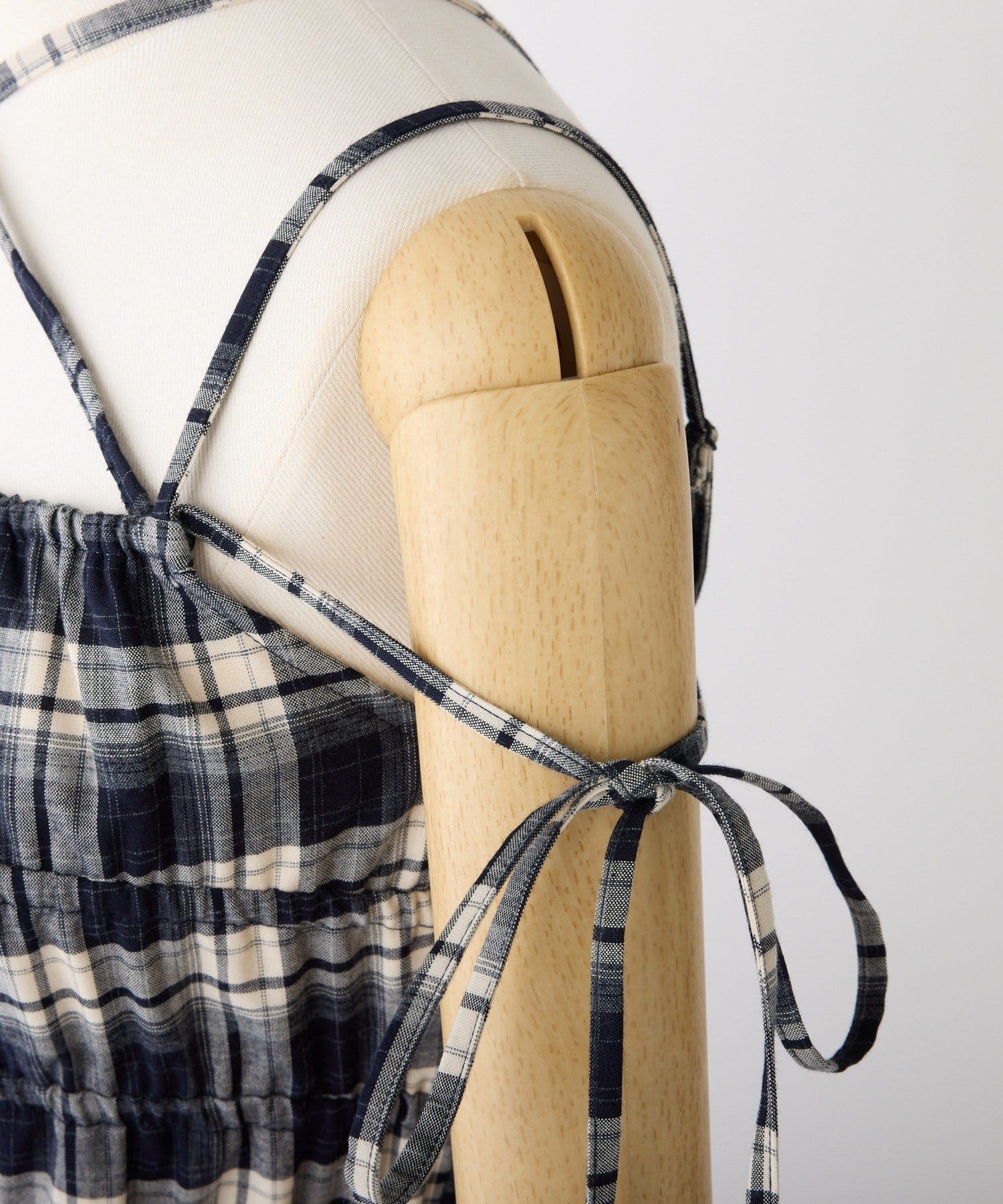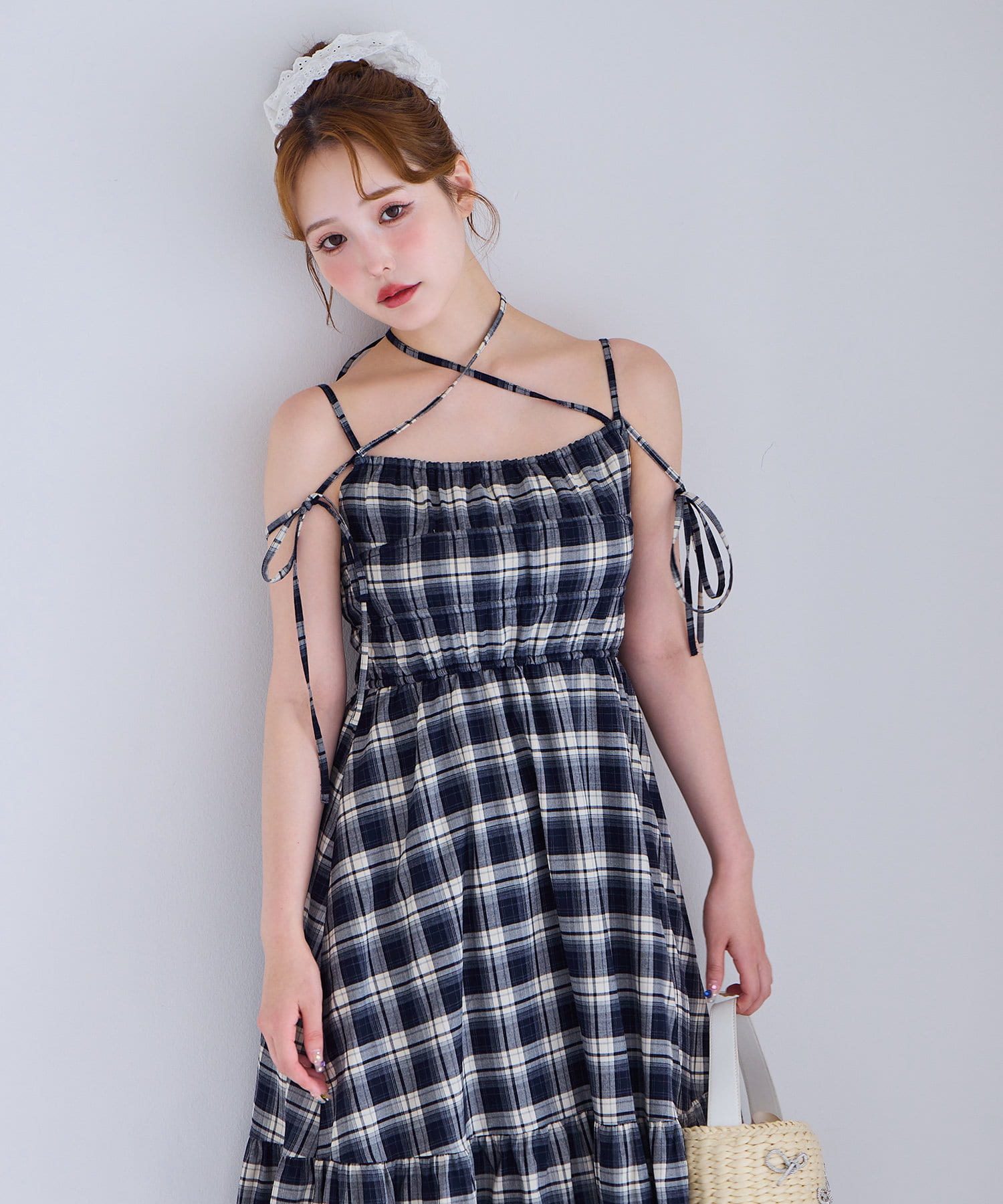 ホルターネックの紐はボタンで取り外しが出来て印象を変えられます。