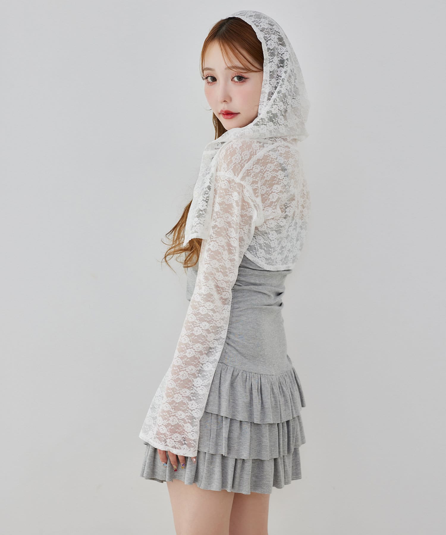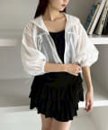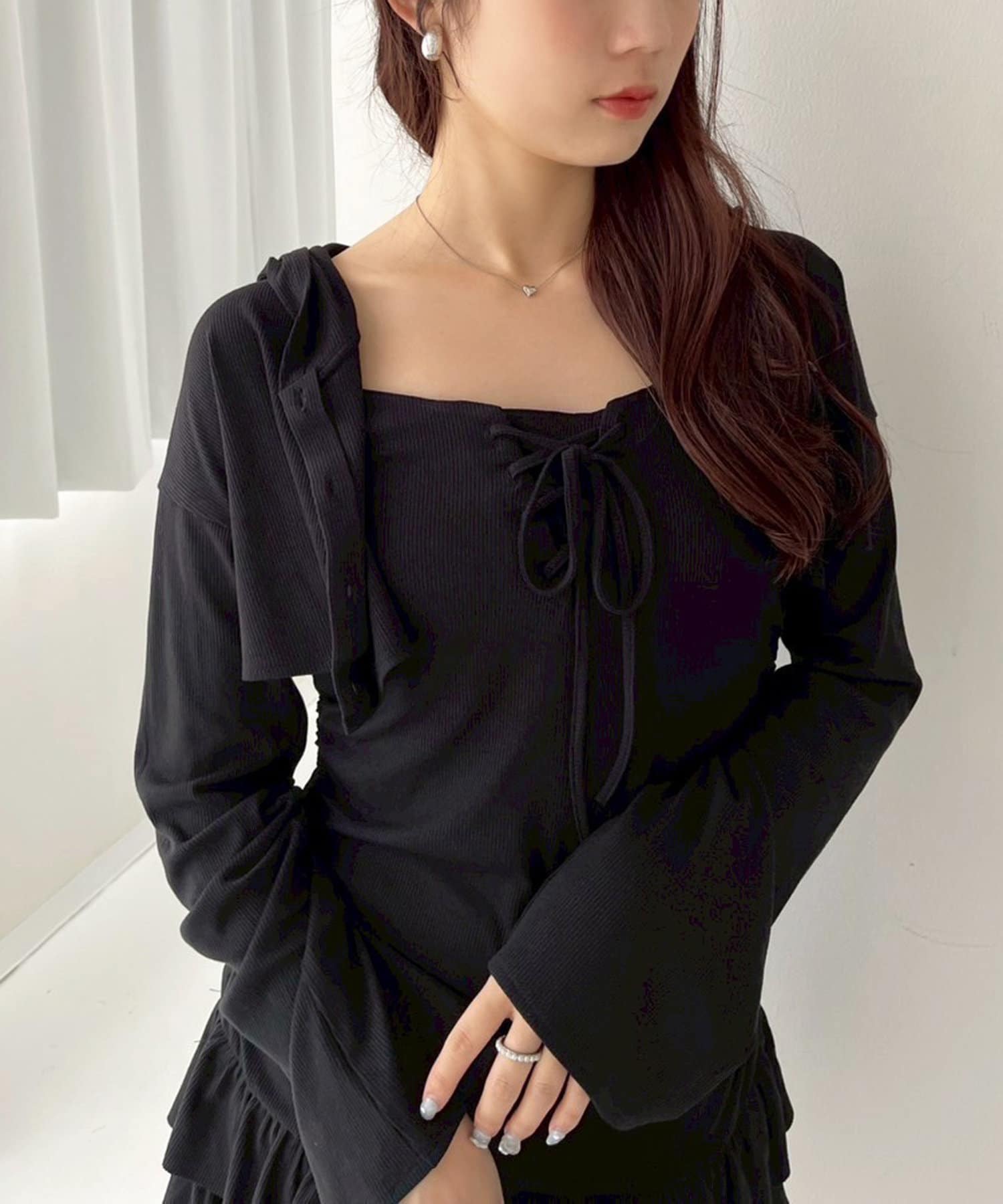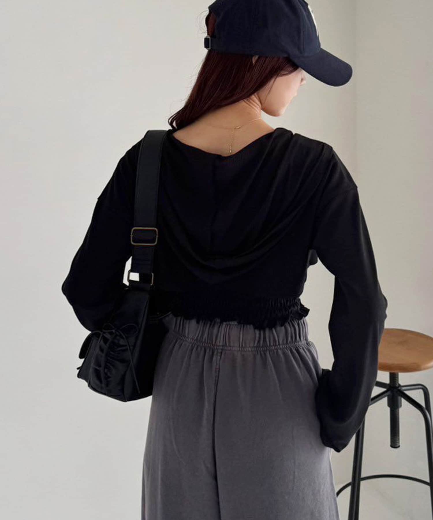 パーカーはベルスリーブで腕を綺麗に見せつつ、短丈でスタイルアップ効果も◎