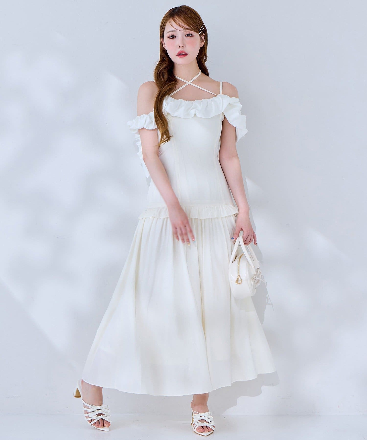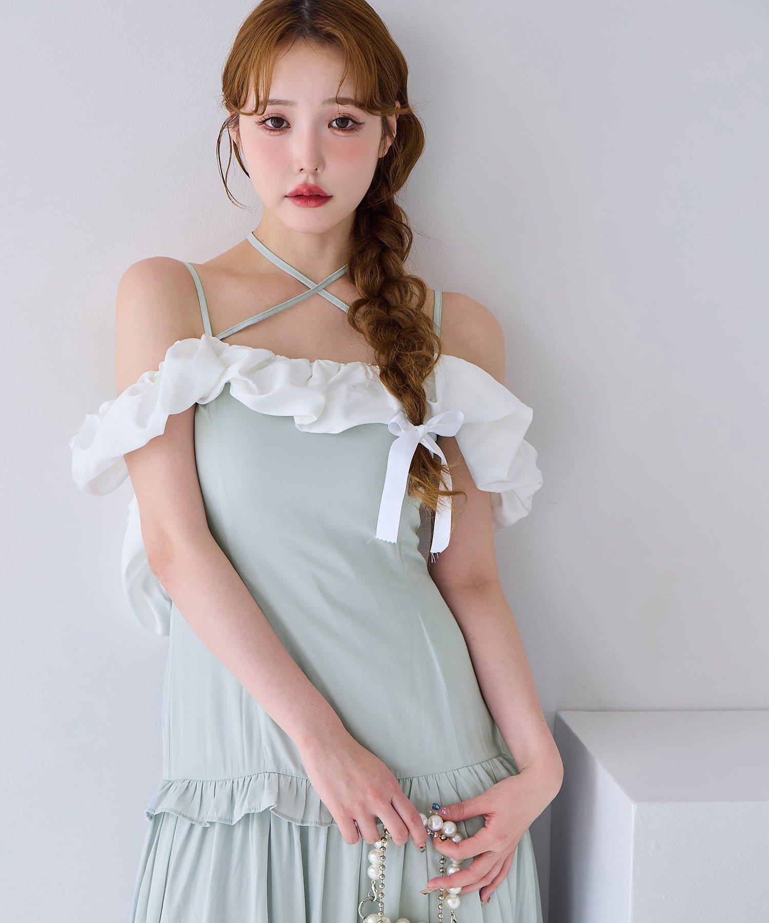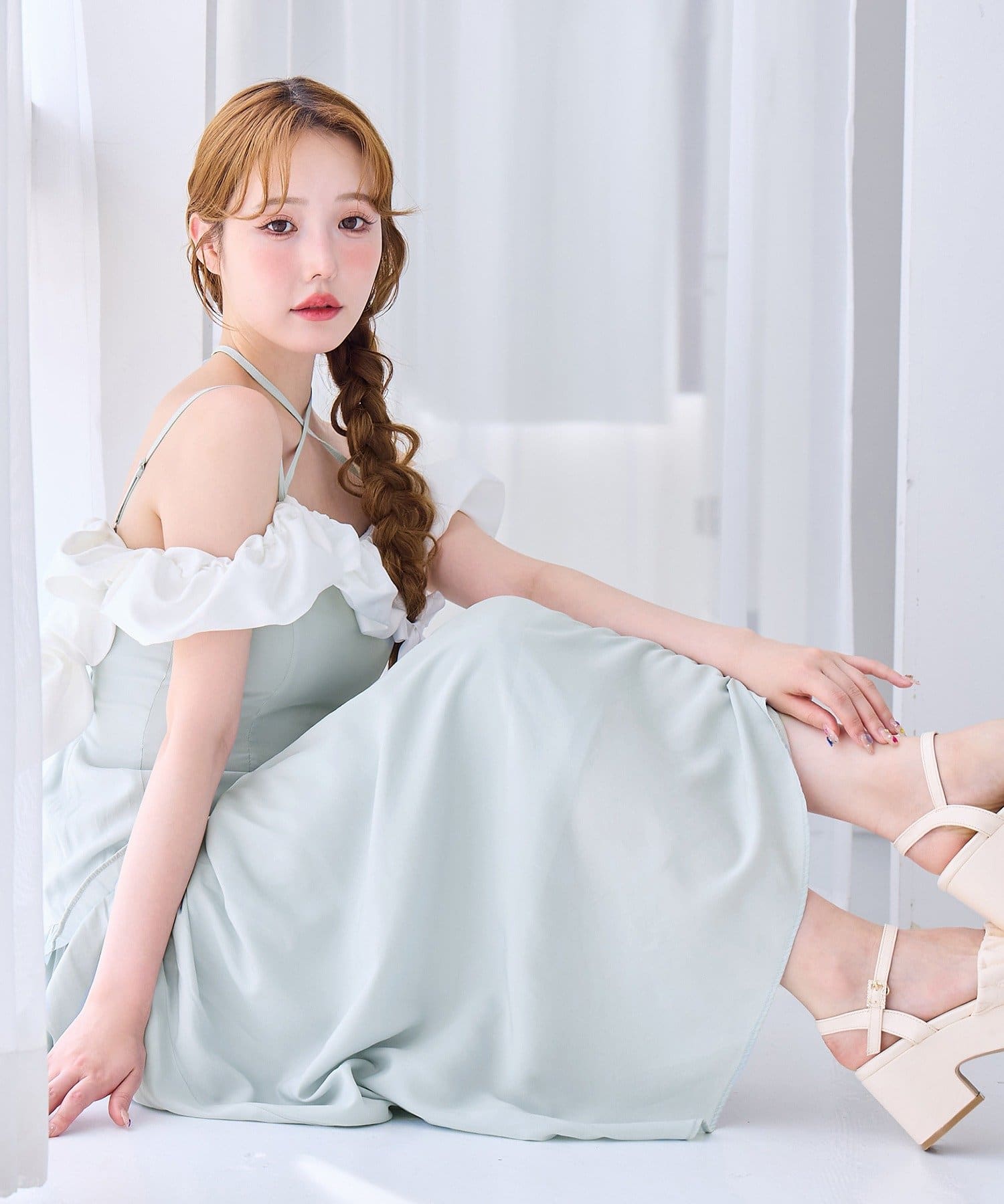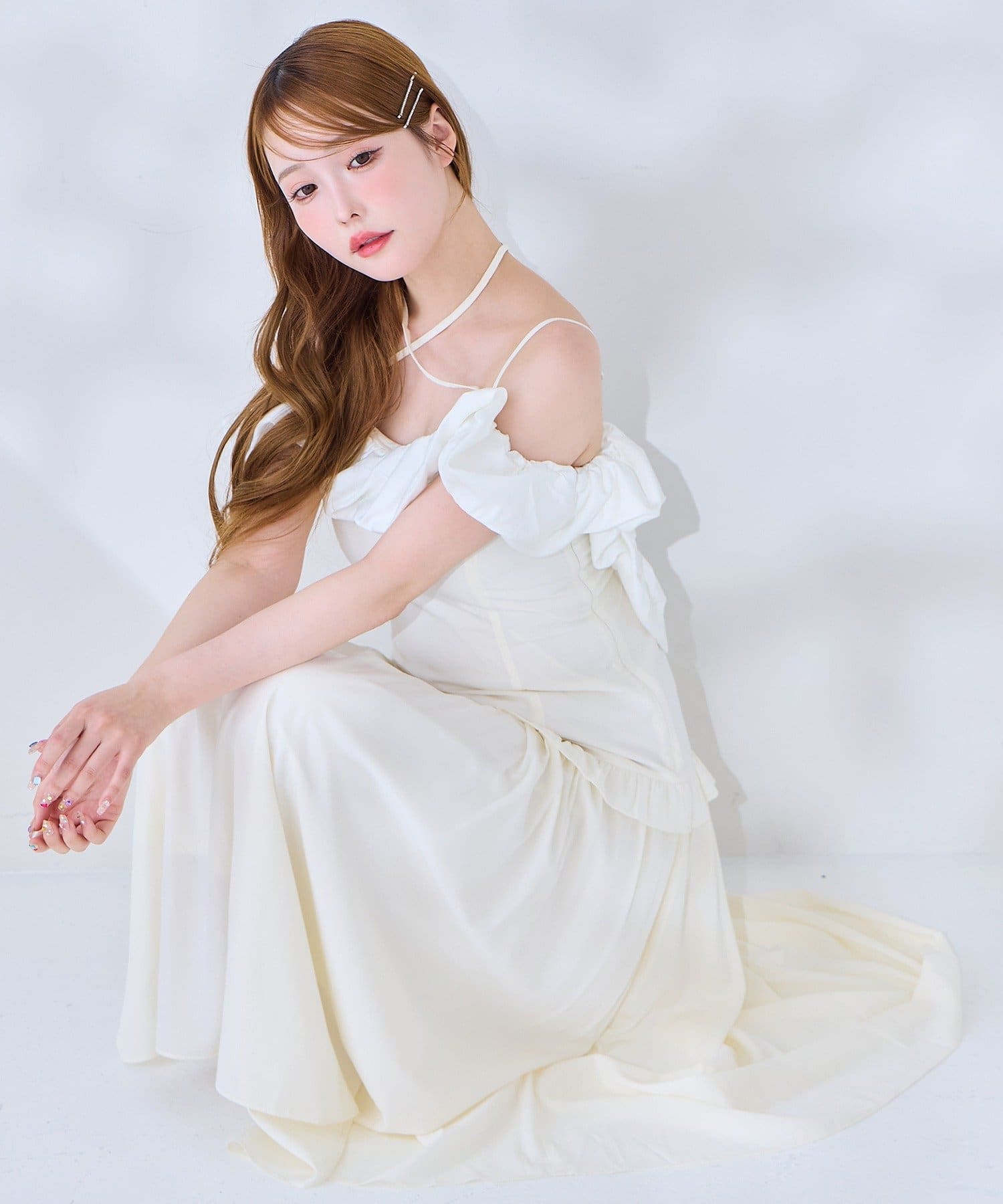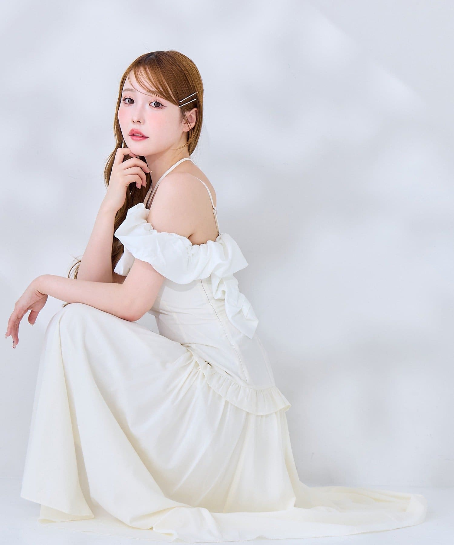 オフショルダー風の立体的なフリルが華やかさをプラス。