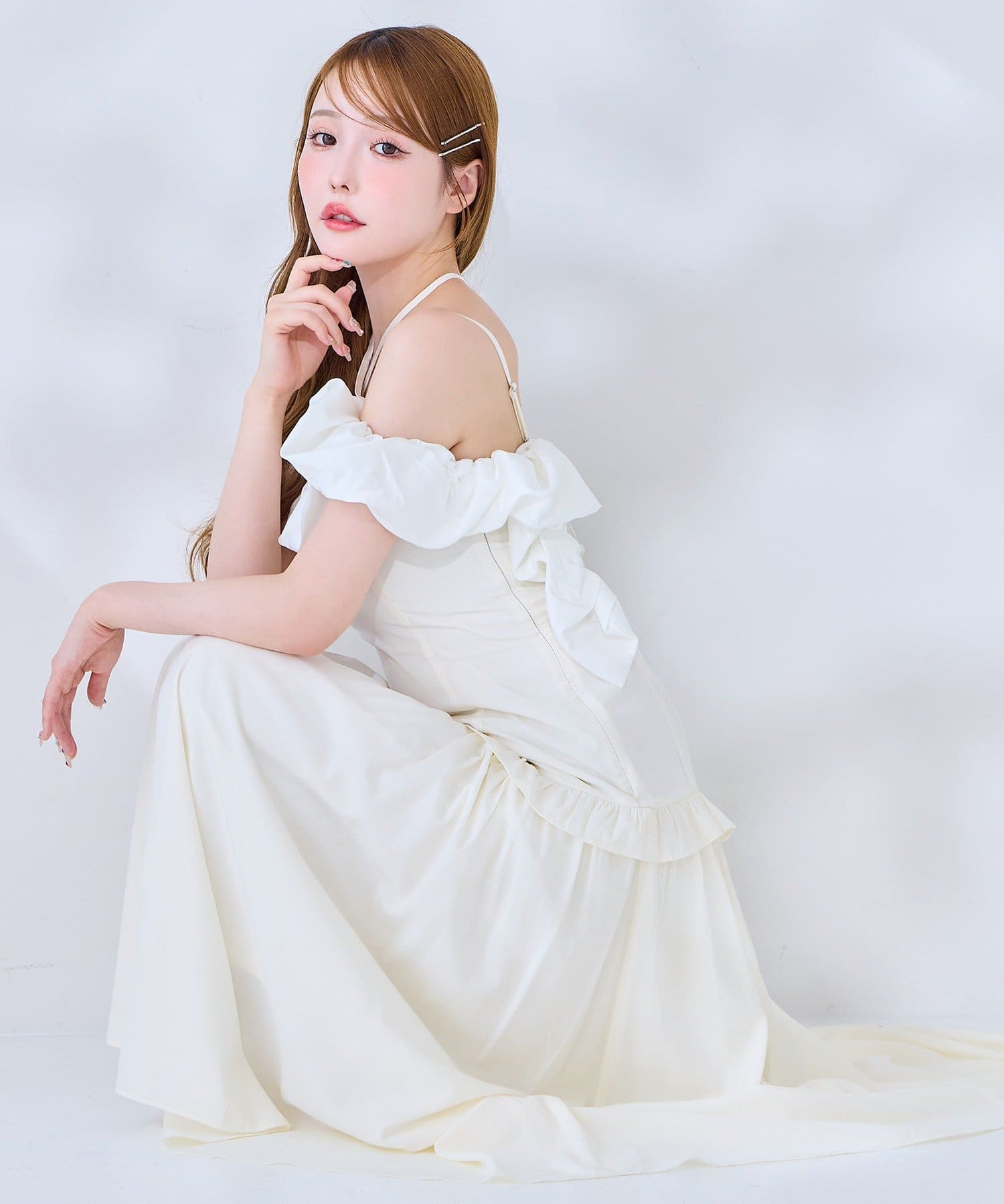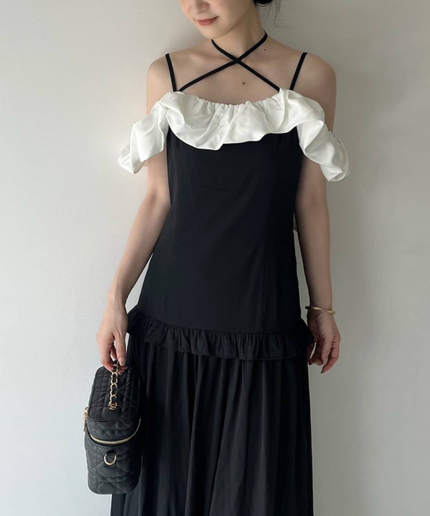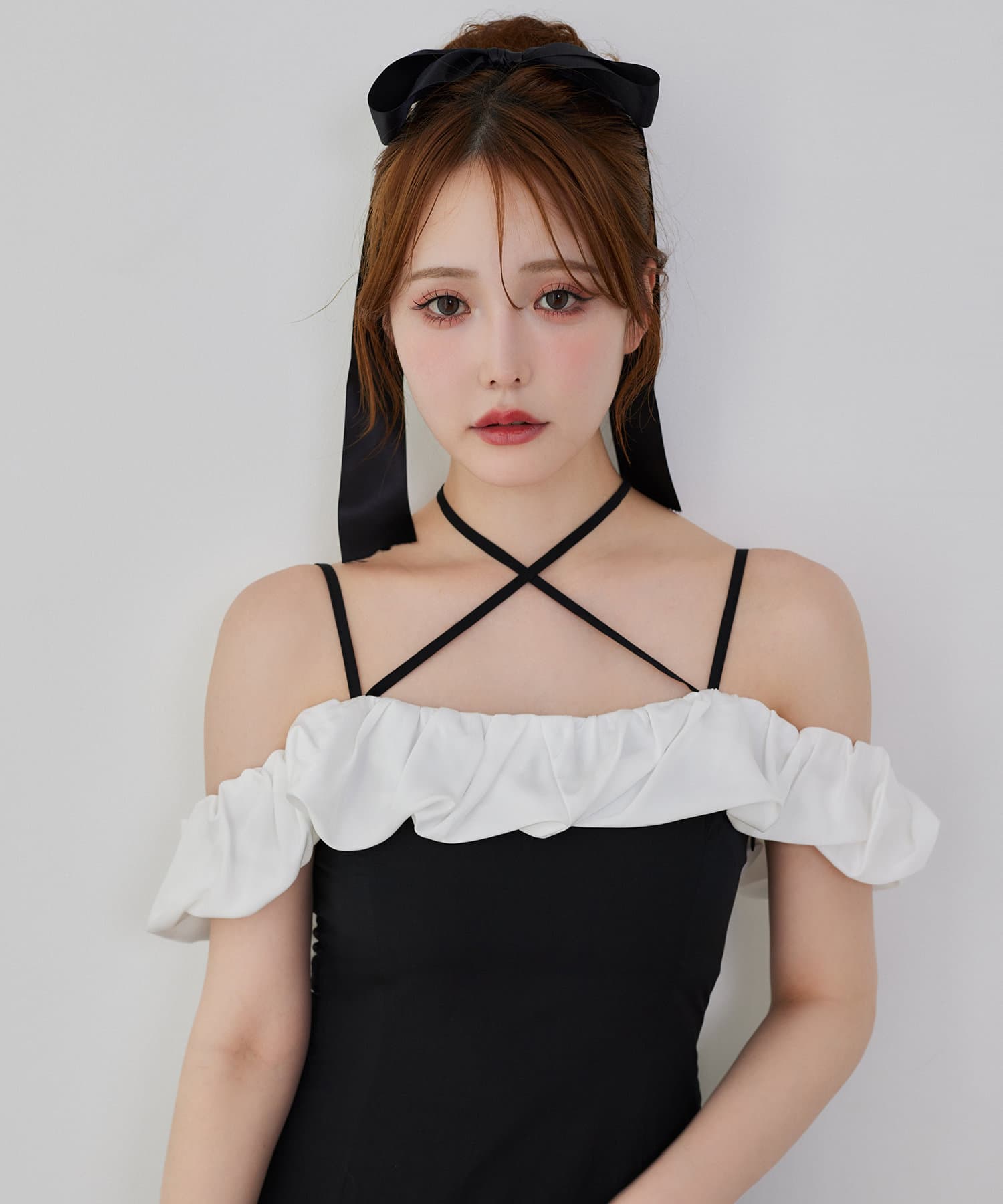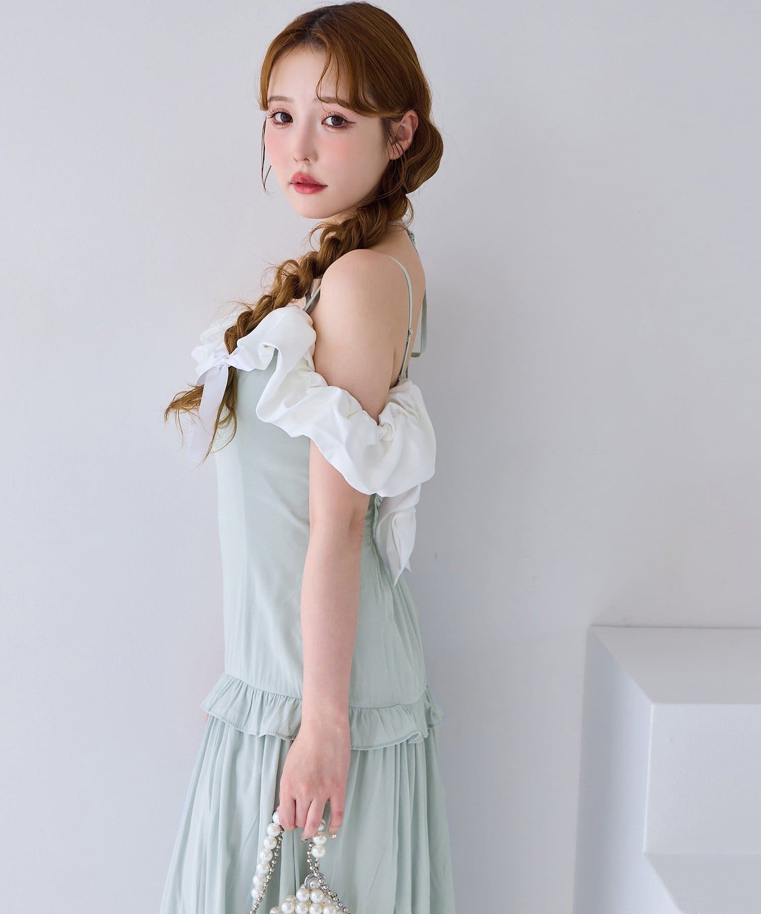 オフショルダー風の立体的なフリルが華やかさをプラス。