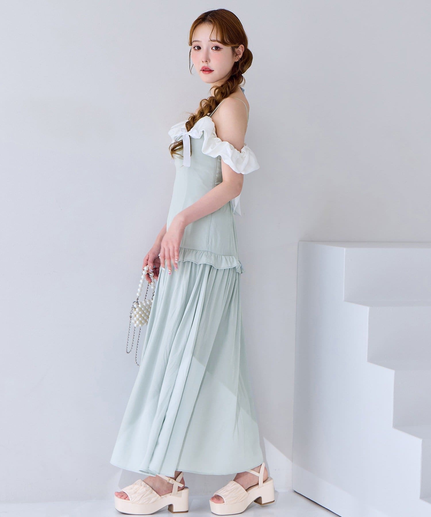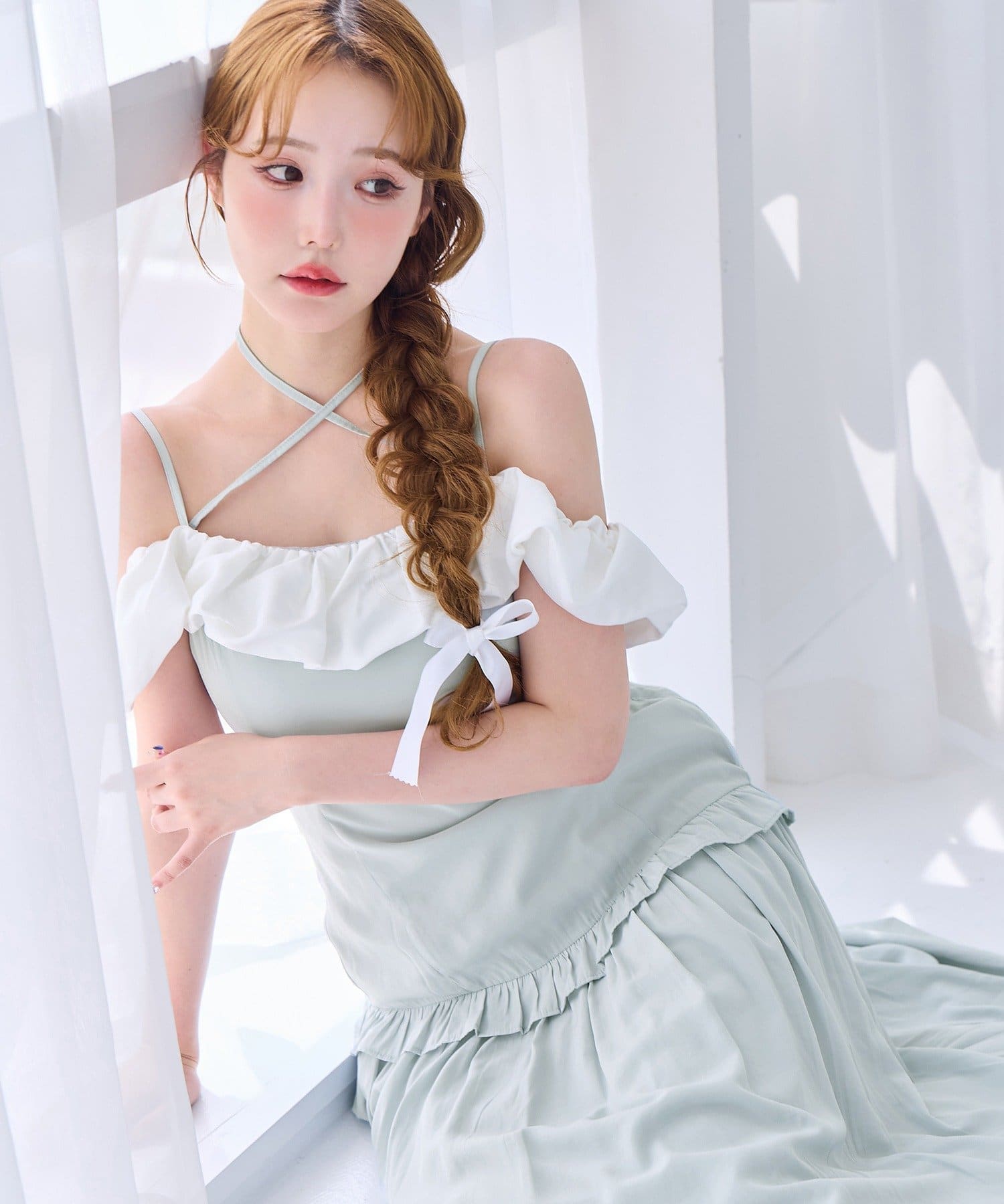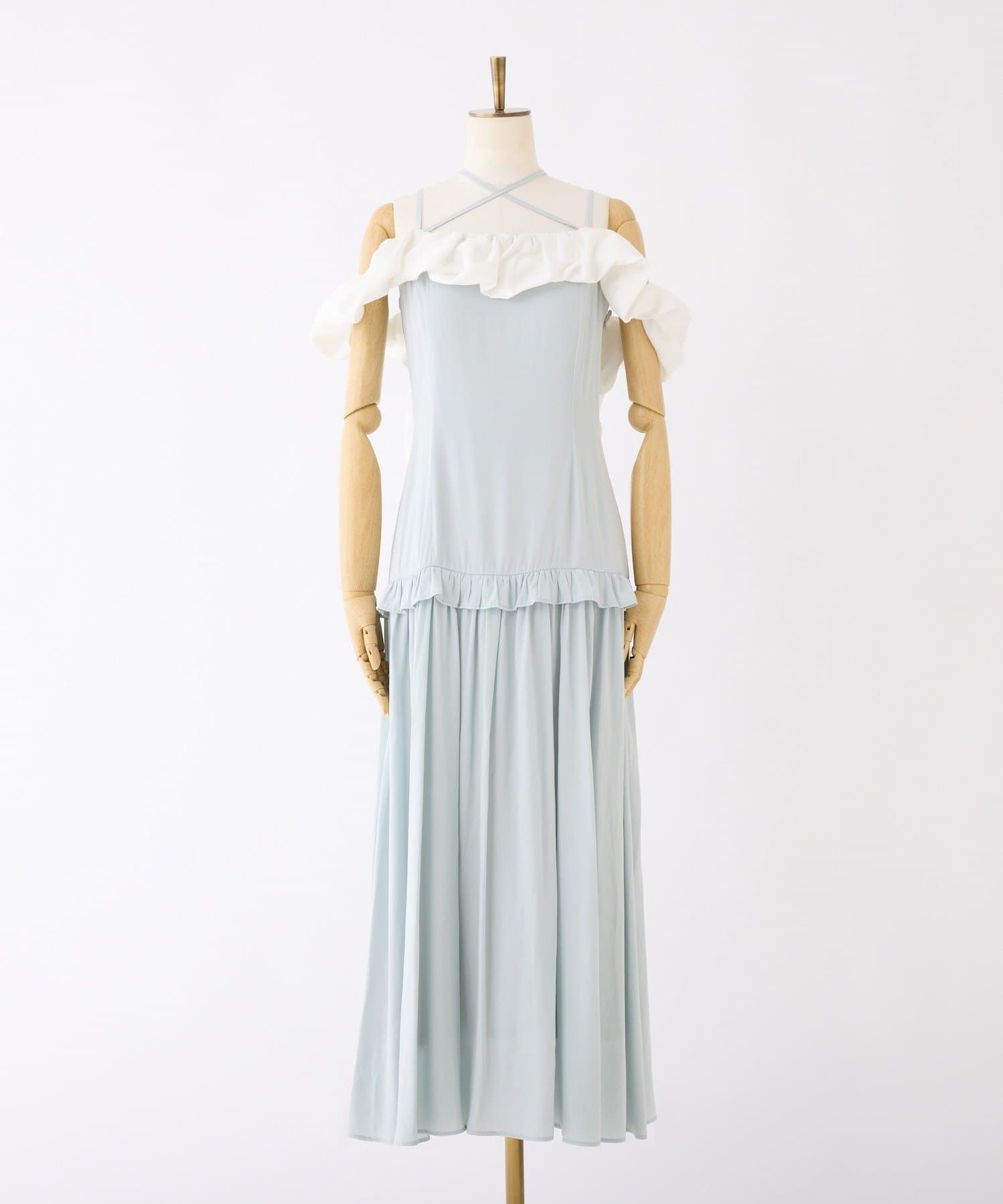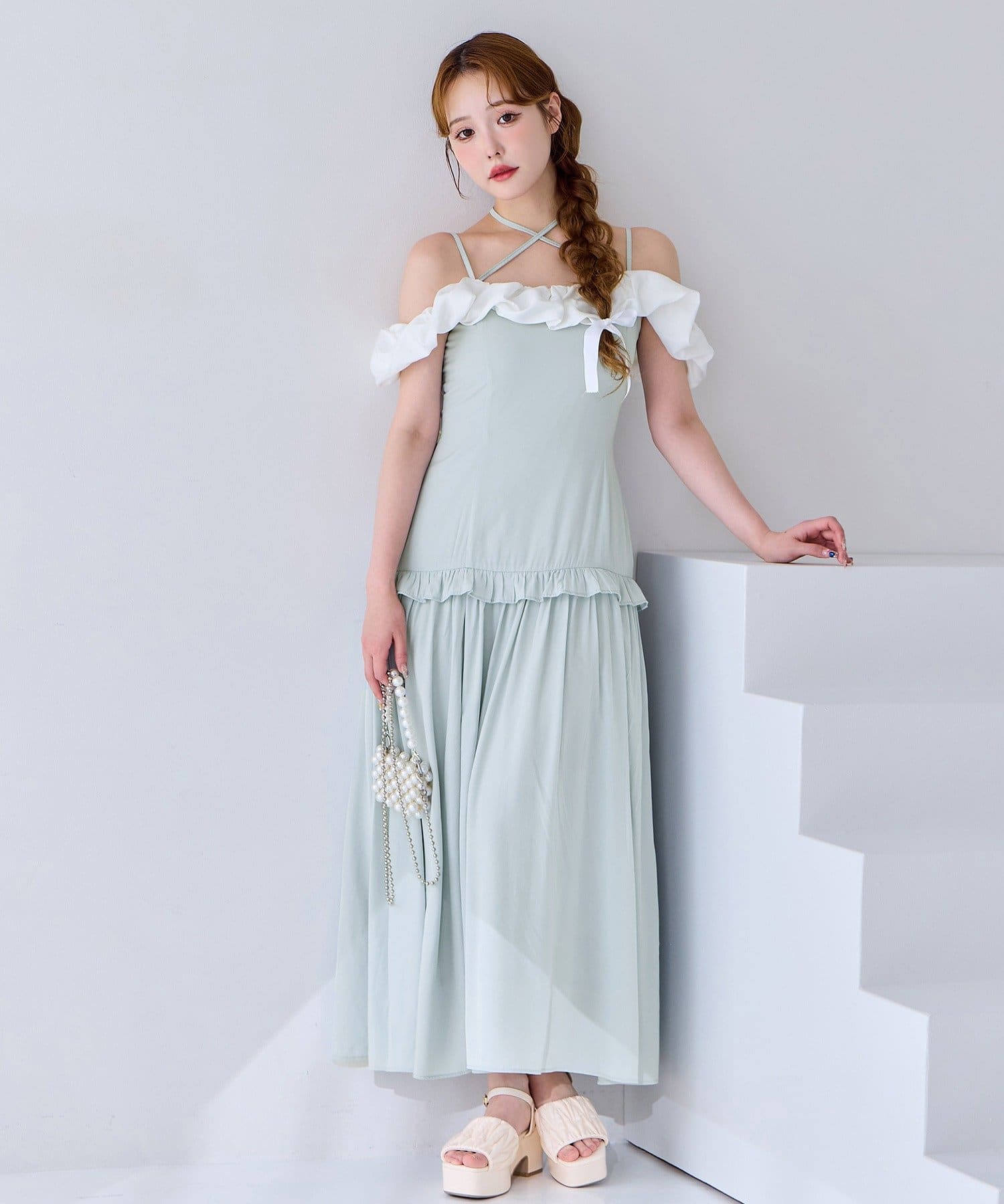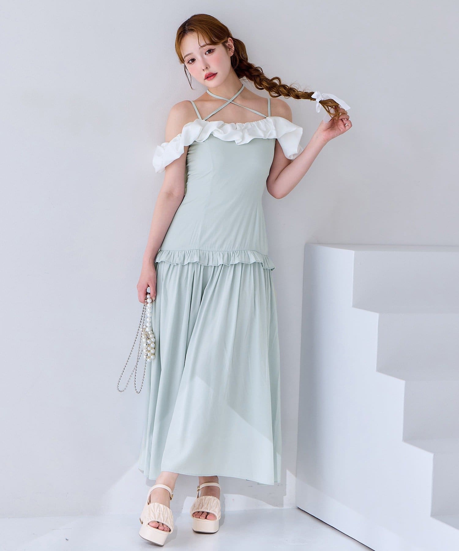 オフショルダー風の立体的なフリルが華やかさをプラス。