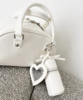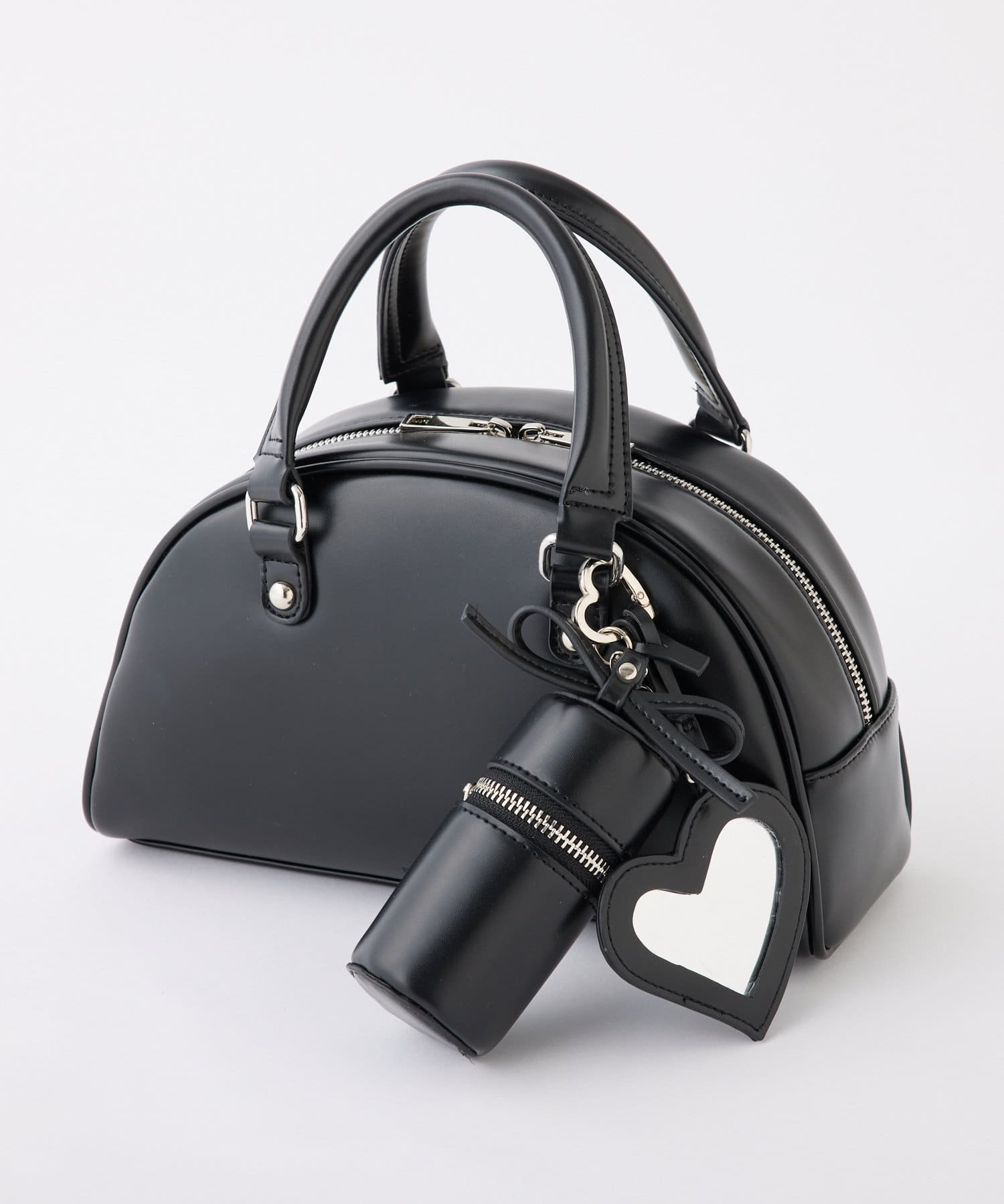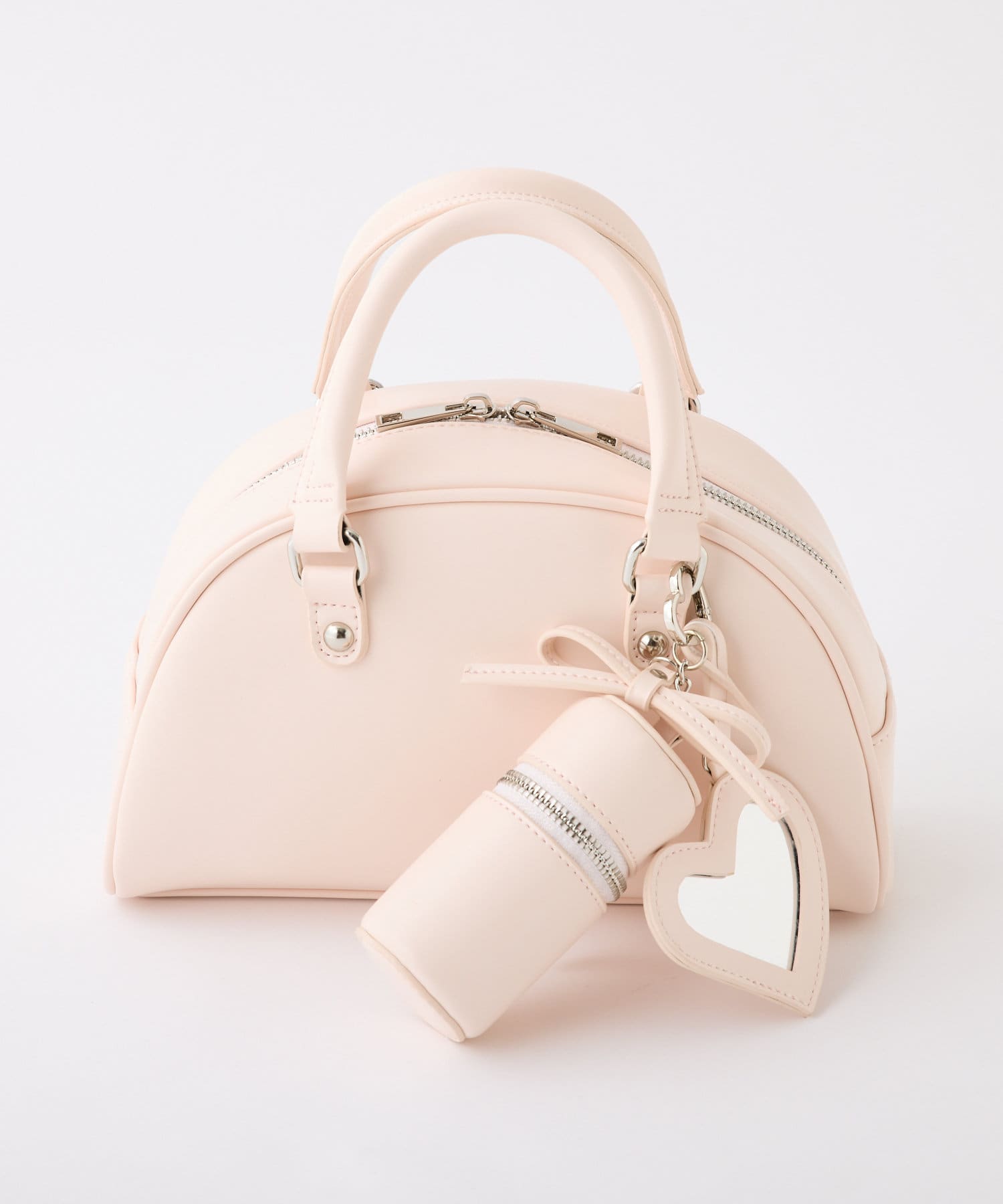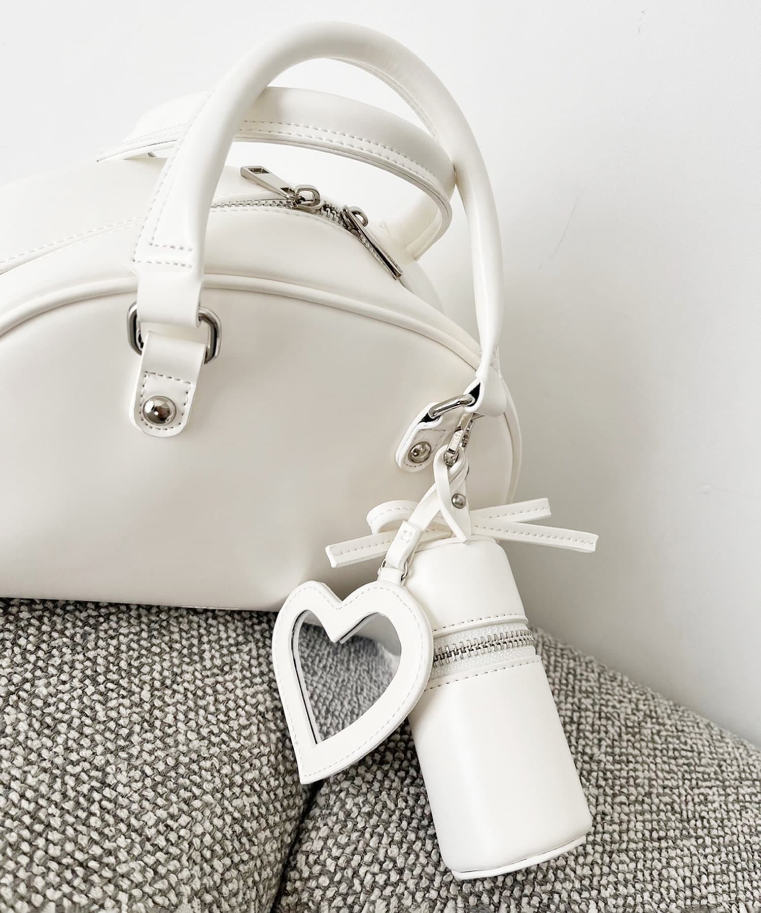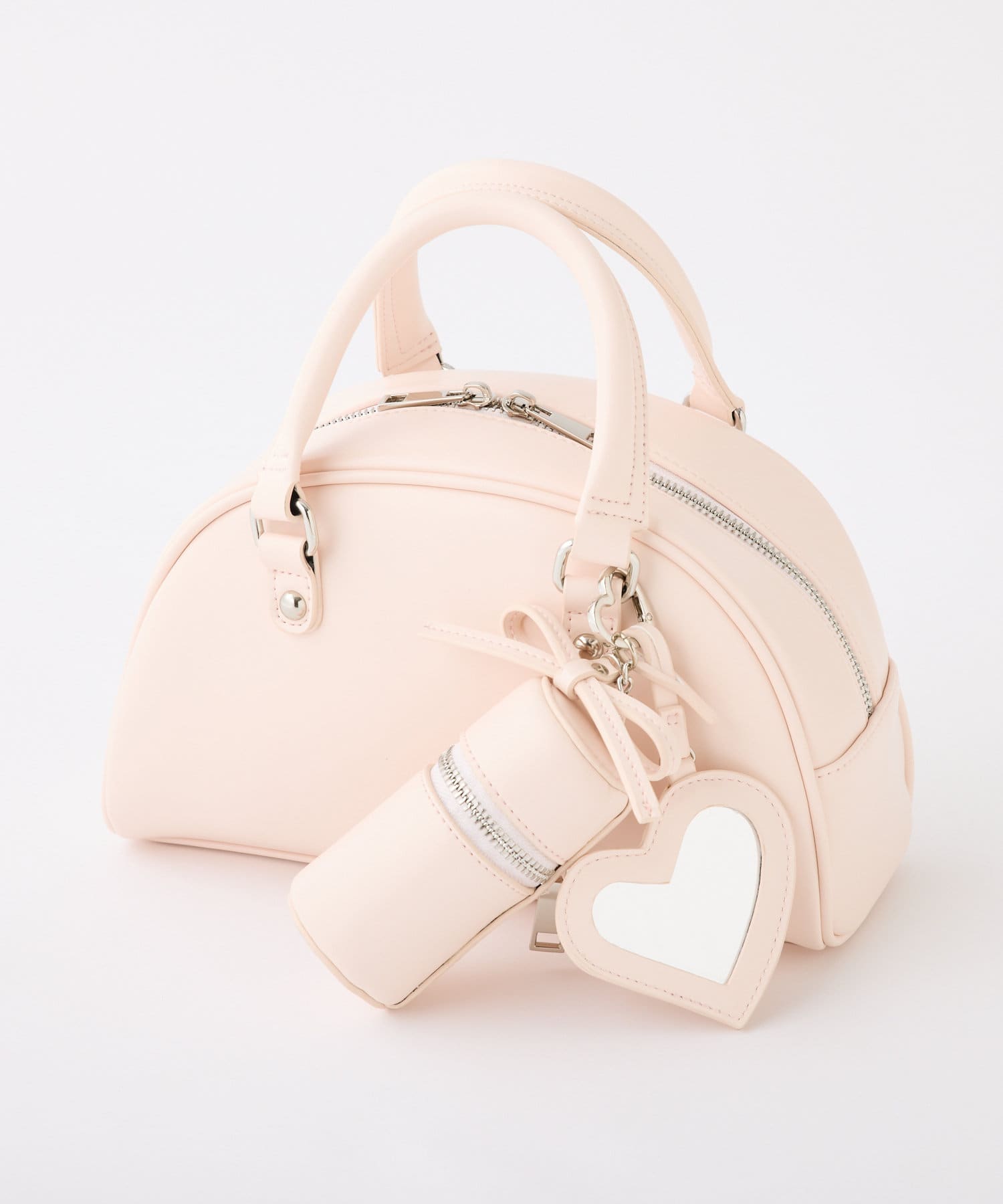 リボンのチャームとハートのミラーとリップケースが付いたボストンバッグ