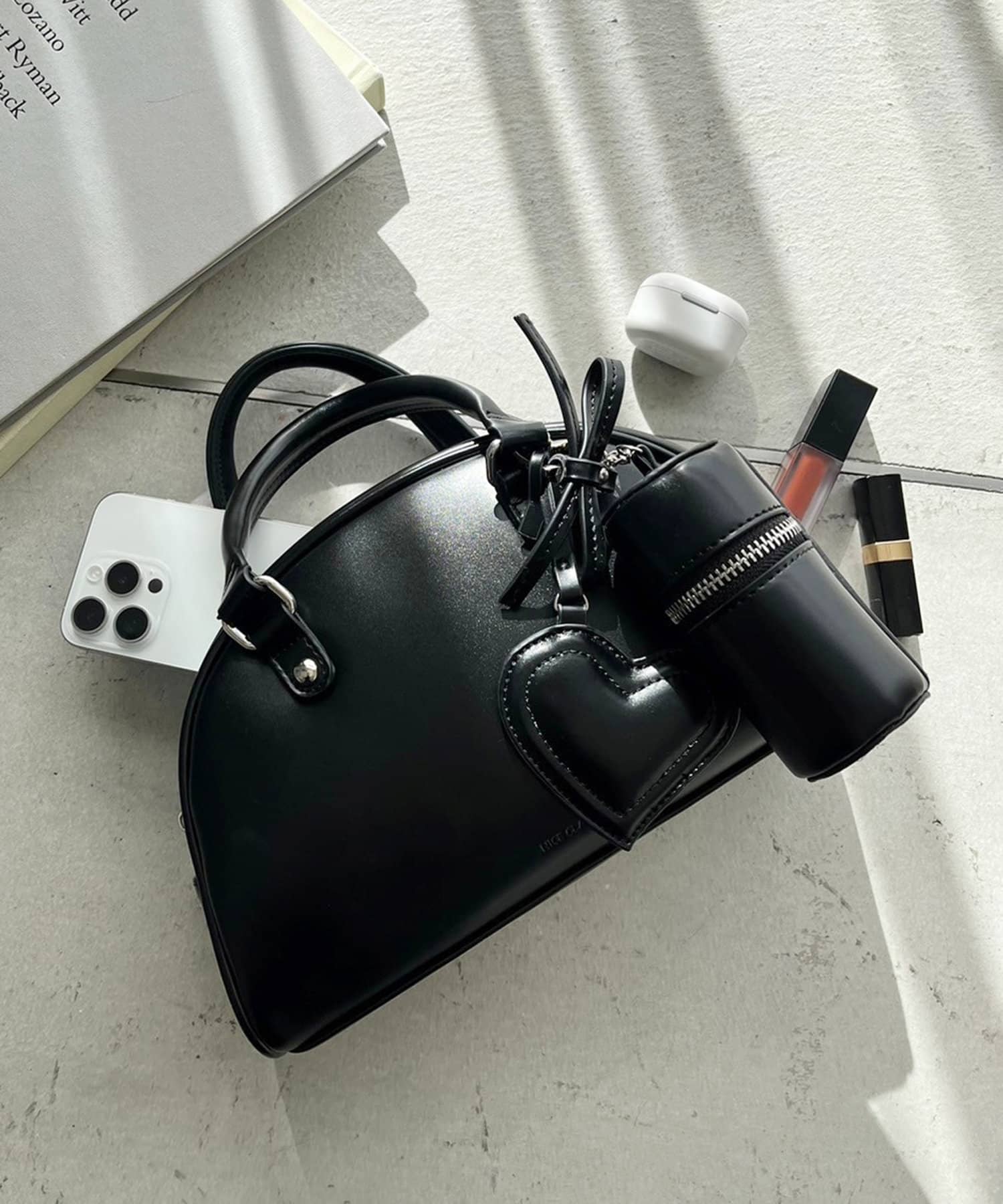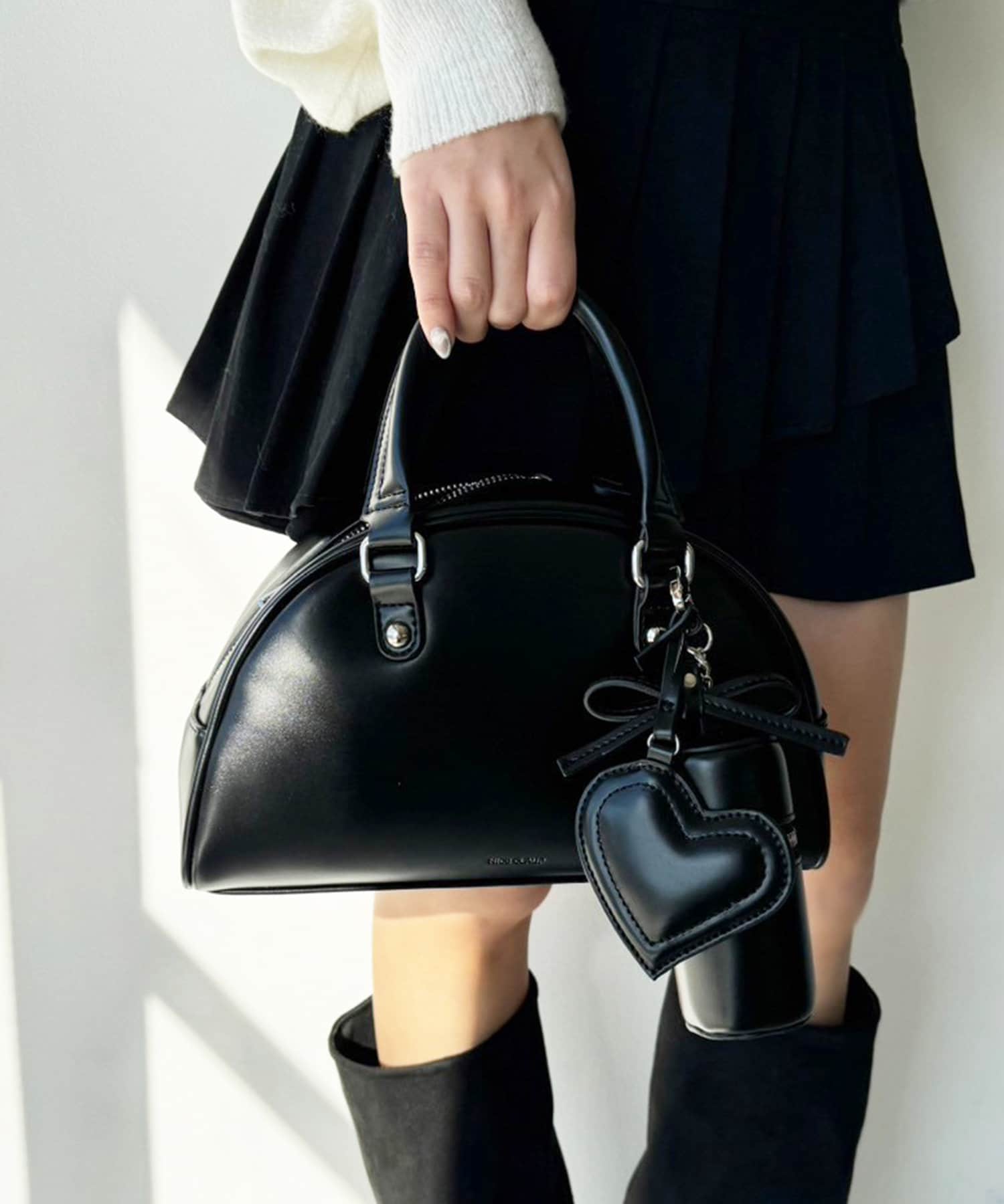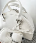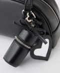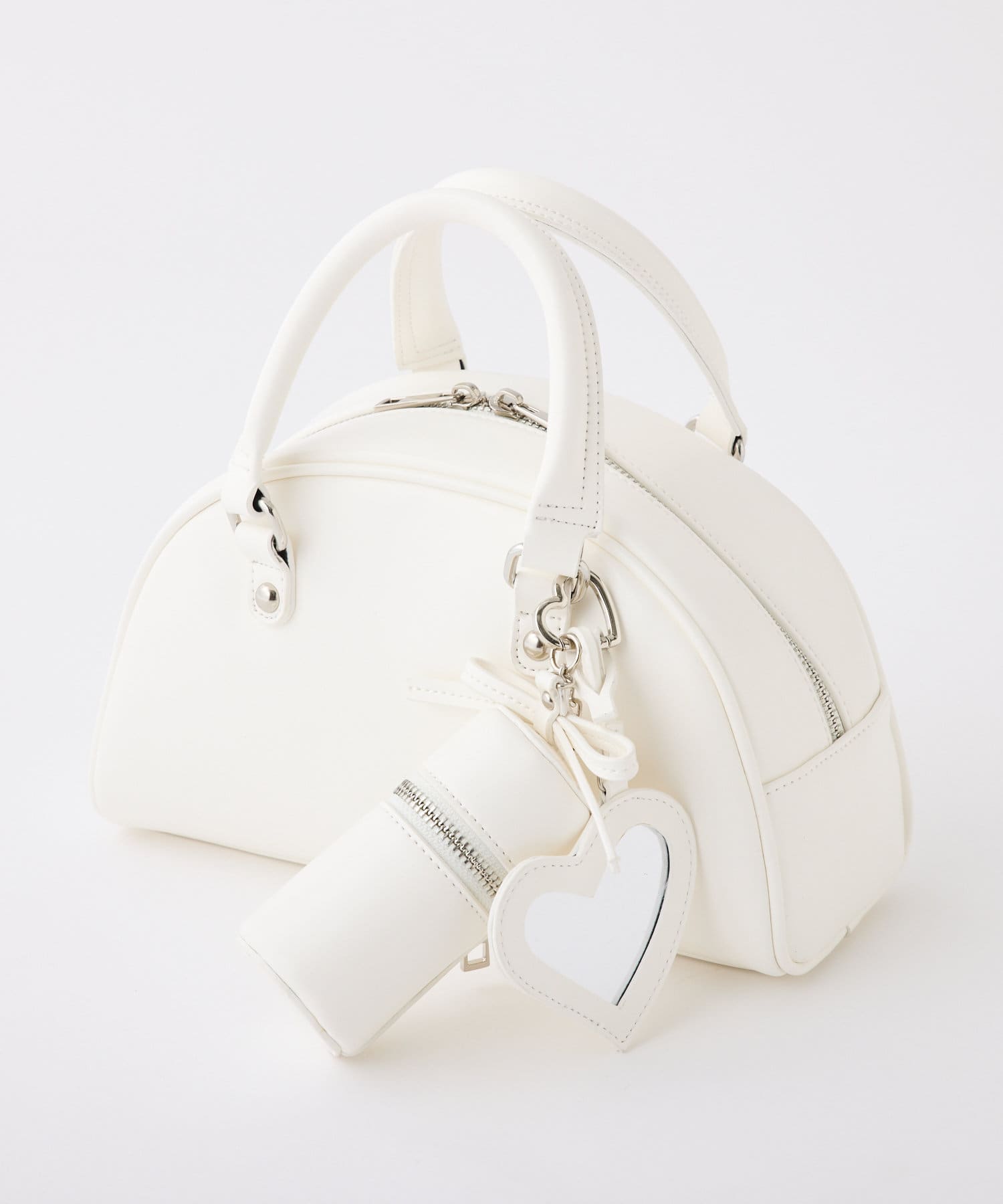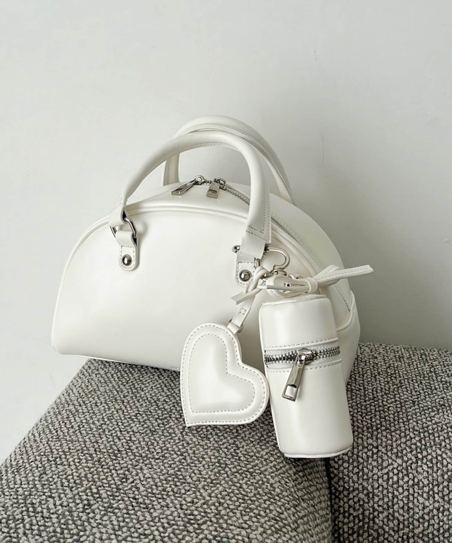 リボンのチャームとハートのミラーとリップケースが付いたボストンバッグ