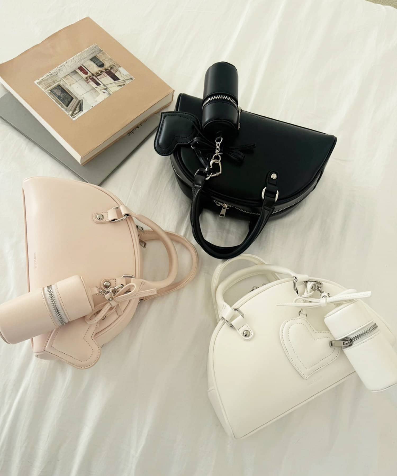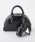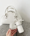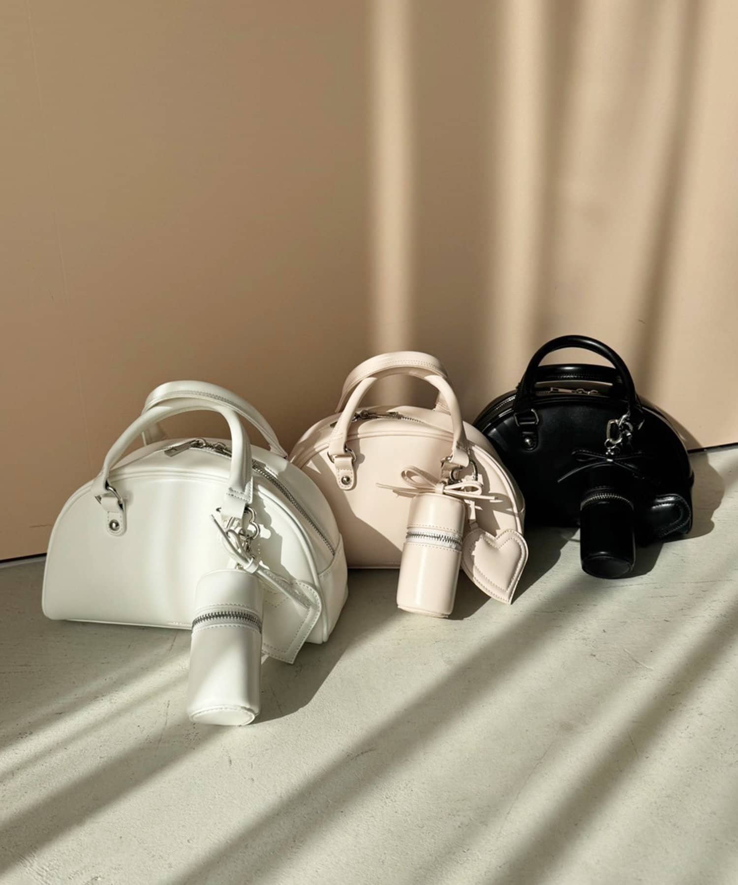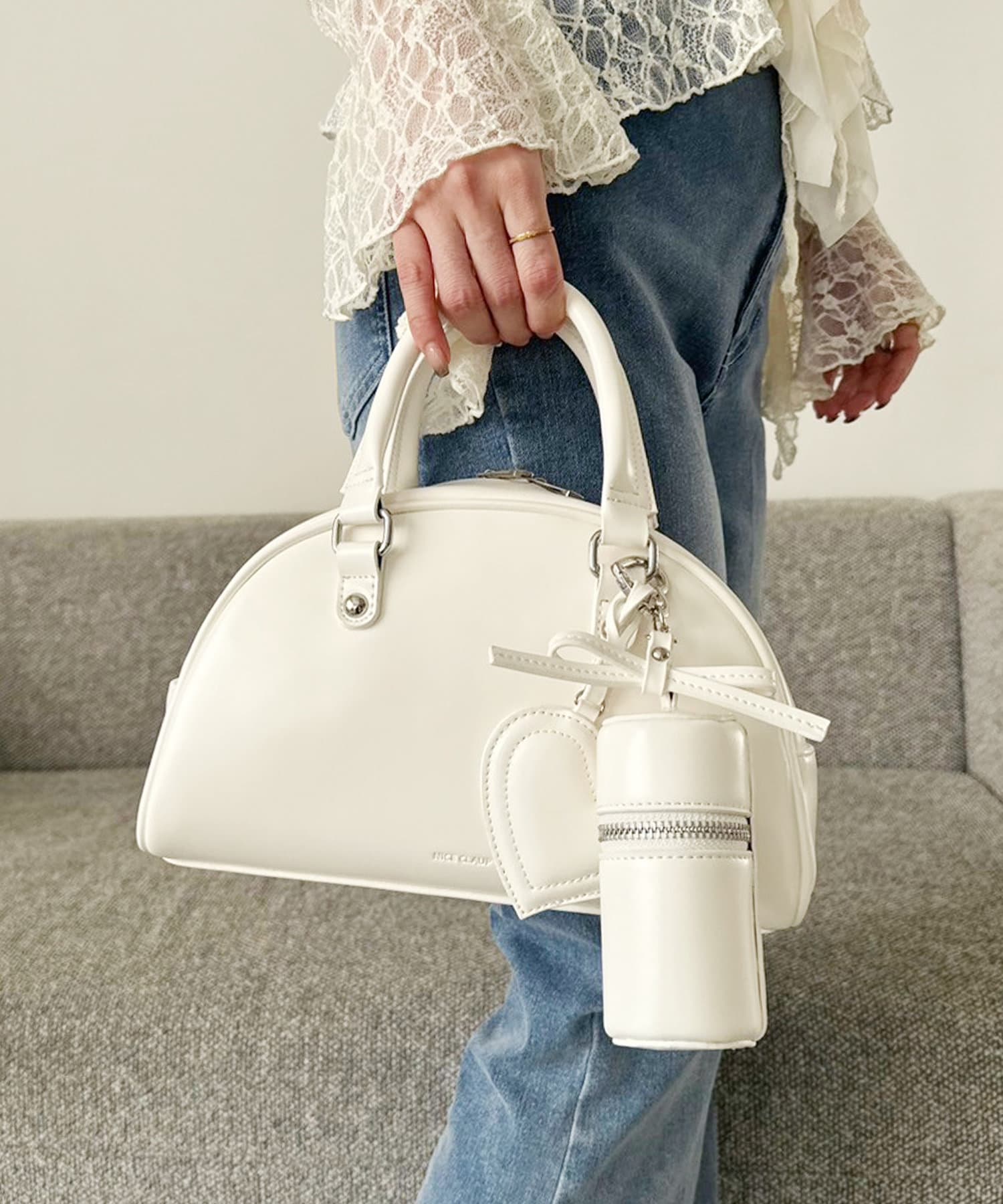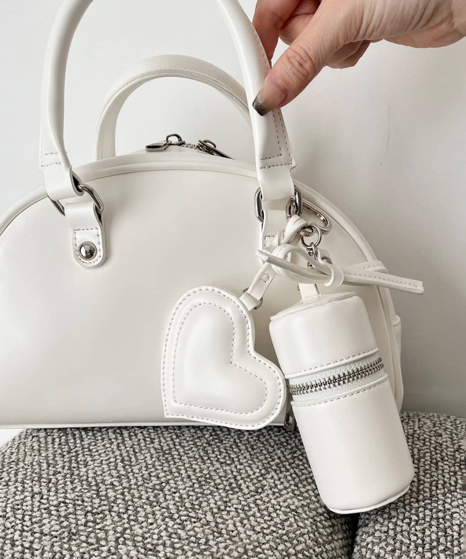 リボンのチャームとハートのミラーとリップケースが付いたボストンバッグ