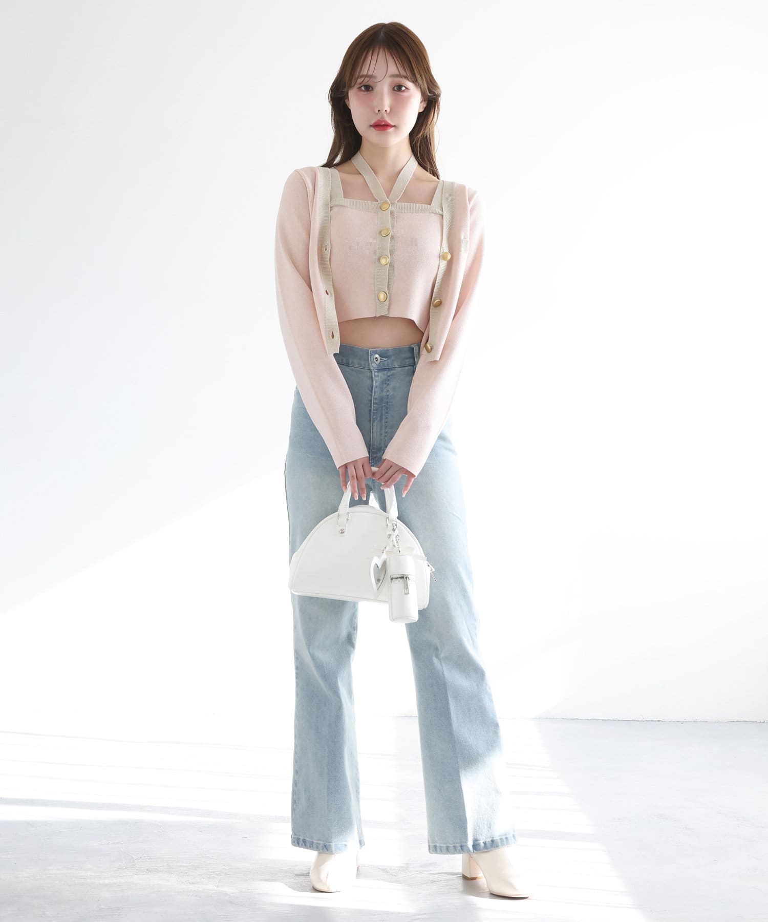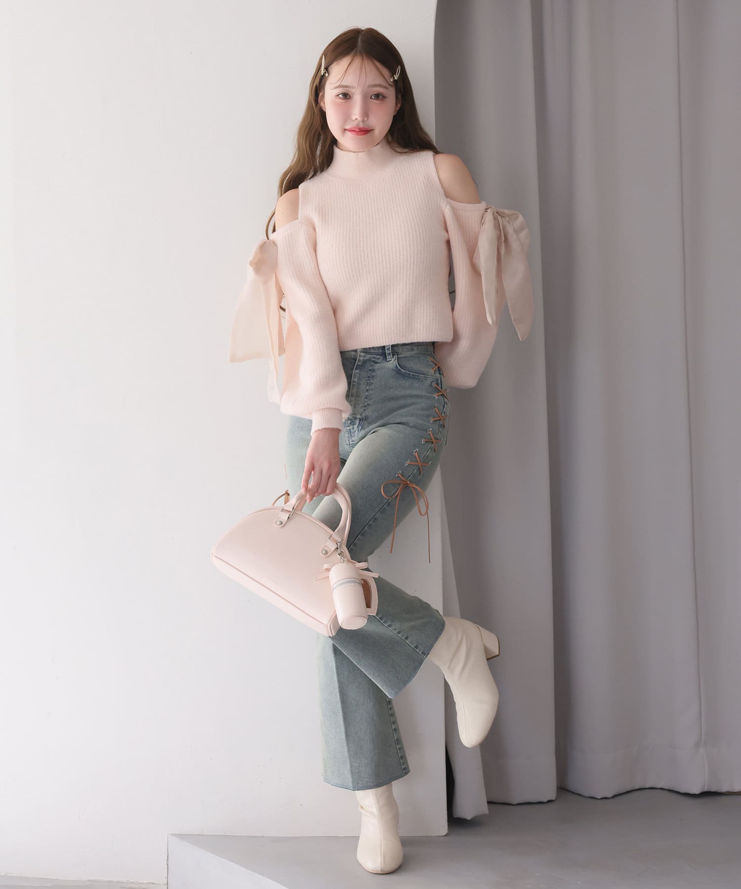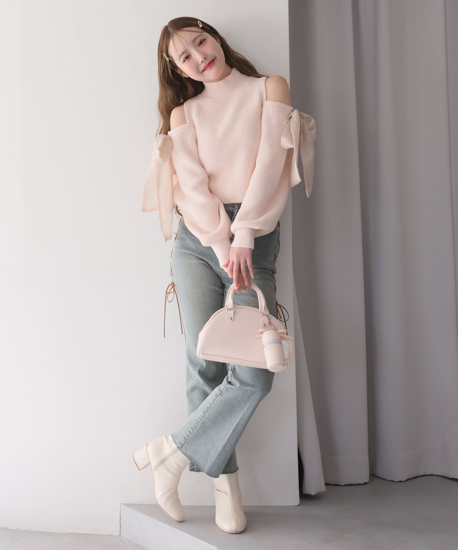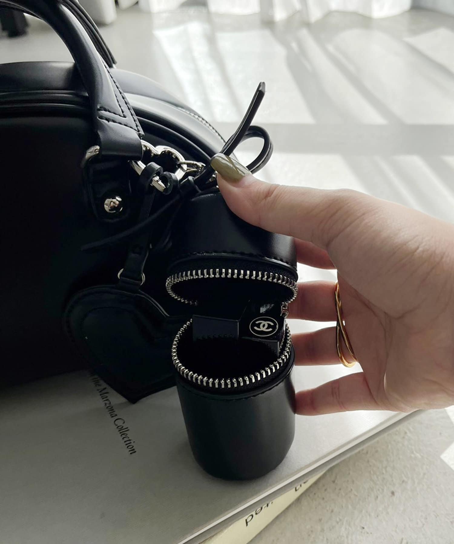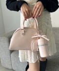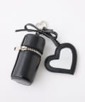 リボンのチャームとハートのミラーとリップケースが付いたボストンバッグ