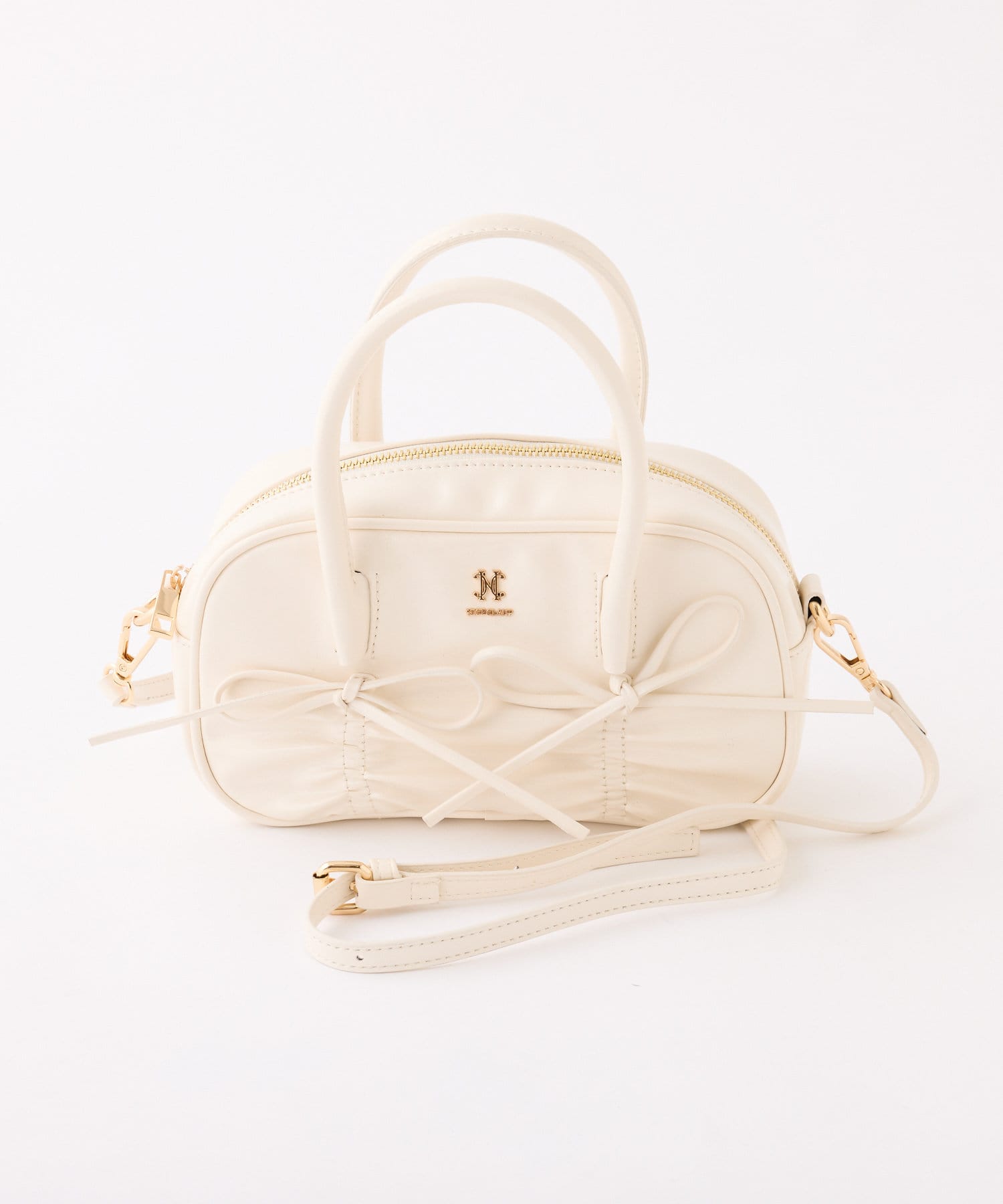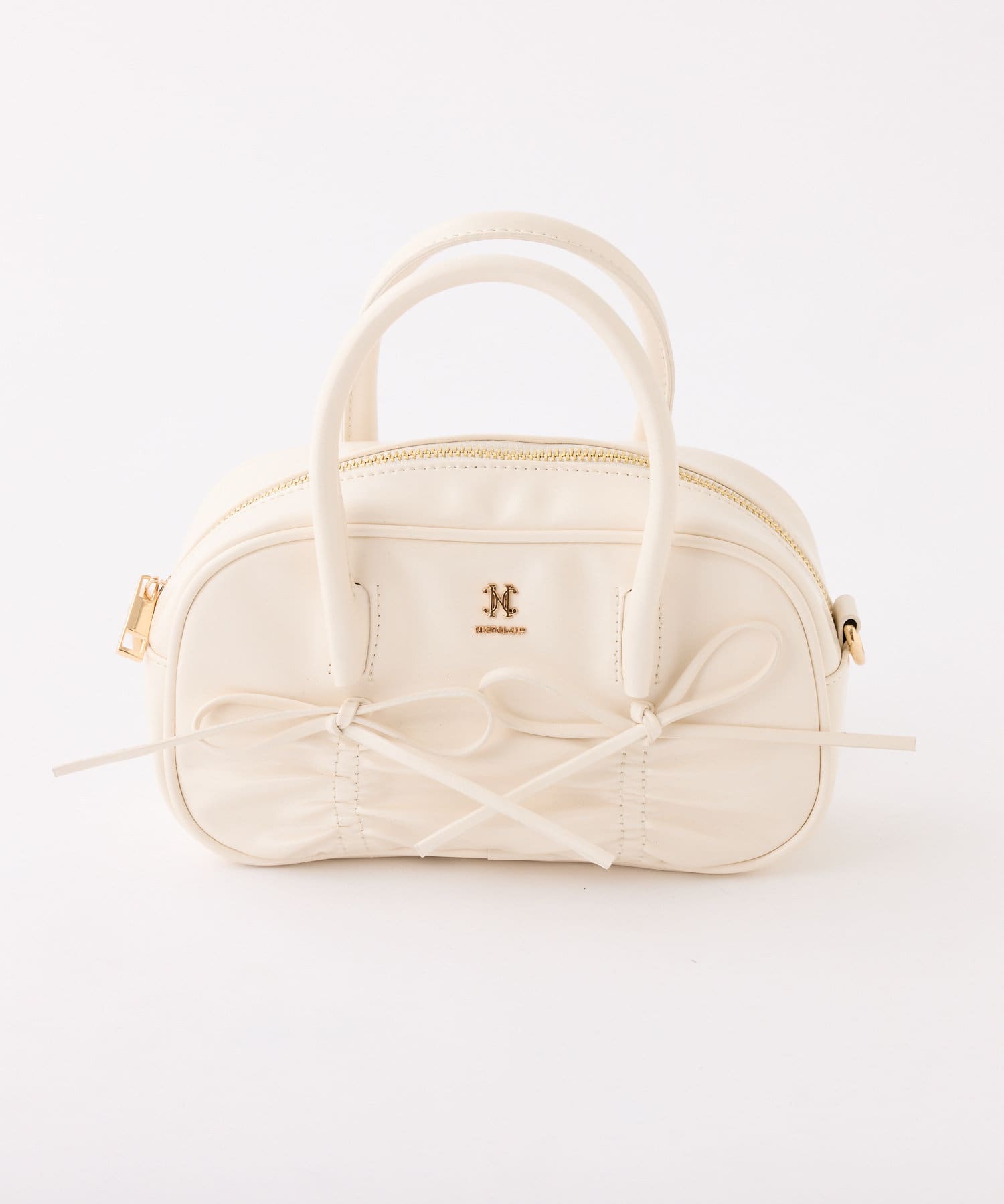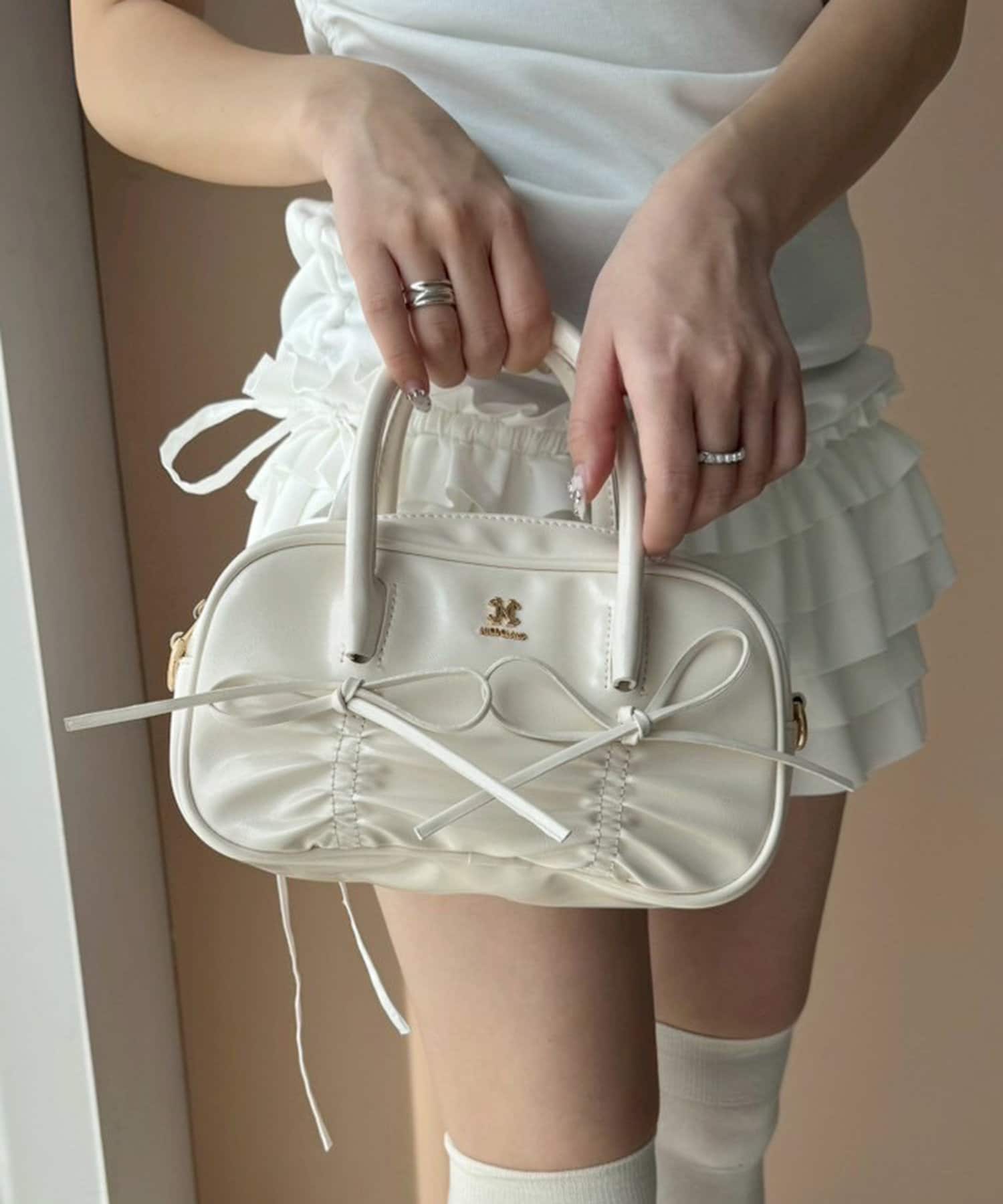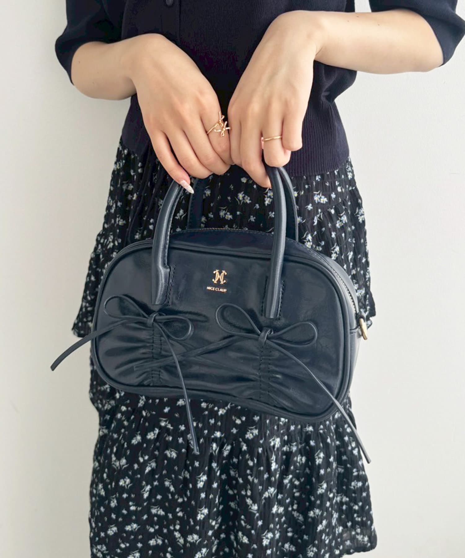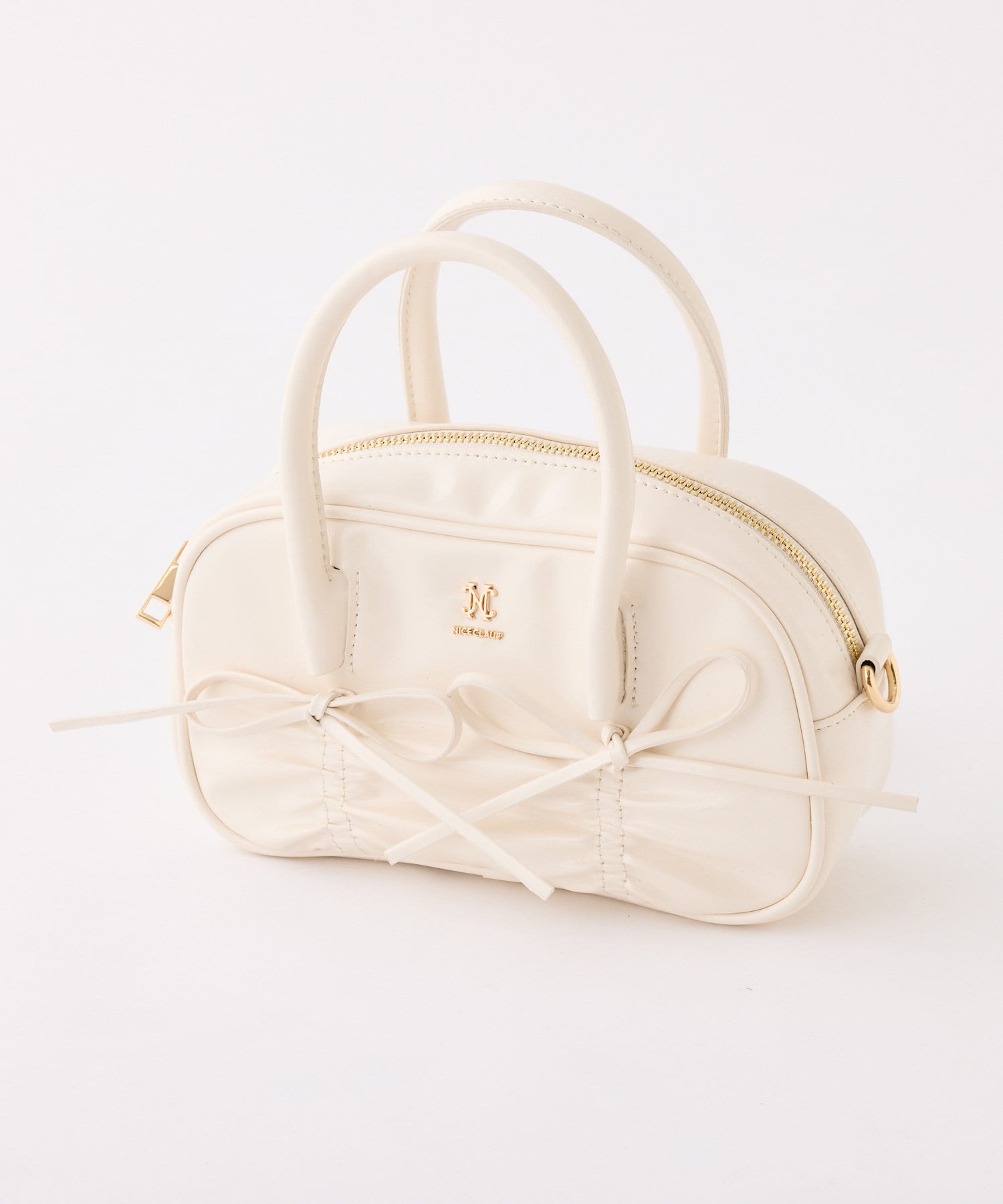 フロントにあしらわれたドロストデザインの2つのリボンが可愛さを引き立てるミニバッグ。