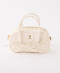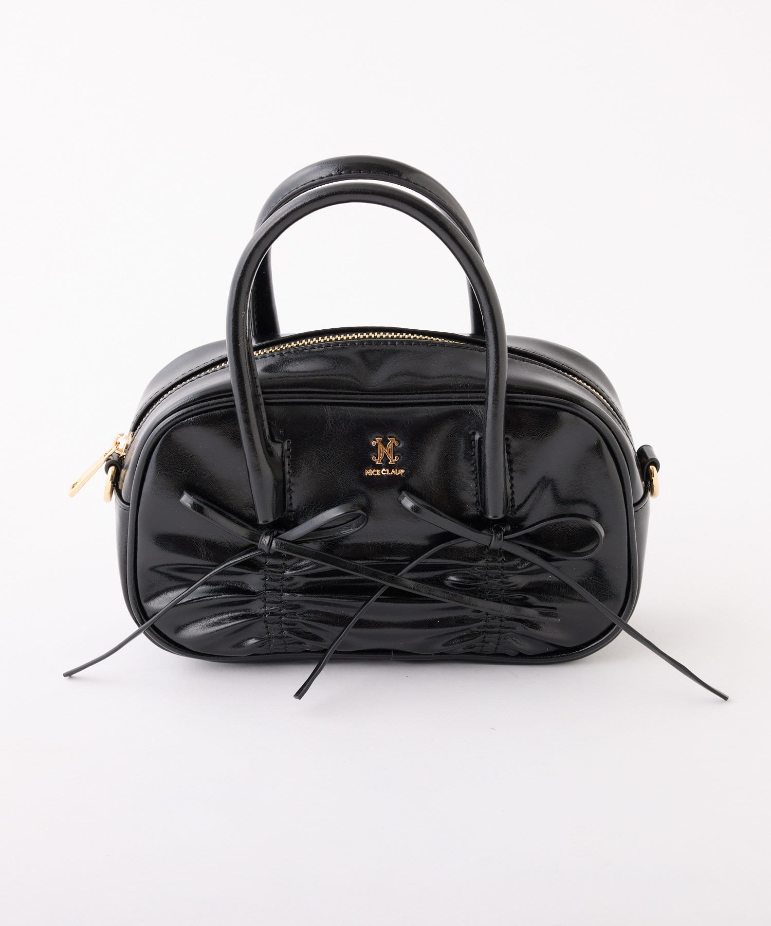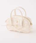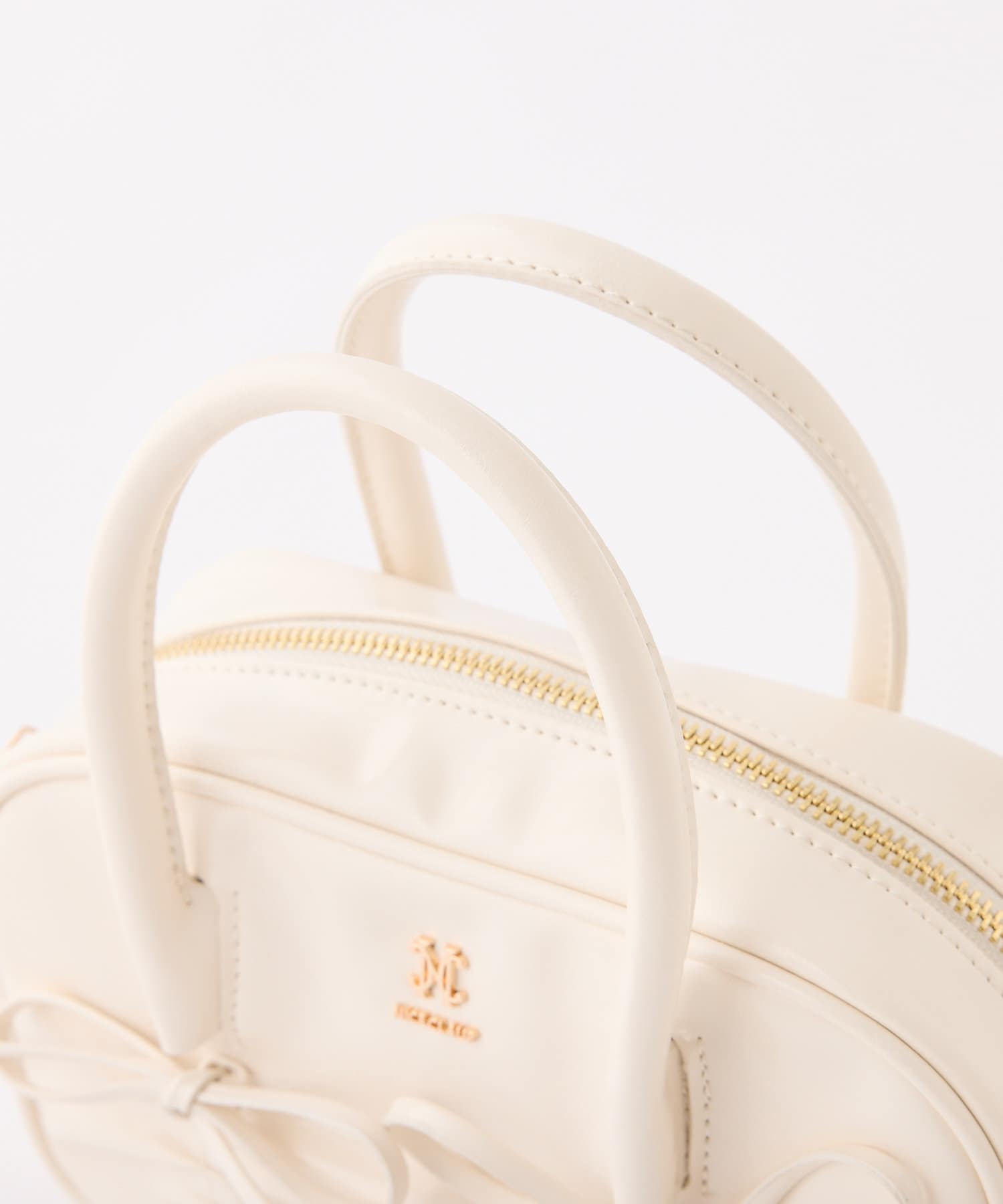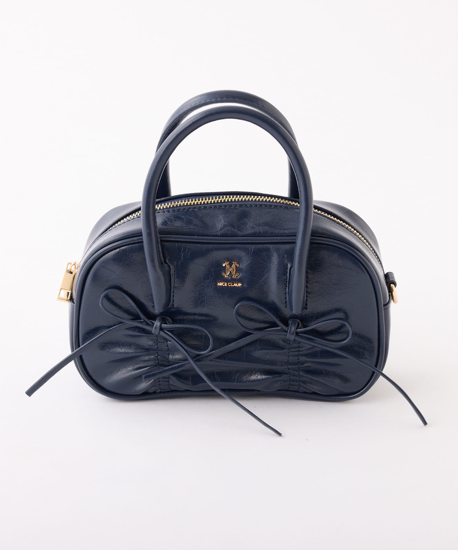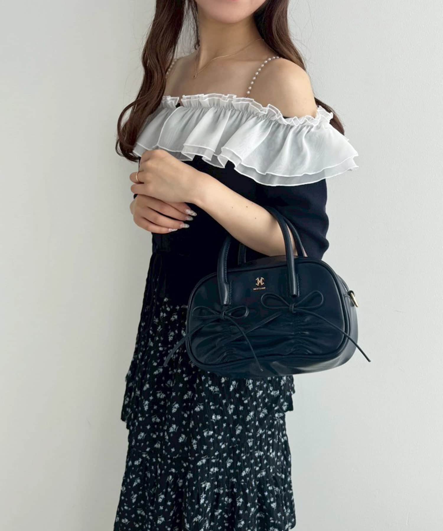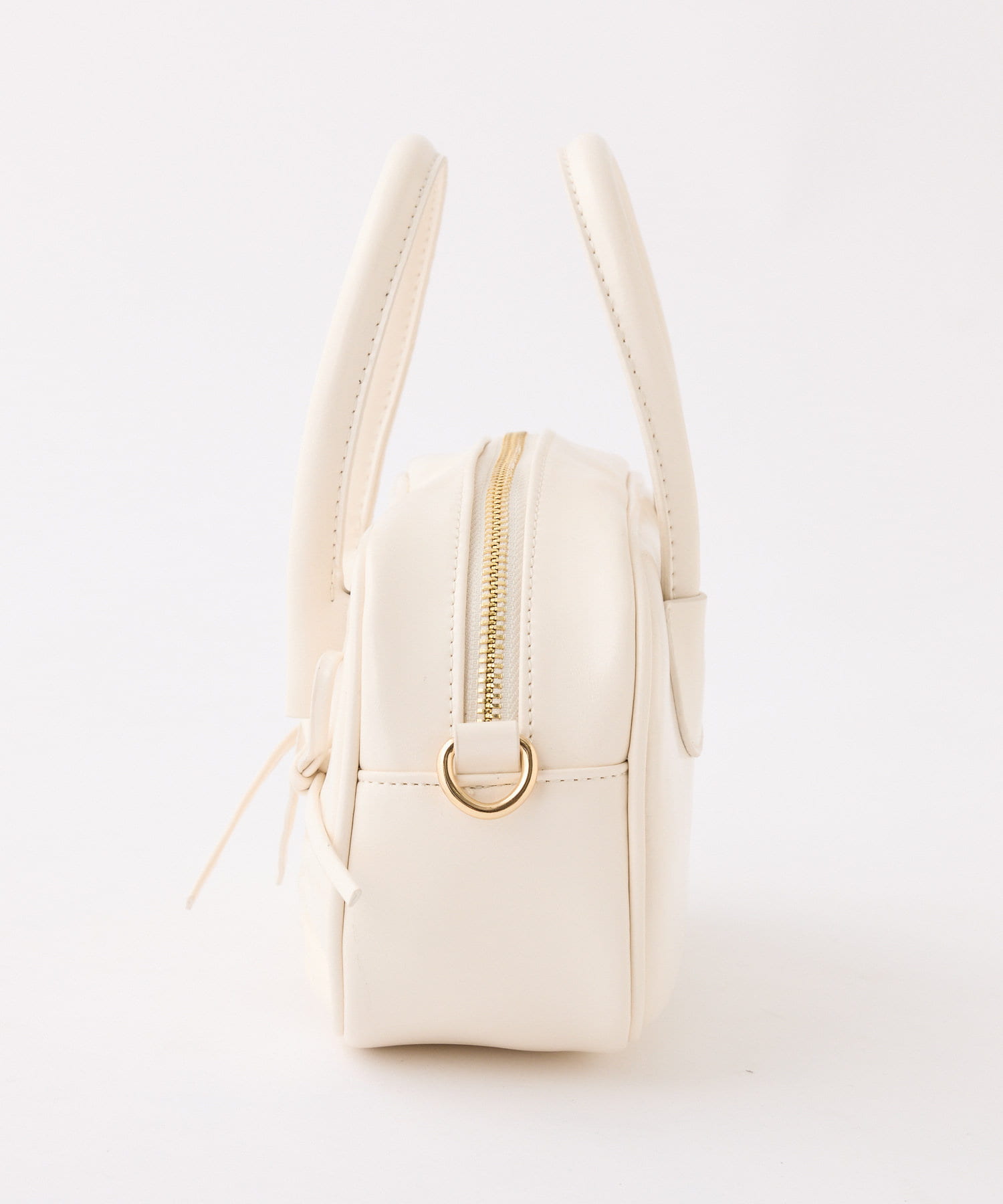 フロントにあしらわれたドロストデザインの2つのリボンが可愛さを引き立てるミニバッグ。