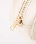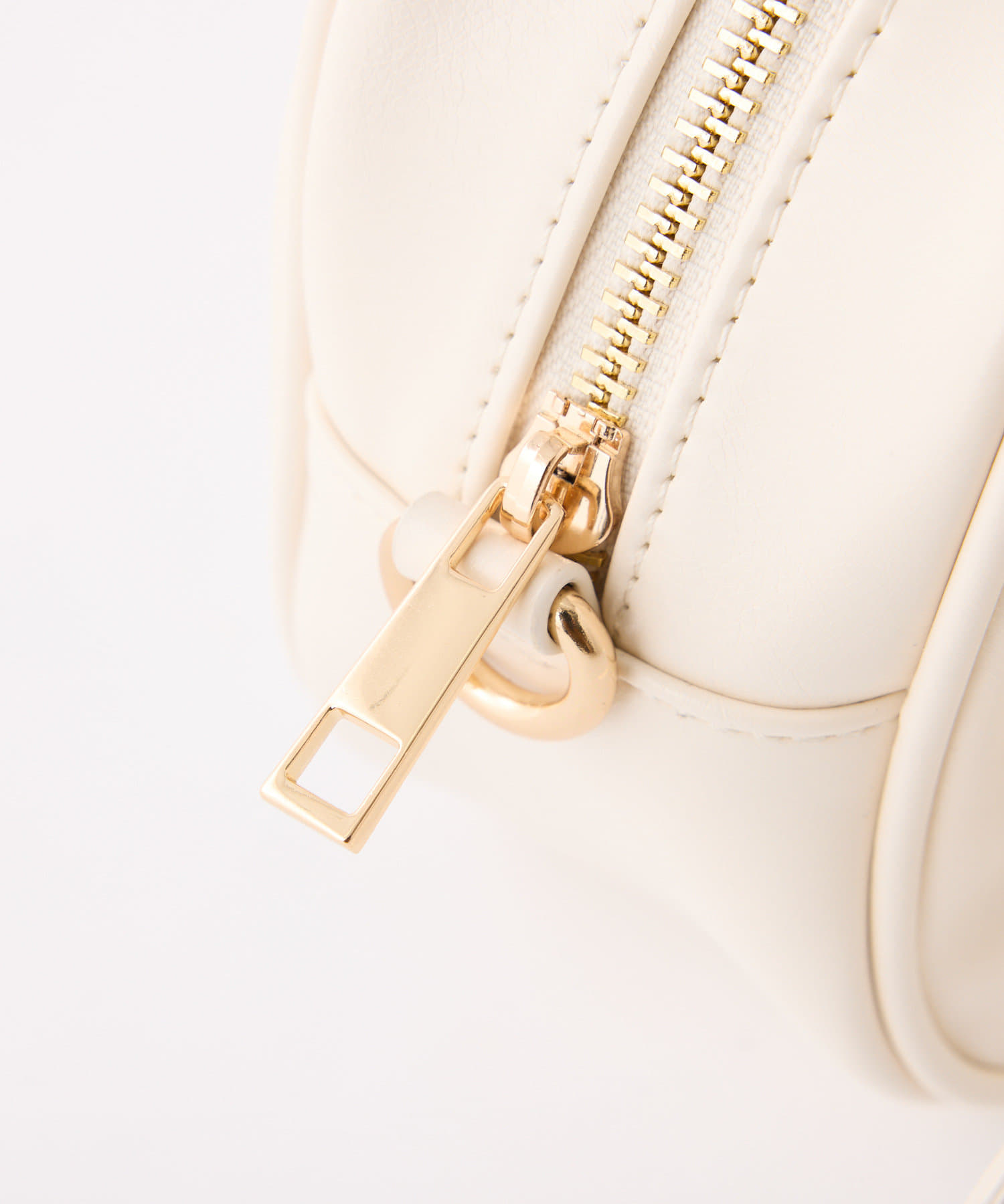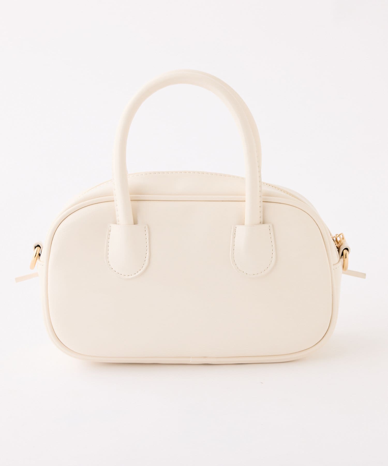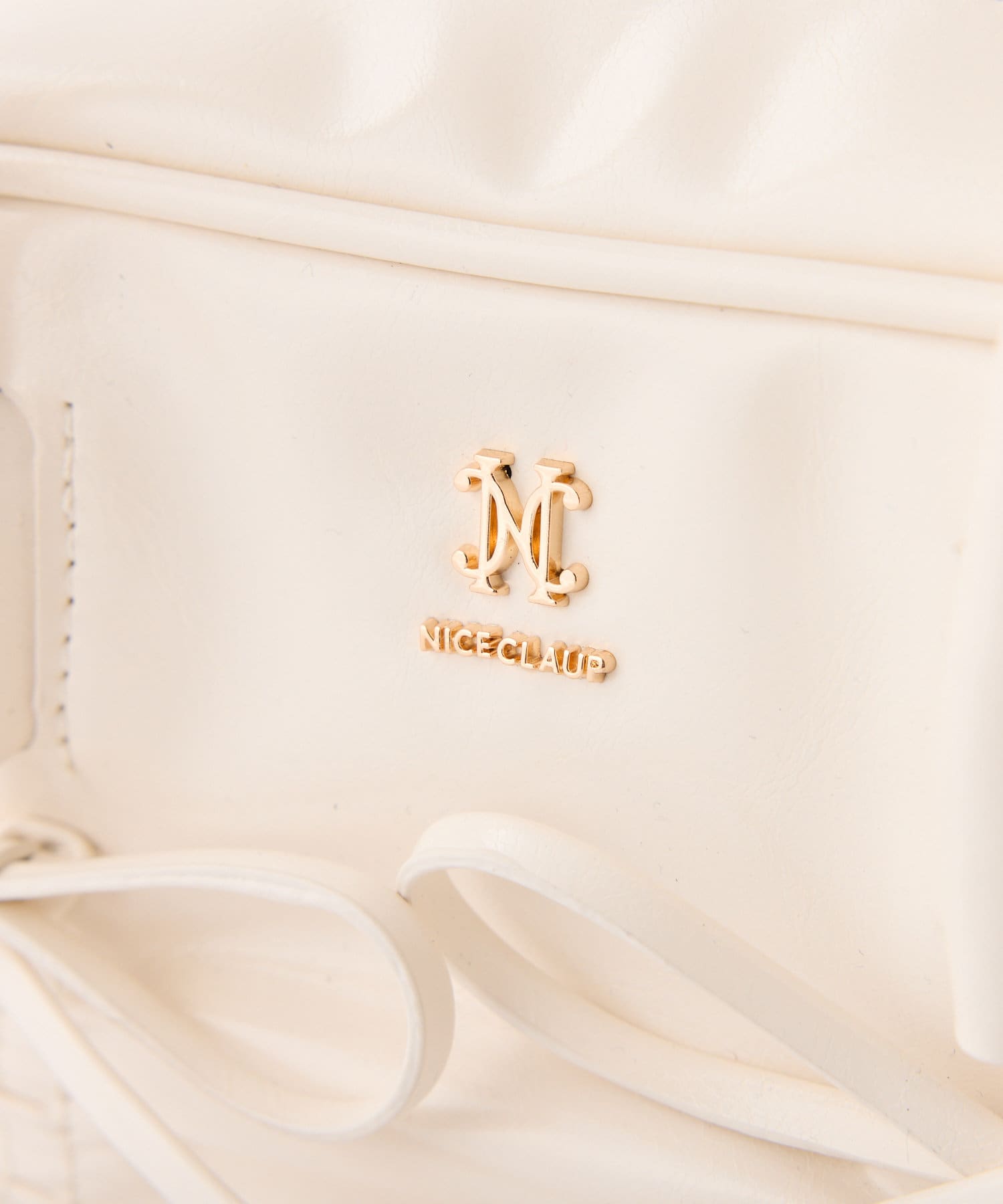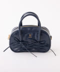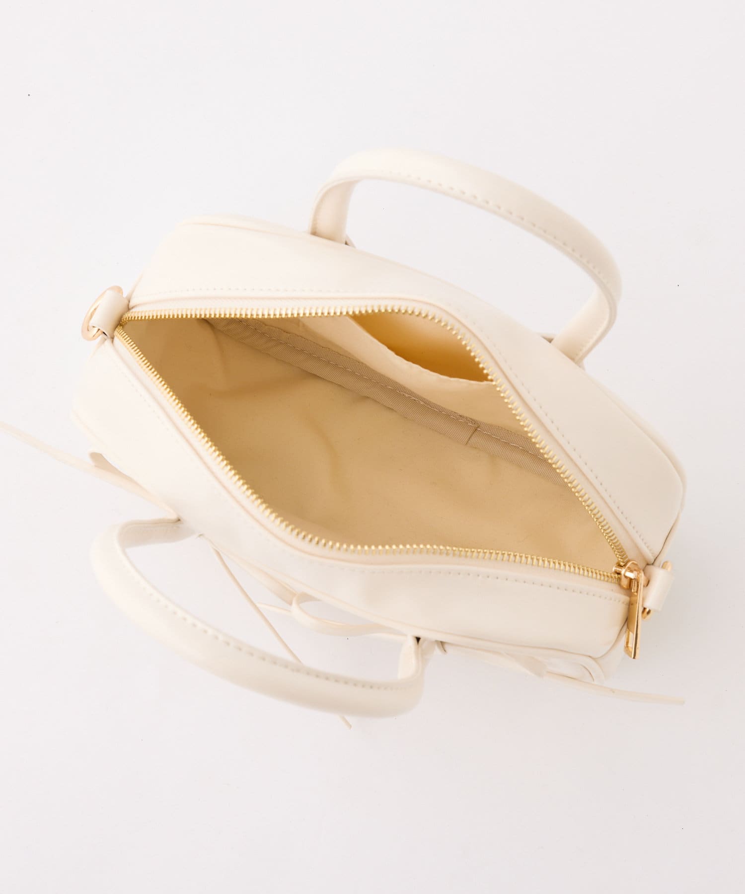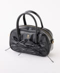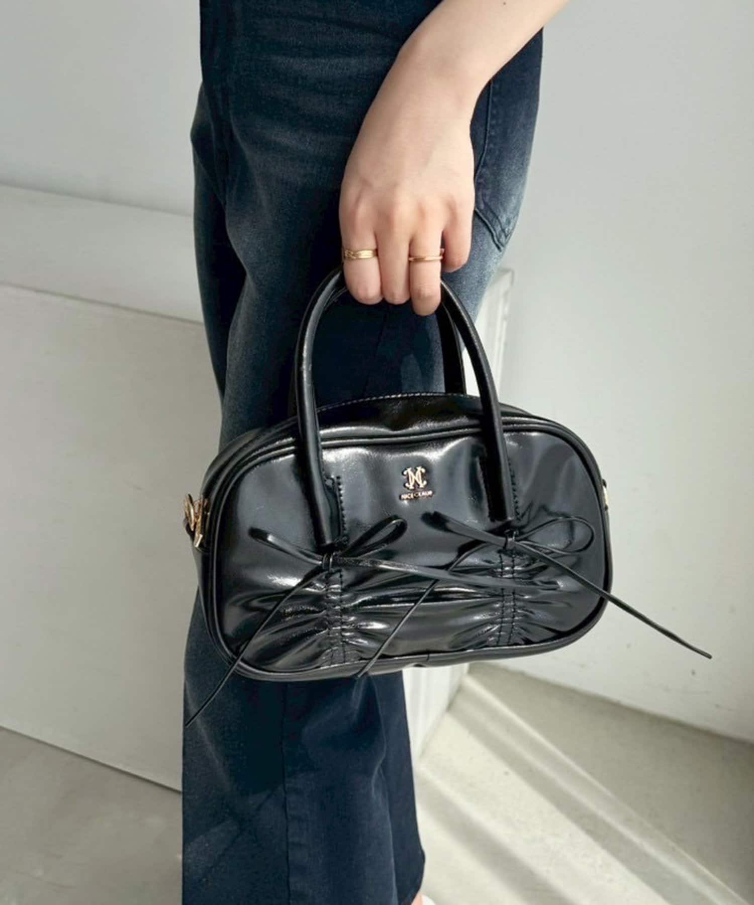 フロントにあしらわれたドロストデザインの2つのリボンが可愛さを引き立てるミニバッグ。