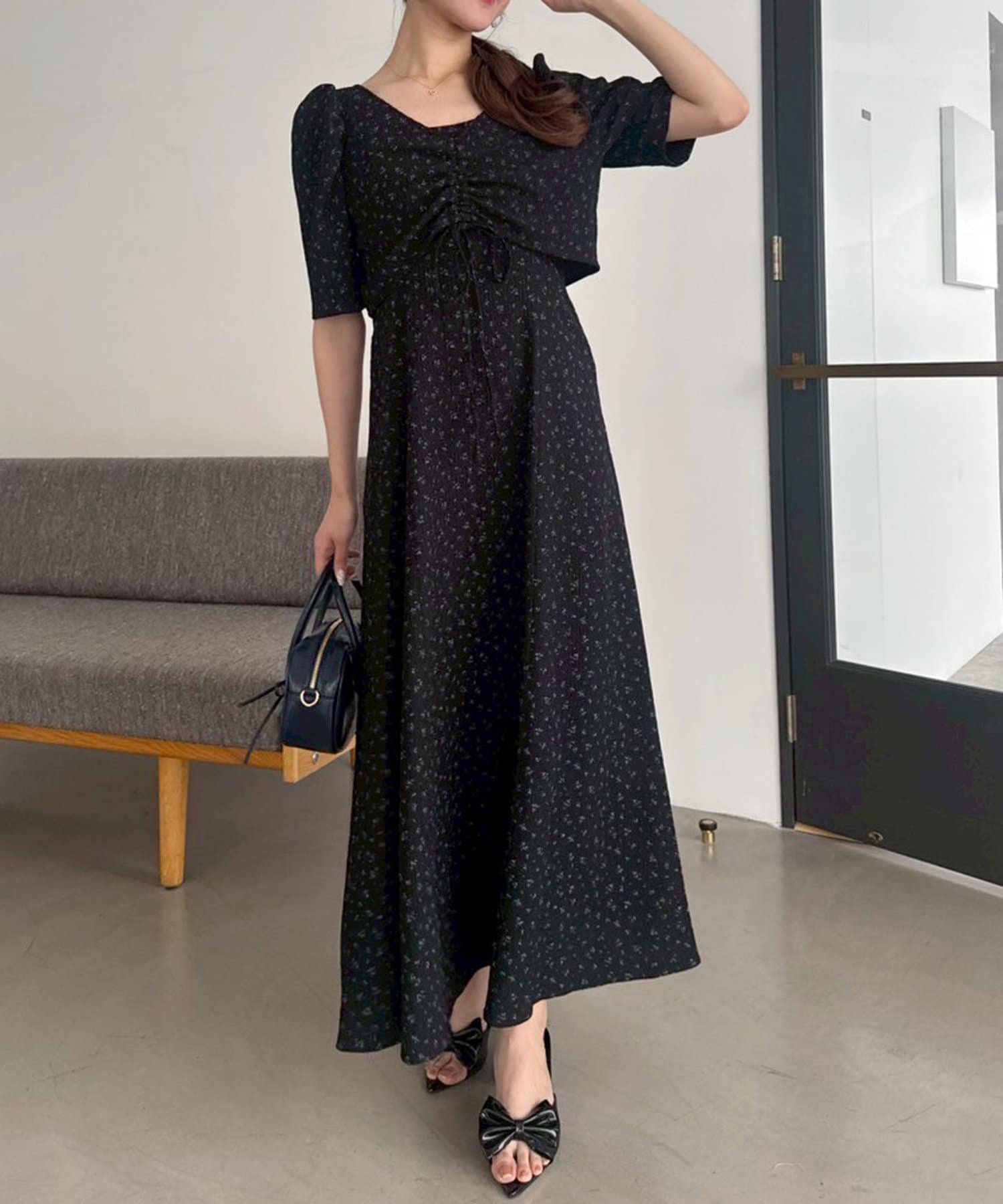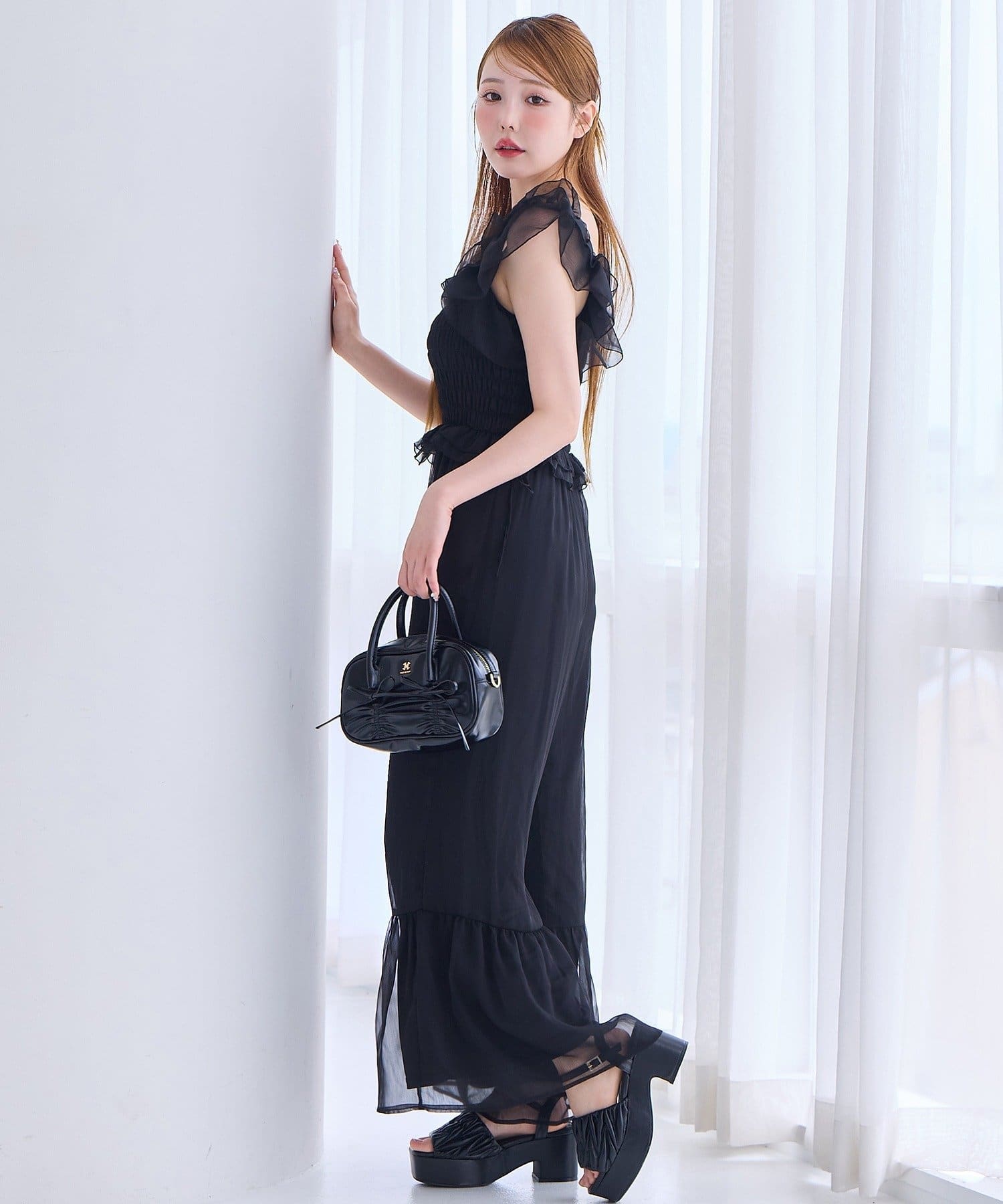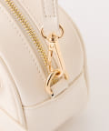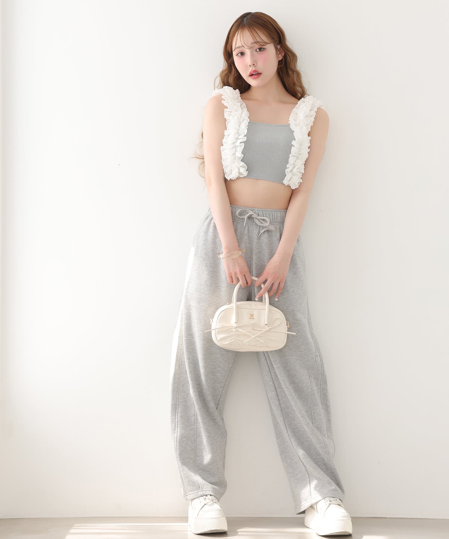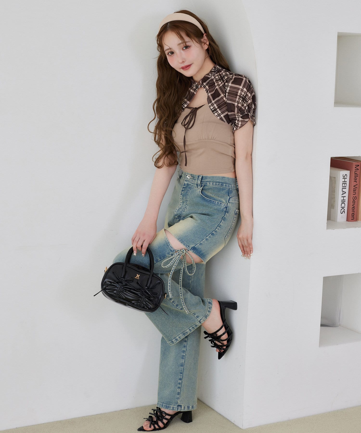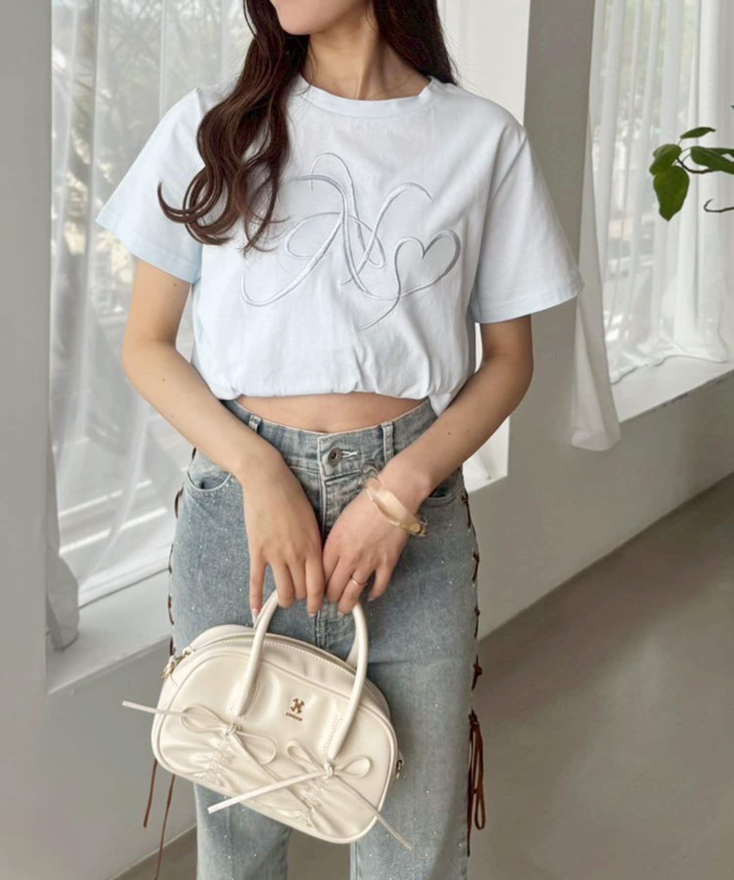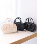 フロントにあしらわれたドロストデザインの2つのリボンが可愛さを引き立てるミニバッグ。