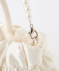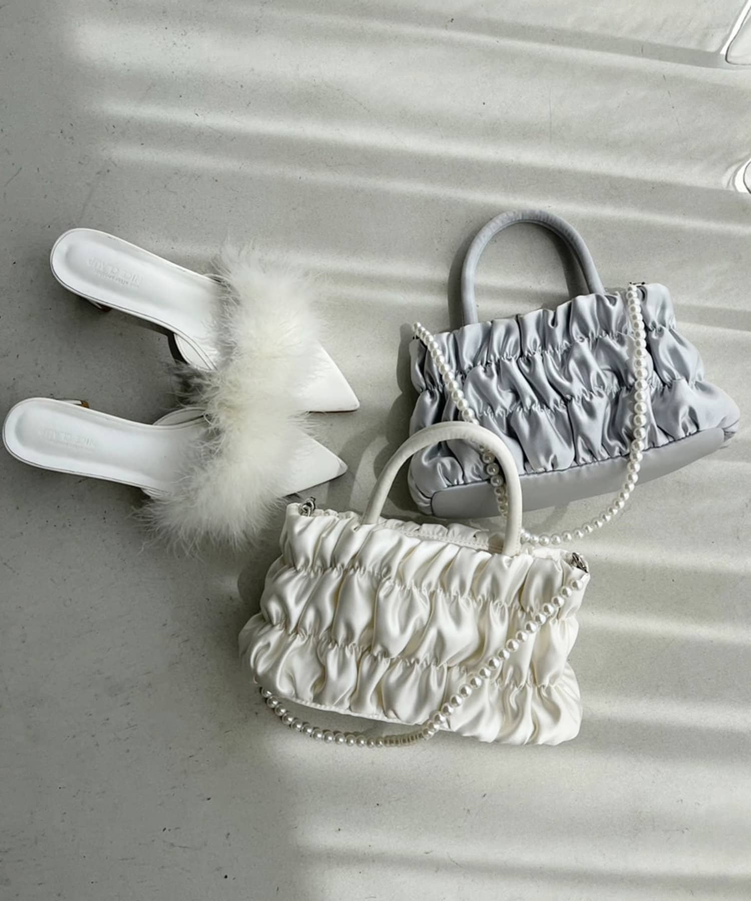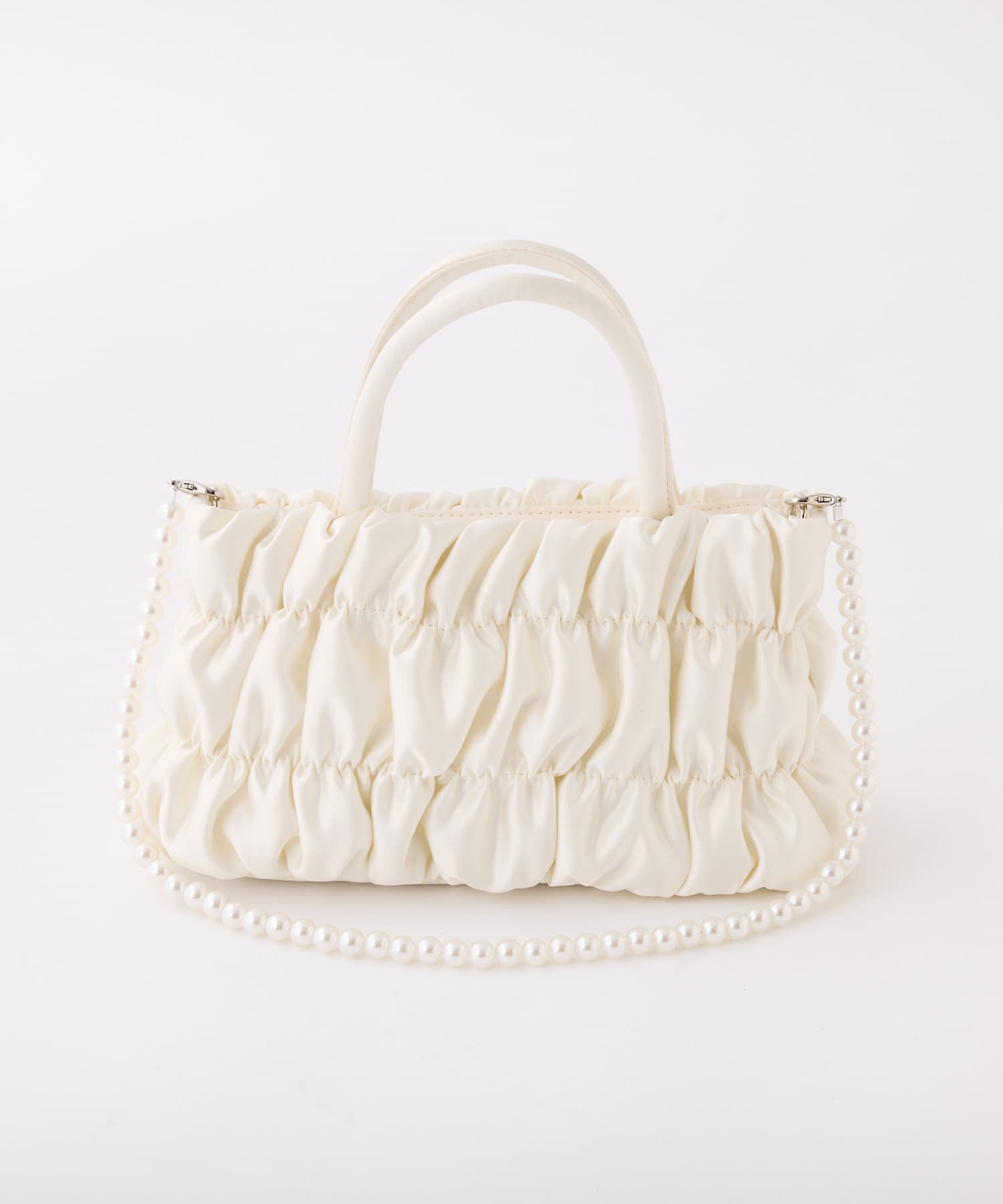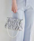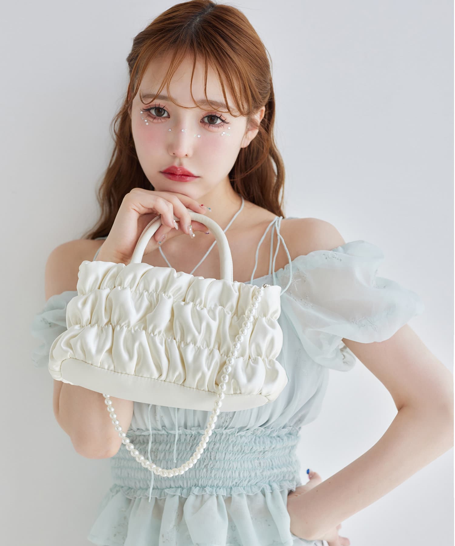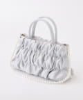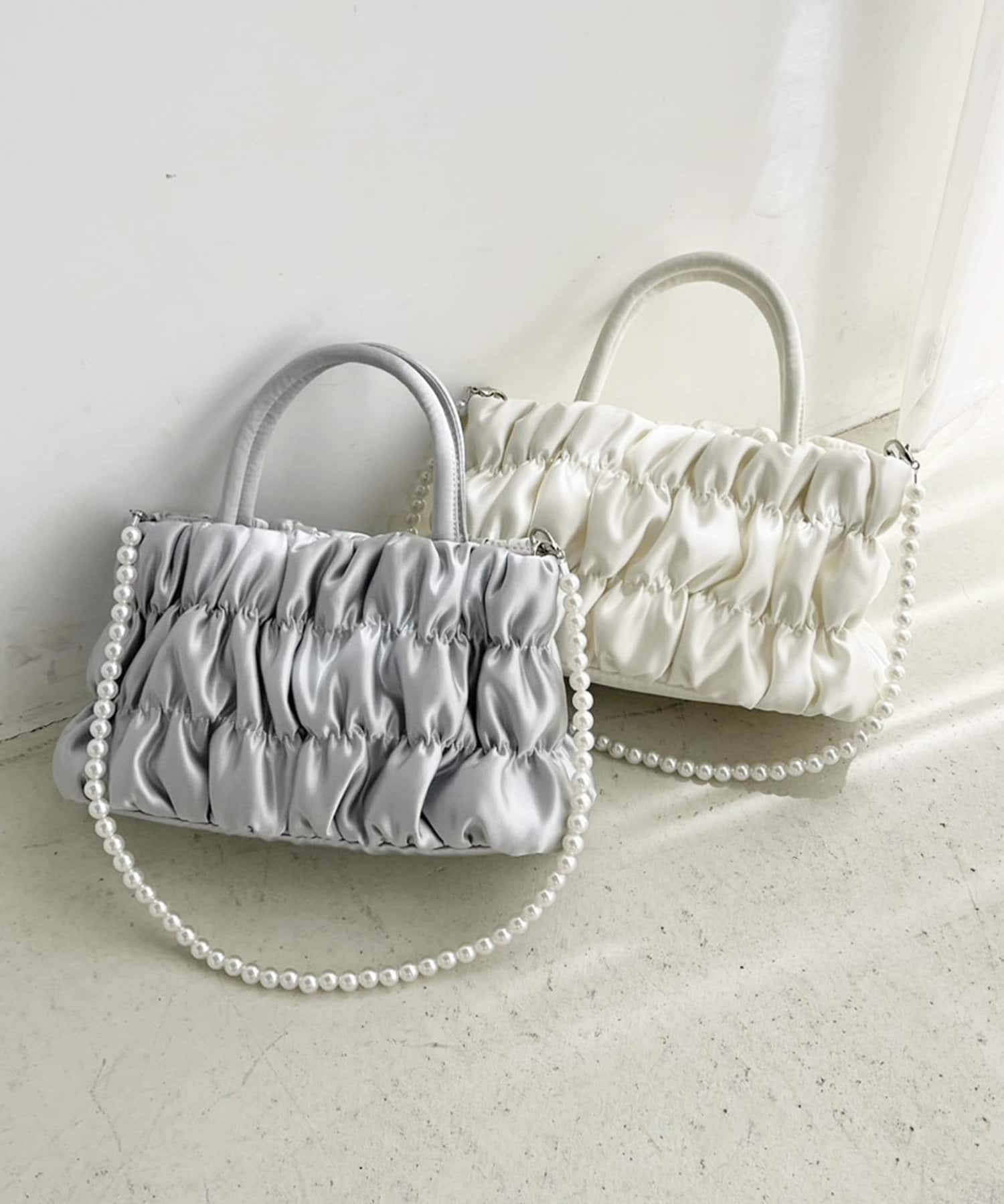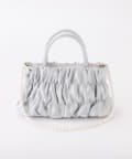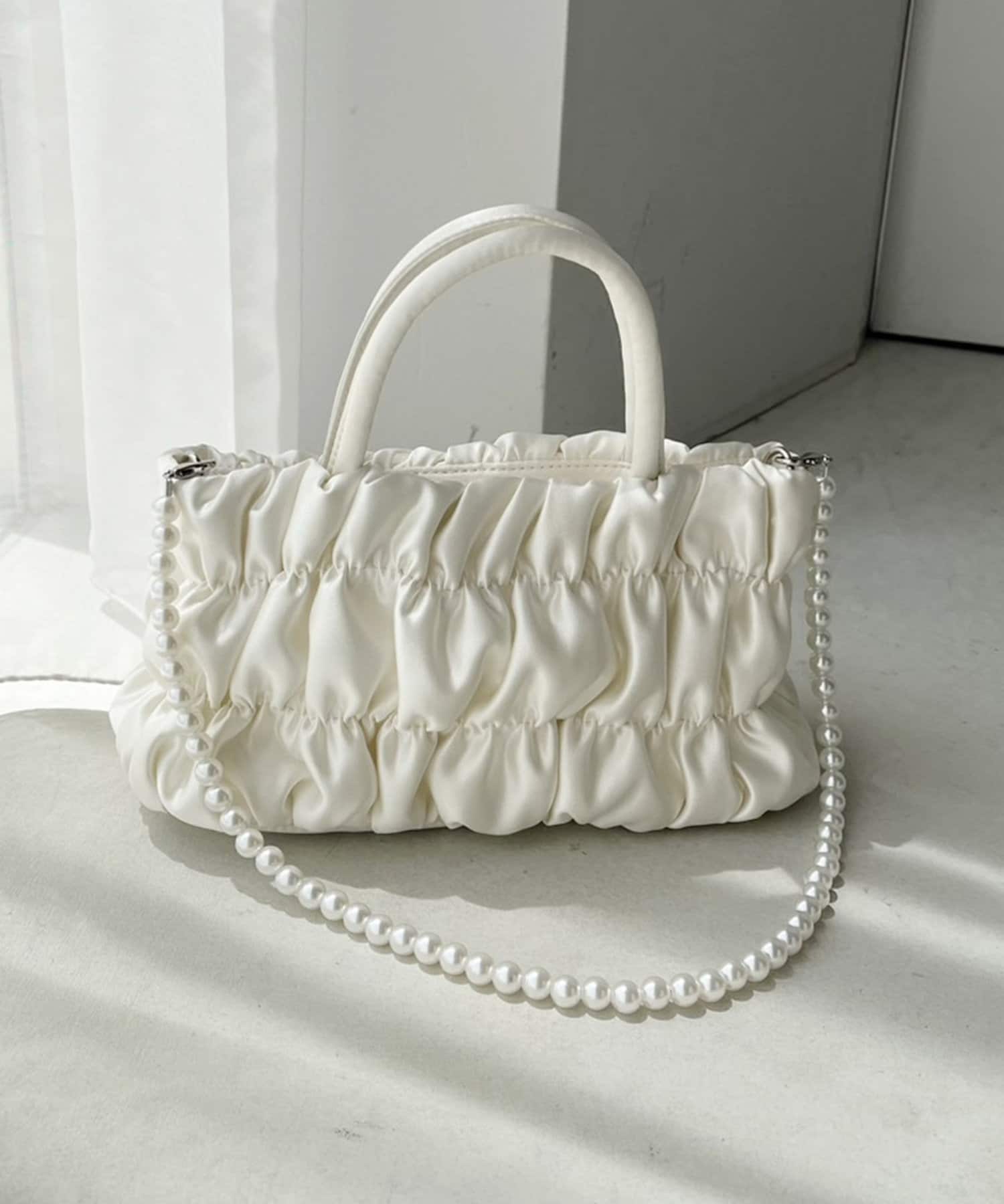柔らかなシャーリングデザインに、華やかなパールショルダーがアクセントのバッグ