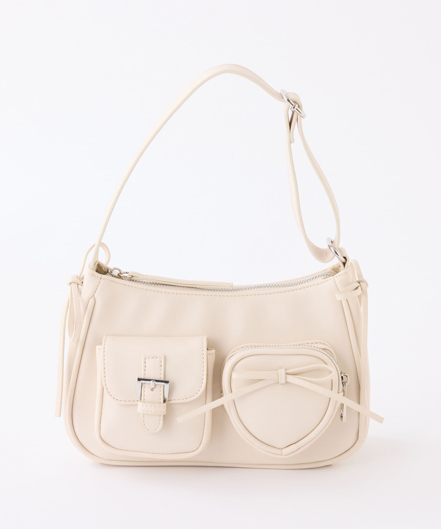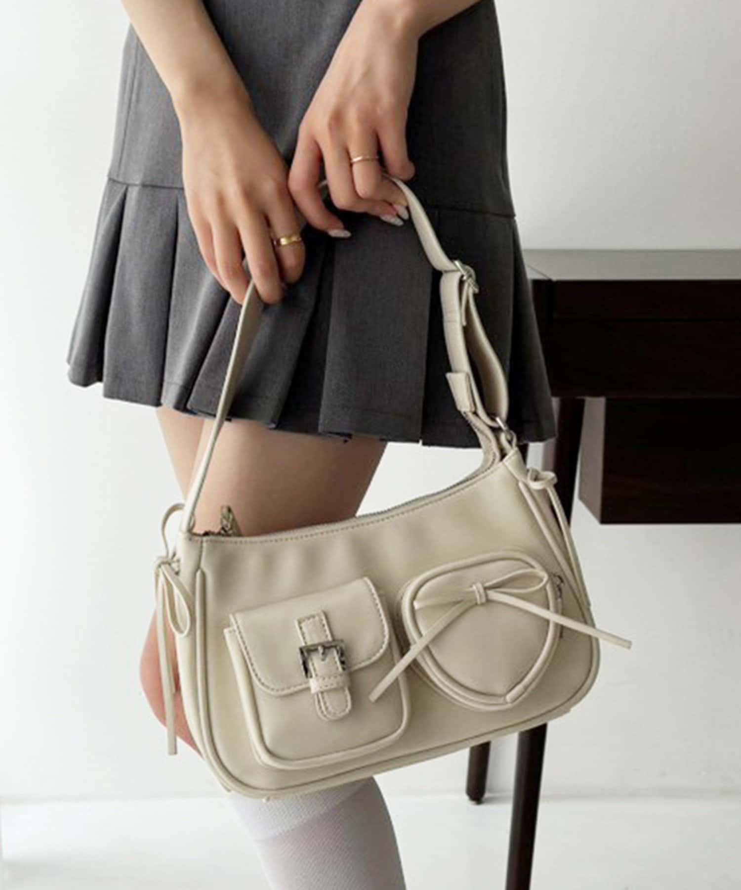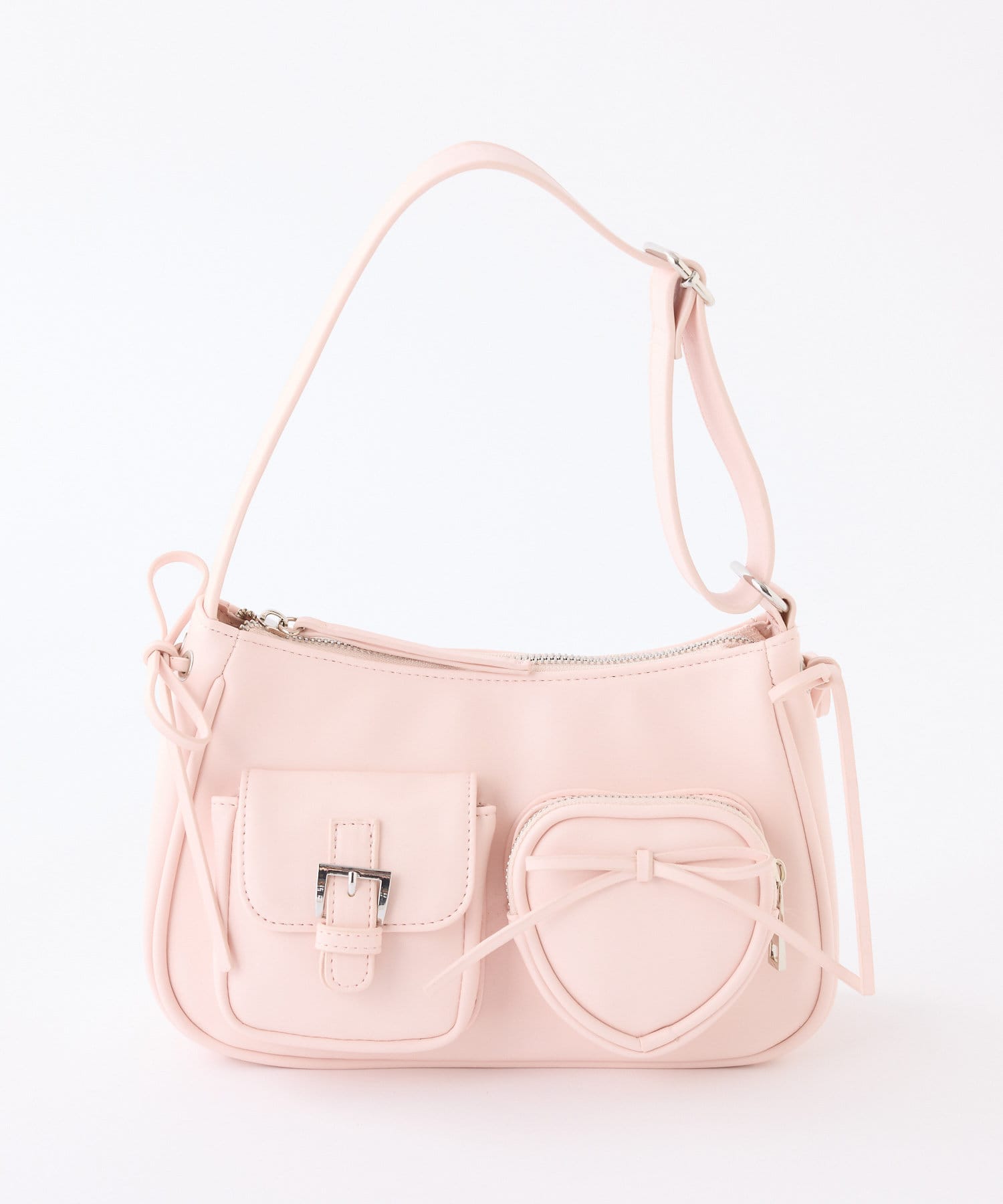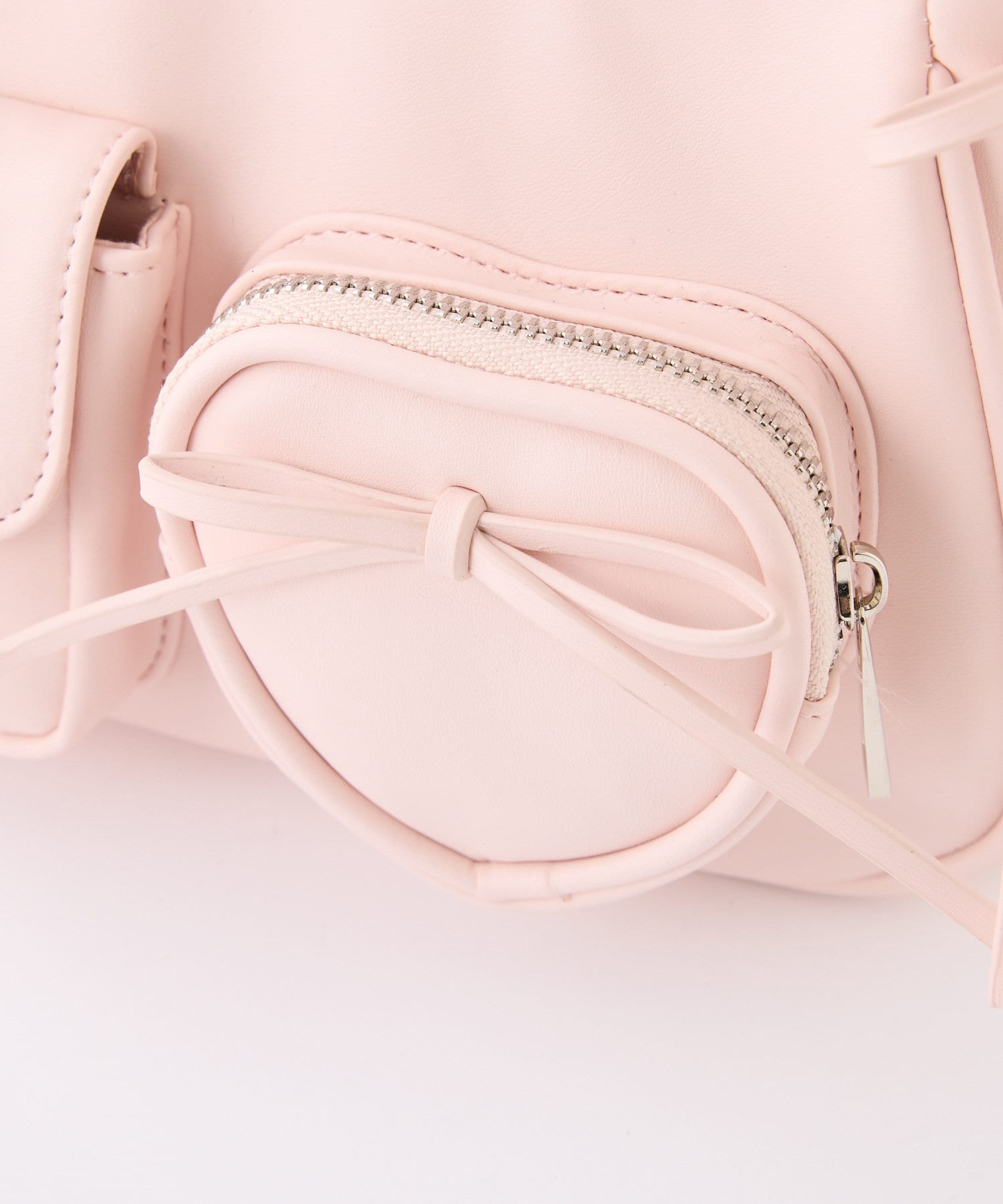 サイドのリボンとハートのポケットで可愛らしい印象に。