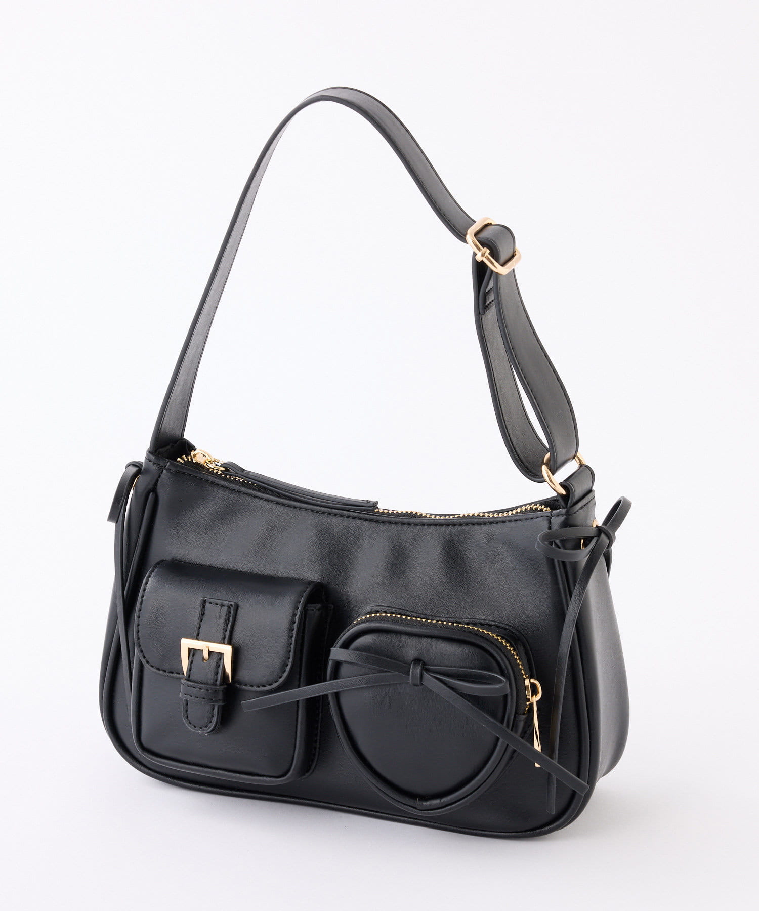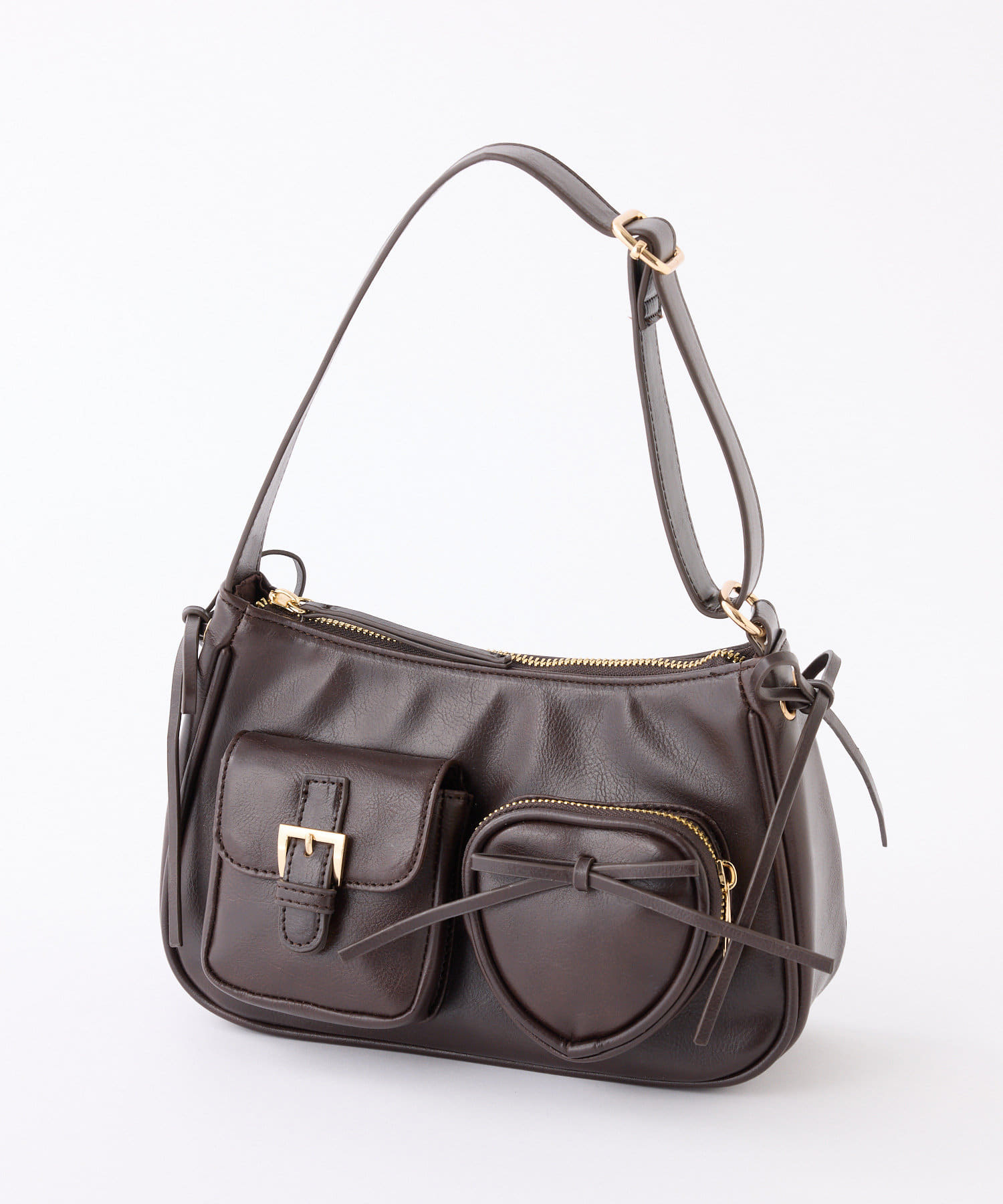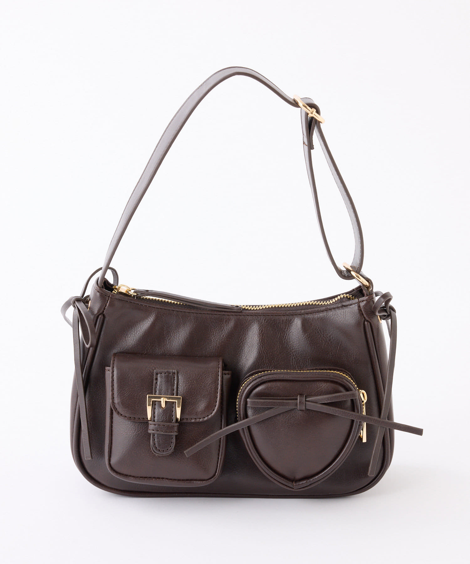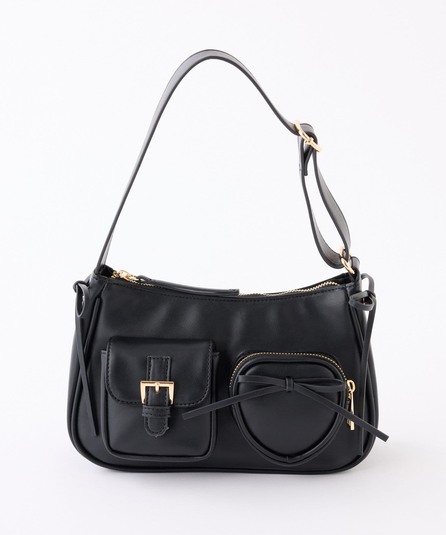 サイドのリボンとハートのポケットで可愛らしい印象に。
