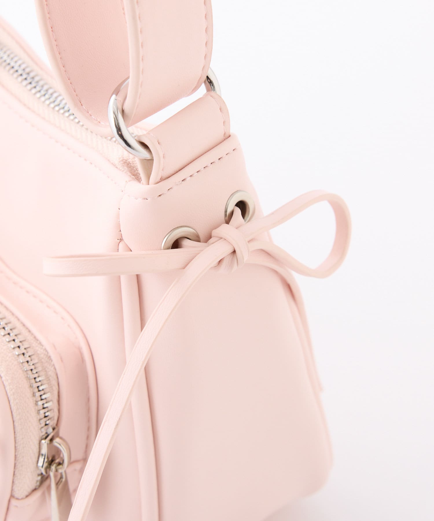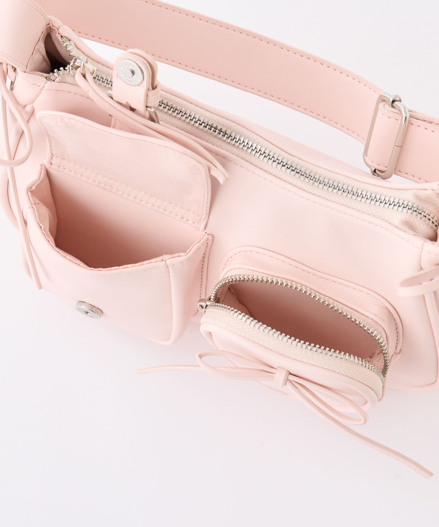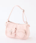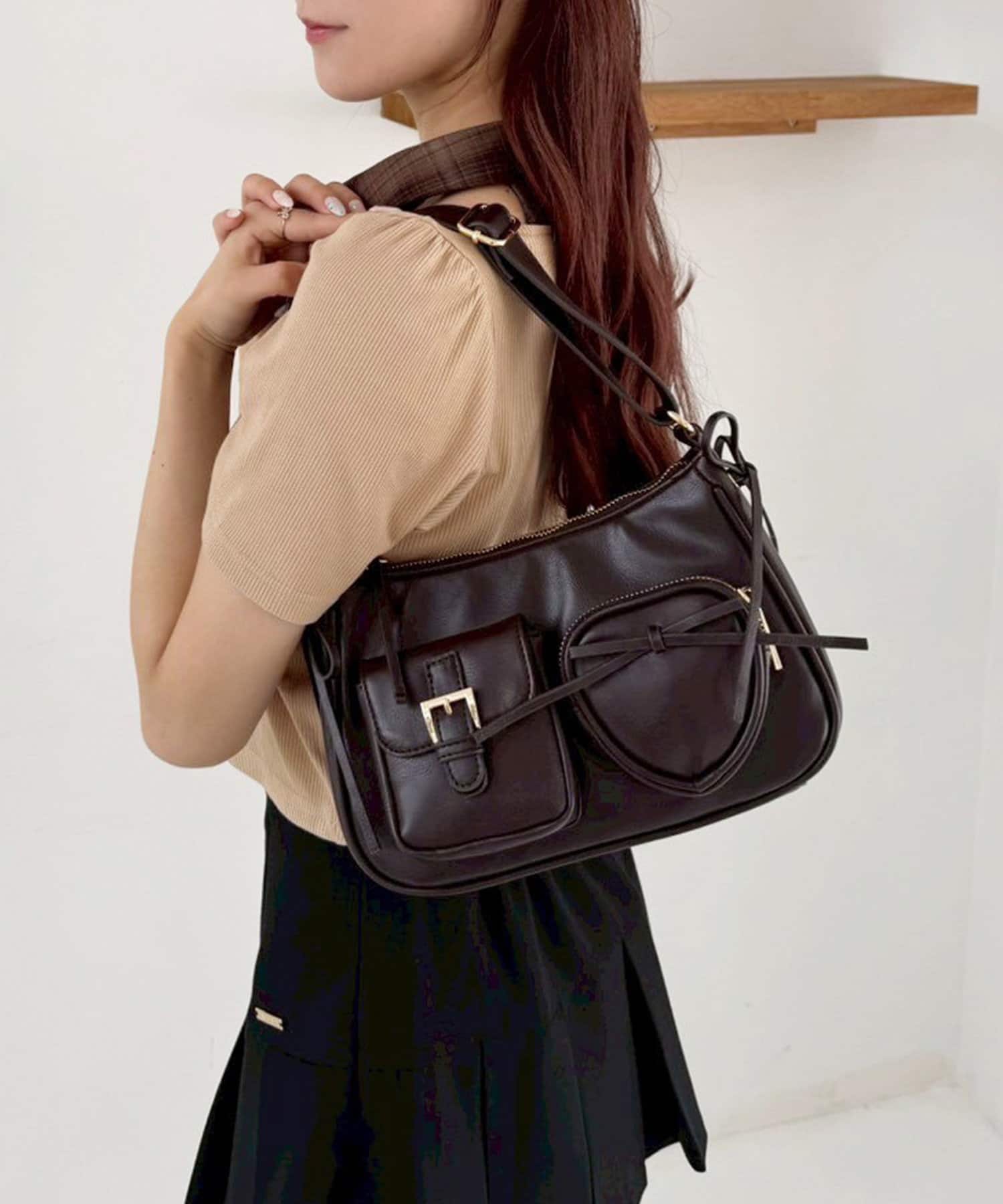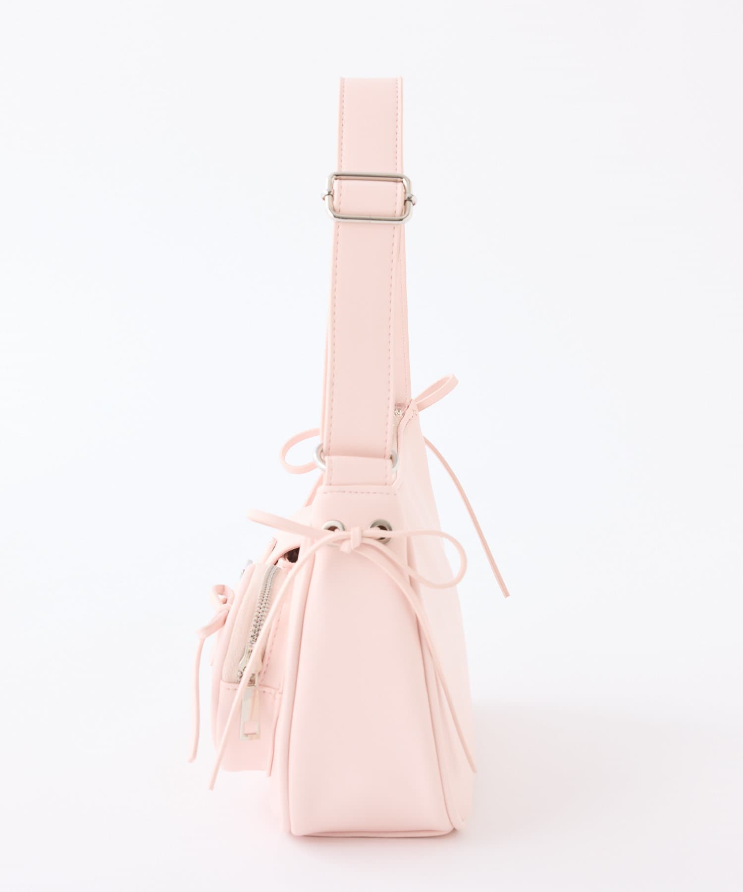 サイドのリボンとハートのポケットで可愛らしい印象に。