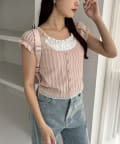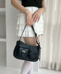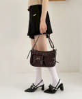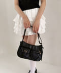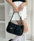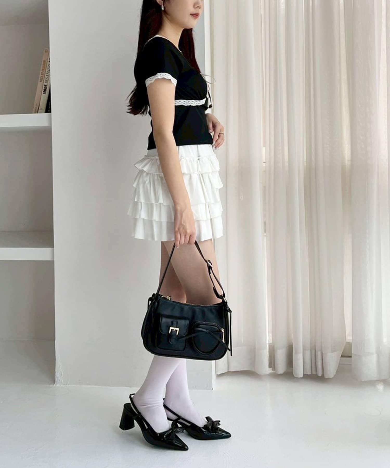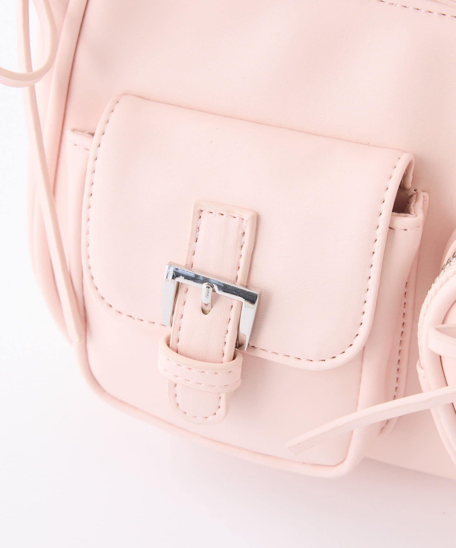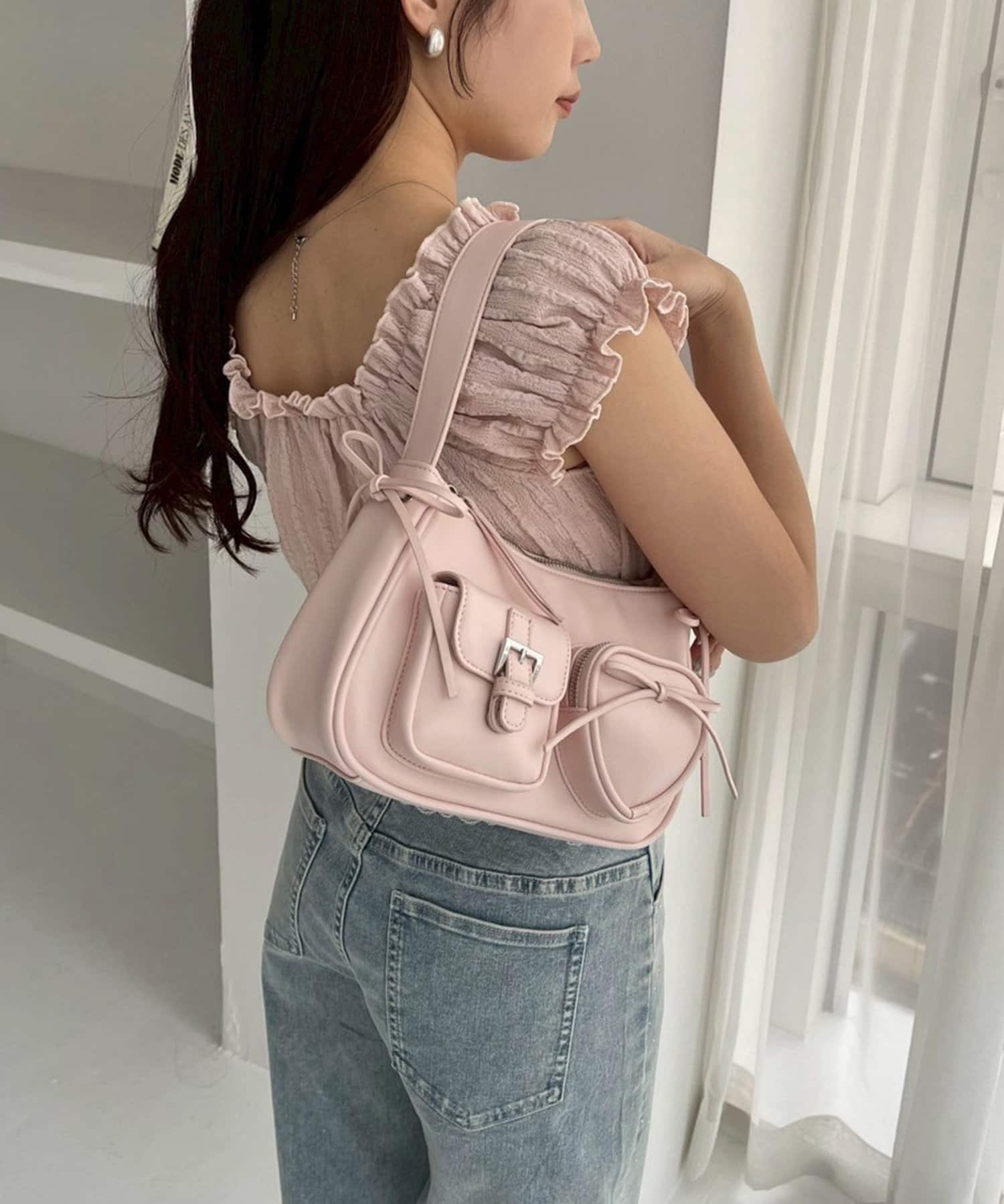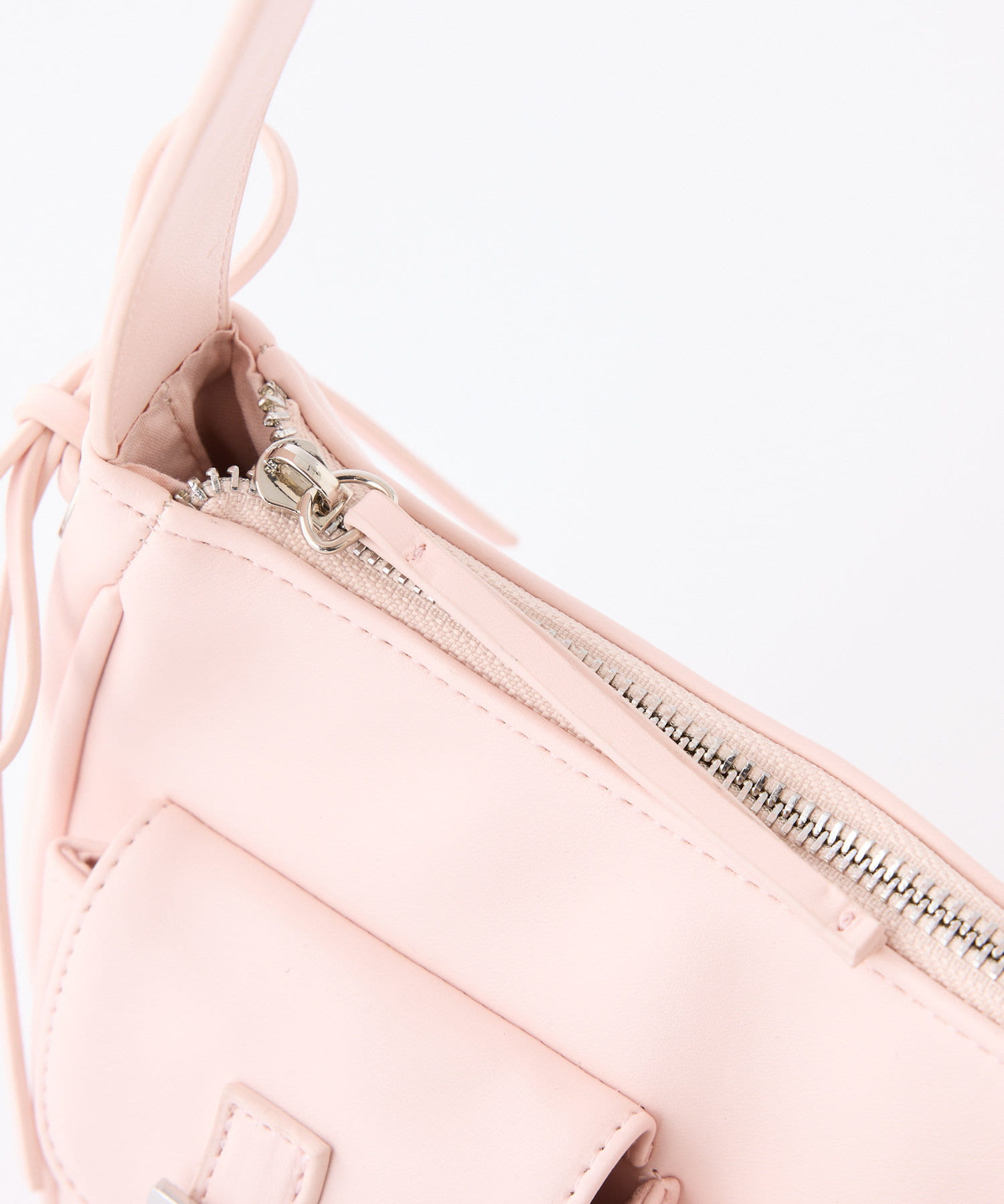 サイドのリボンとハートのポケットで可愛らしい印象に。