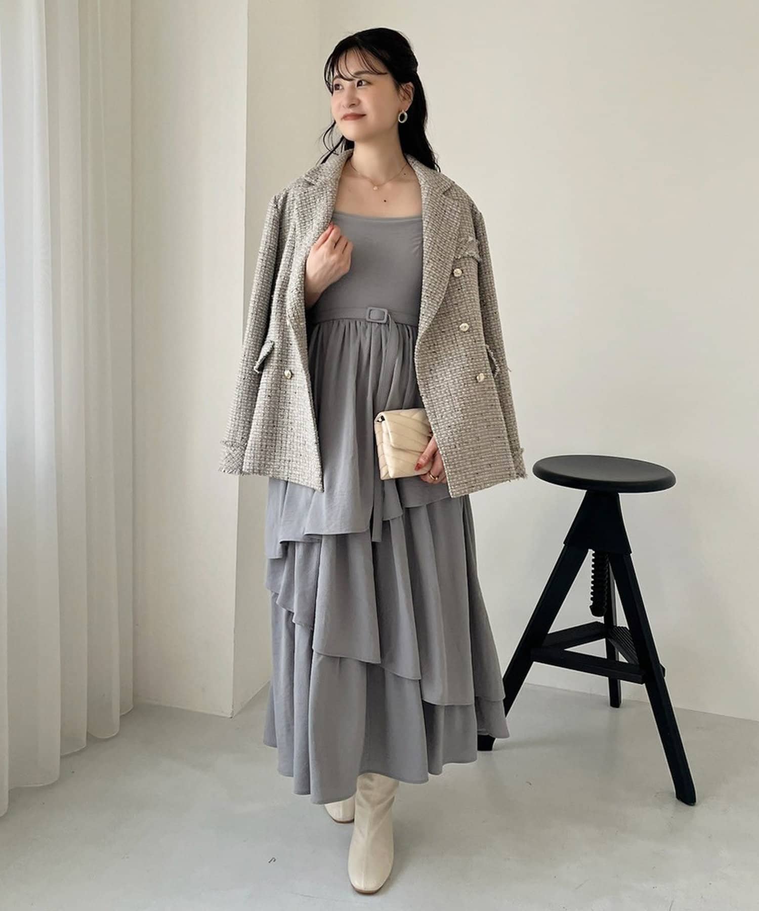 波うつようなデザインのゴールド釦で高級感も加わり、お仕事シーンやお呼ばれシーンなど