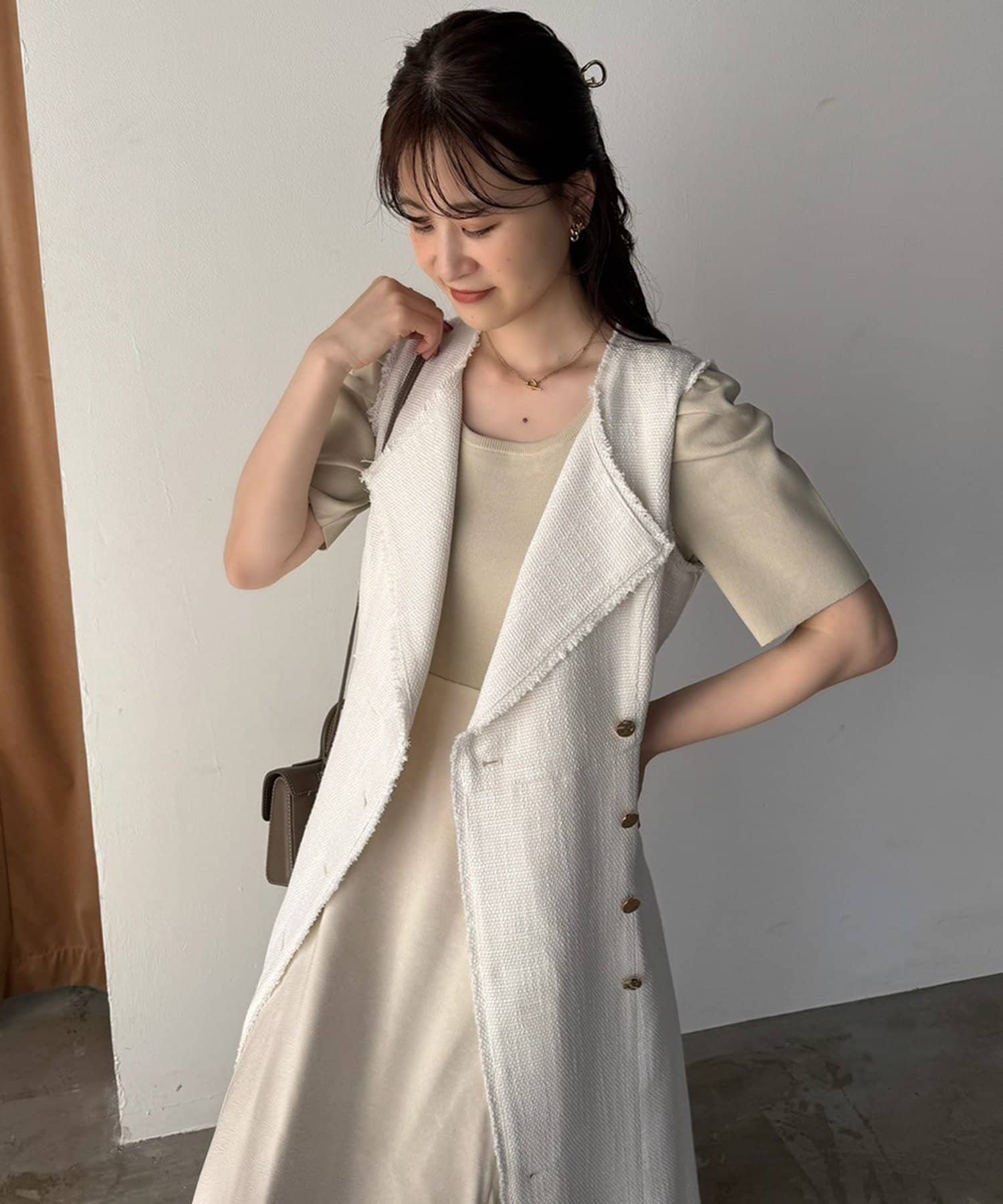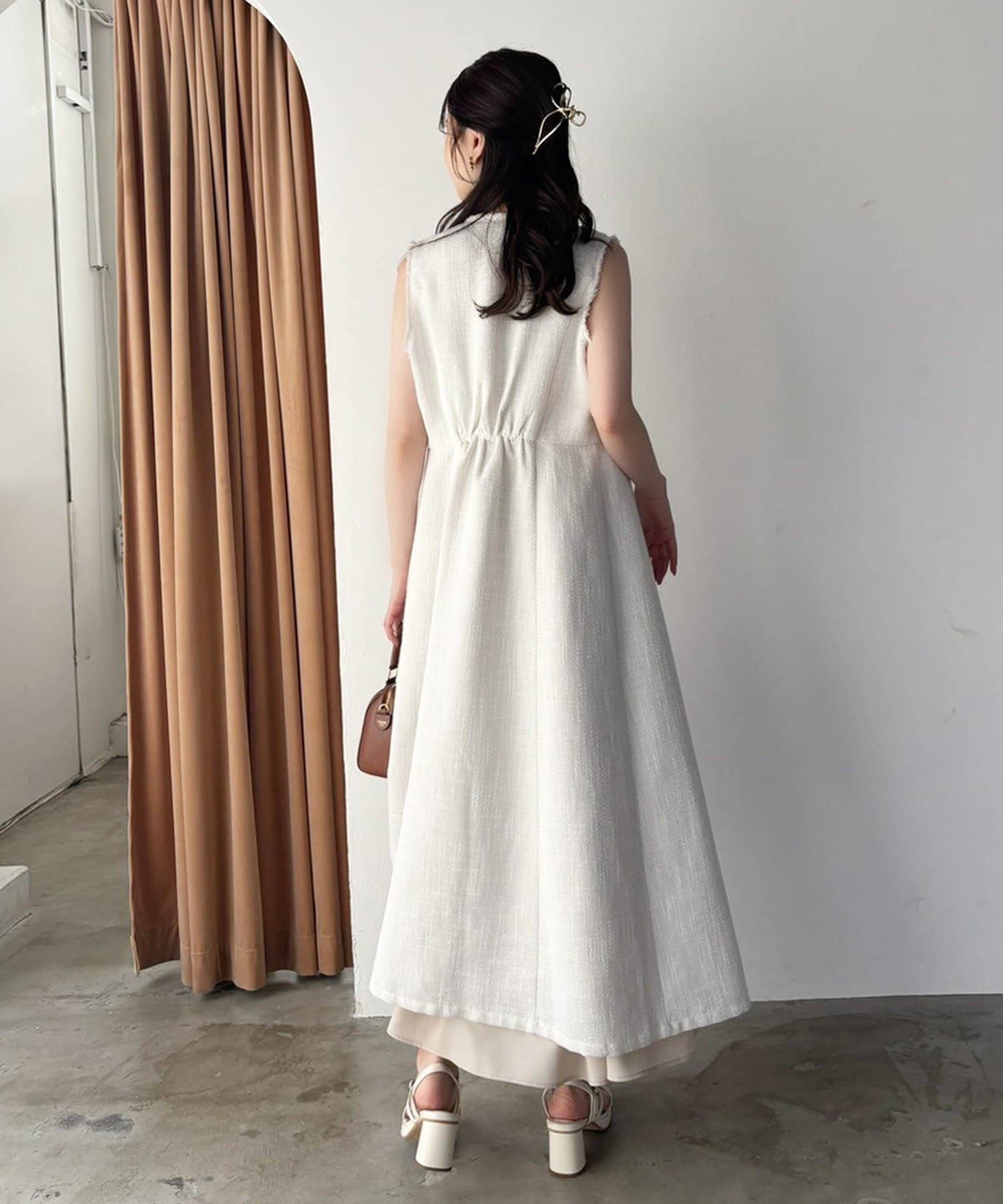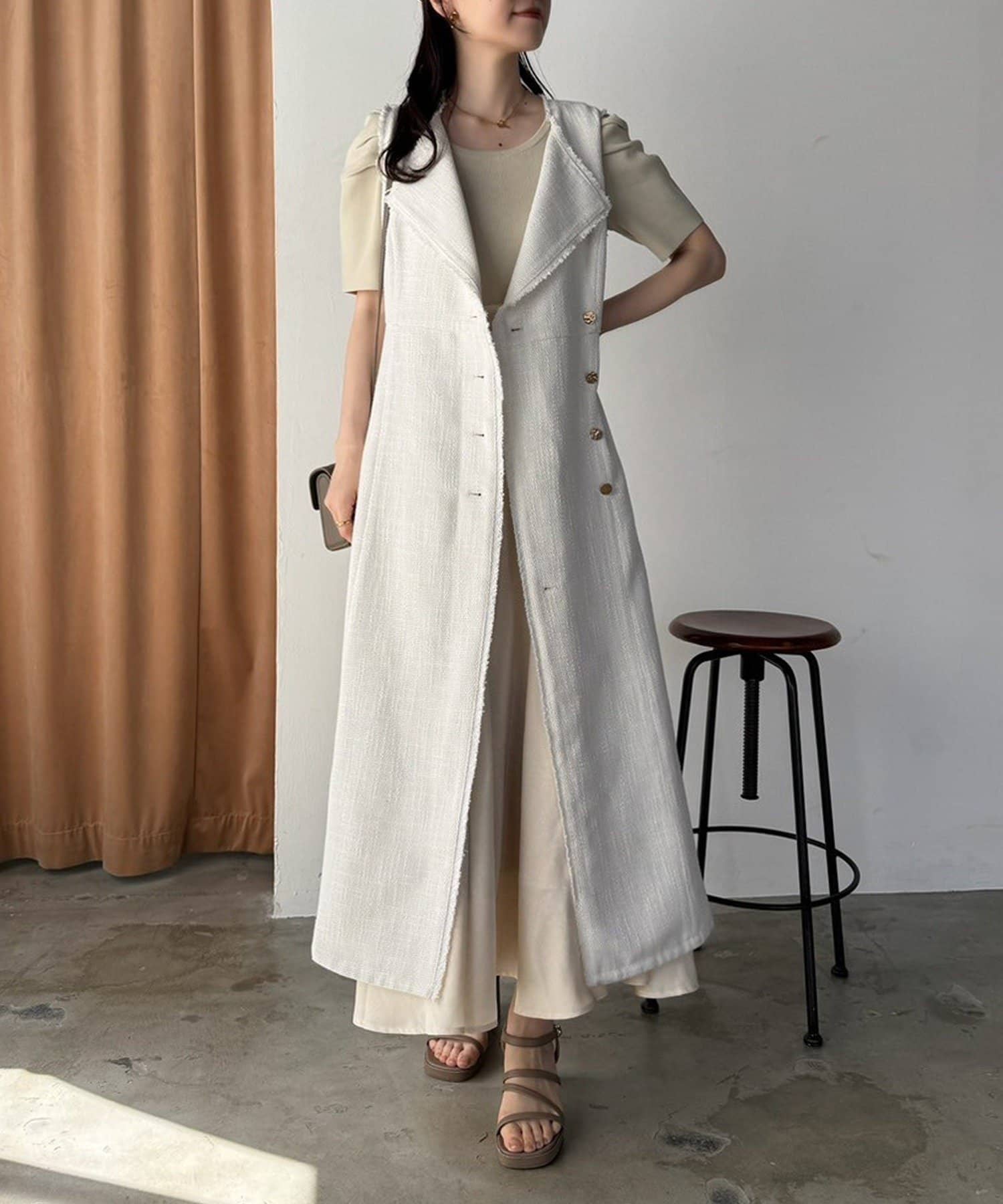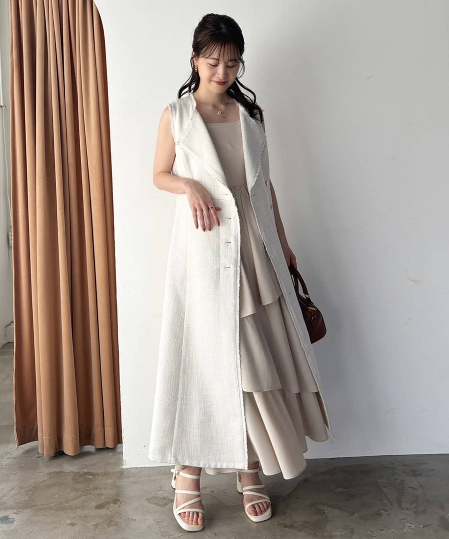 ノースリワンピとしても、ジレとして羽織って重ね着を楽しむこともできるアイテム。