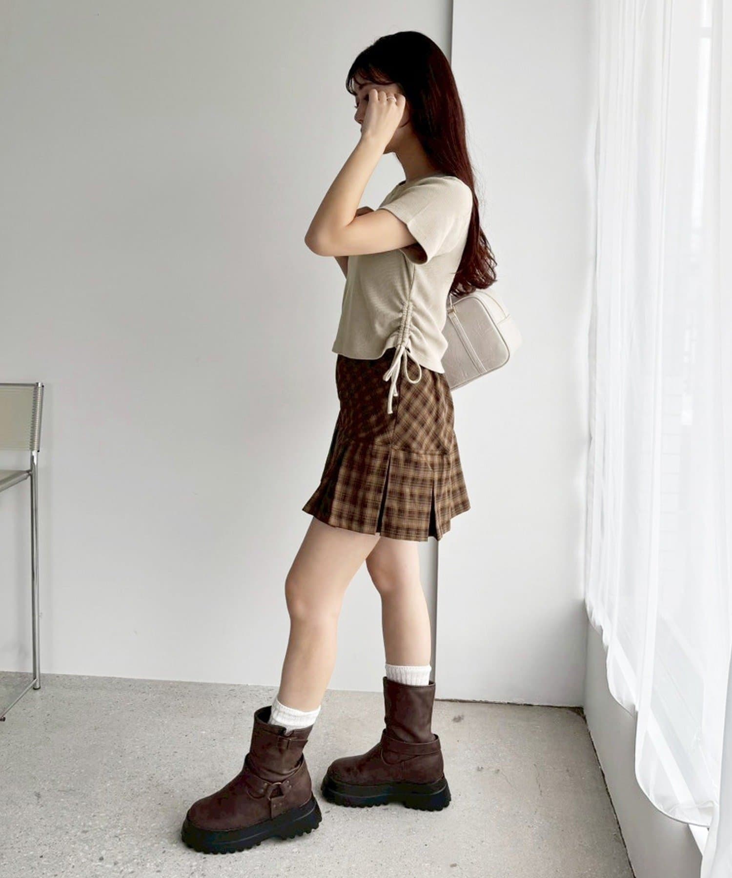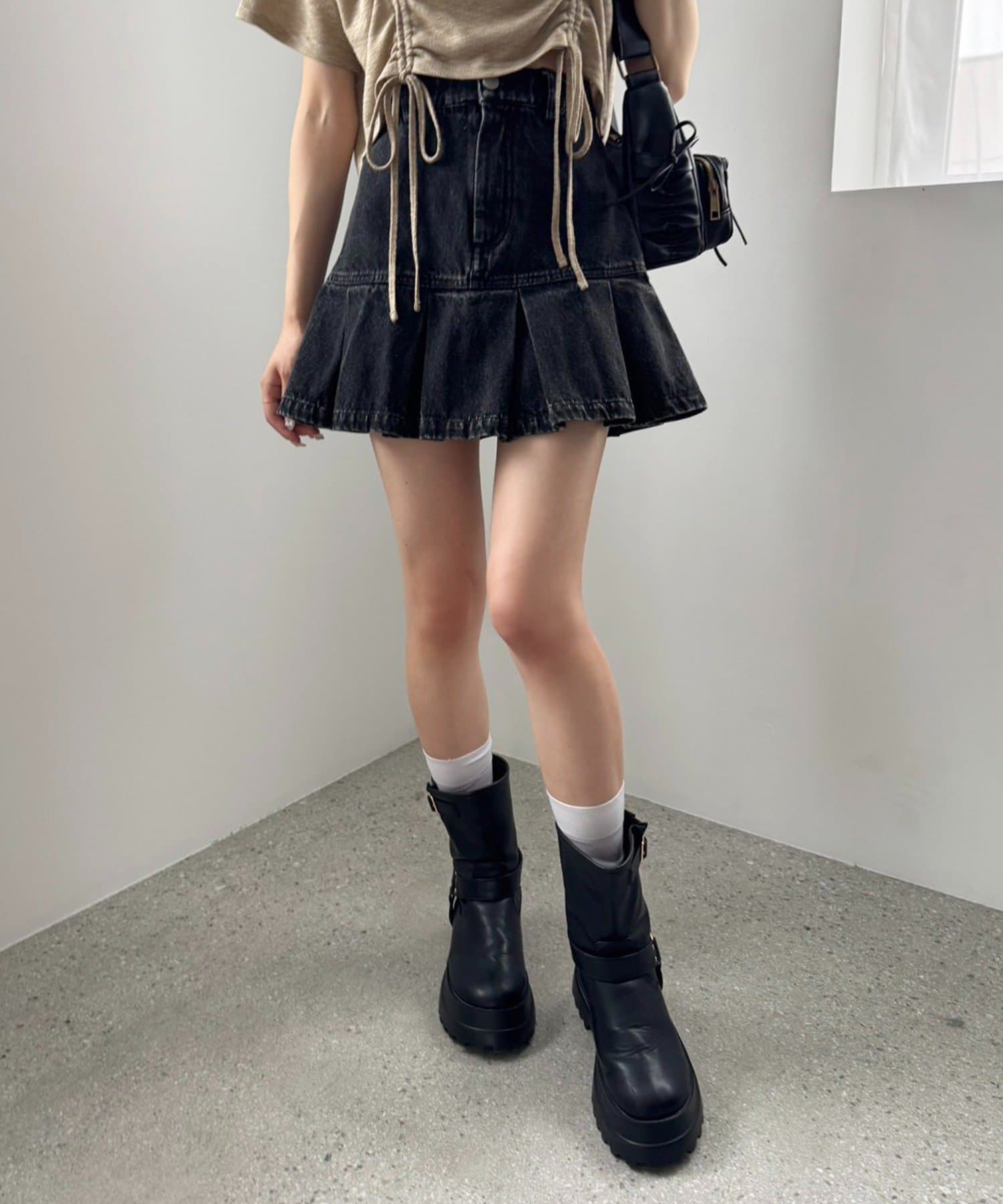 ミニ丈デザインなので、ロングブーツやサイドゴアブーツなど、
