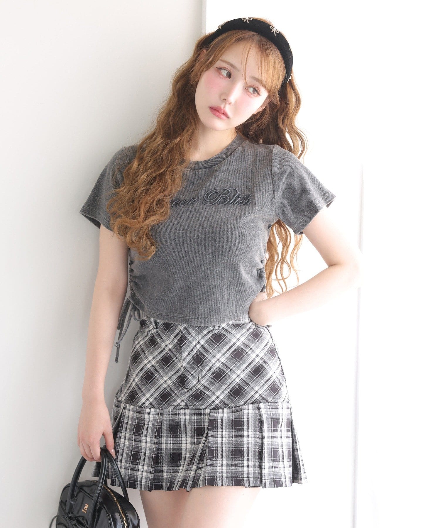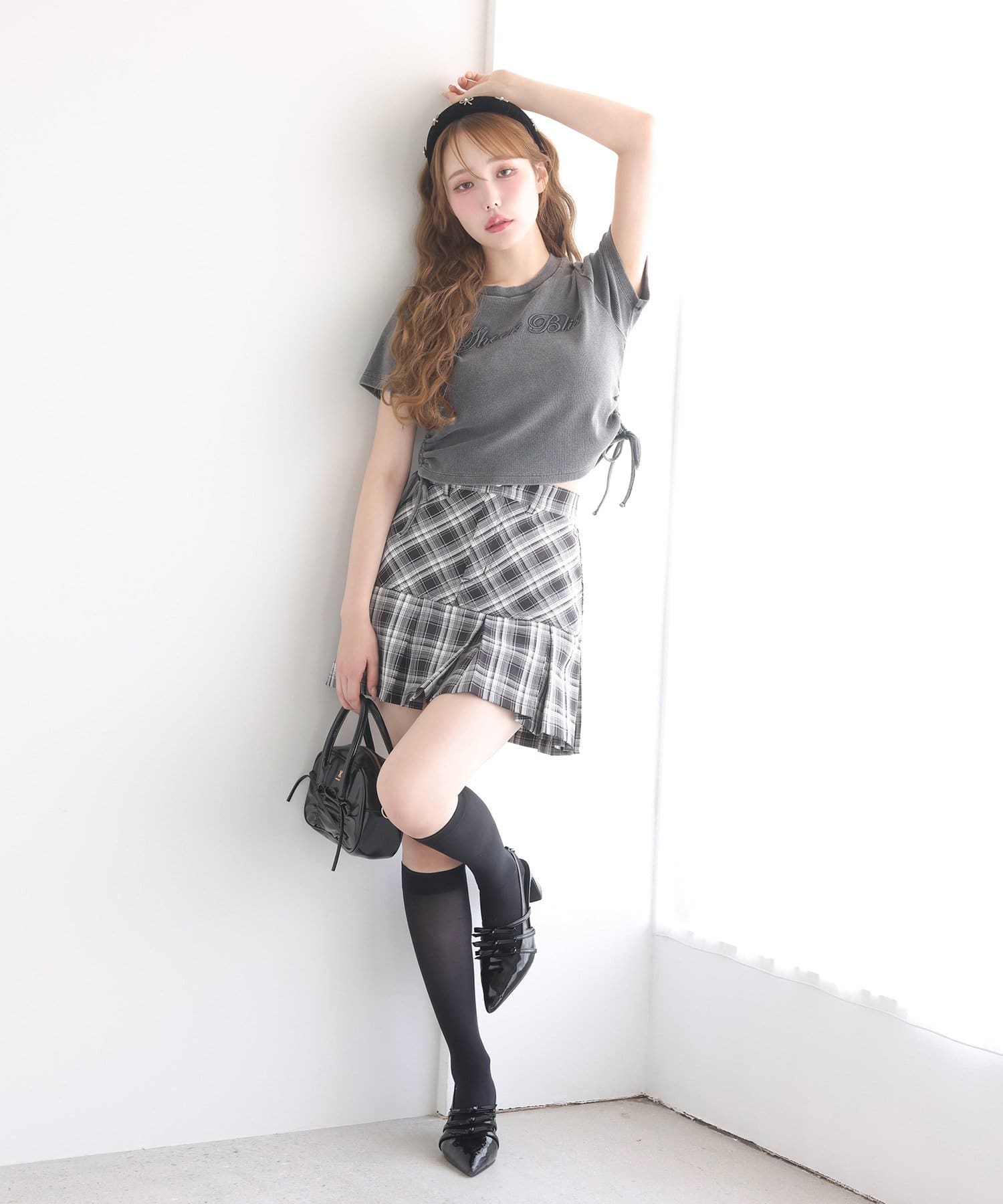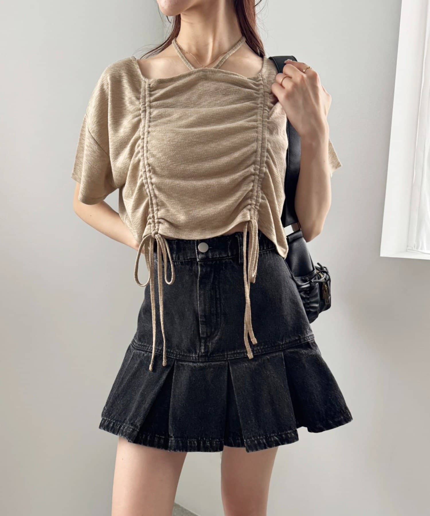 脚が綺麗に見える絶妙な丈感も嬉しいポイント。裏地がパンツ仕様になっているので、ミニ丈でも安心感抜群◎