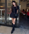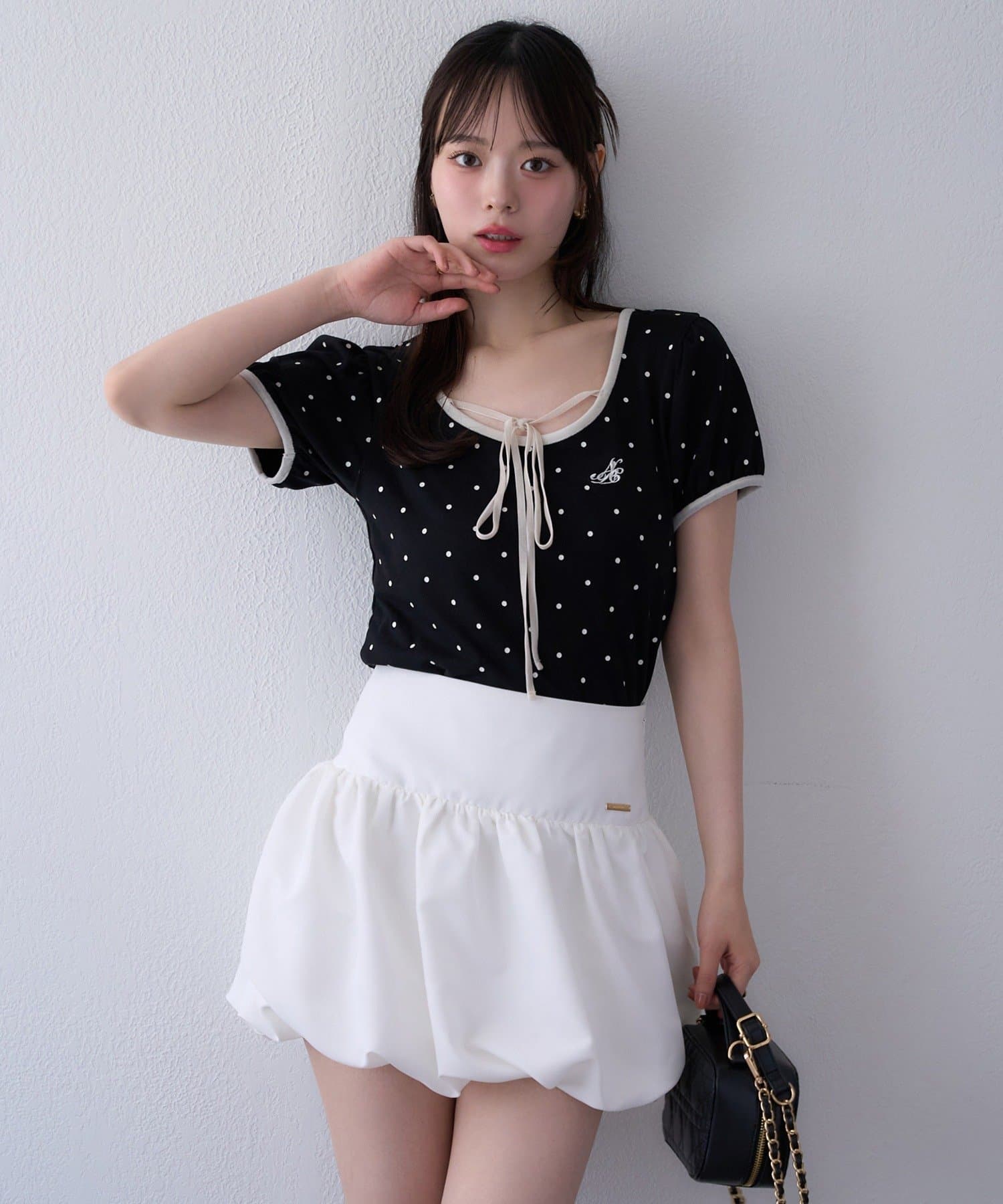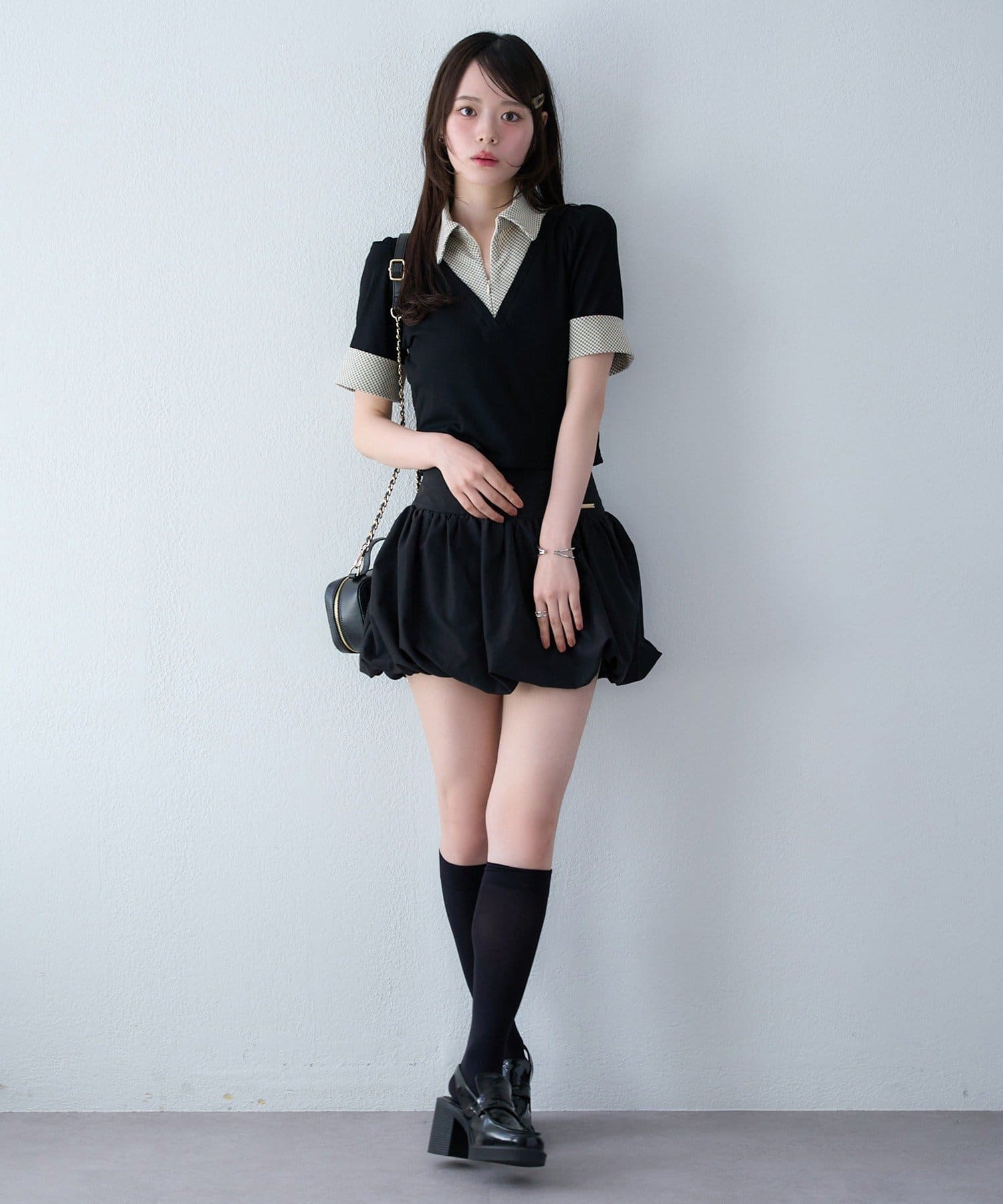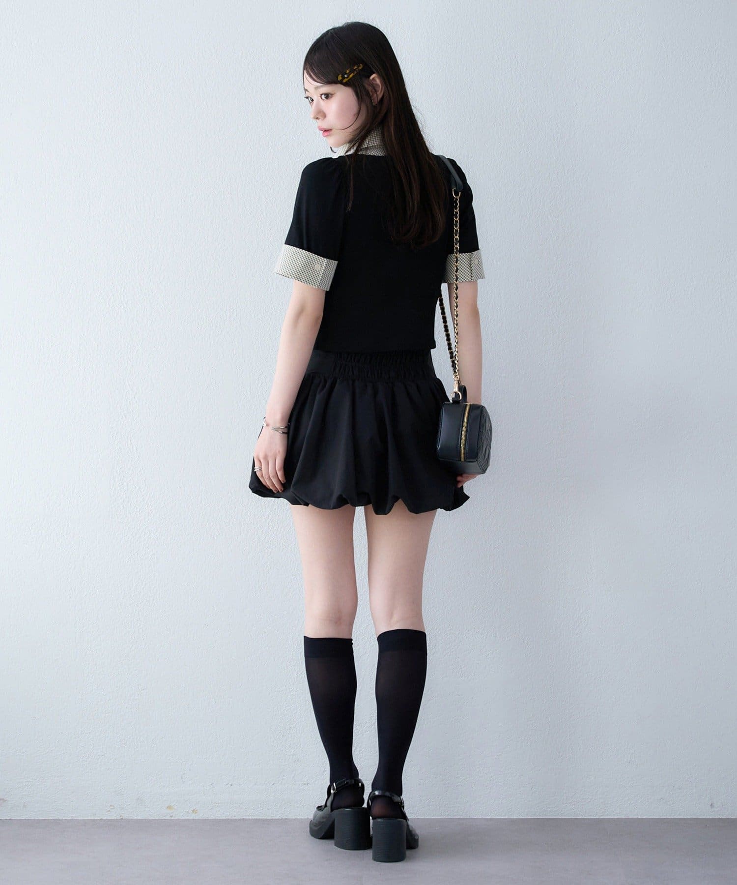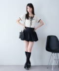 ボリューム感のあるボトムスなので、トップスはコンパクトなものが◎