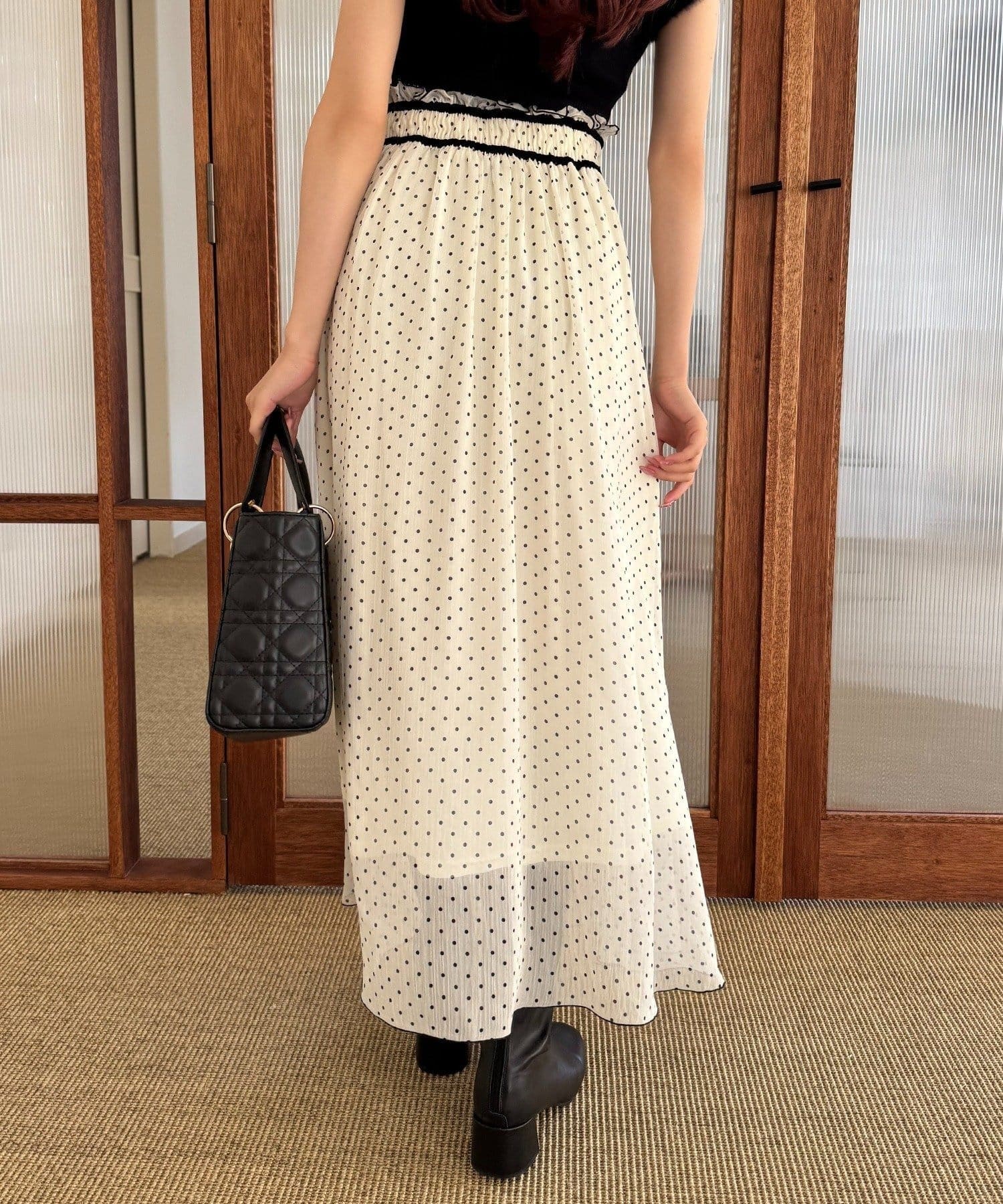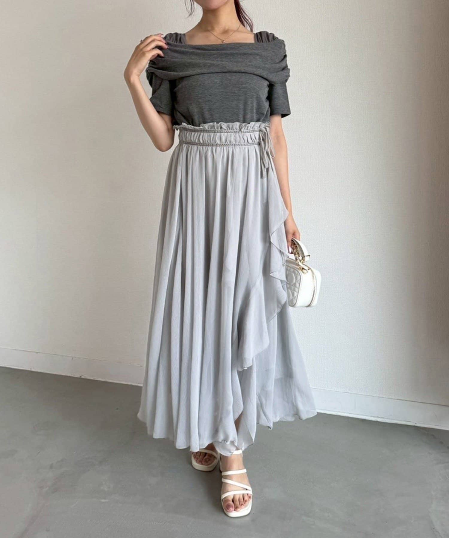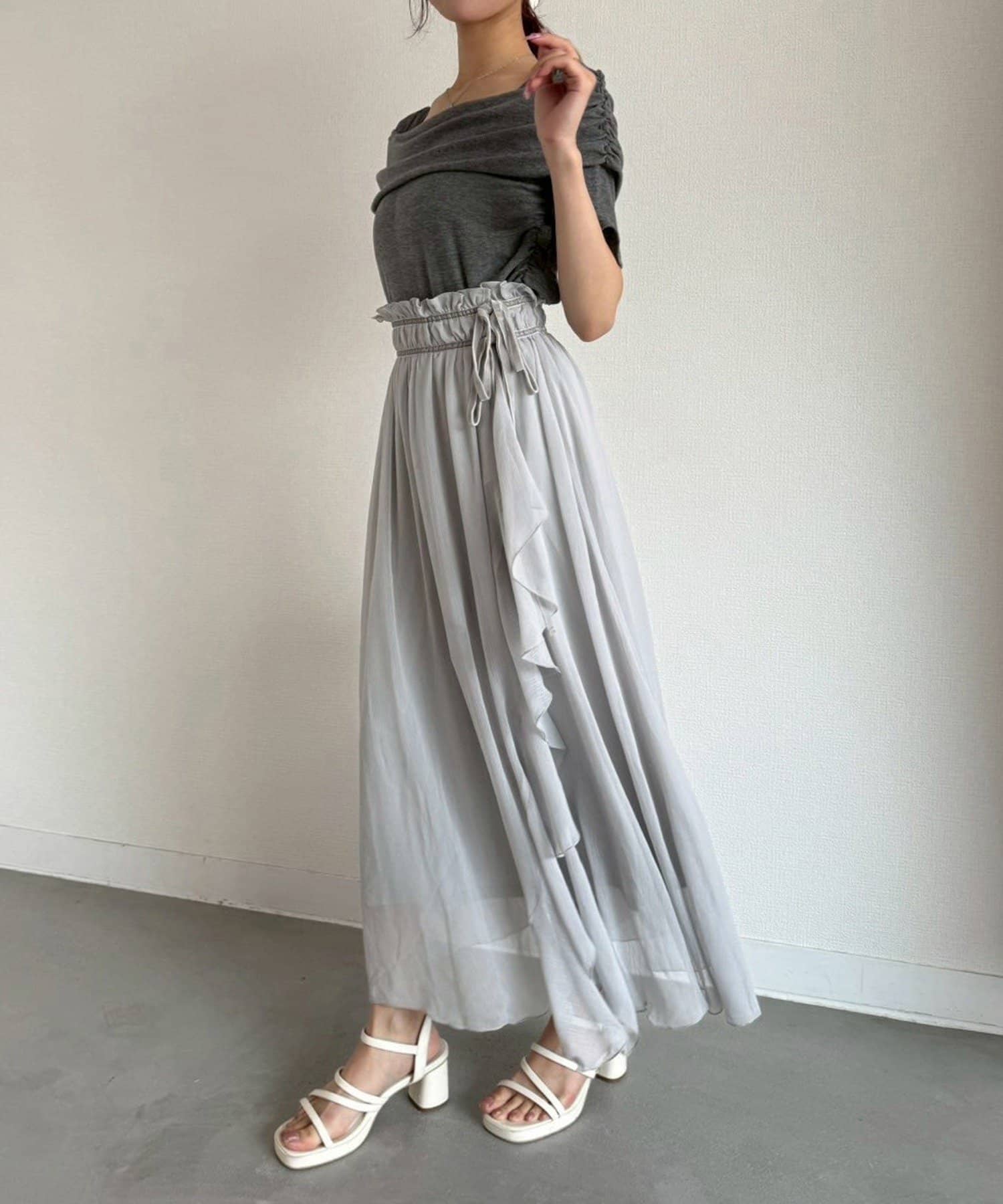 軽やかな素材感で、歩くたびに揺れるシルエットが女性らしさを引き立てます。