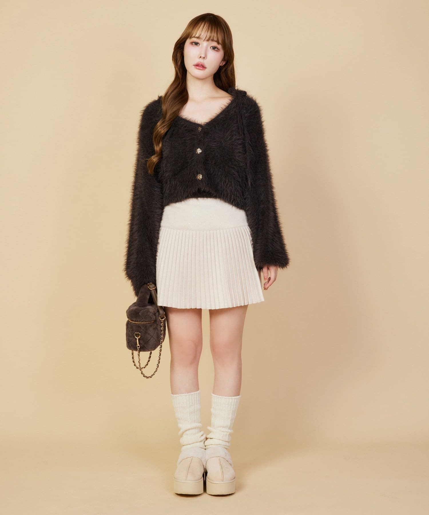 細かめのプリーツなので、動くたびに揺れ動き大人っぽさもプラスします。