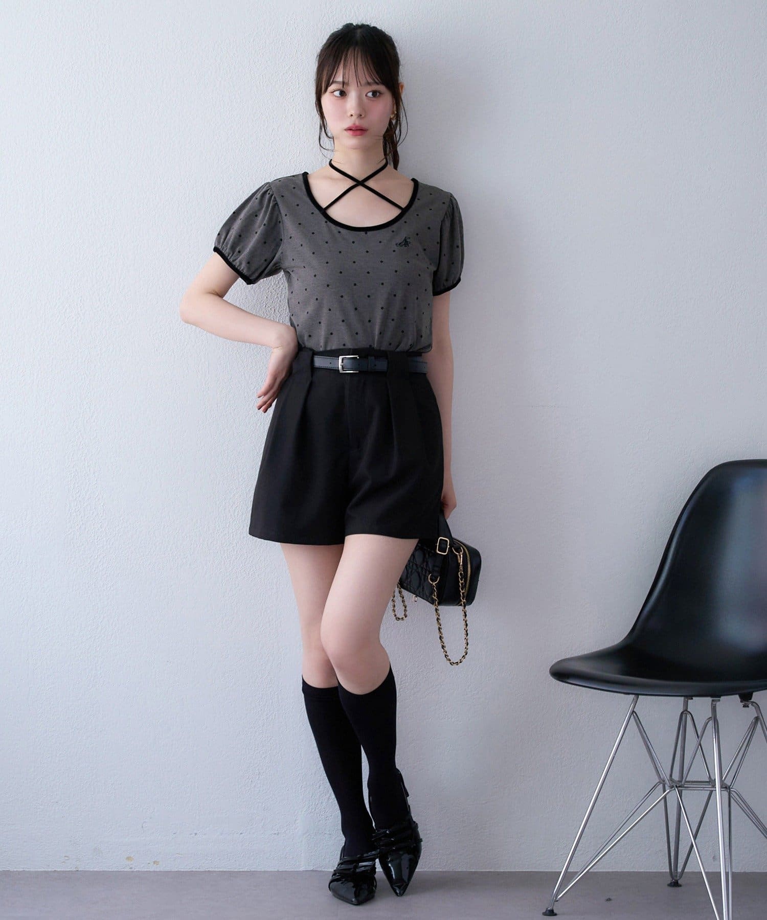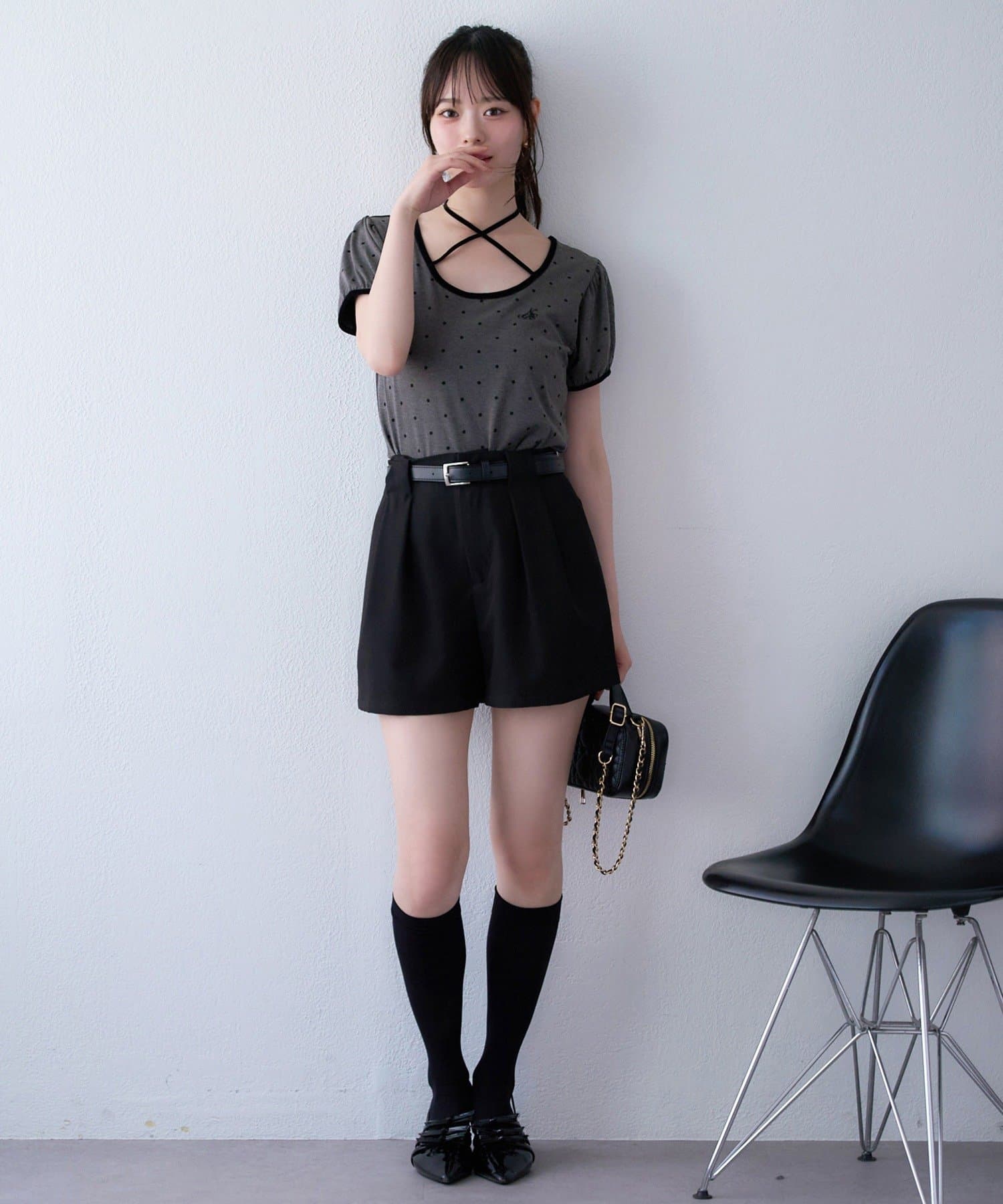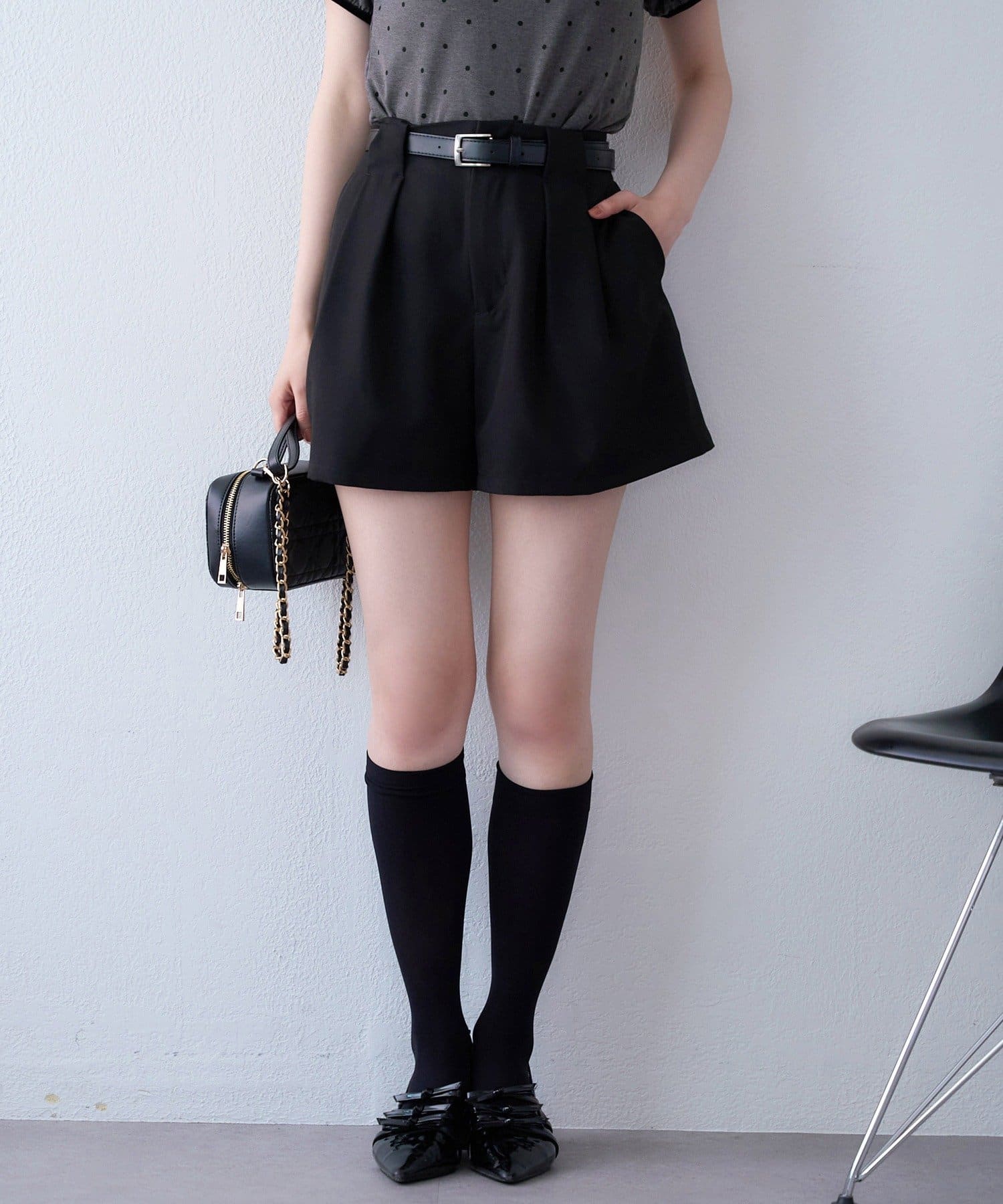 足元はハイソックス×ローファーやバレエシューズを合わせて、今っぽいスタイルに仕上げて。