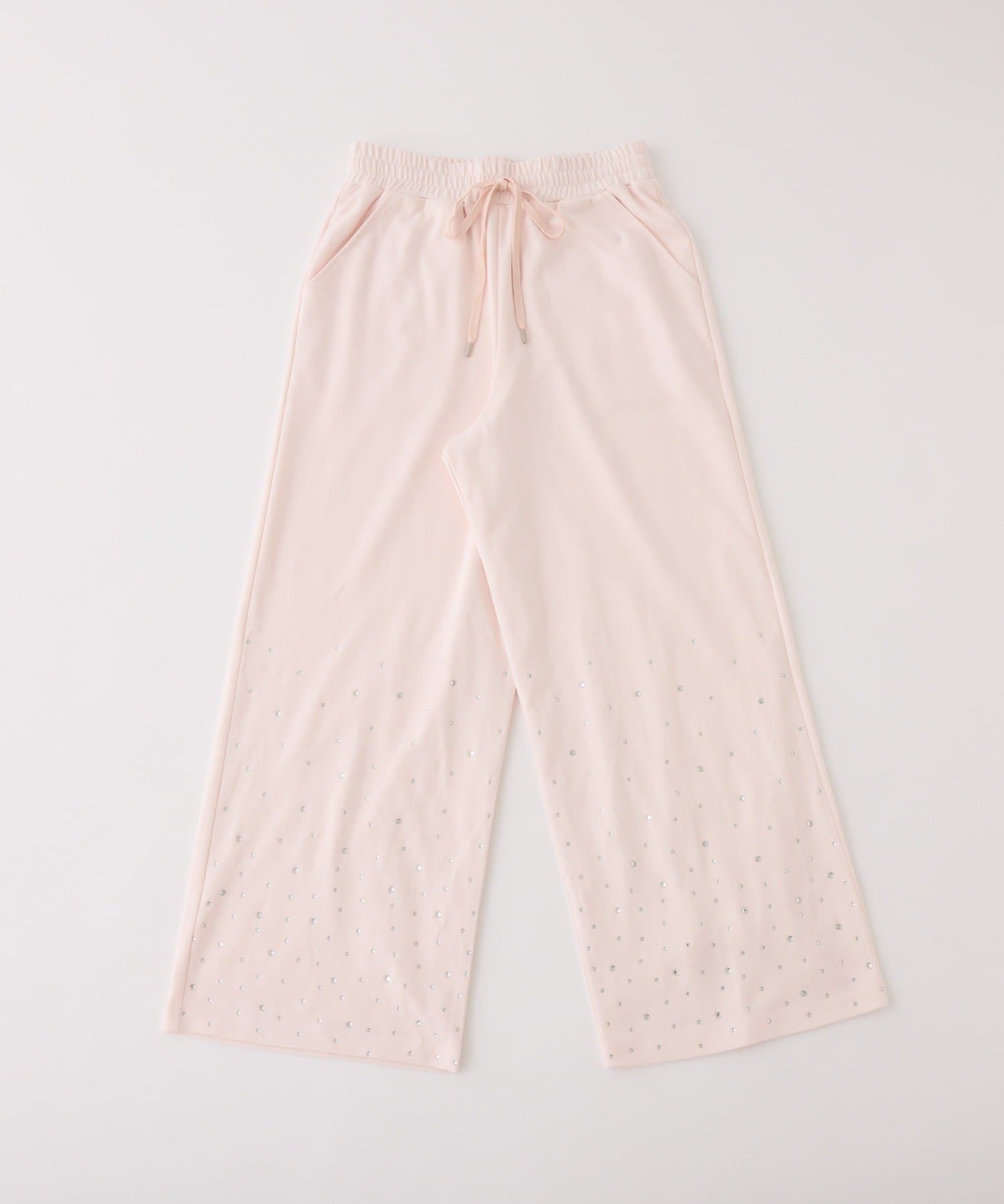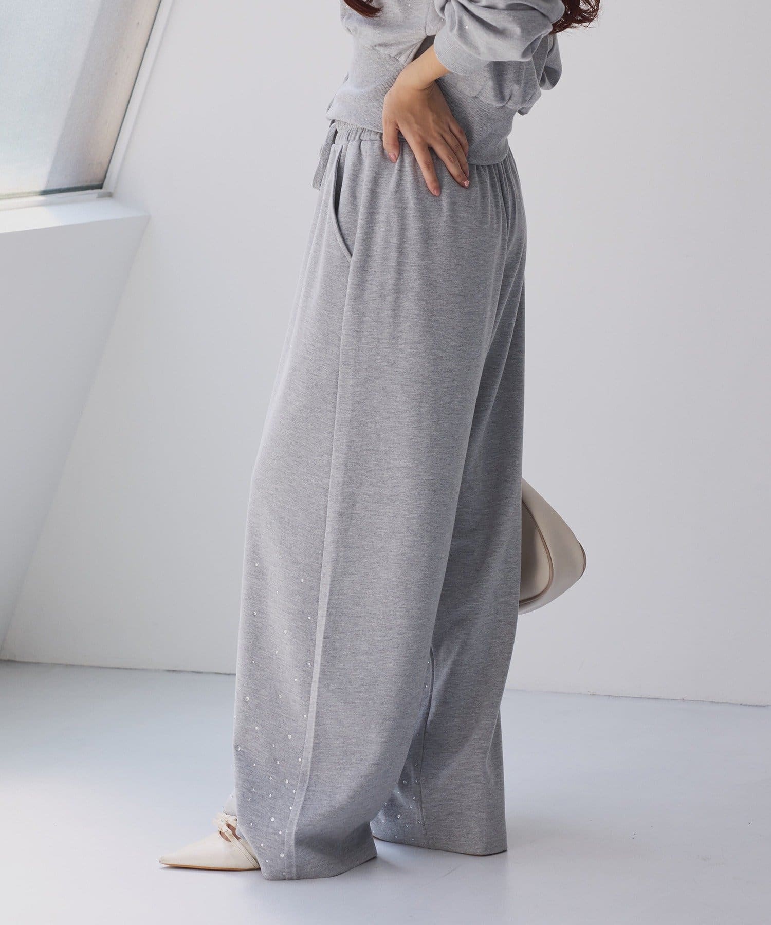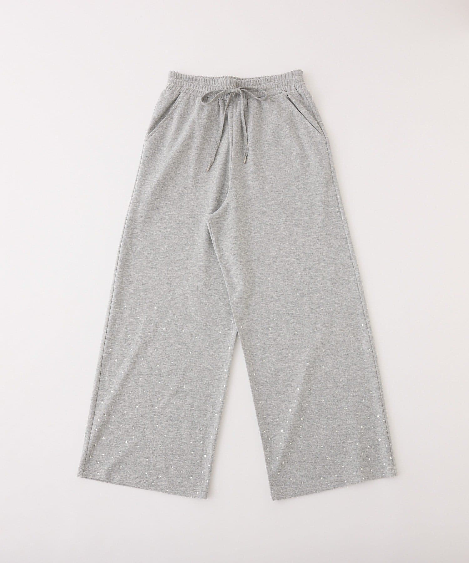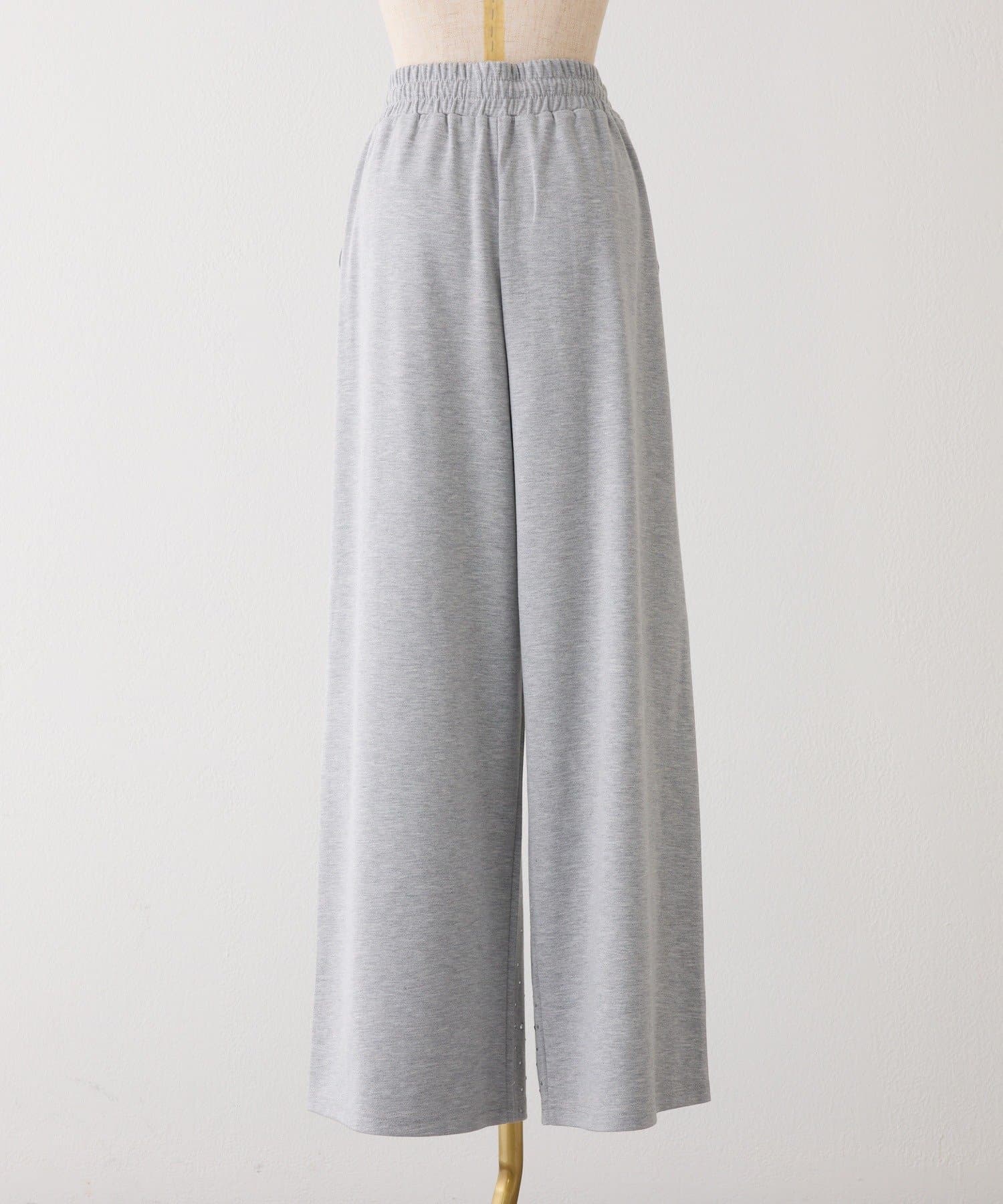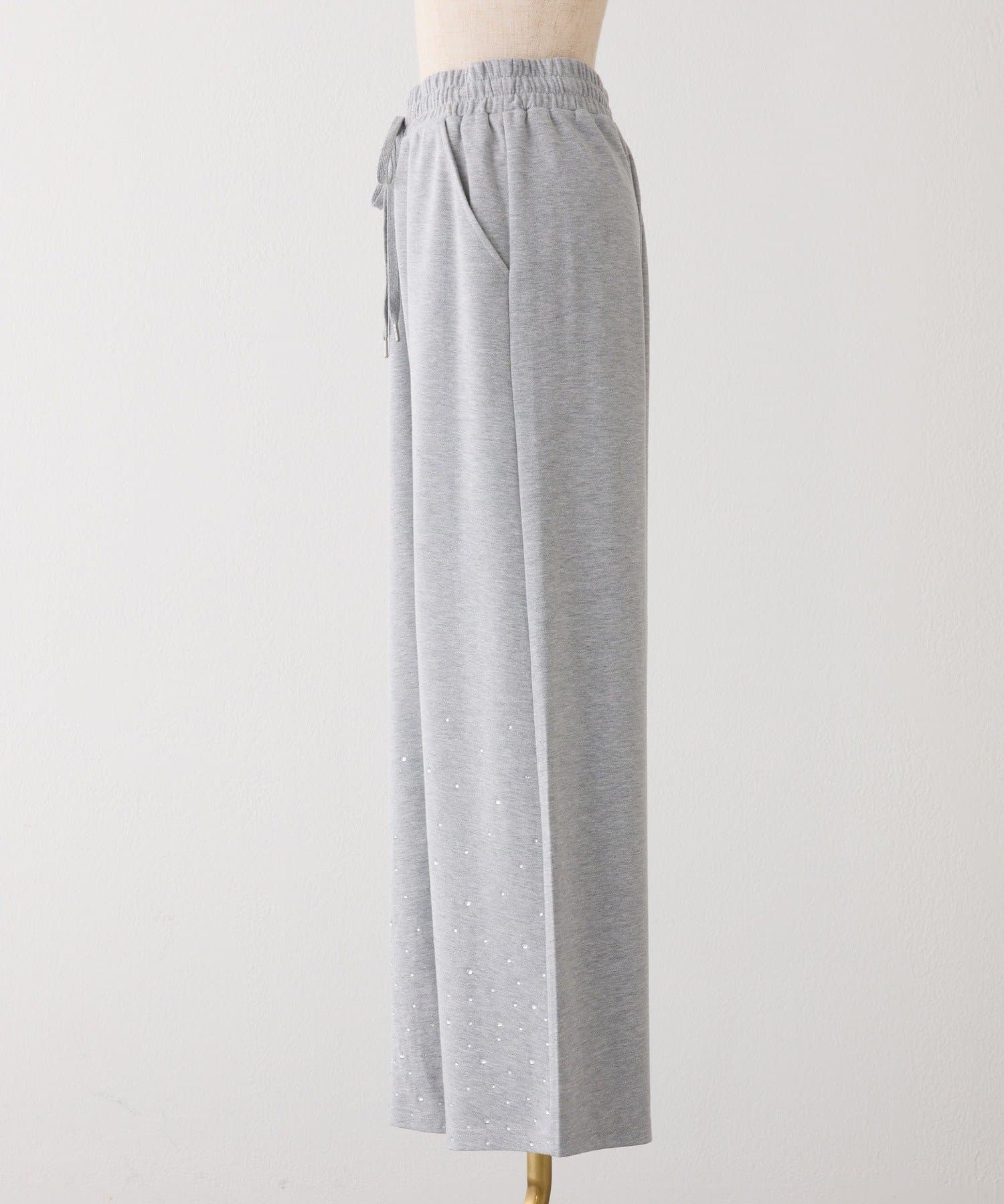 裾にビジューをあしらった、大人フェミニンなスウェットワイドパンツ。