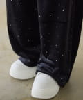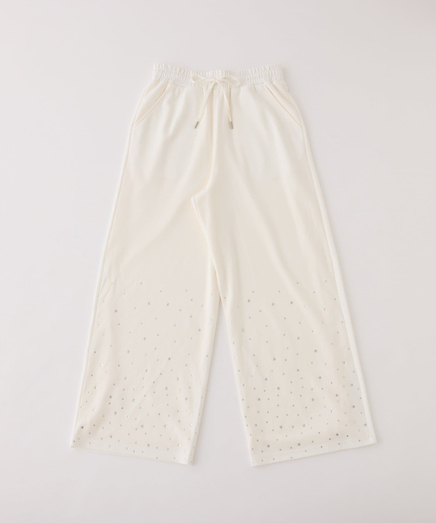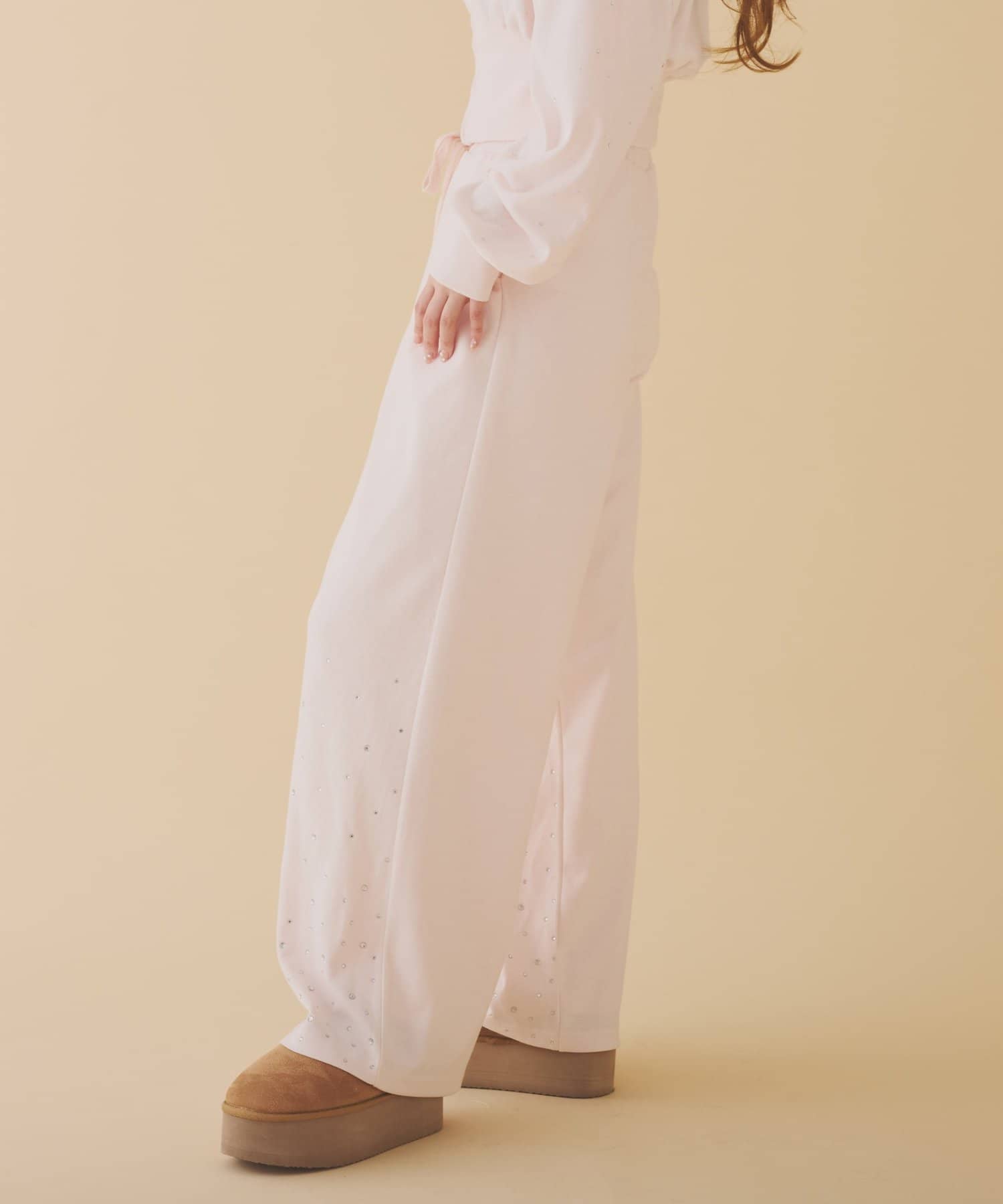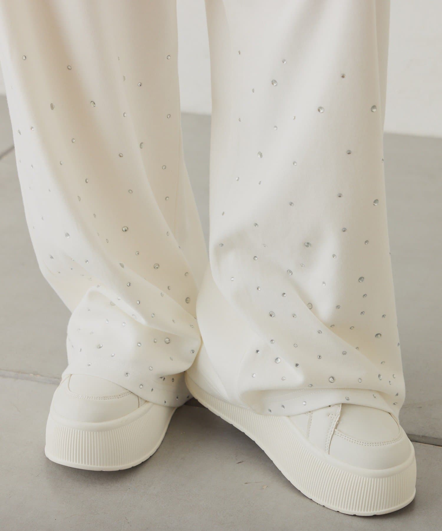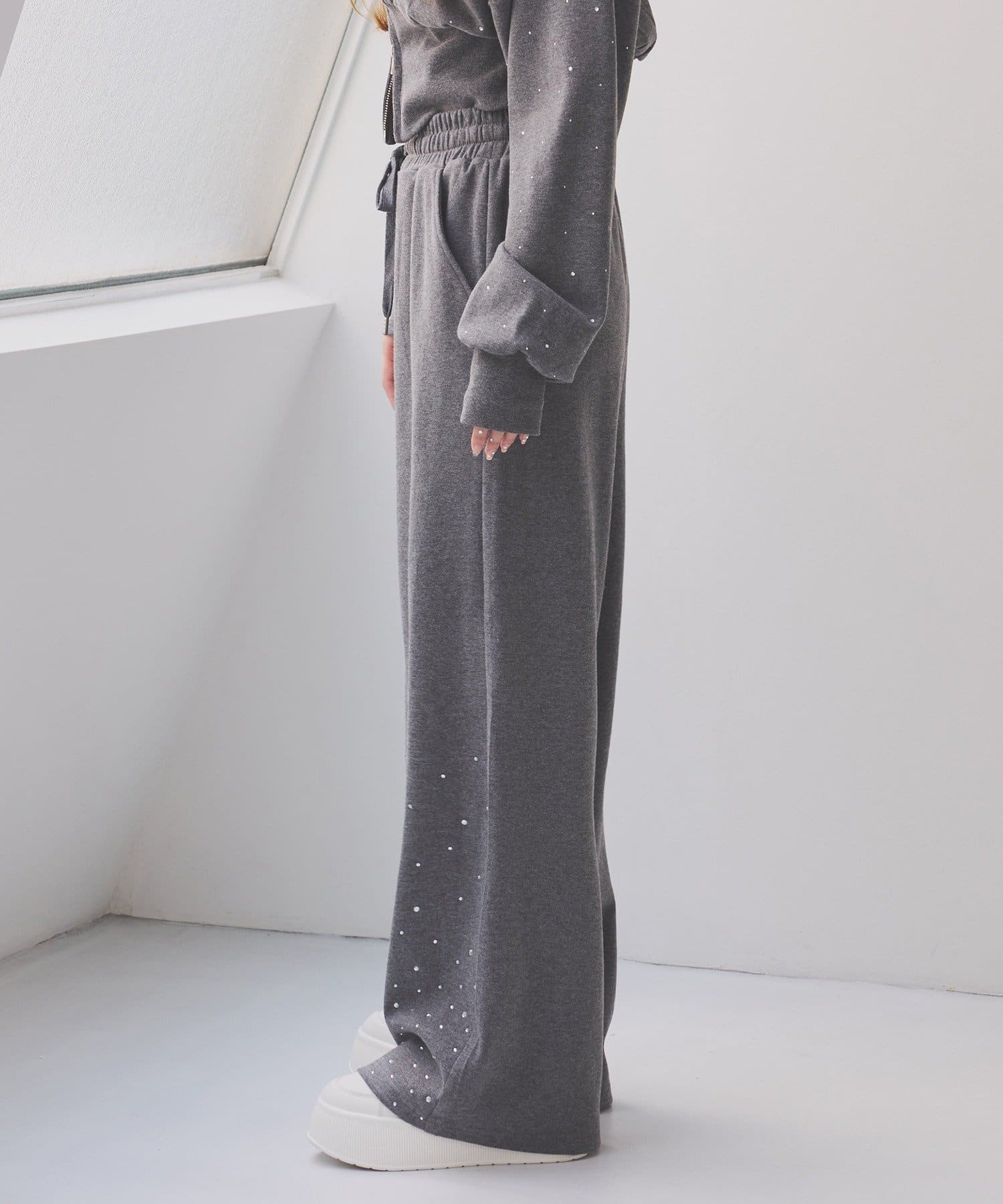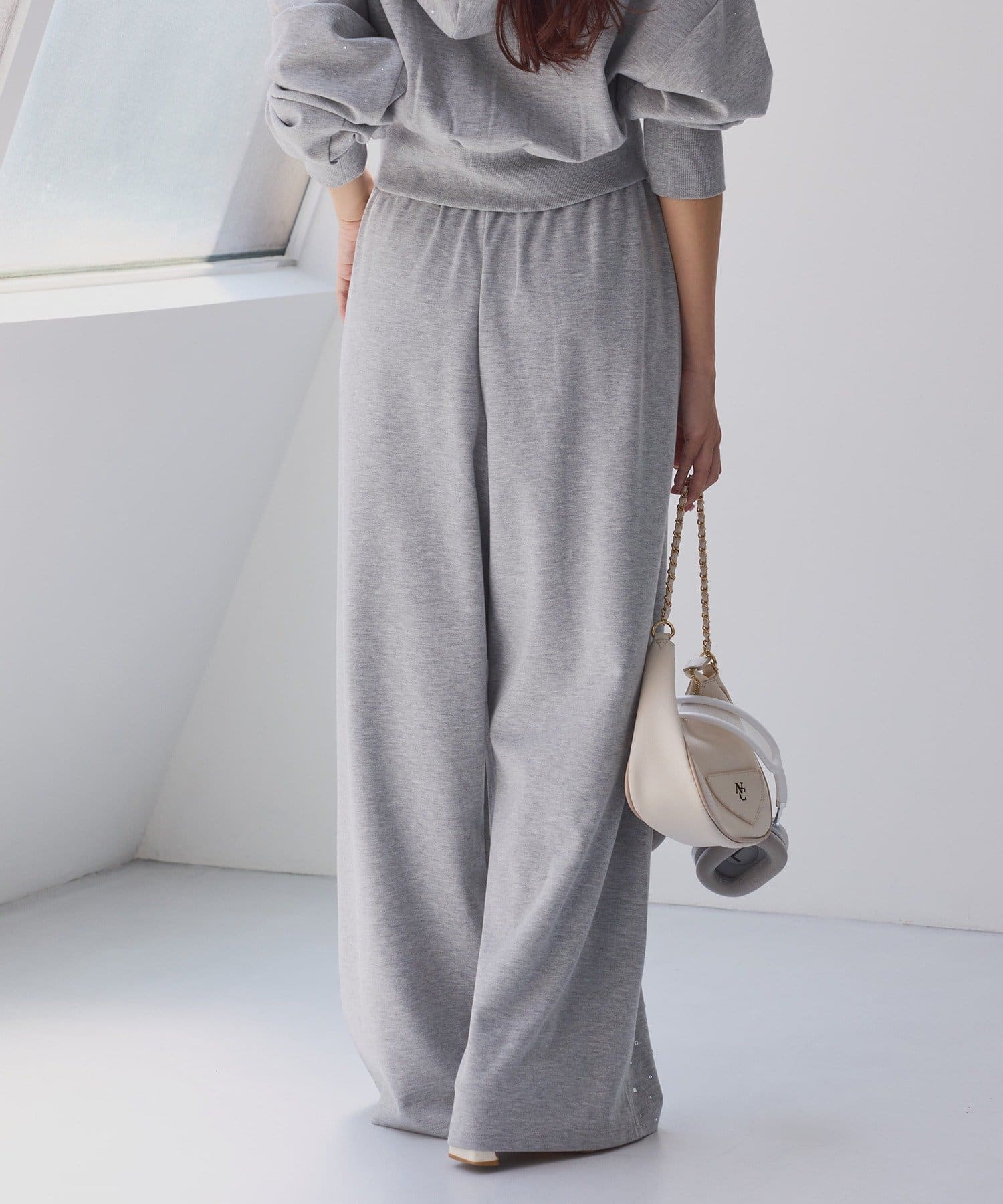 裾にビジューをあしらった、大人フェミニンなスウェットワイドパンツ。