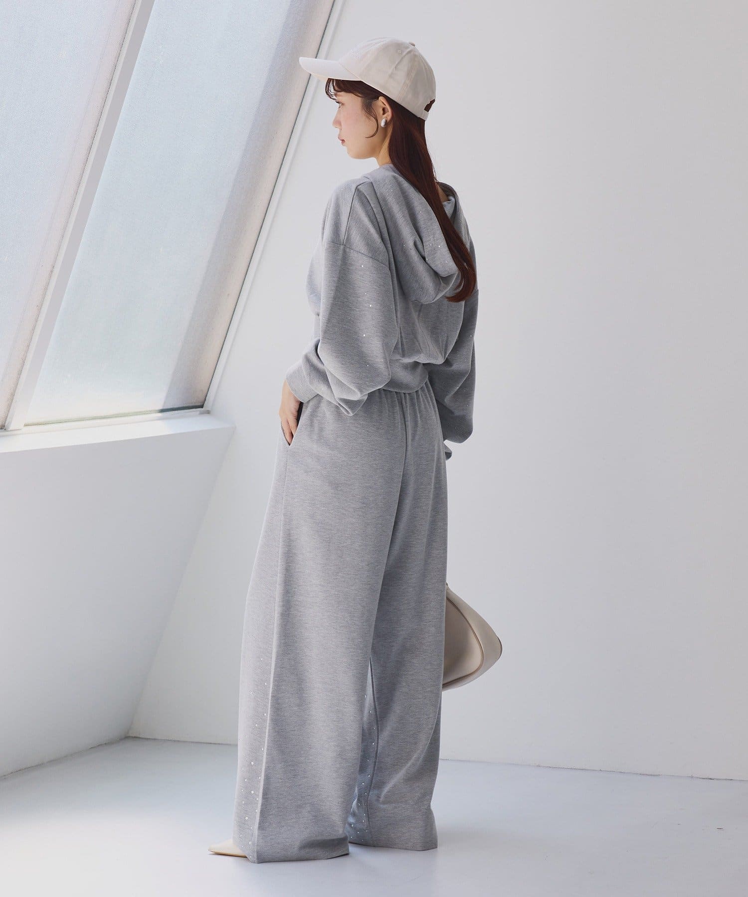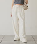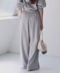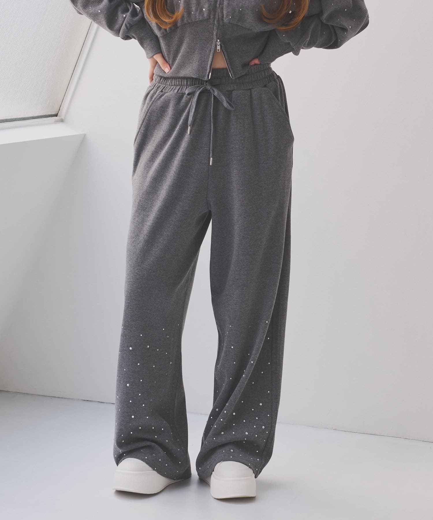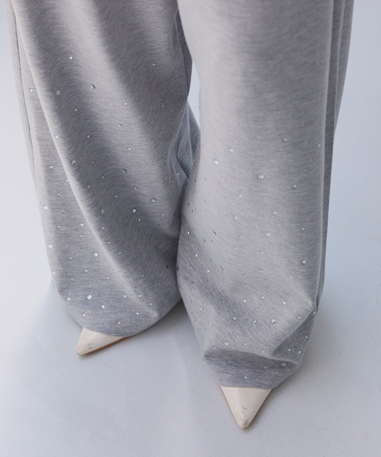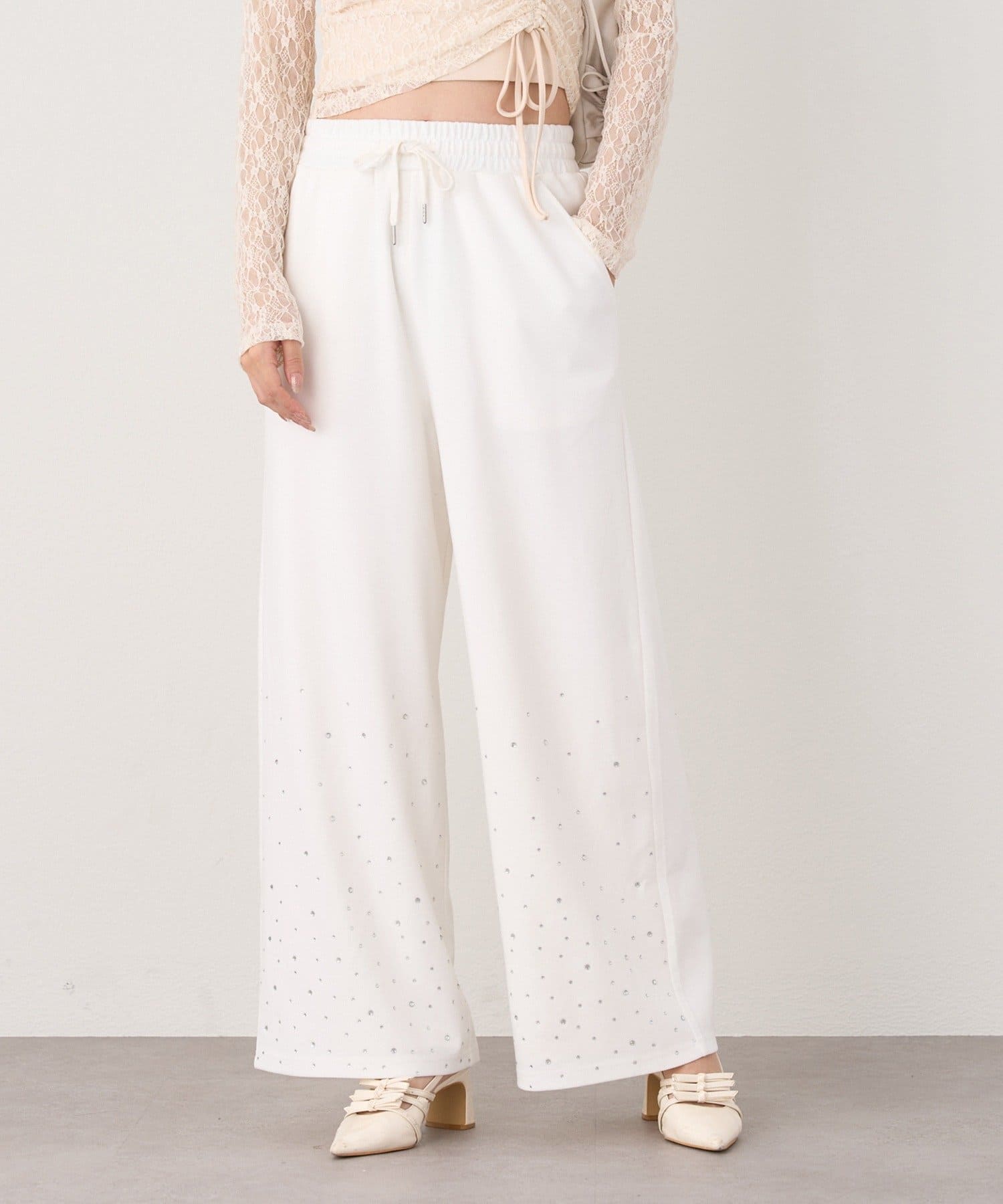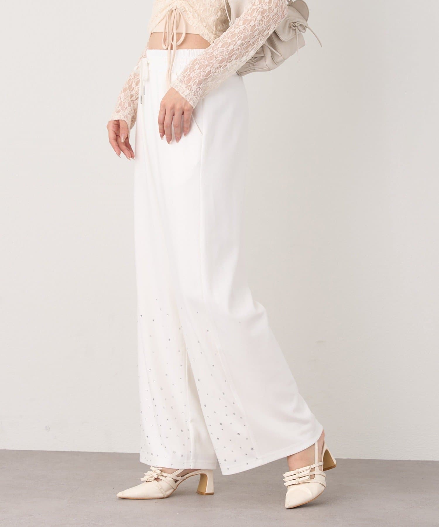 裾にビジューをあしらった、大人フェミニンなスウェットワイドパンツ。