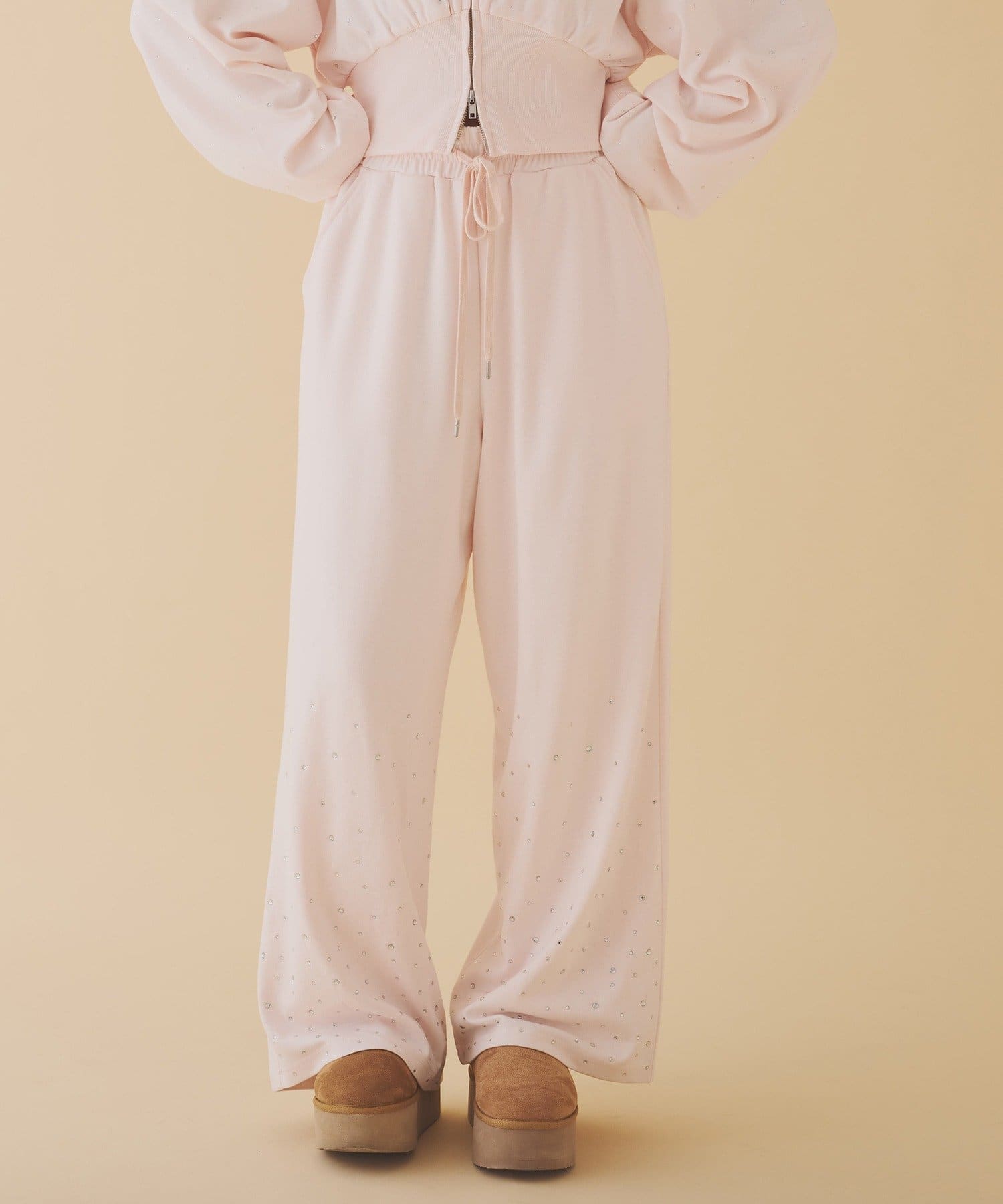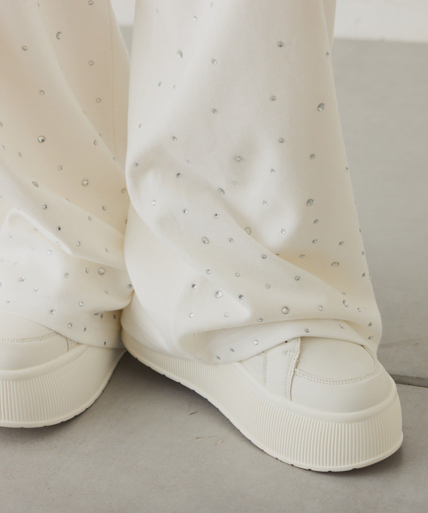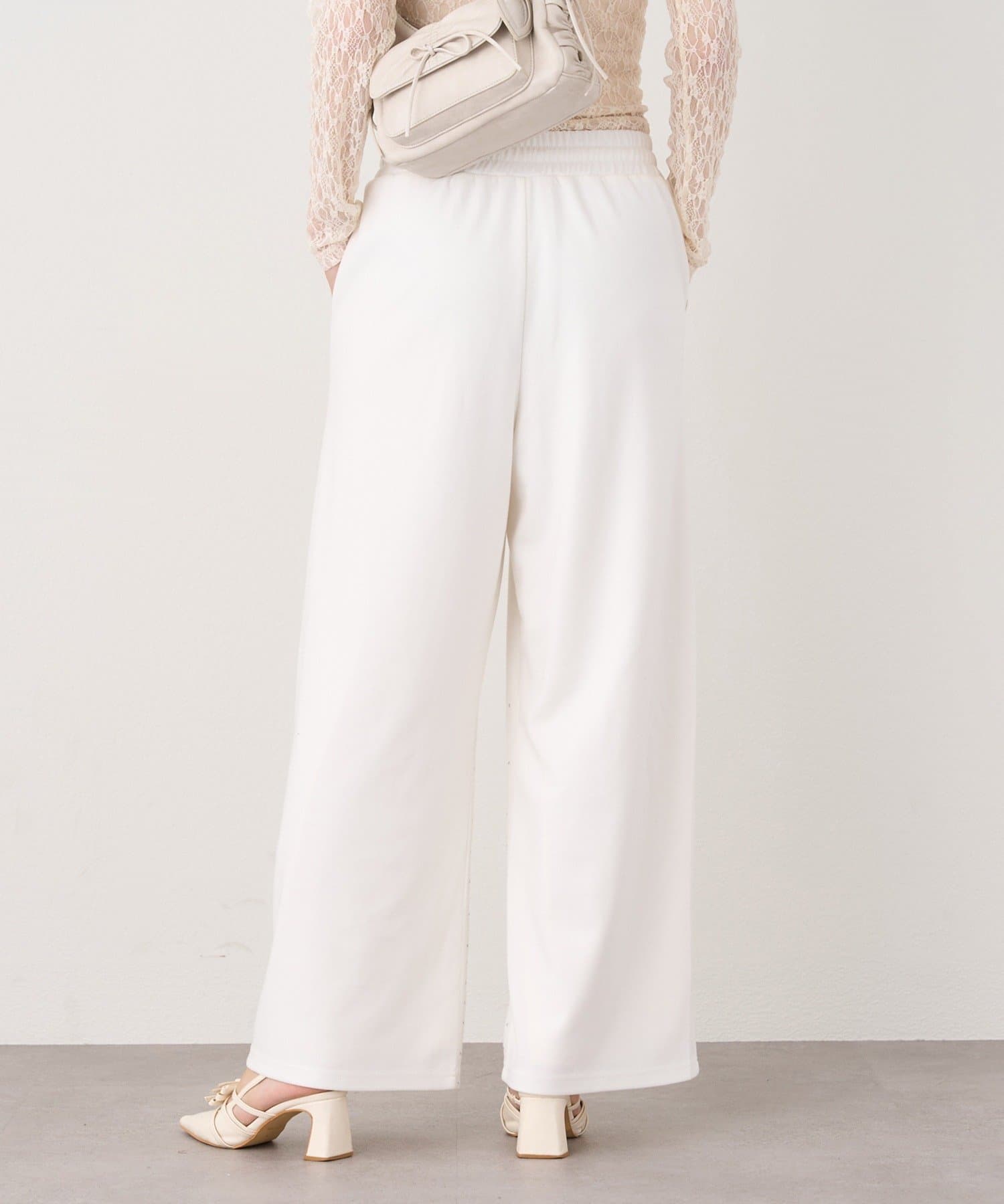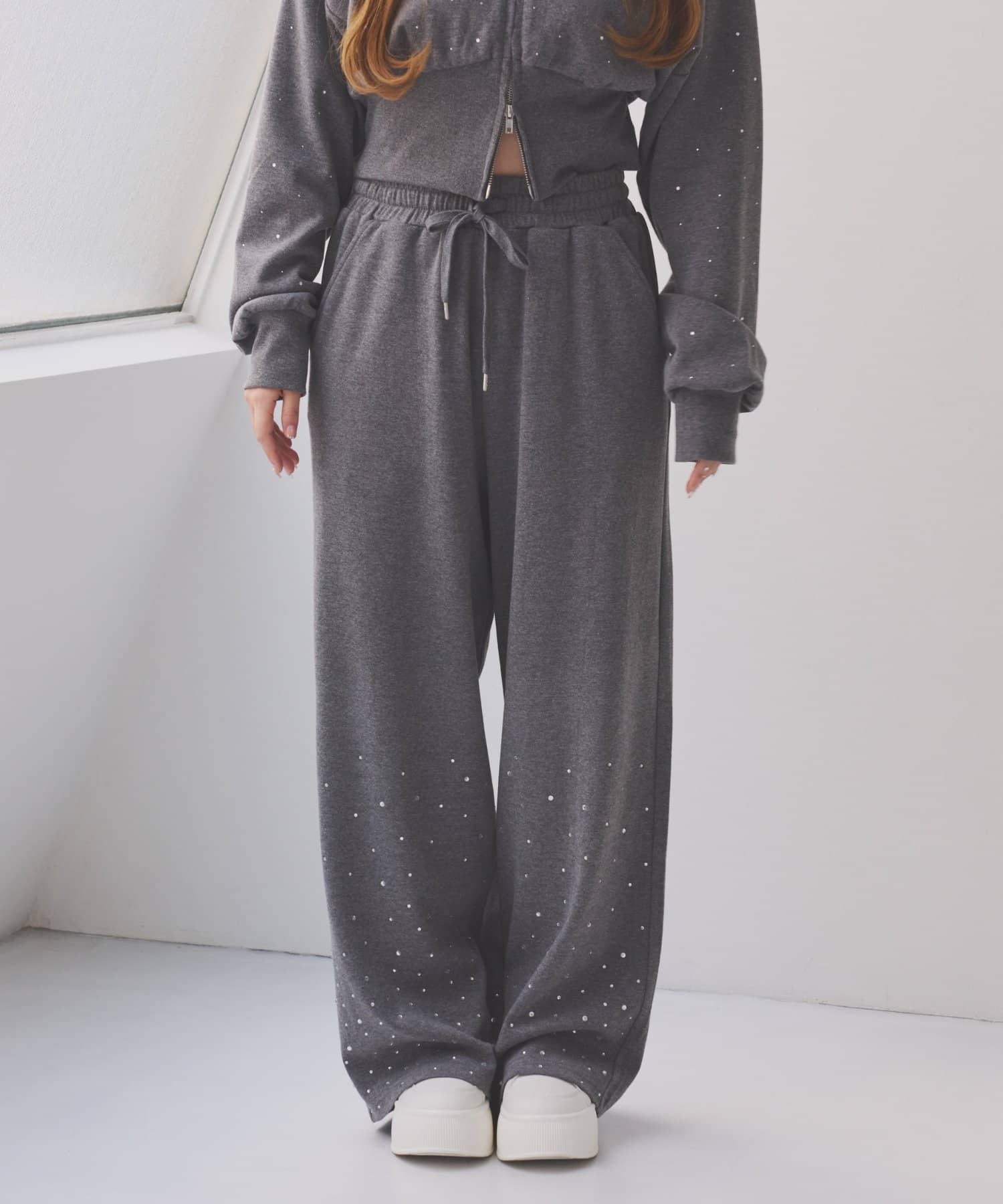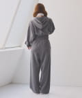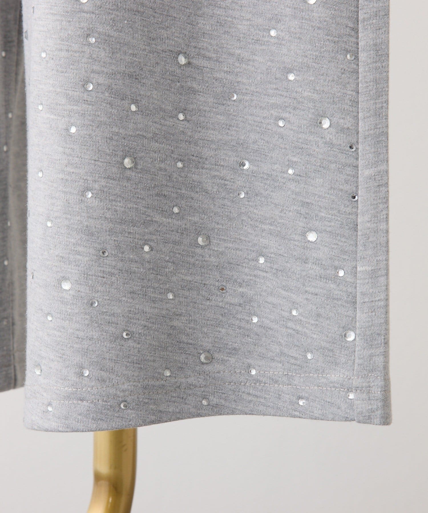 裾にビジューをあしらった、大人フェミニンなスウェットワイドパンツ。