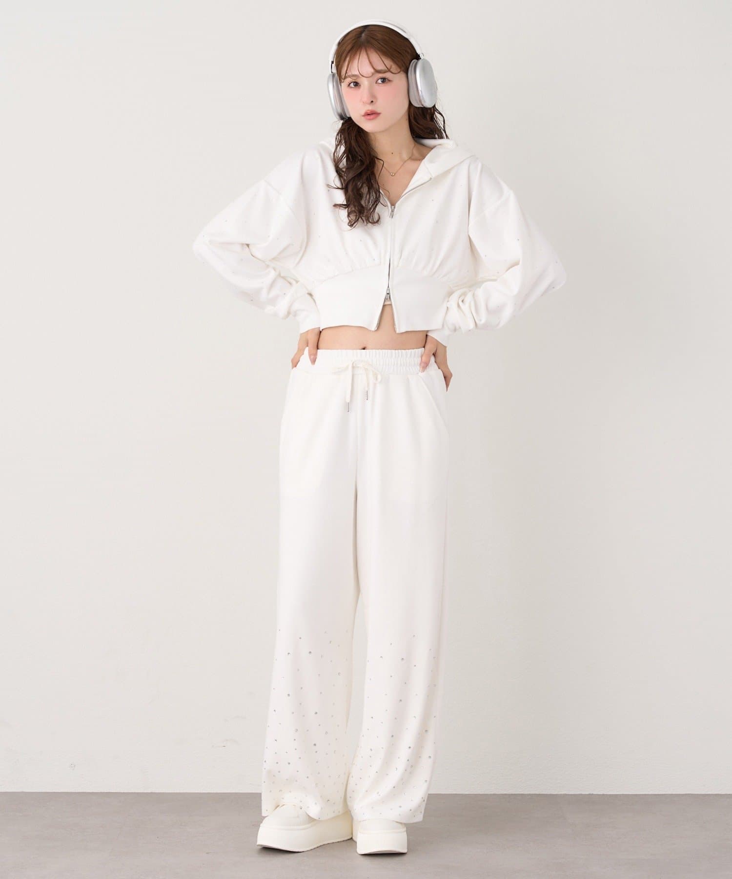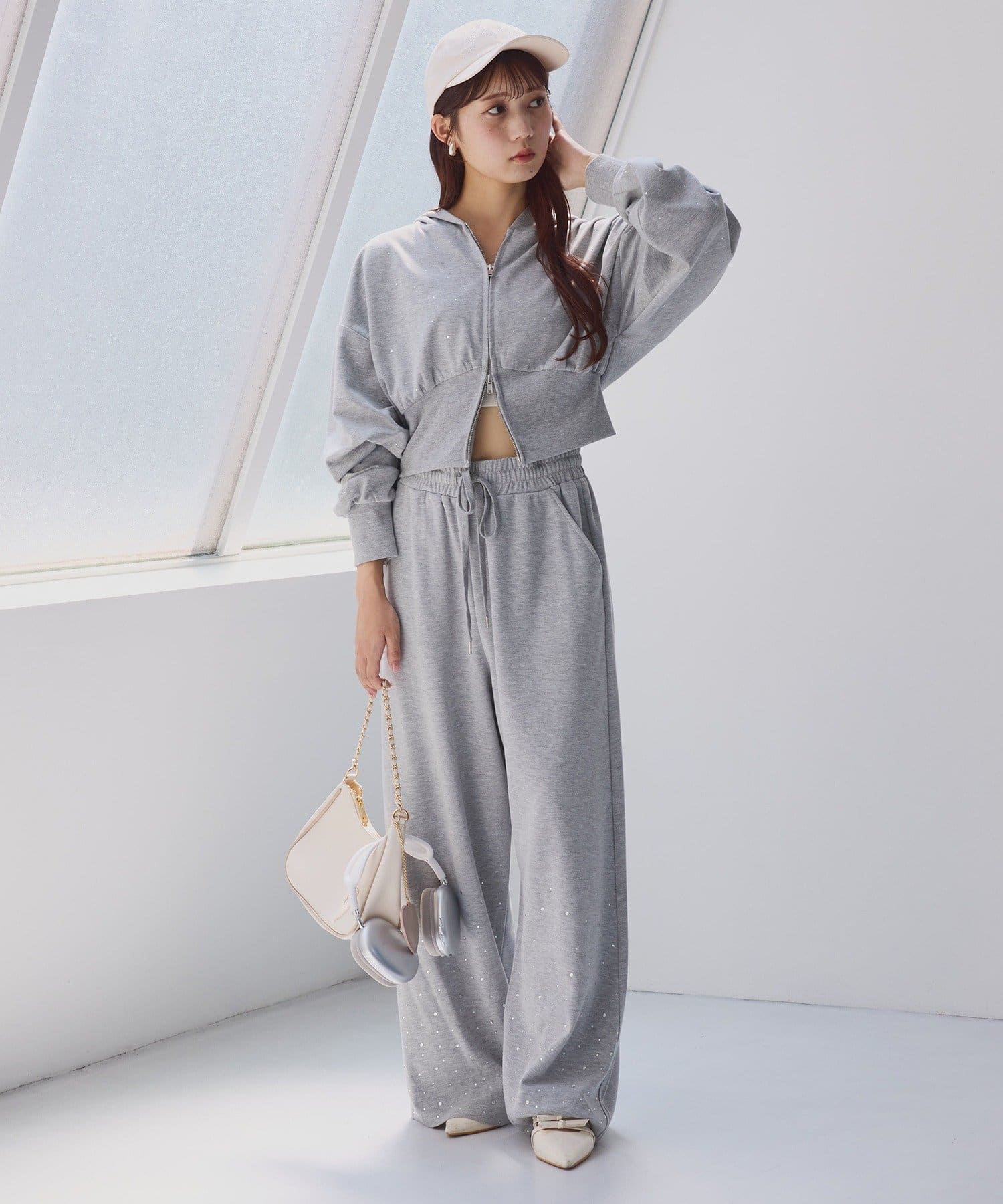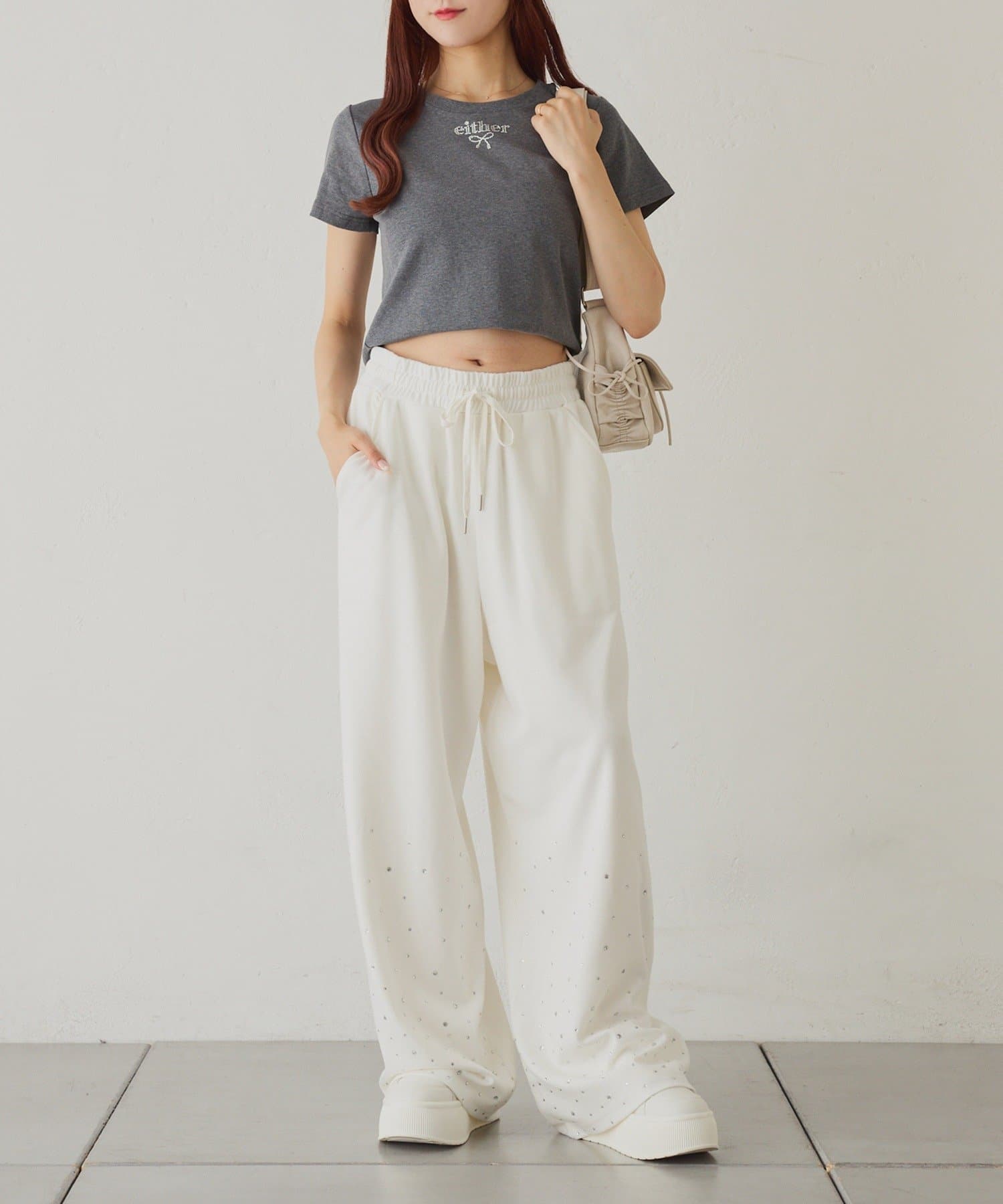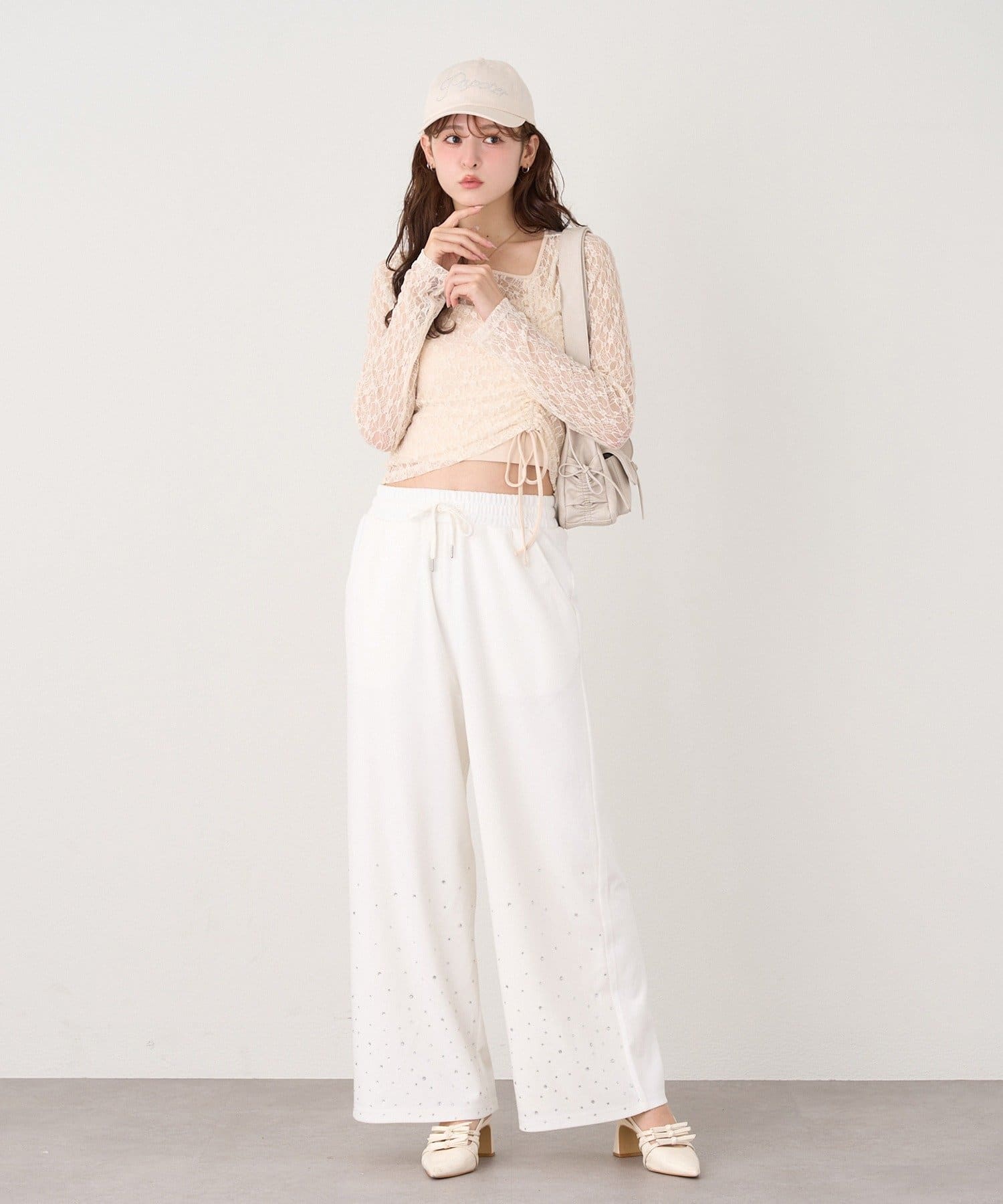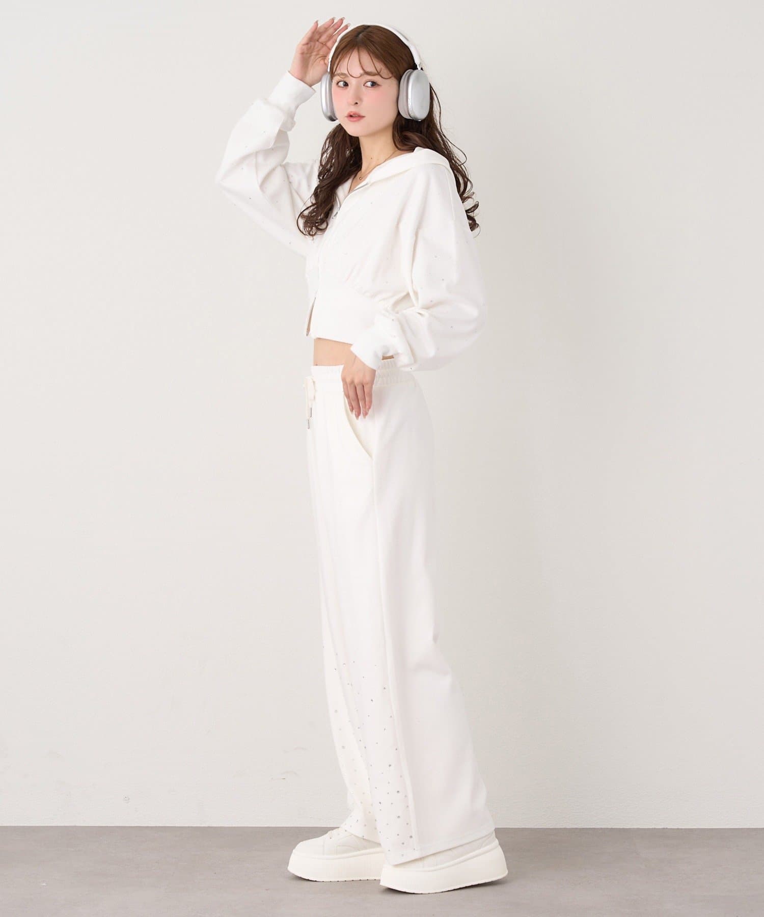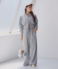 裾にビジューをあしらった、大人フェミニンなスウェットワイドパンツ。