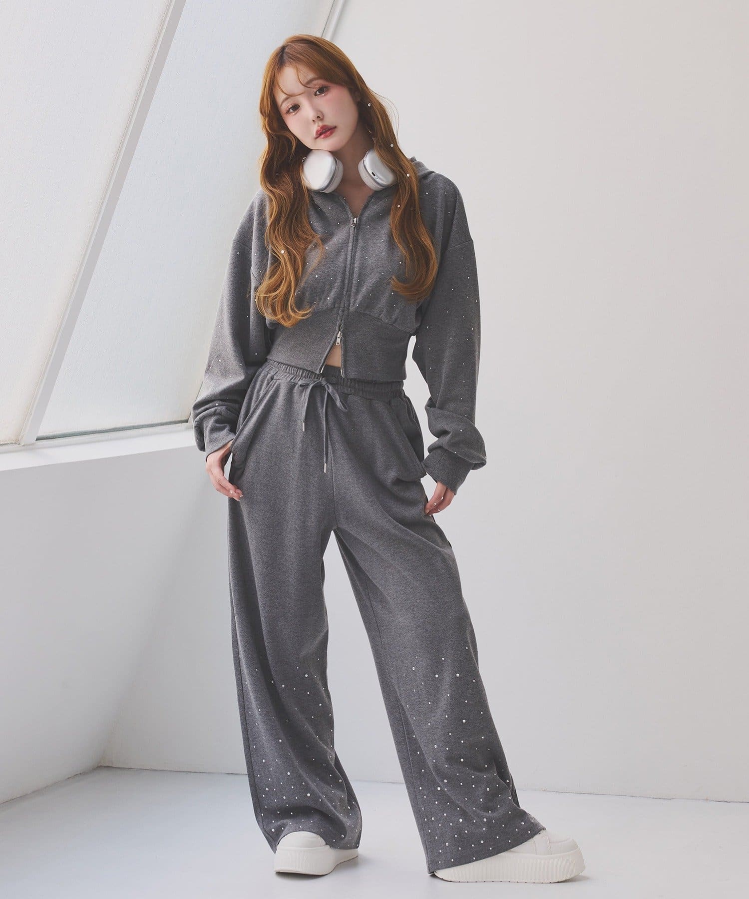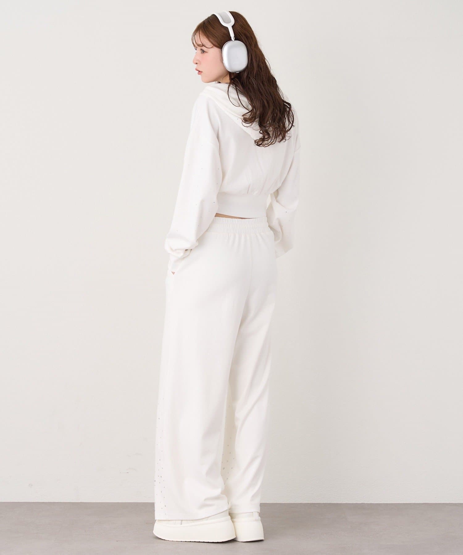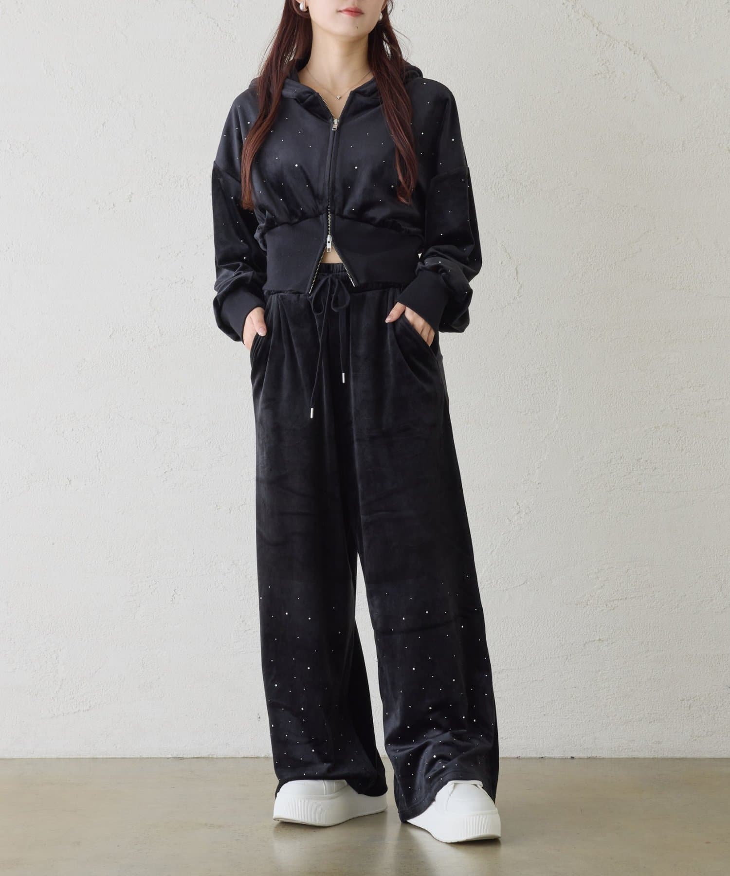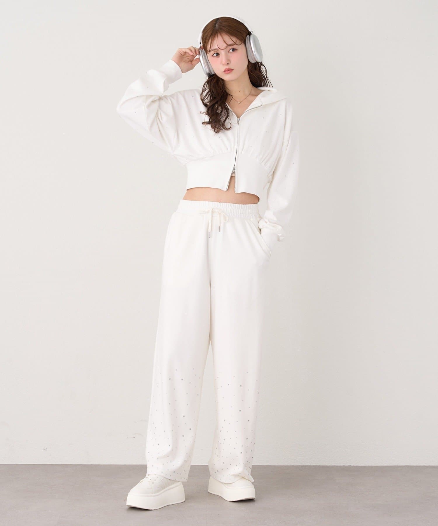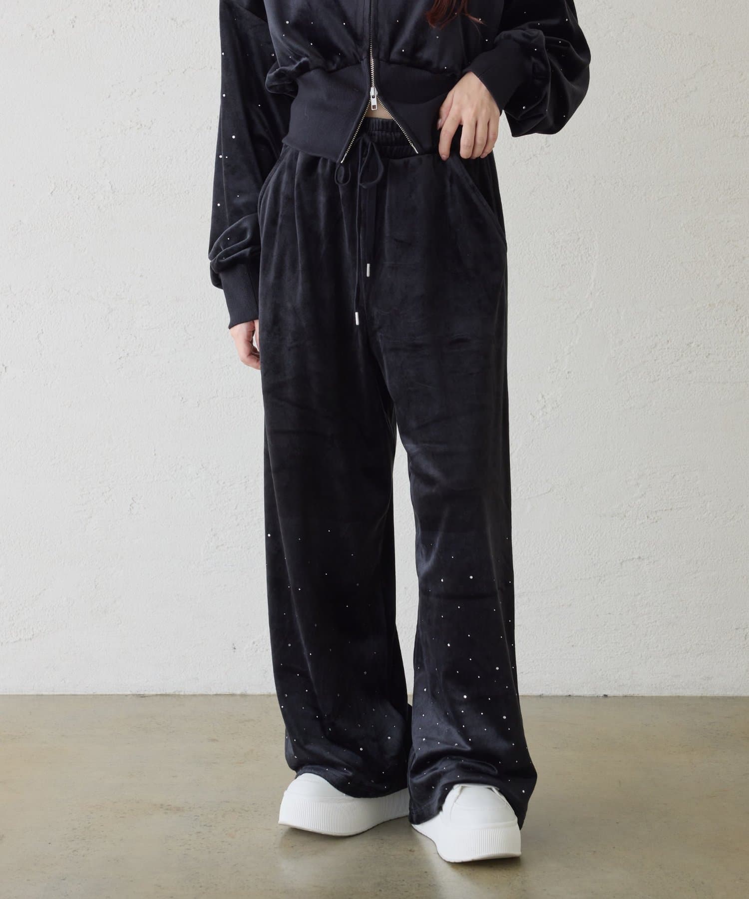 裾にビジューをあしらった、大人フェミニンなスウェットワイドパンツ。