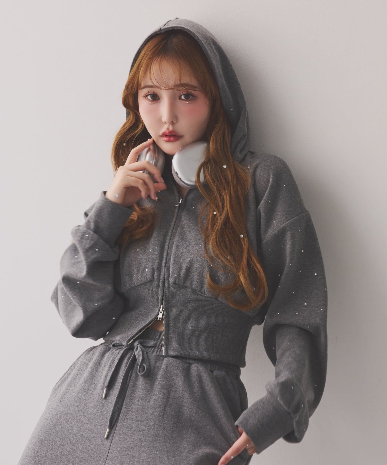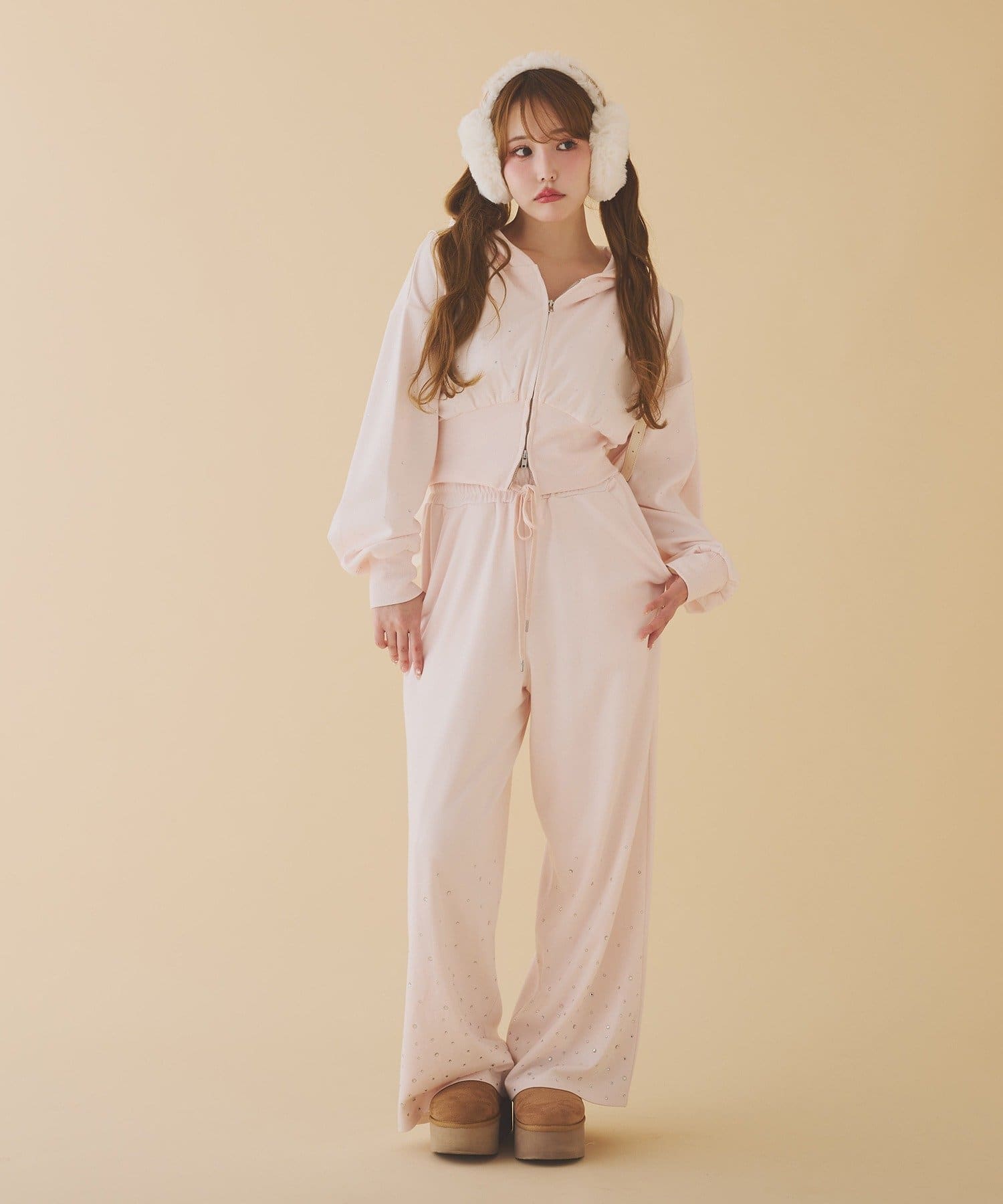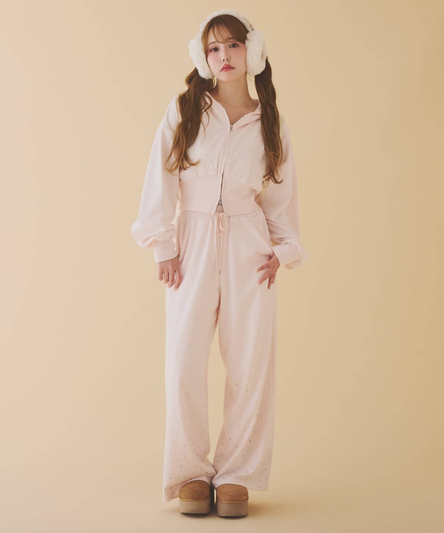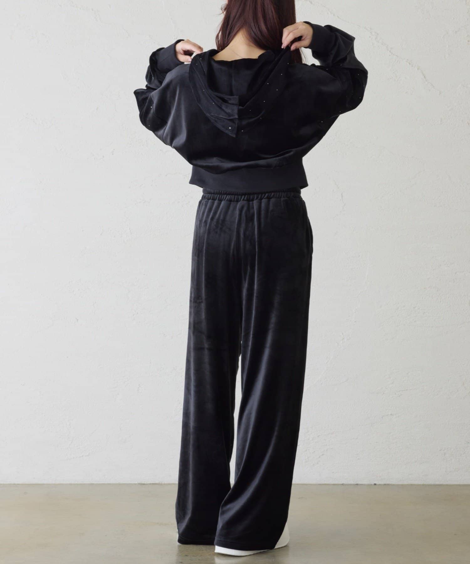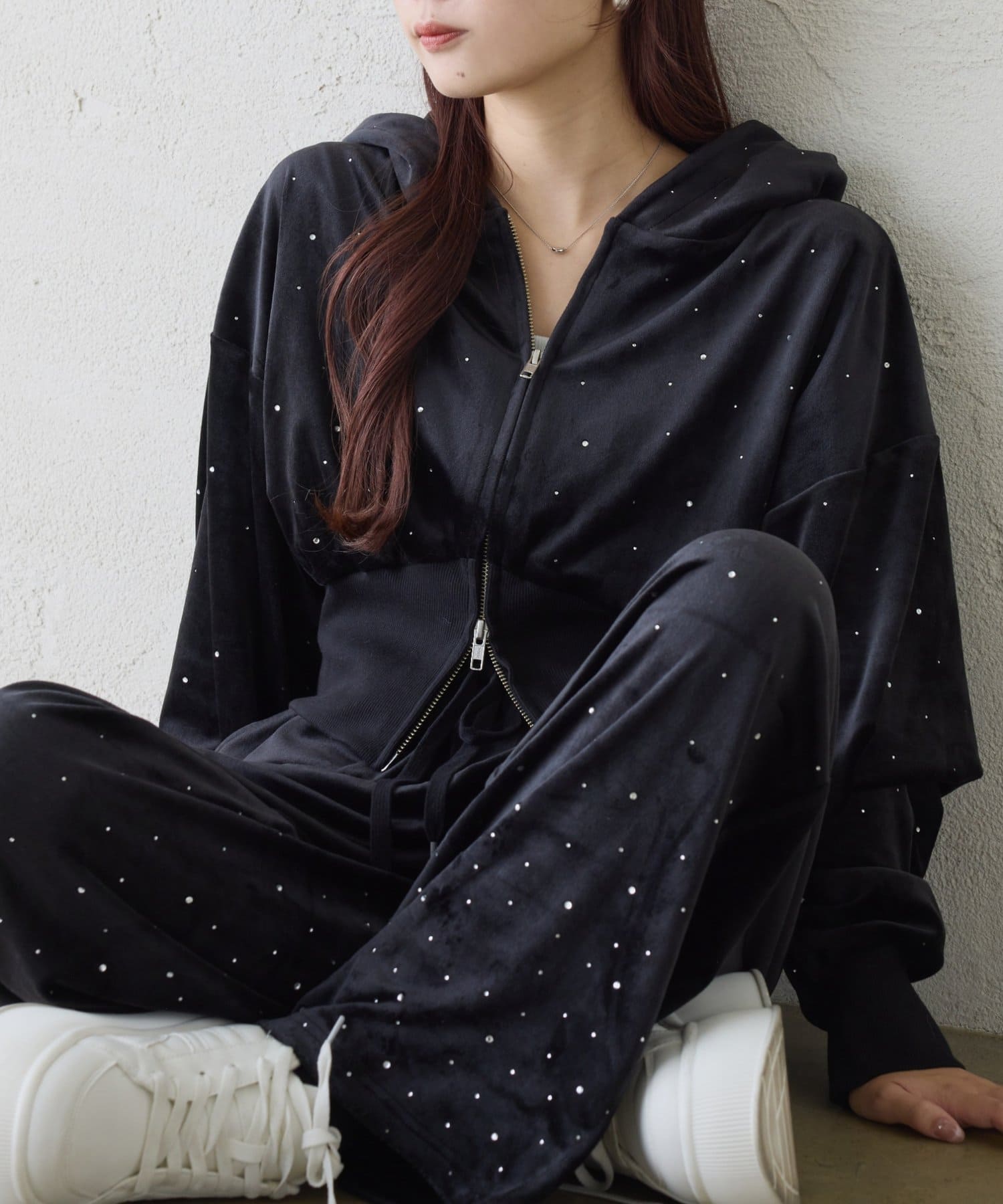 裾にビジューをあしらった、大人フェミニンなスウェットワイドパンツ。