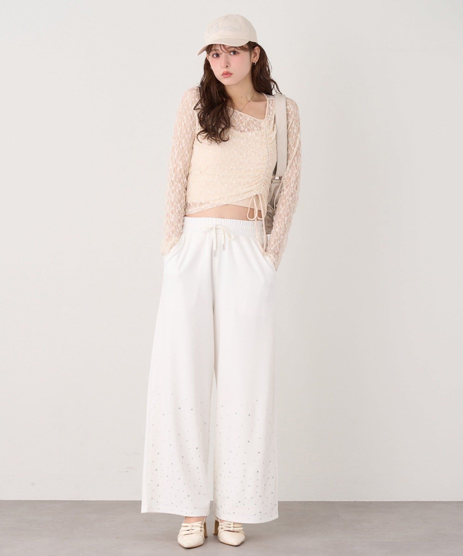 クロップド丈のトップスと合わせれば、ウエストのレースがアクセントに♡