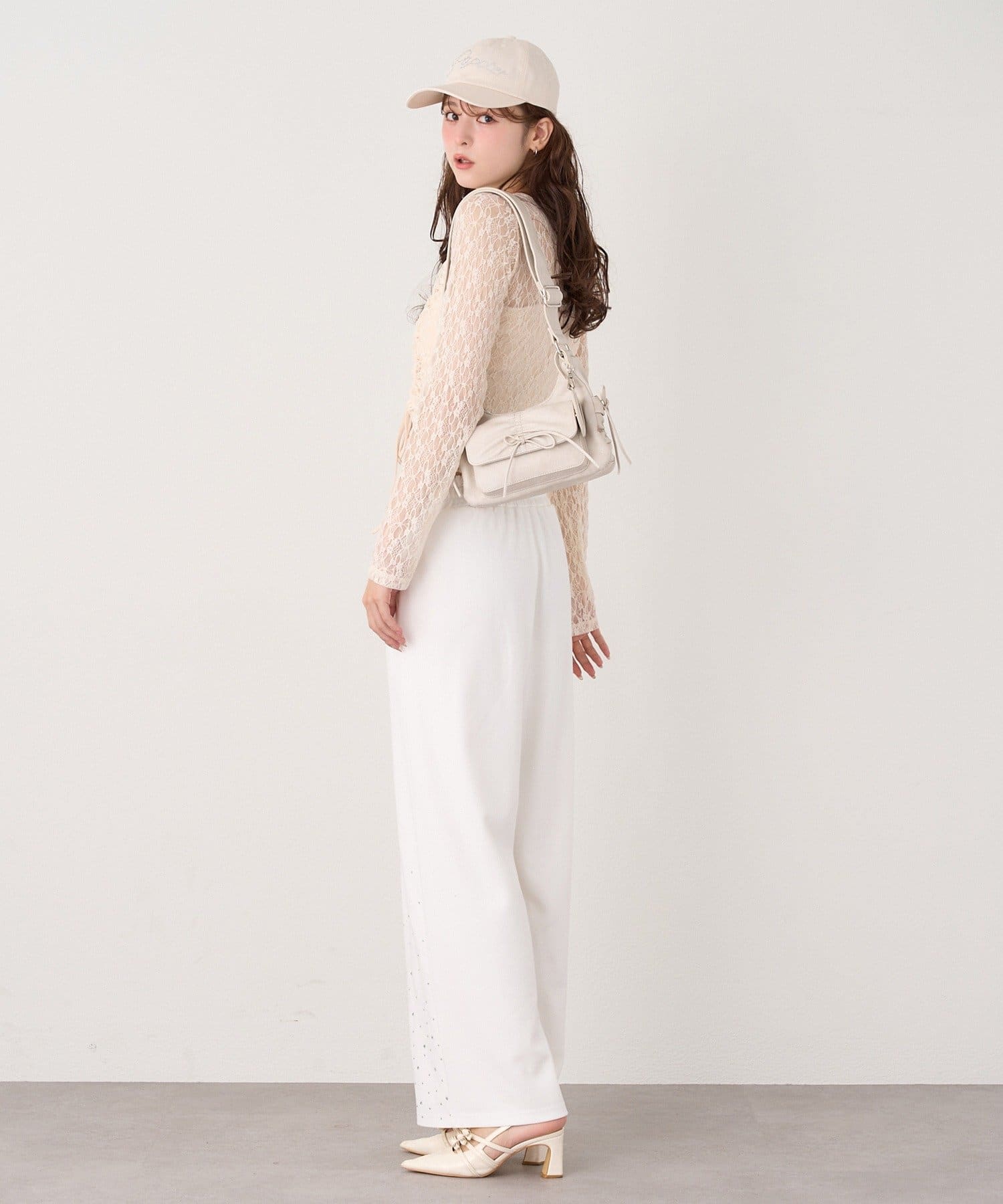 カジュアルなスウェット素材ながら、レースのディテールが女性らしさをプラスし、