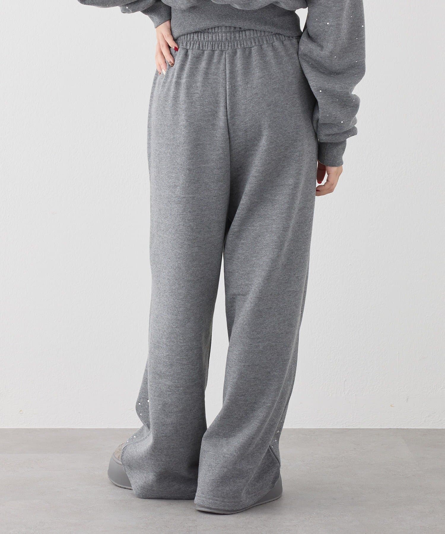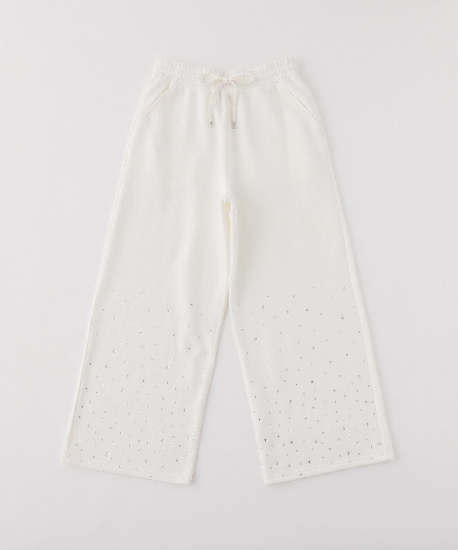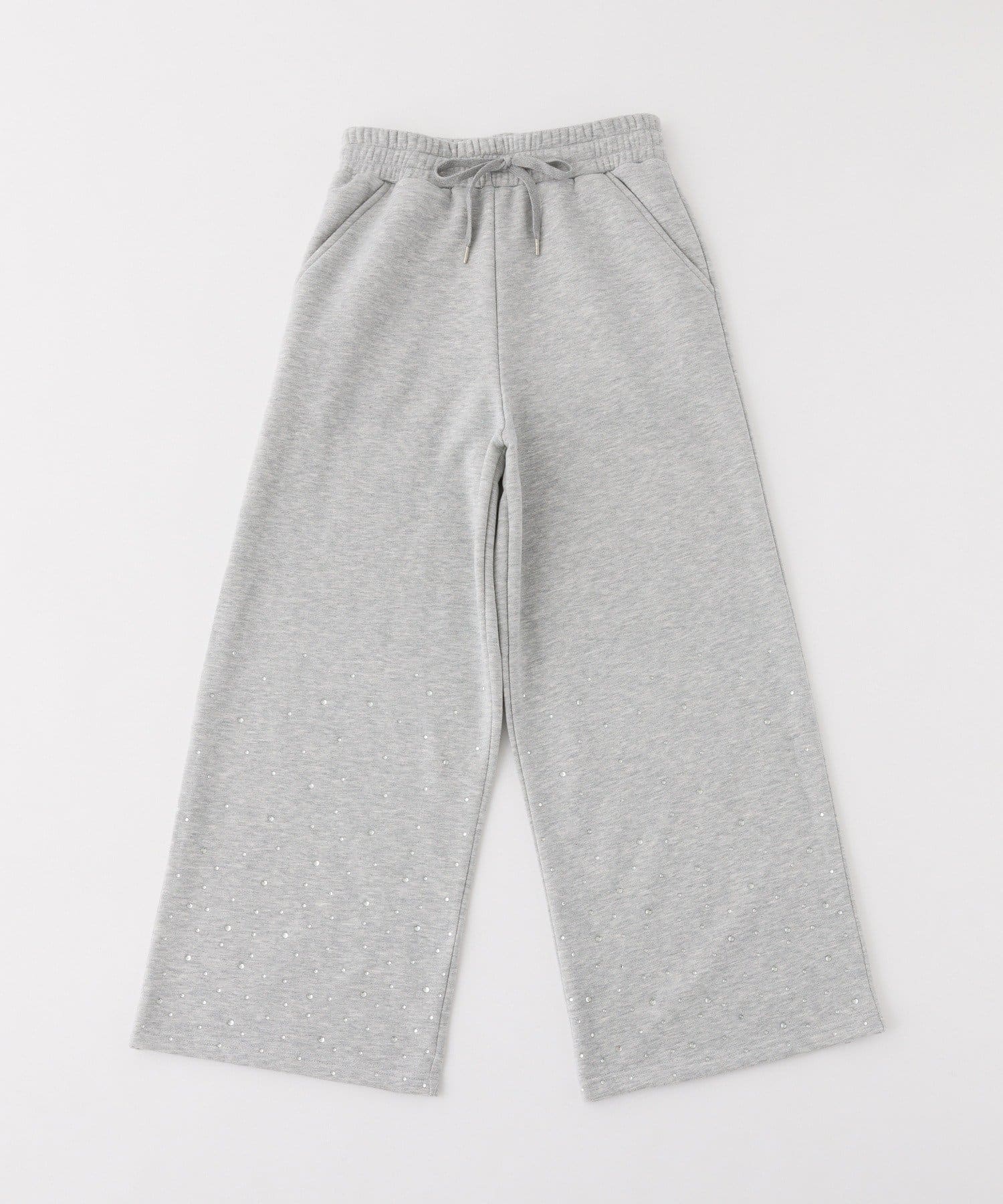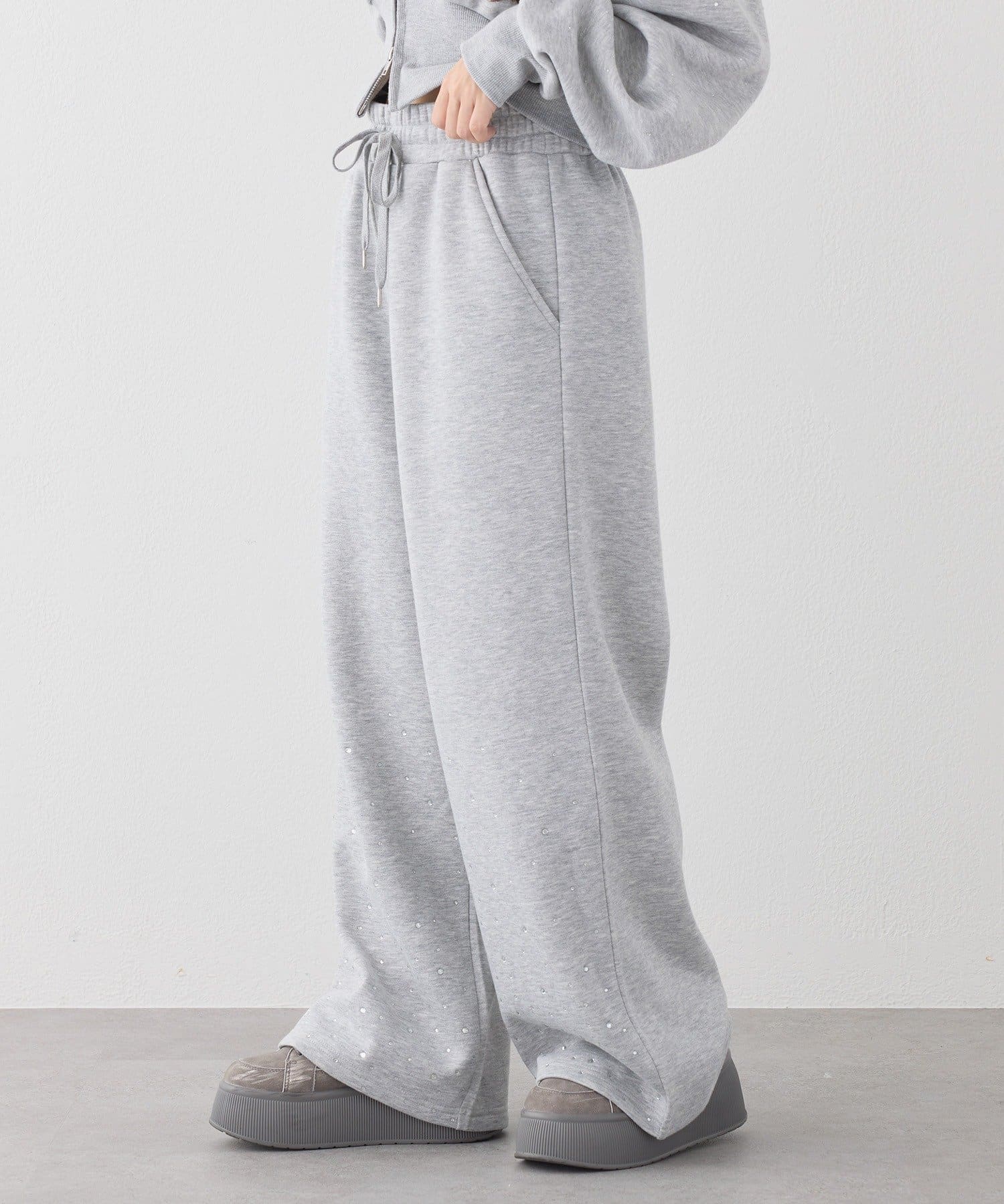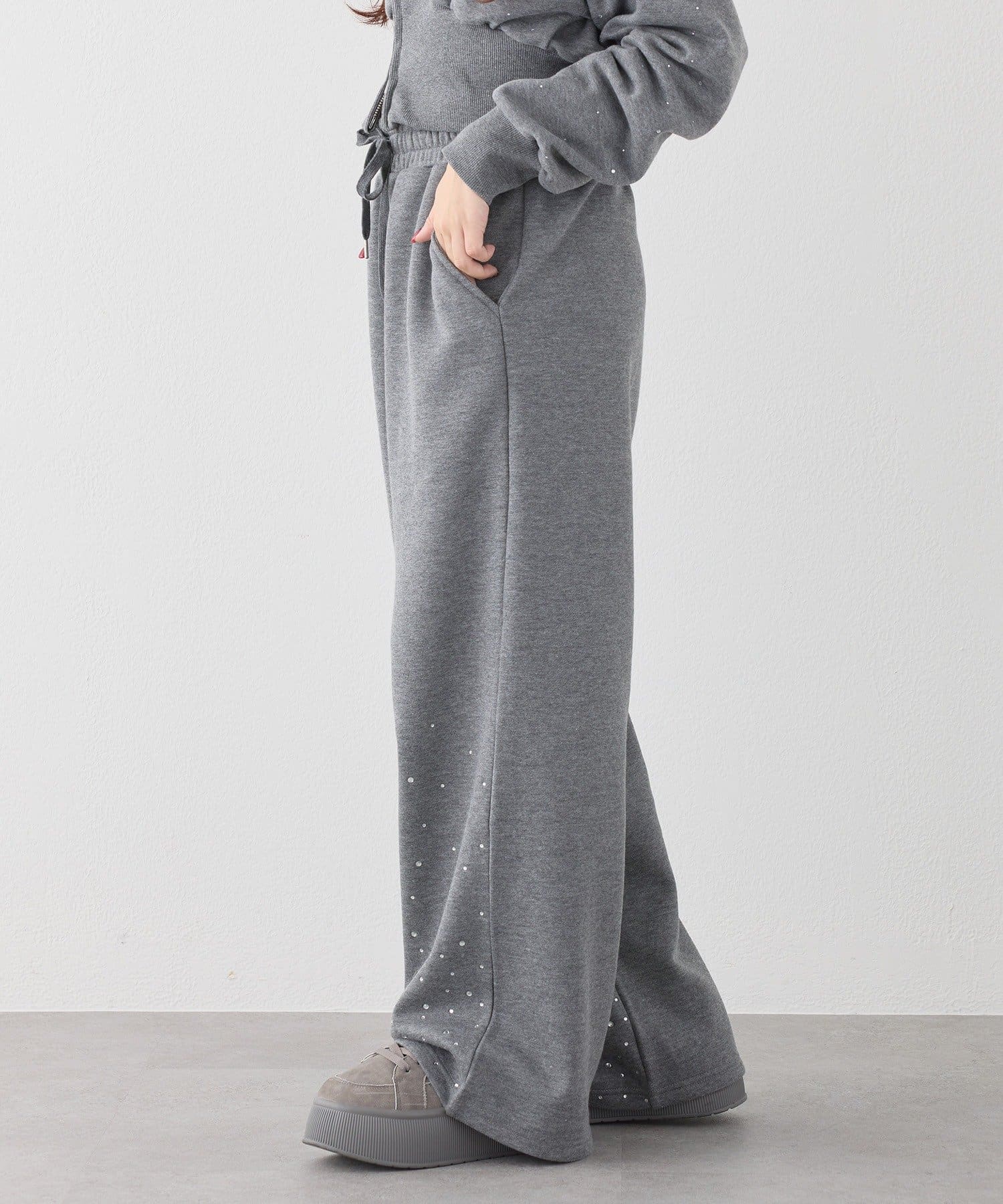 裾にビジューをあしらった、大人フェミニンなスウェットワイドパンツ。
