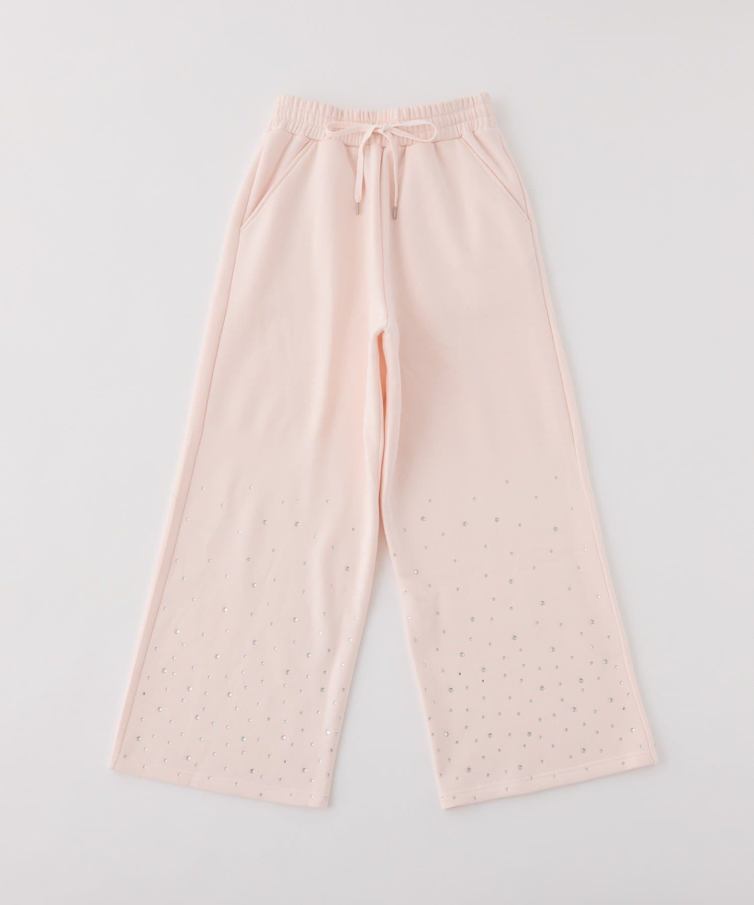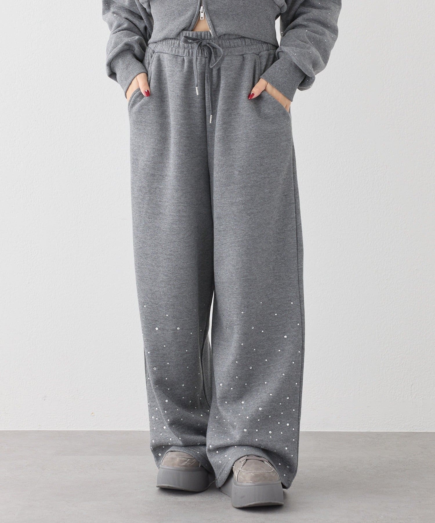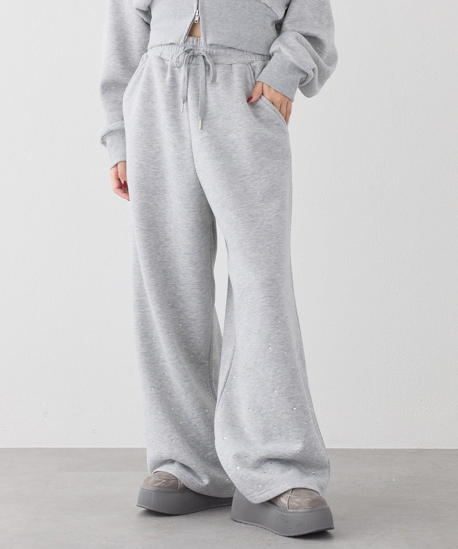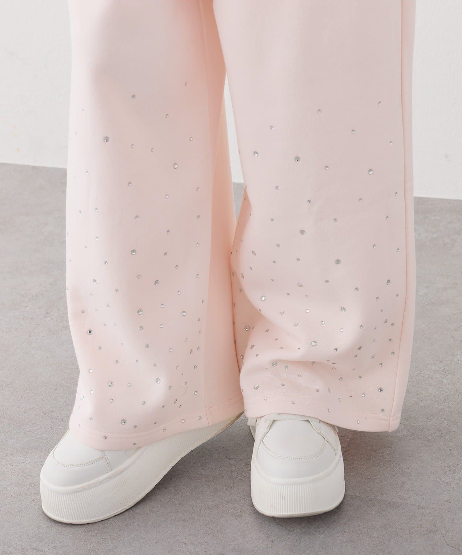裾にビジューをあしらった、大人フェミニンなスウェットワイドパンツ。