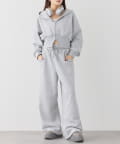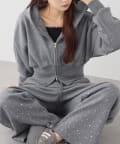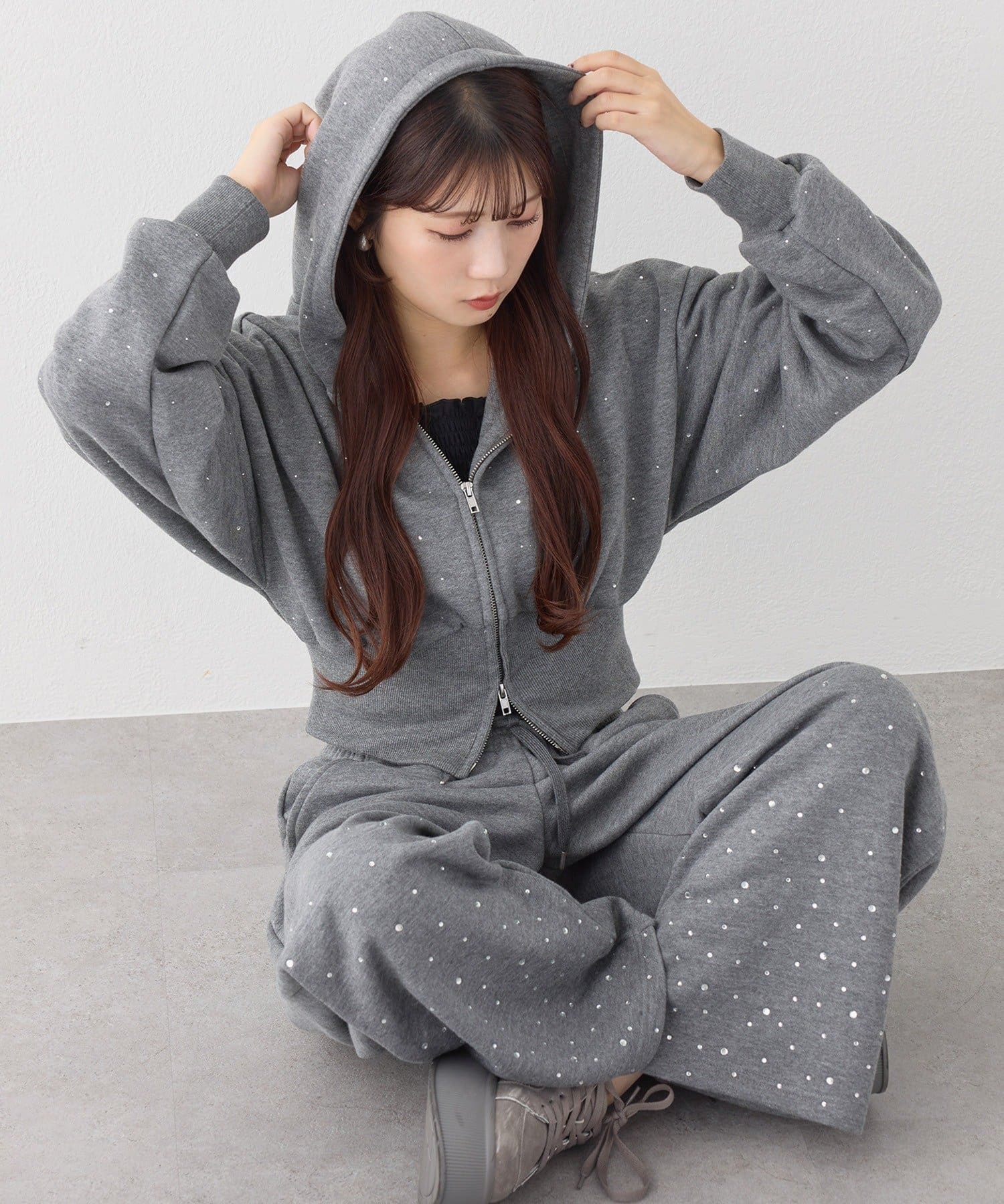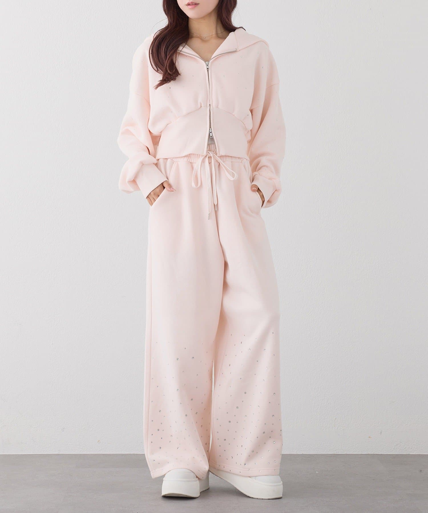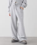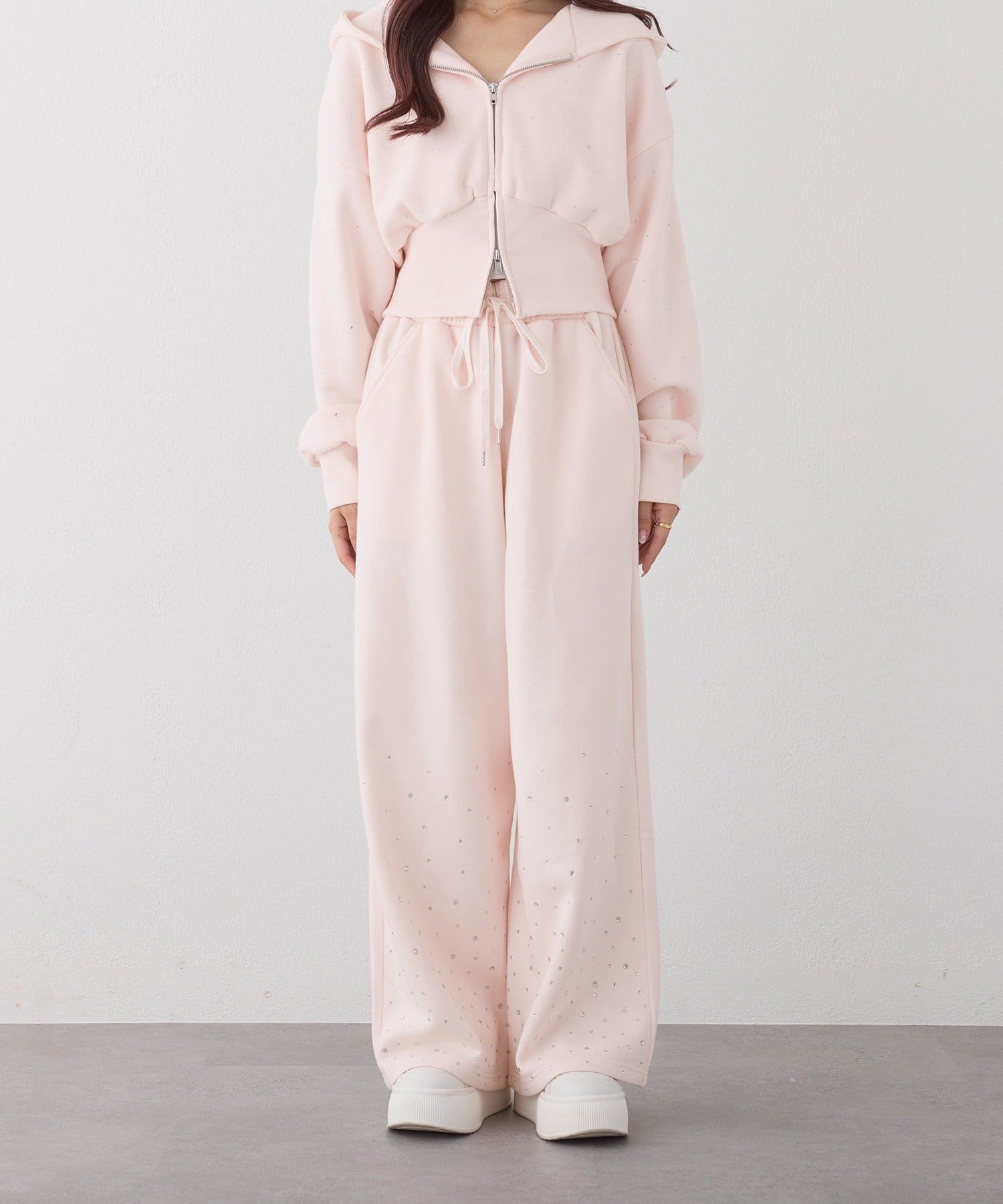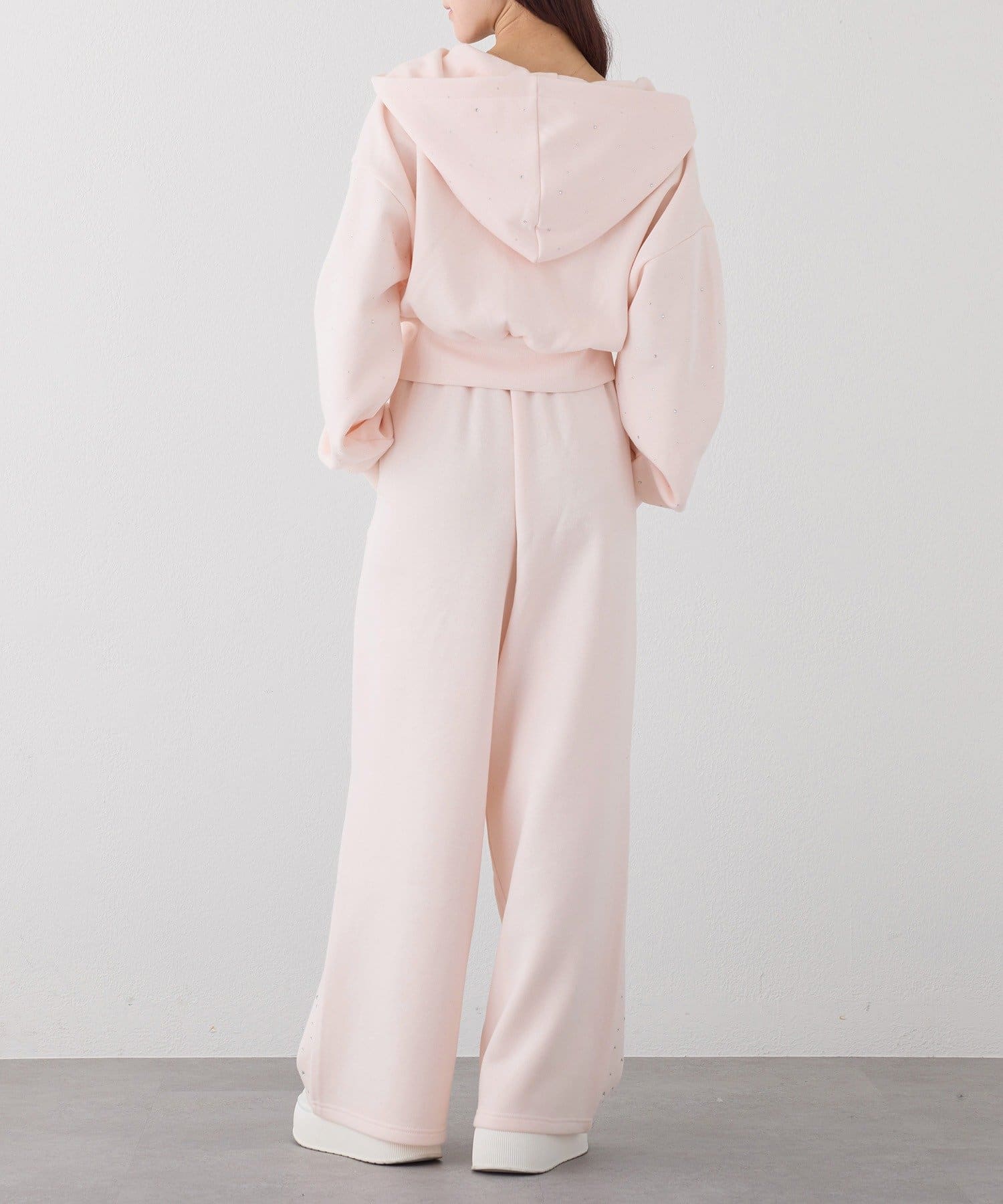 裾にビジューをあしらった、大人フェミニンなスウェットワイドパンツ。