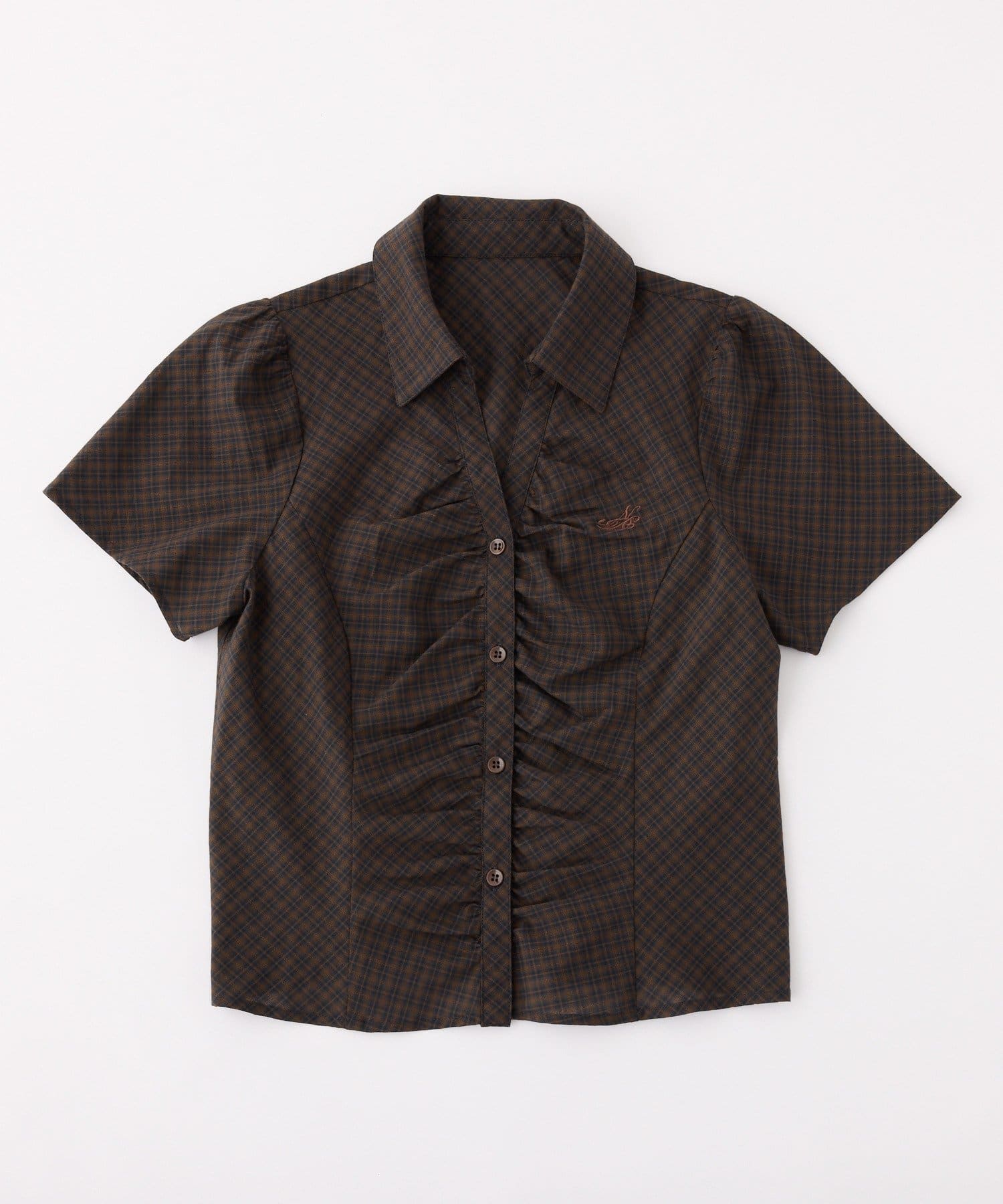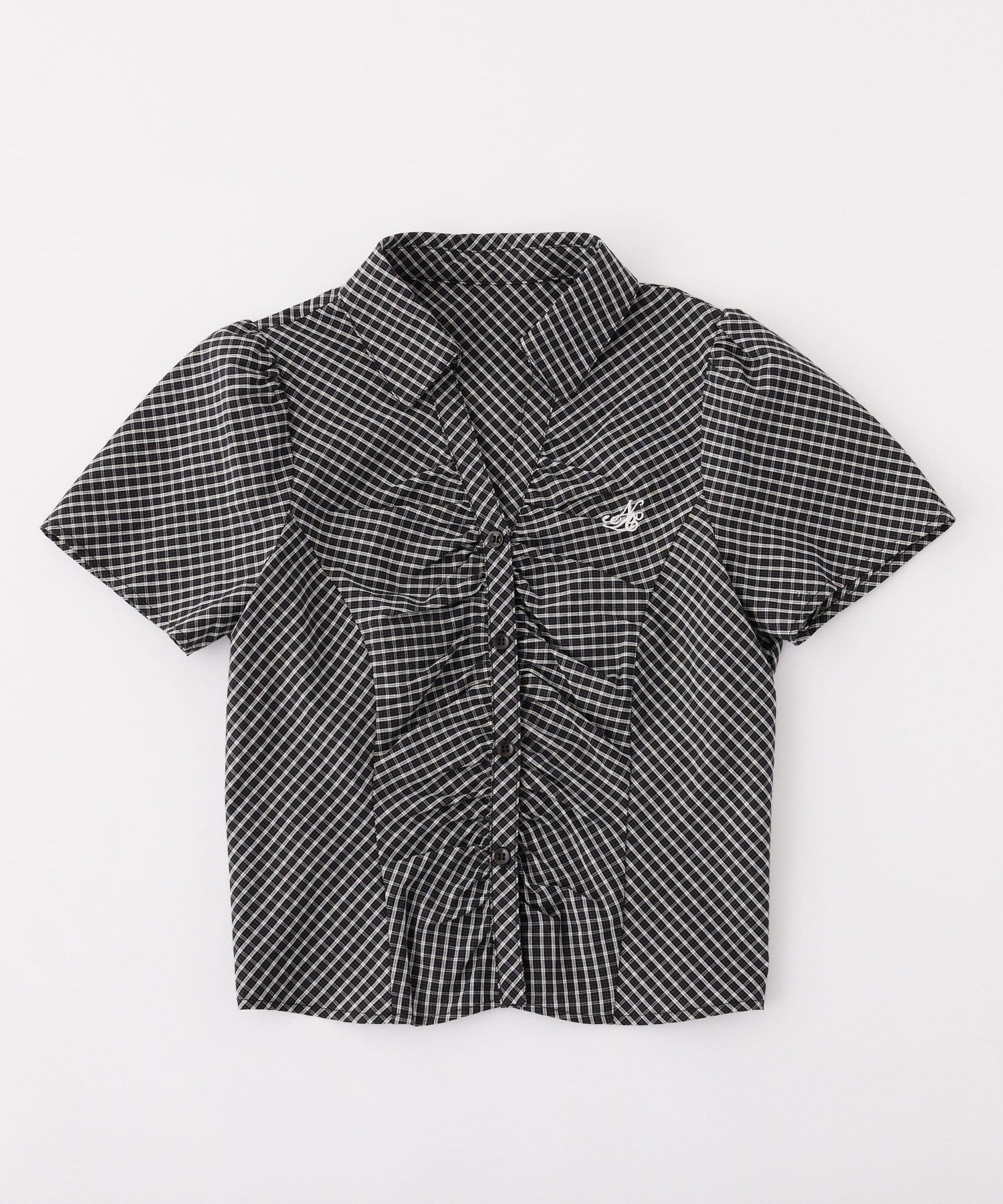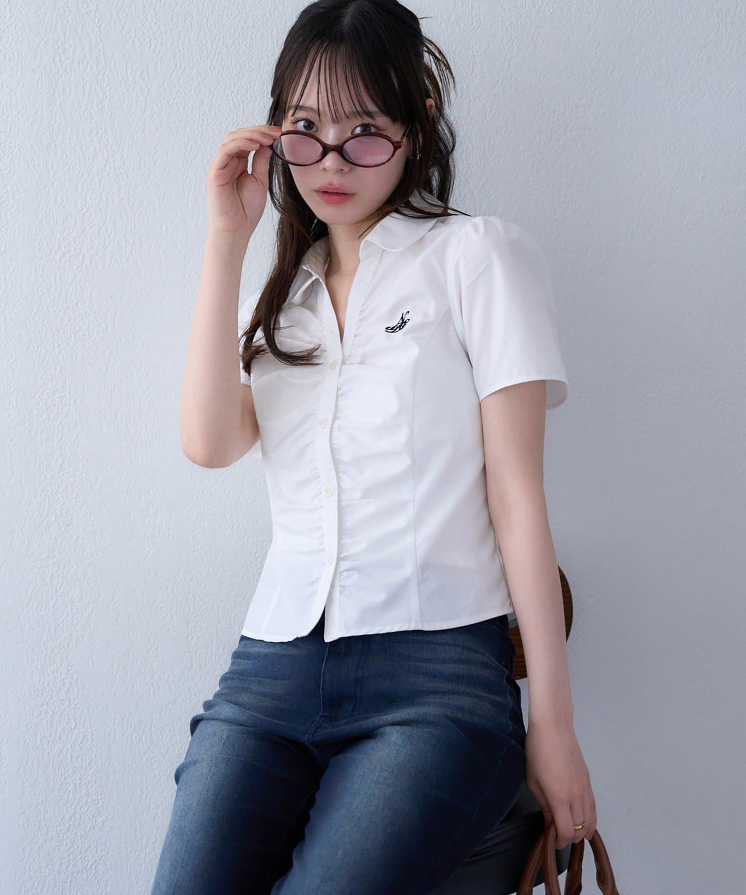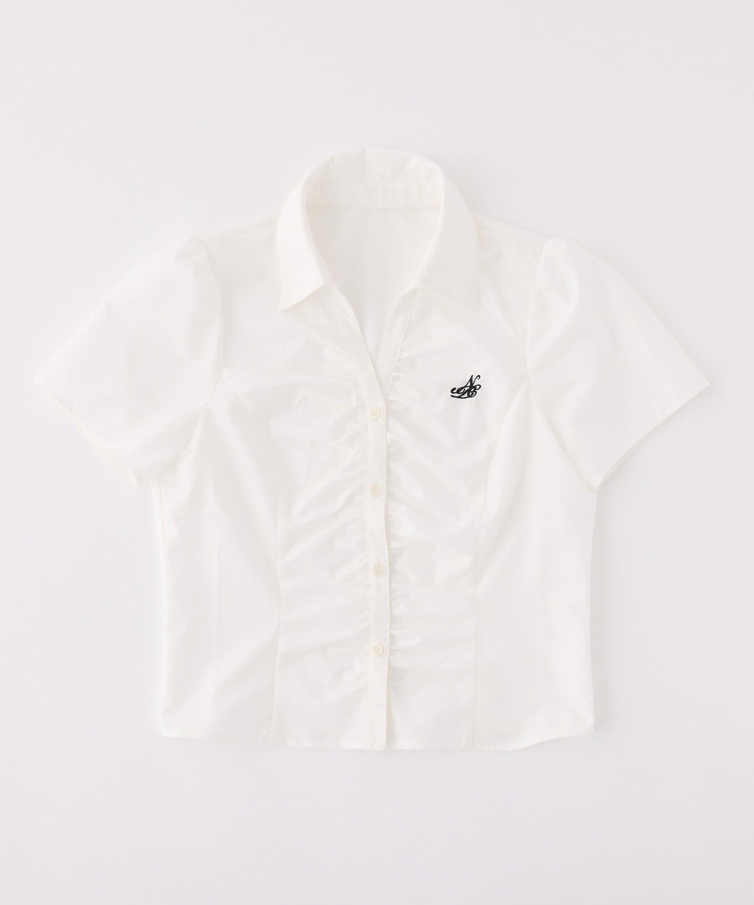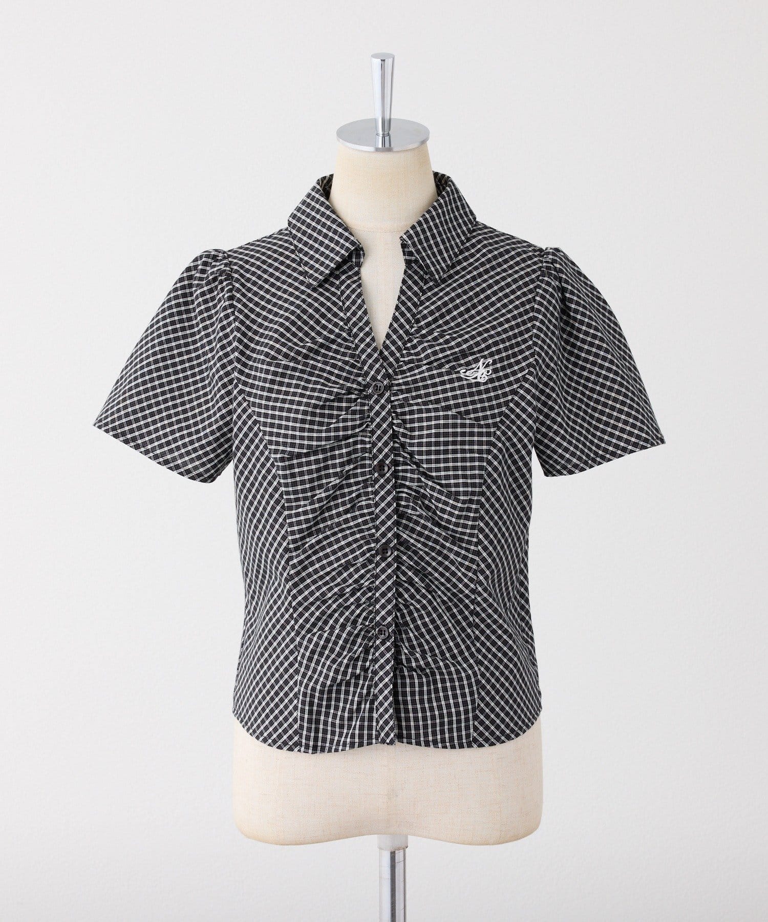 フロントのボタン部分にギャザーを寄せたデザインがポイントの半袖シャツ。