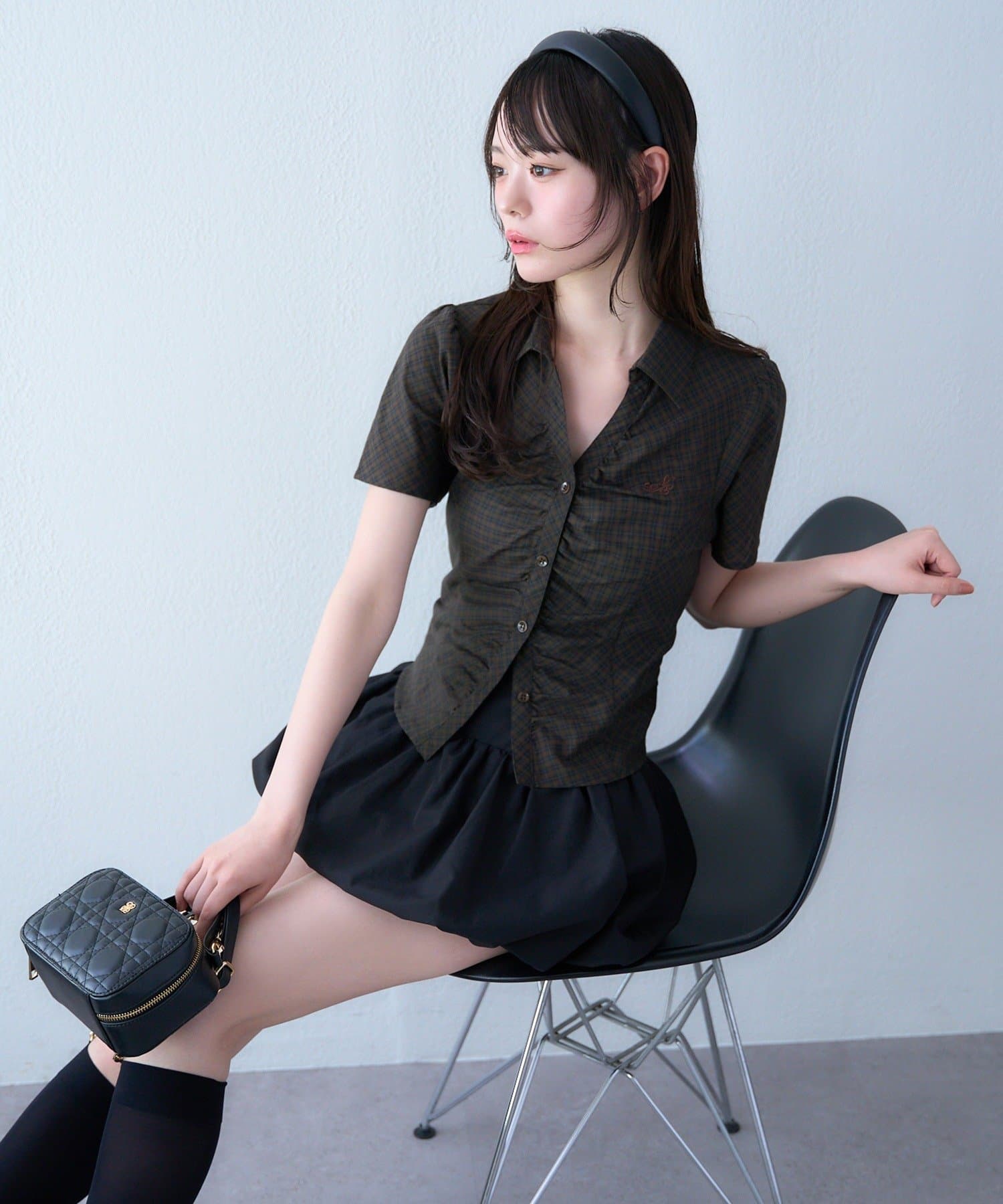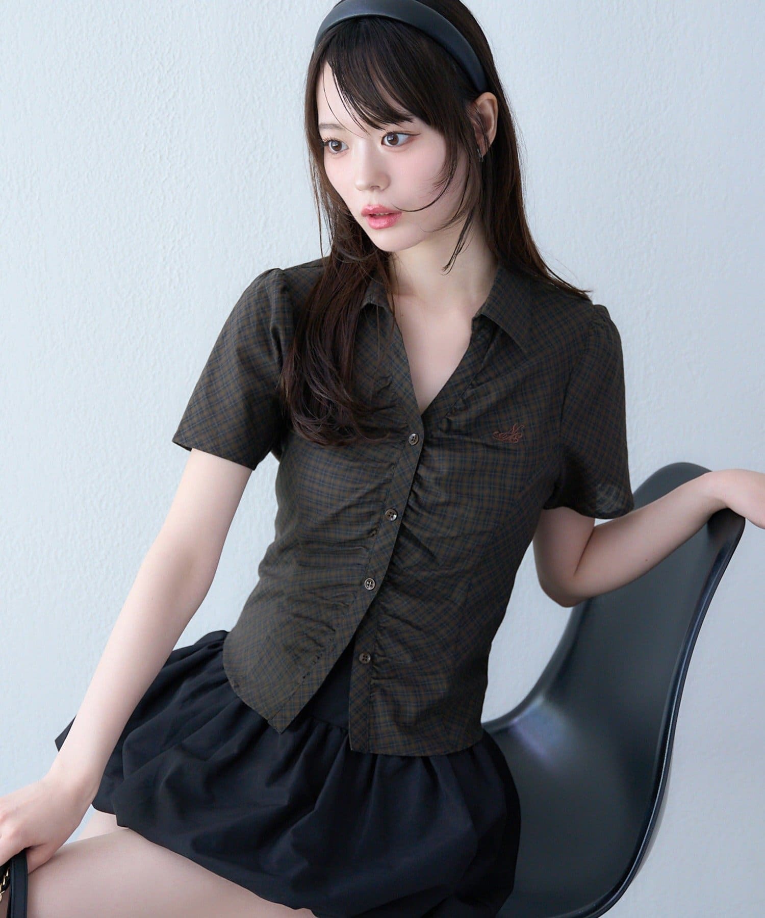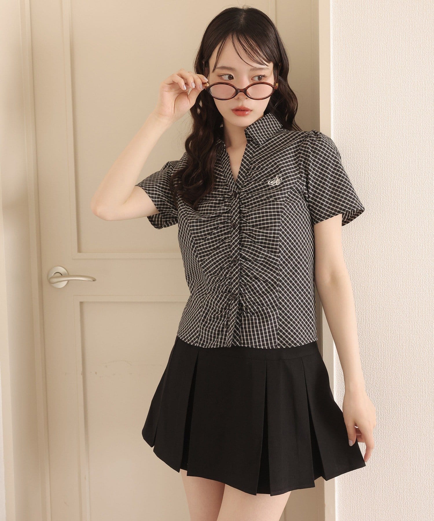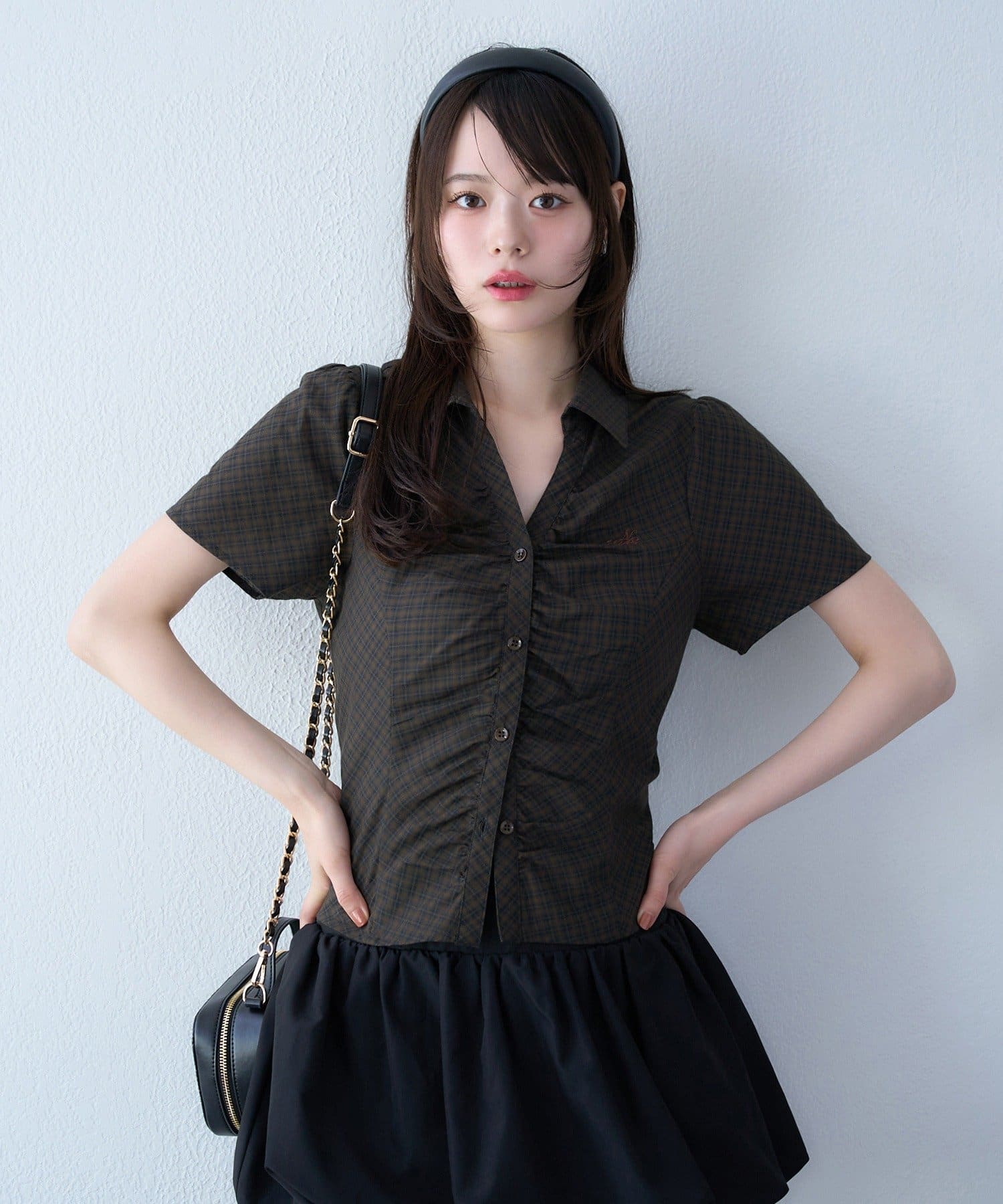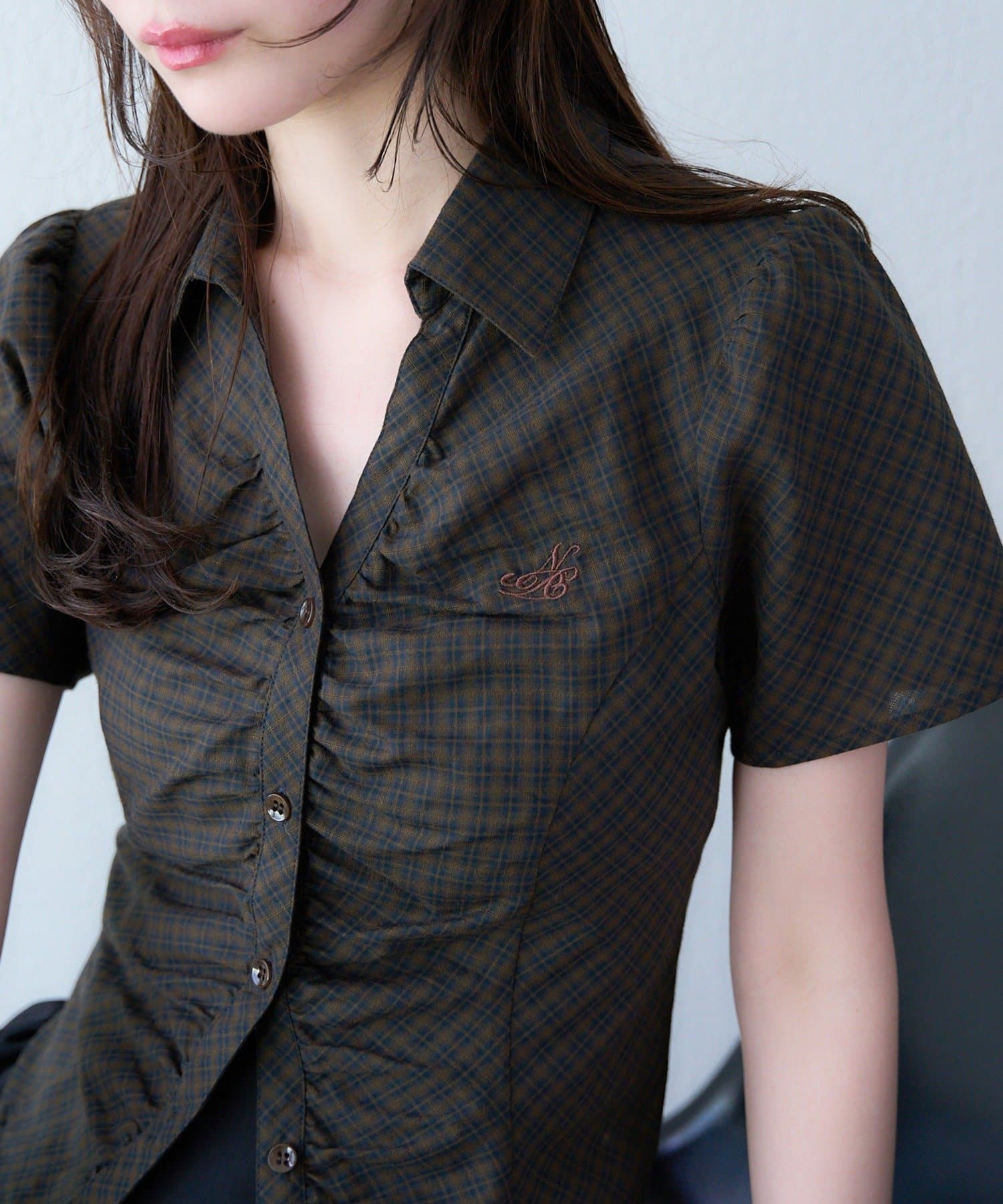 フロントのボタン部分にギャザーを寄せたデザインがポイントの半袖シャツ。