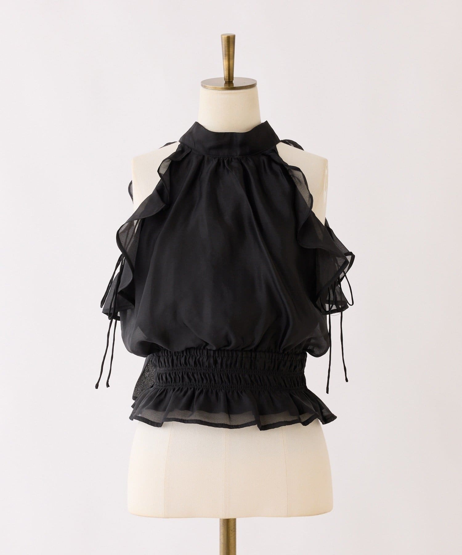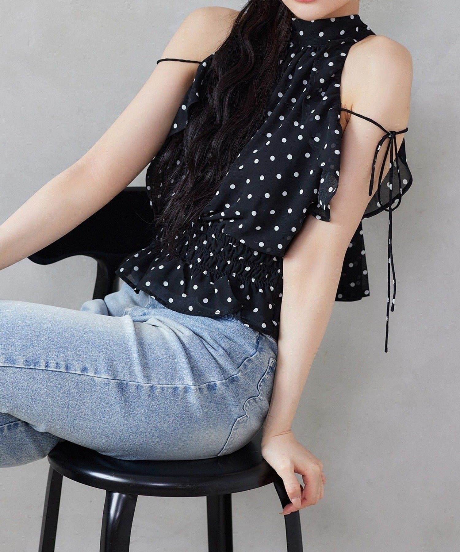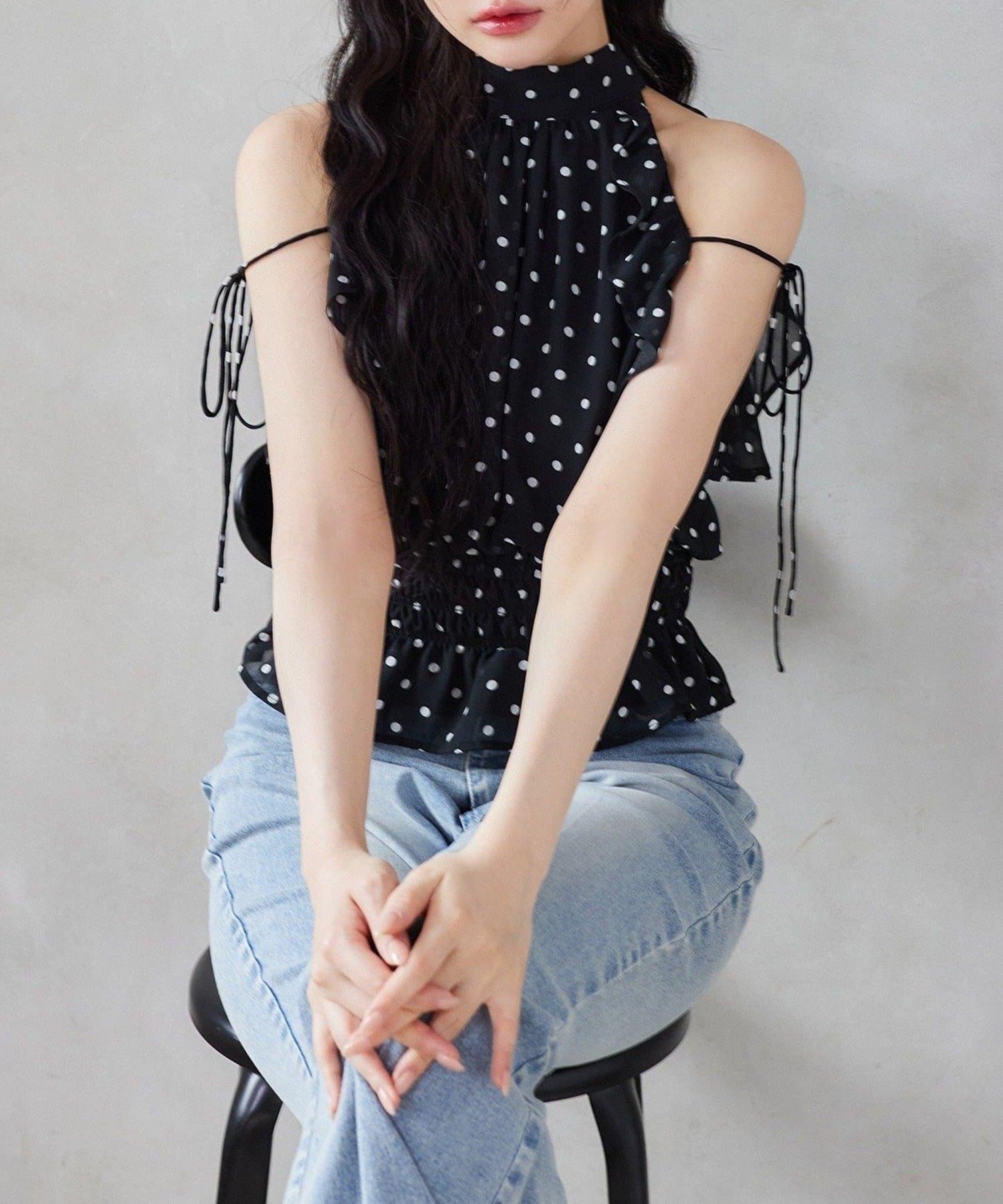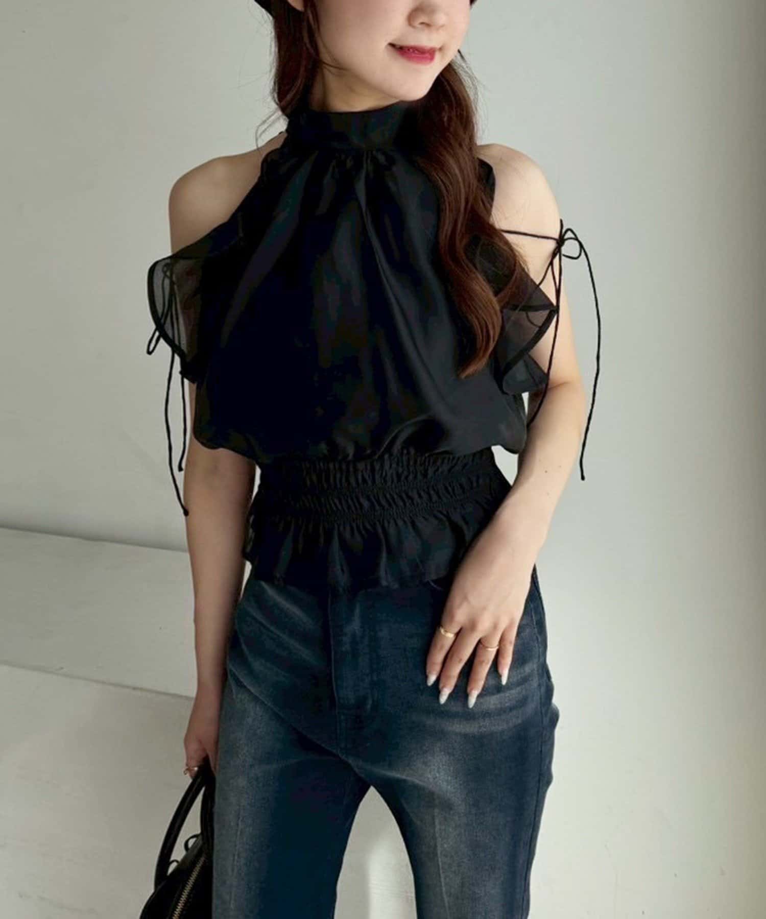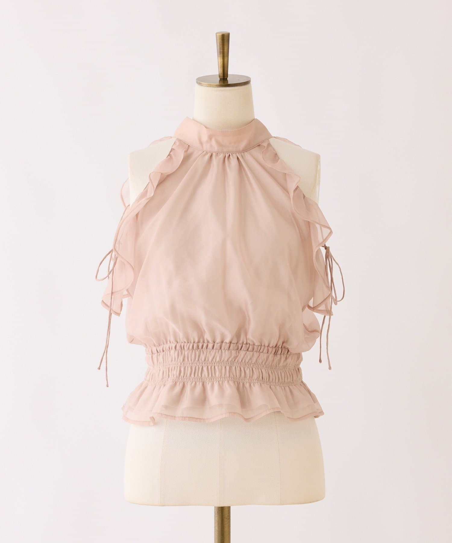可愛らしさとフェミニンな印象を与えるノースリーブブラウス。
